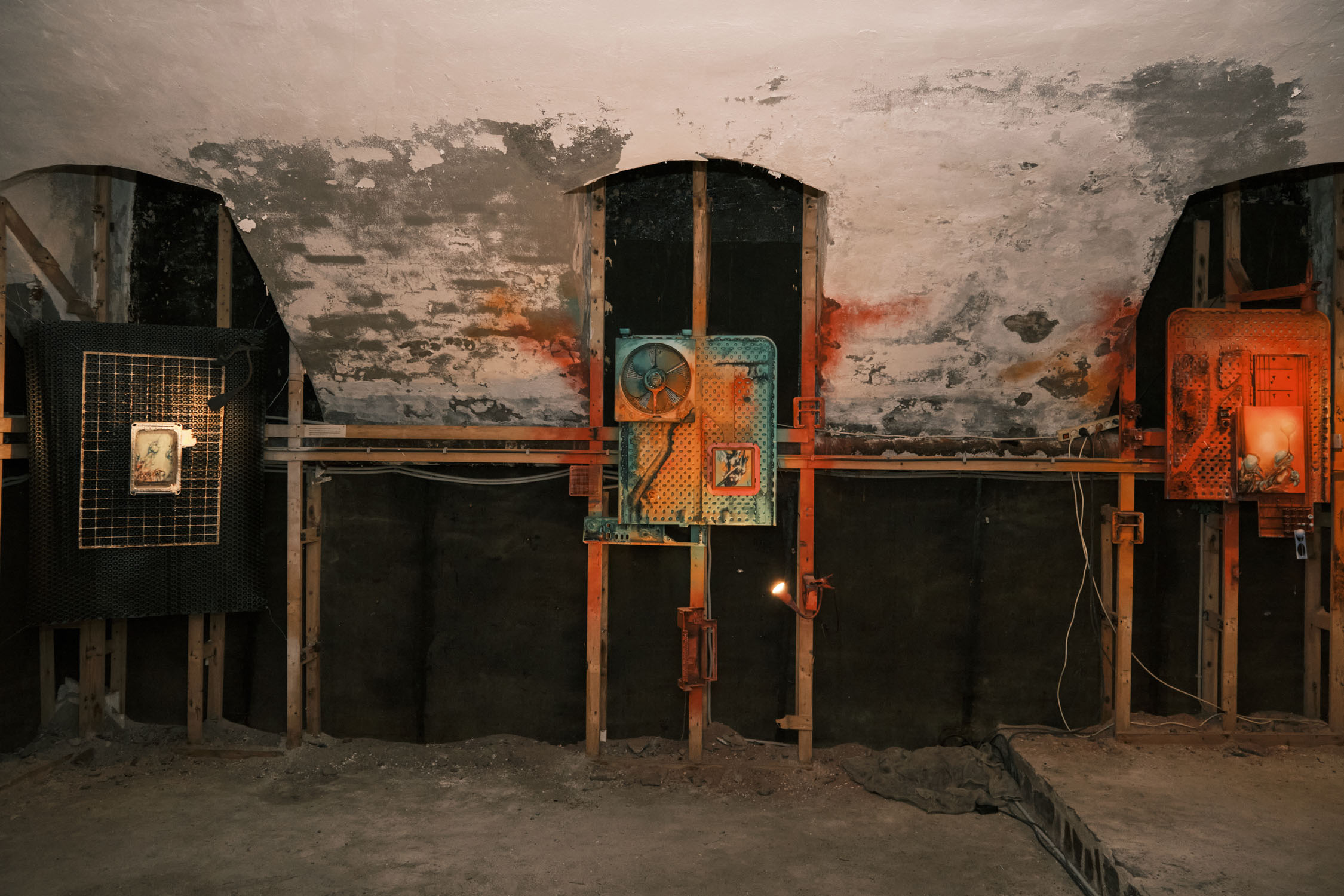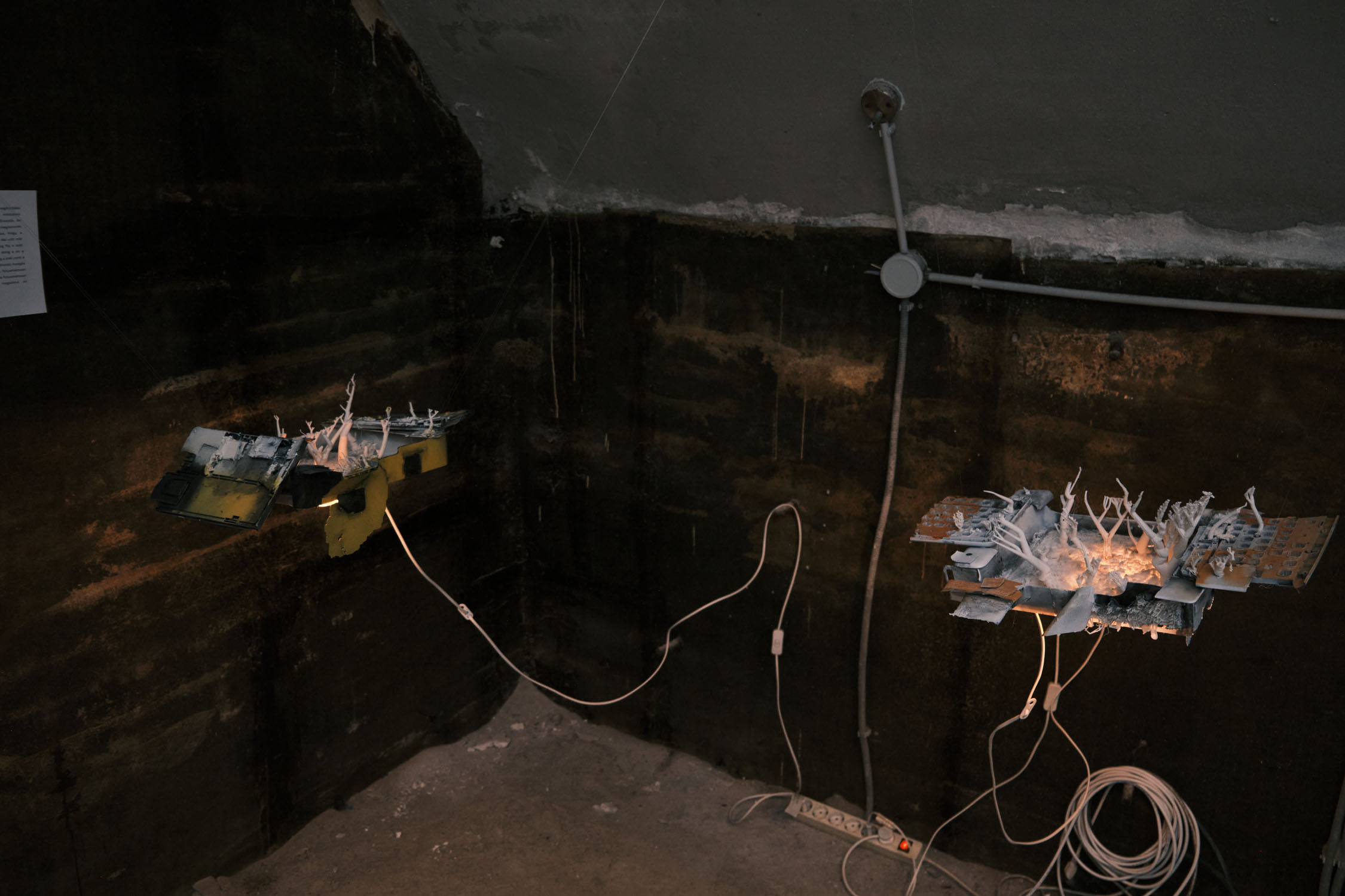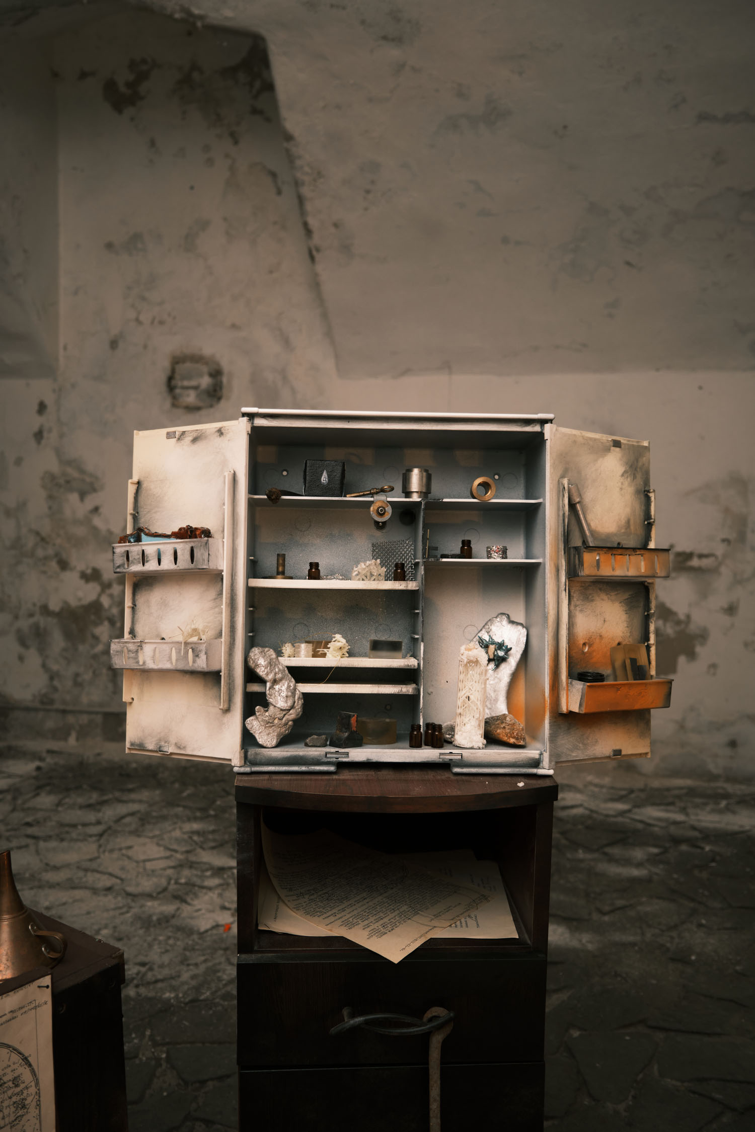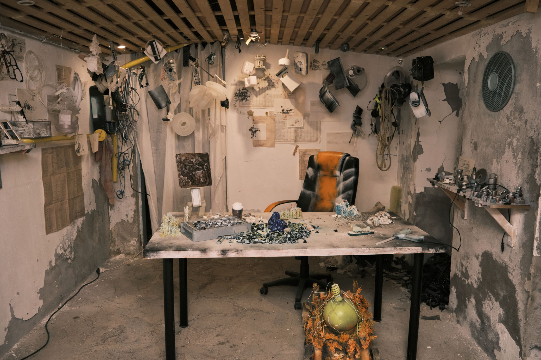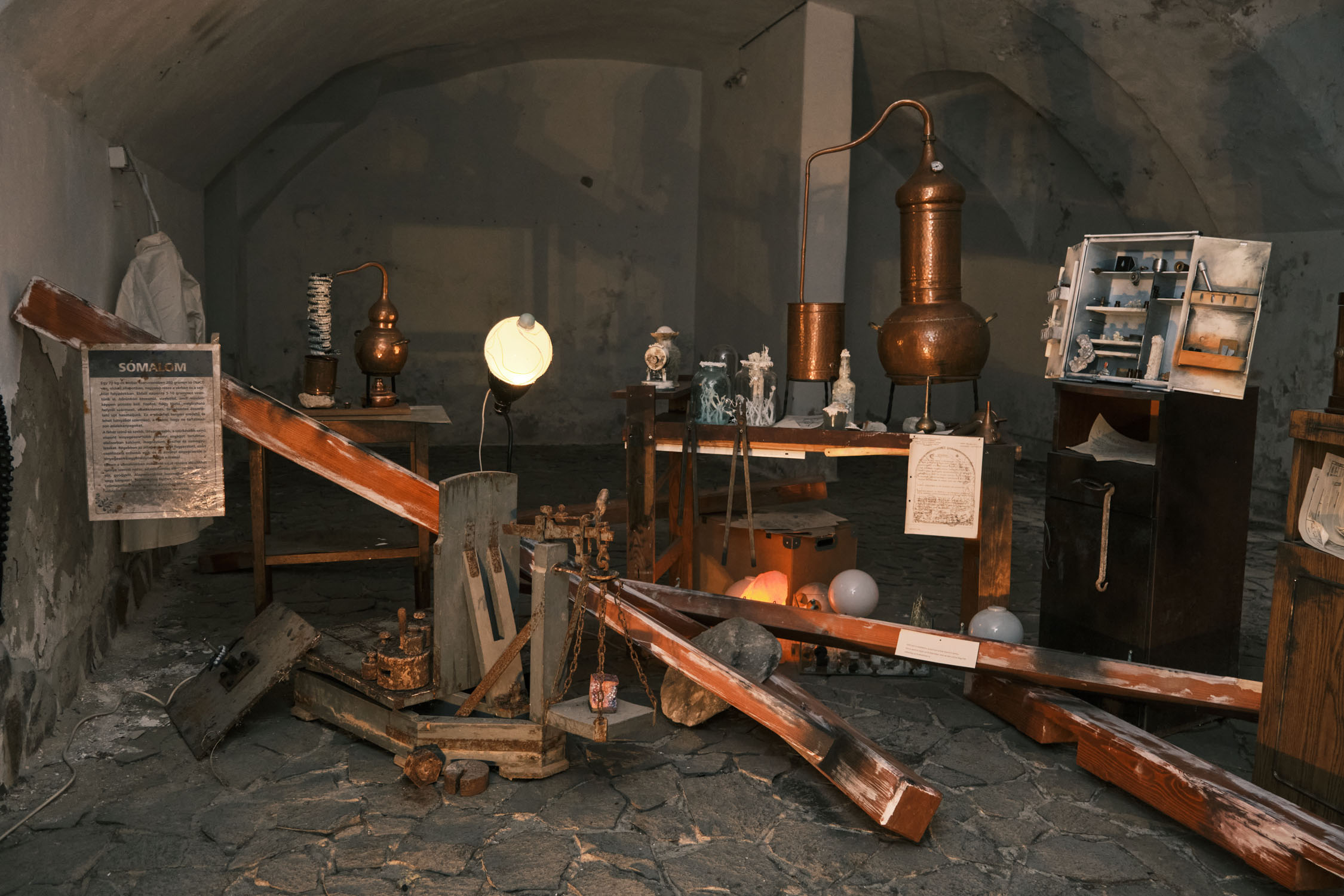 The exhibition is an environment-like space, a journey into the future by aesthetic experiences and free associations based on a lore (background story) that have been published earlier for the visitors. The offsite venue in the heart of Budapest was a haloterapeutical cellar once. Now it is out of use. In our after-the-future saltworld, it is a safe-heaven for scavenger partisans, a secret alchemy laboratory and an antiquities shop for the collected goods and parts. Life is harsh on the salty sand dunes. The ruined city is raided so many times that the few survivors have seek shelter underground. People make a living by mining and processing salt from the scorched earth, while youngsters organize junkcar races in the dried riverbed of the Danube. Saltpunks are the people who try to survive in these rugged conditions, but the term also refers to an aesthetic and political genre, like cyberpunk. The immersive, atmospherical space and the fragmental nature of the exhibited found-like objects make the visitors create their own narratives and stories about this imagined world.