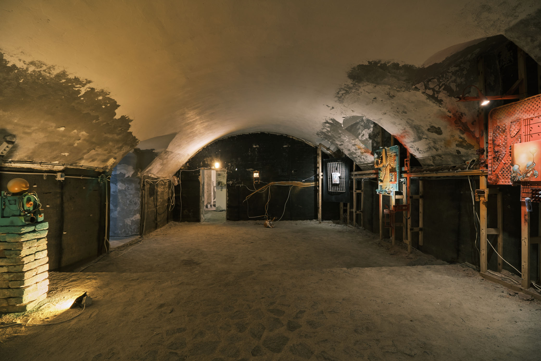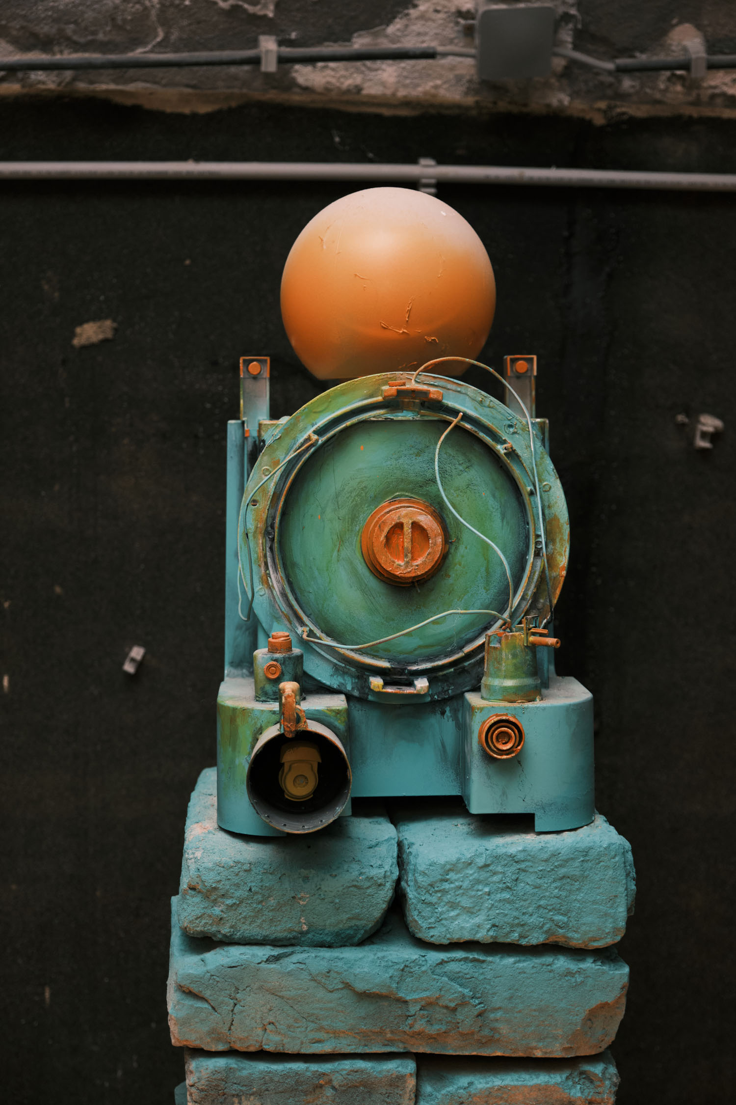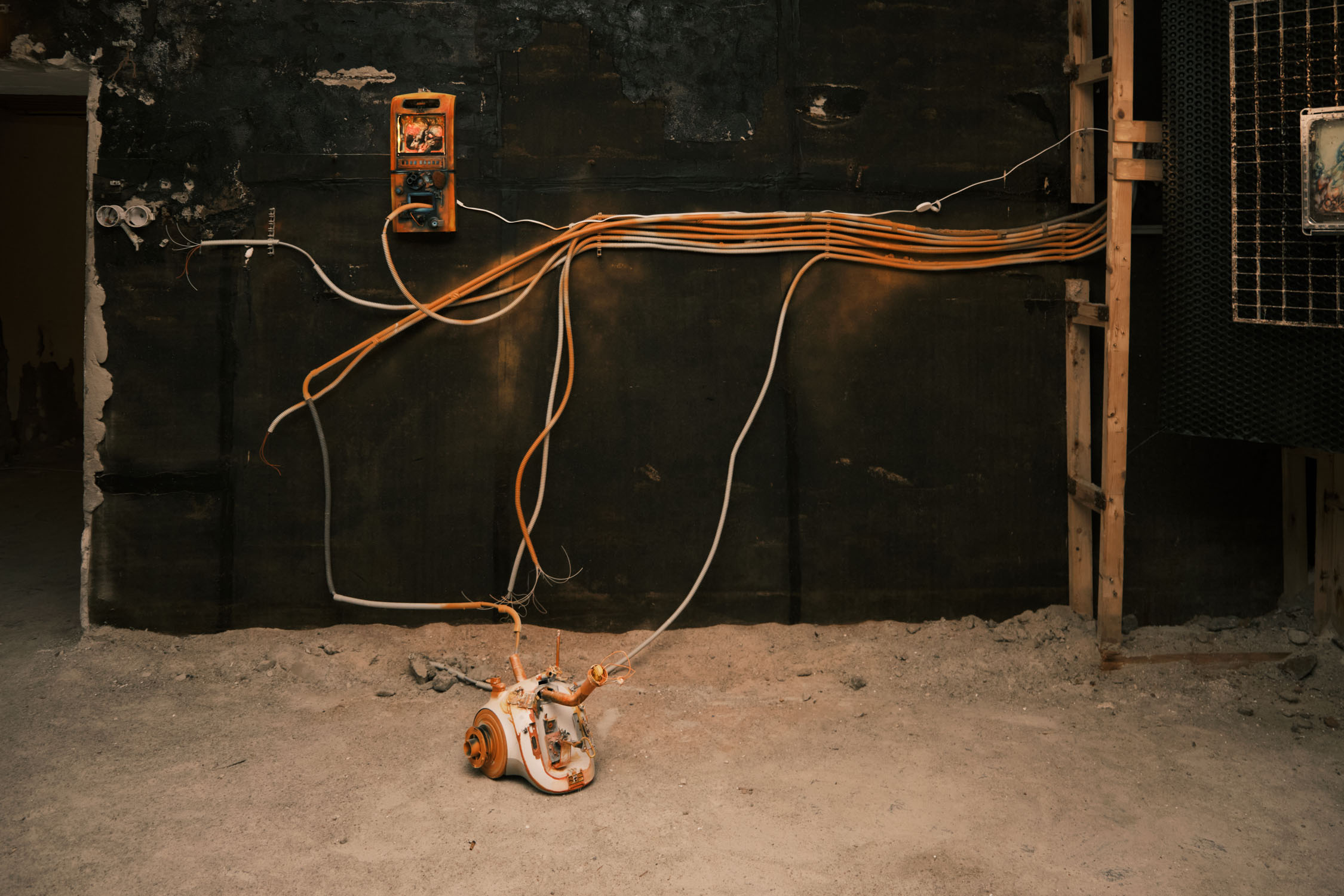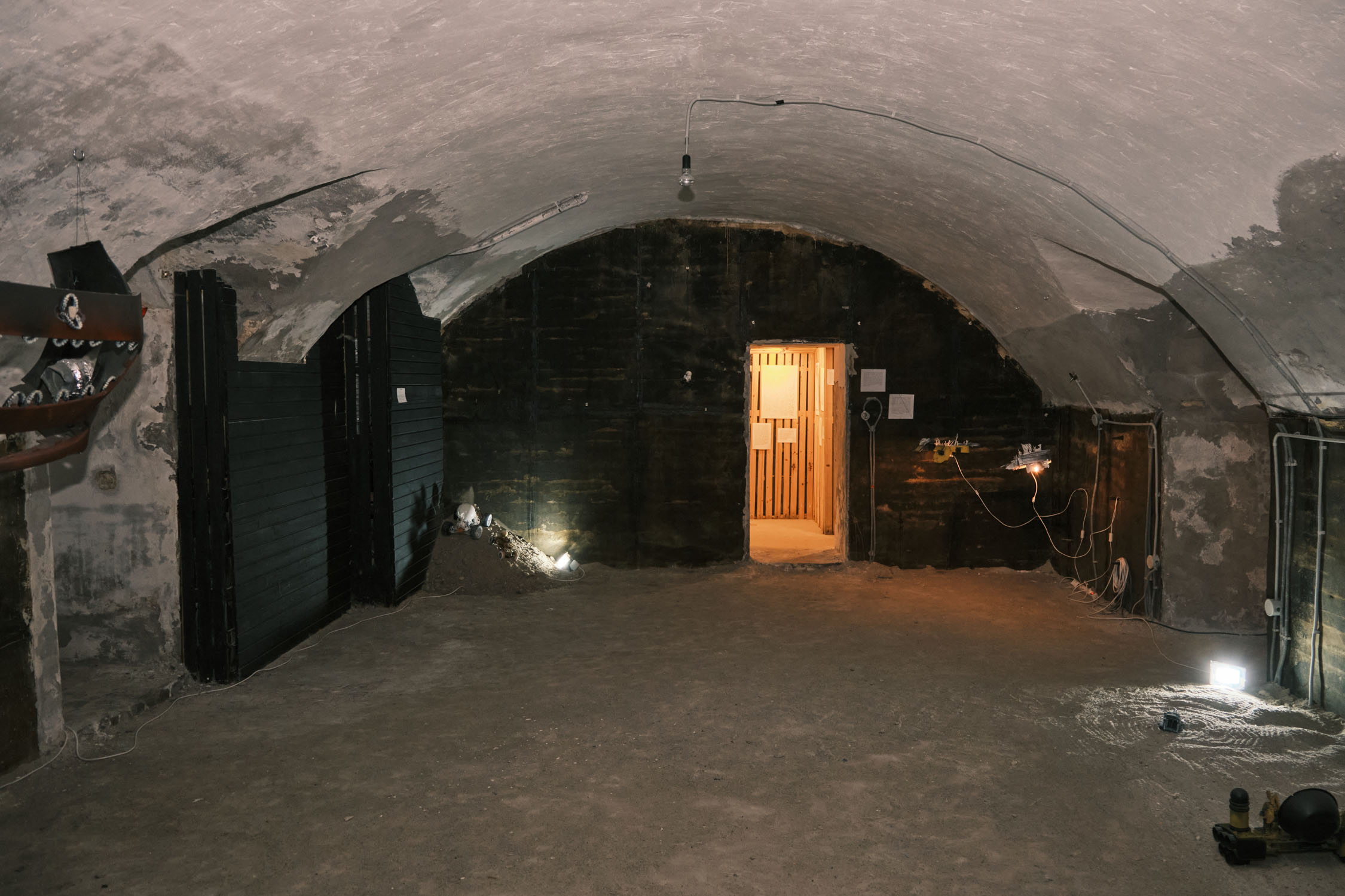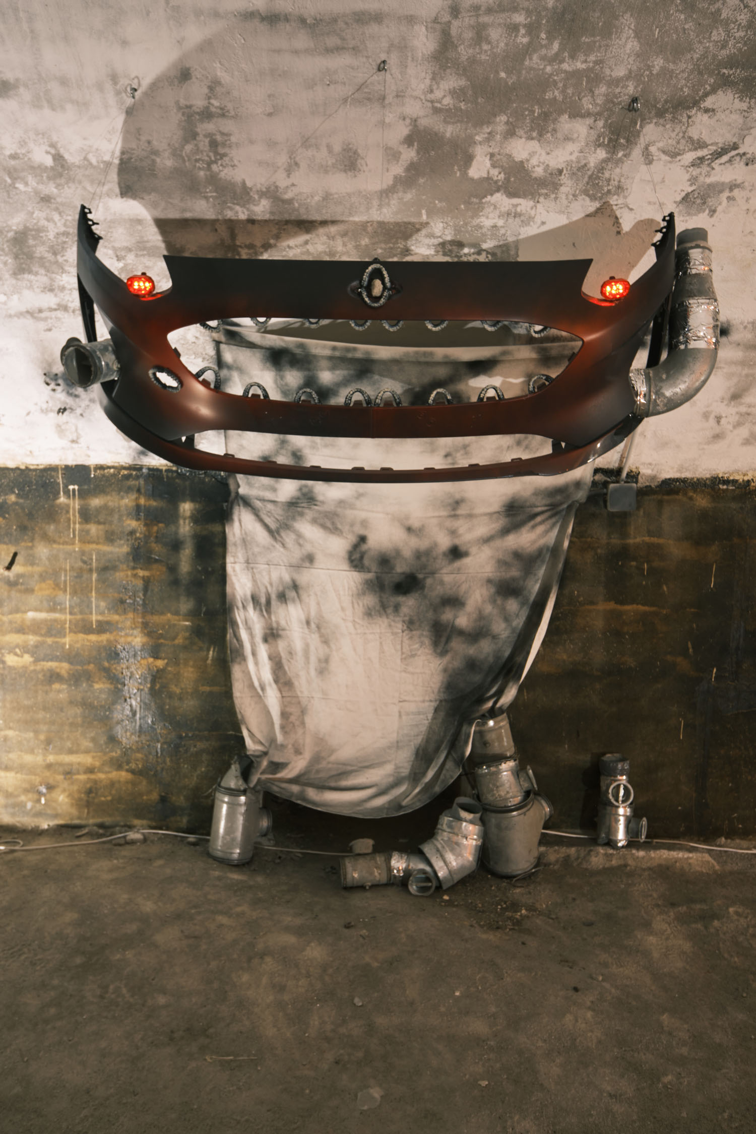 The exhibition is an environment-like space, a journey into the future by aesthetic experiences and free associations based on a lore (background story) that have been published earlier for the visitors. The offsite venue in the heart of Budapest was a haloterapeutical cellar once. Now it is out of use. In our after-the-future saltworld, it is a safe-heaven for scavenger partisans, a secret alchemy laboratory and an antiquities shop for the collected goods and parts. Life is harsh on the salty sand dunes. The ruined city is raided so many times that the few survivors have seek shelter underground. People make a living by mining and processing salt from the scorched earth, while youngsters organize junkcar races in the dried riverbed of the Danube. Saltpunks are the people who try to survive in these rugged conditions, but the term also refers to an aesthetic and political genre, like cyberpunk. The immersive, atmospherical space and the fragmental nature of the exhibited found-like objects make the visitors create their own narratives and stories about this imagined world.