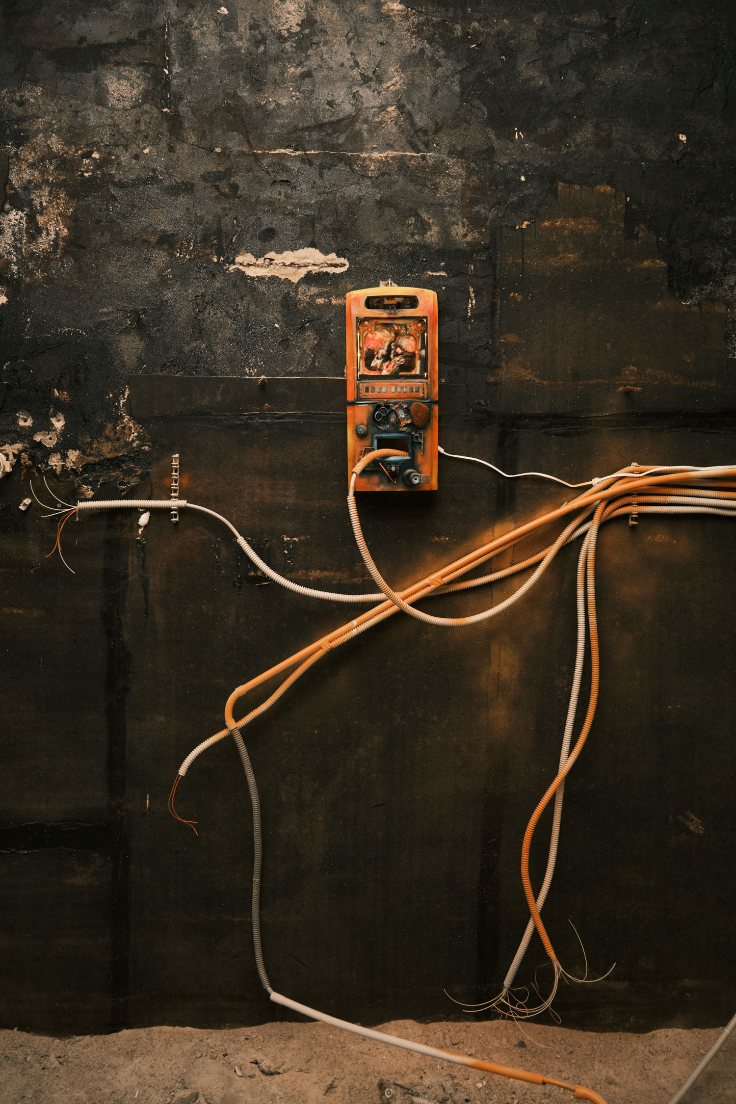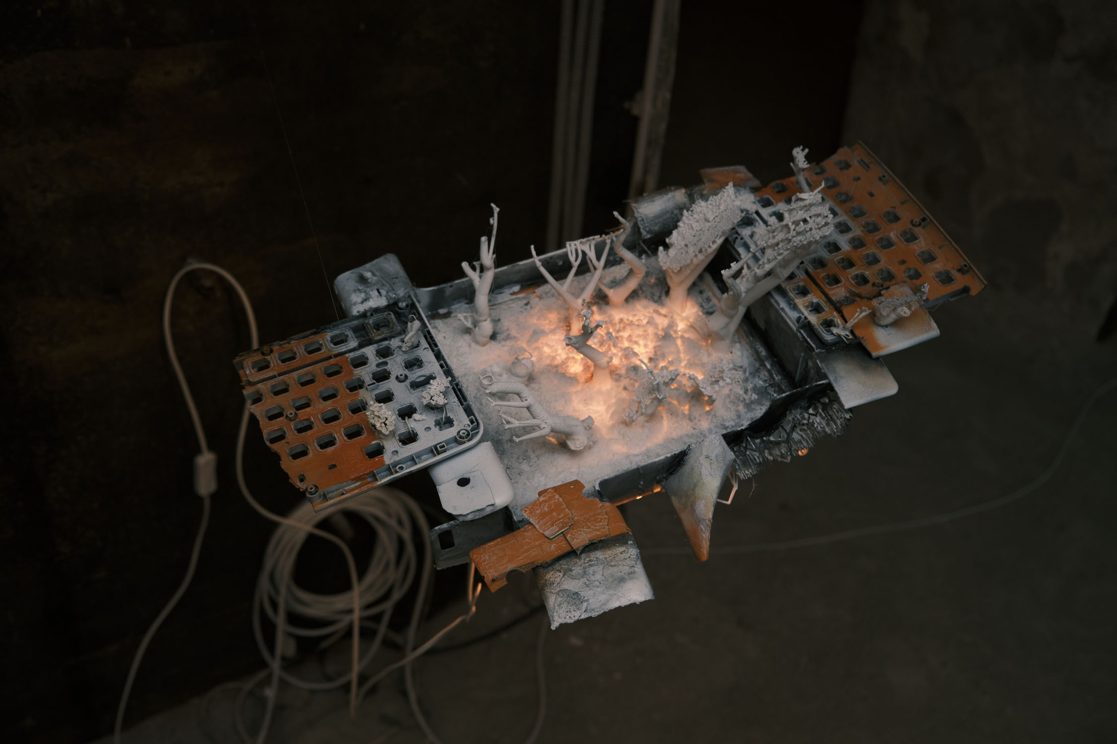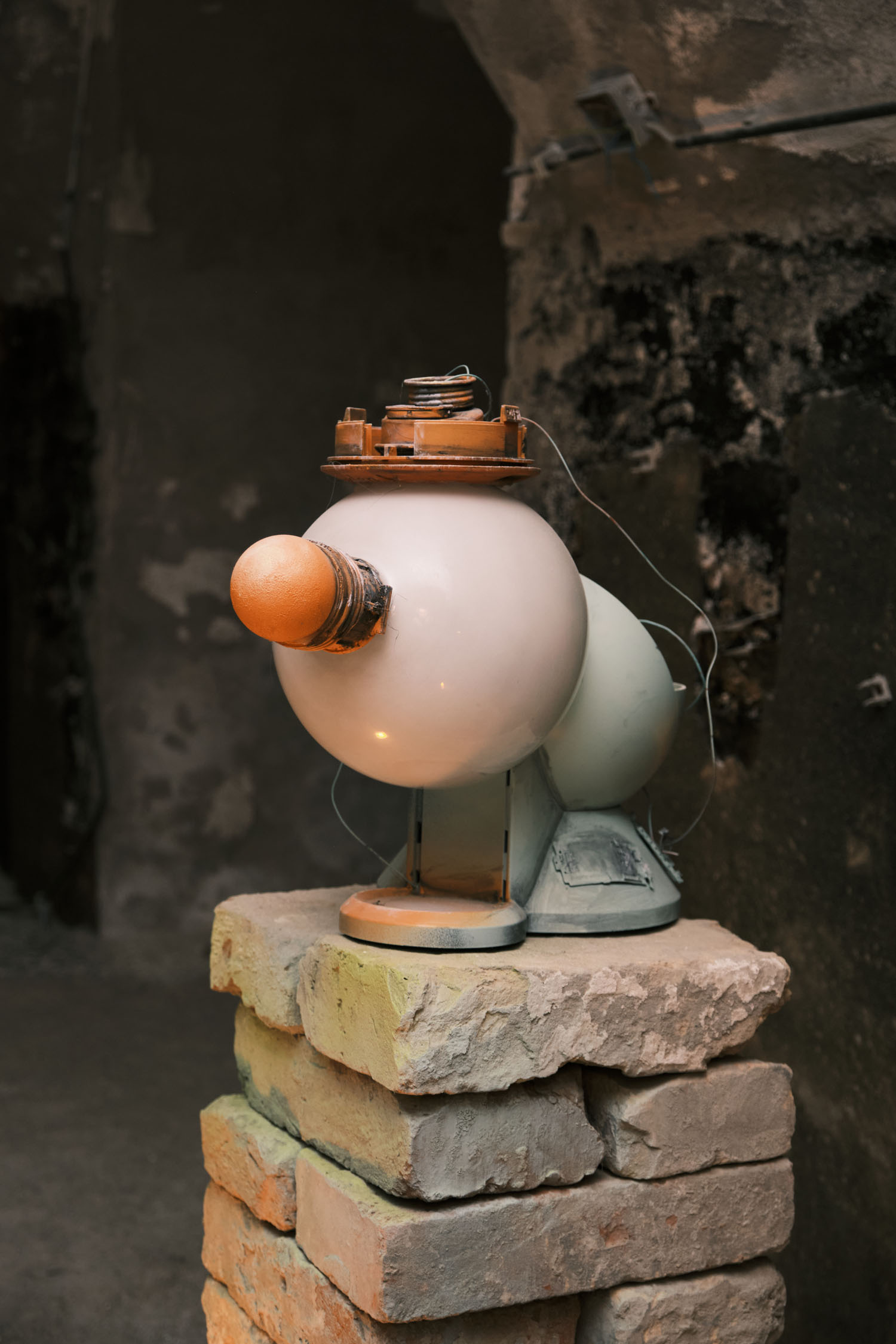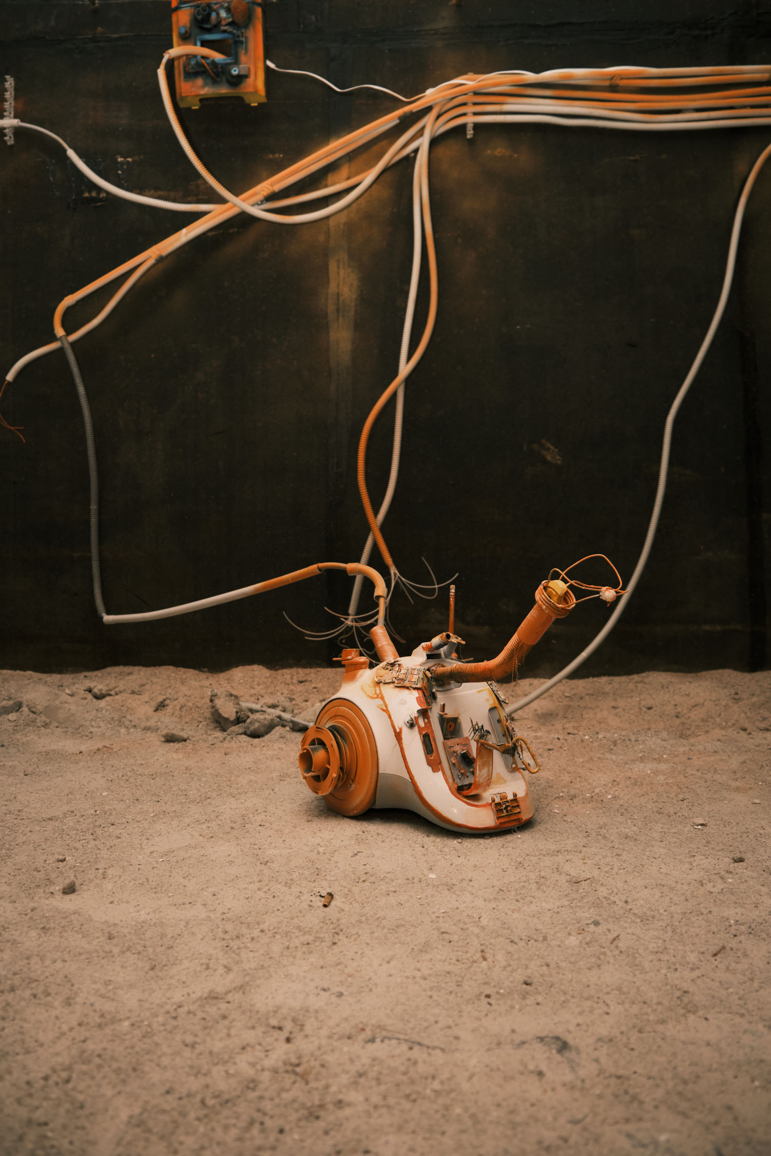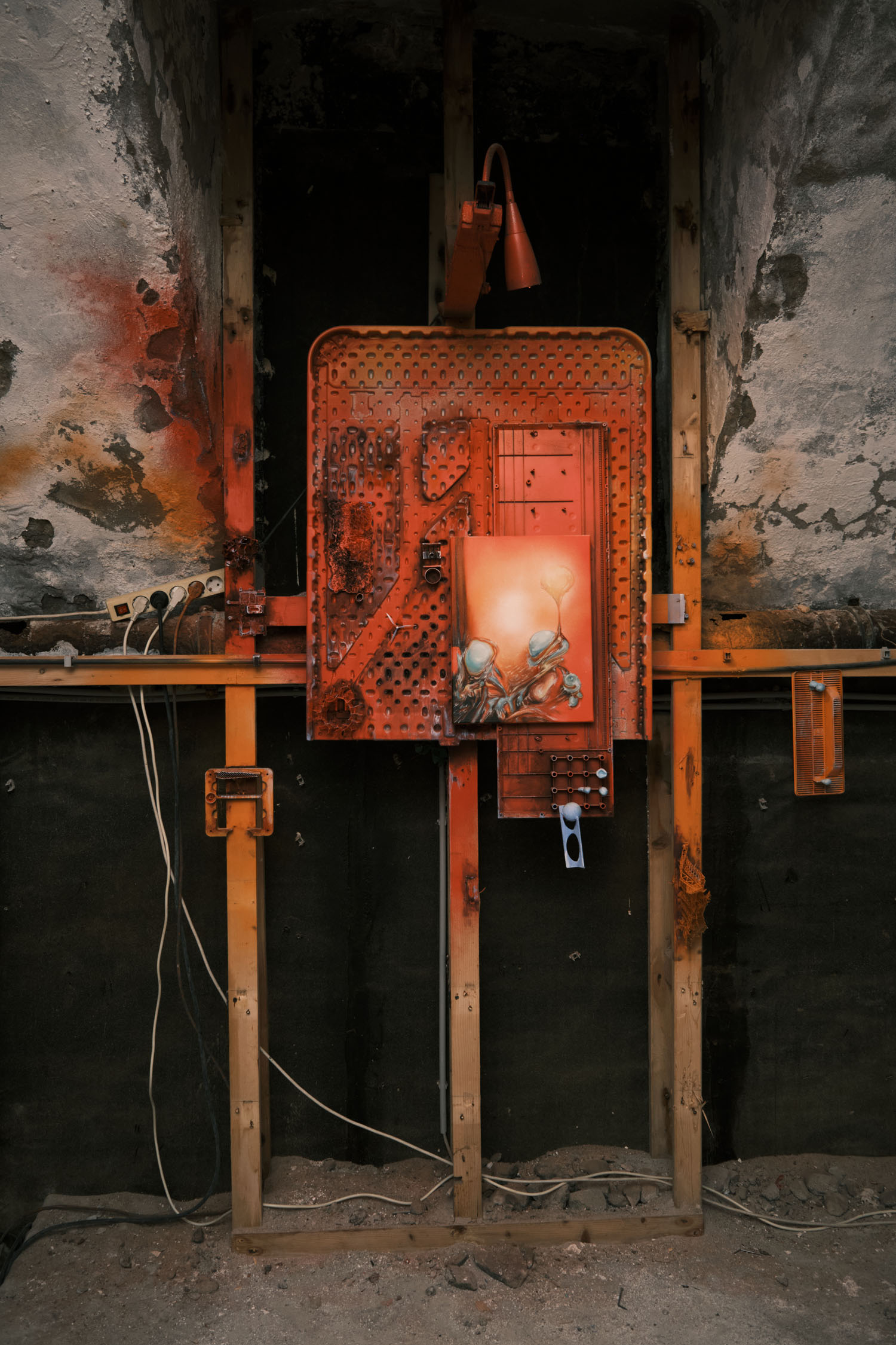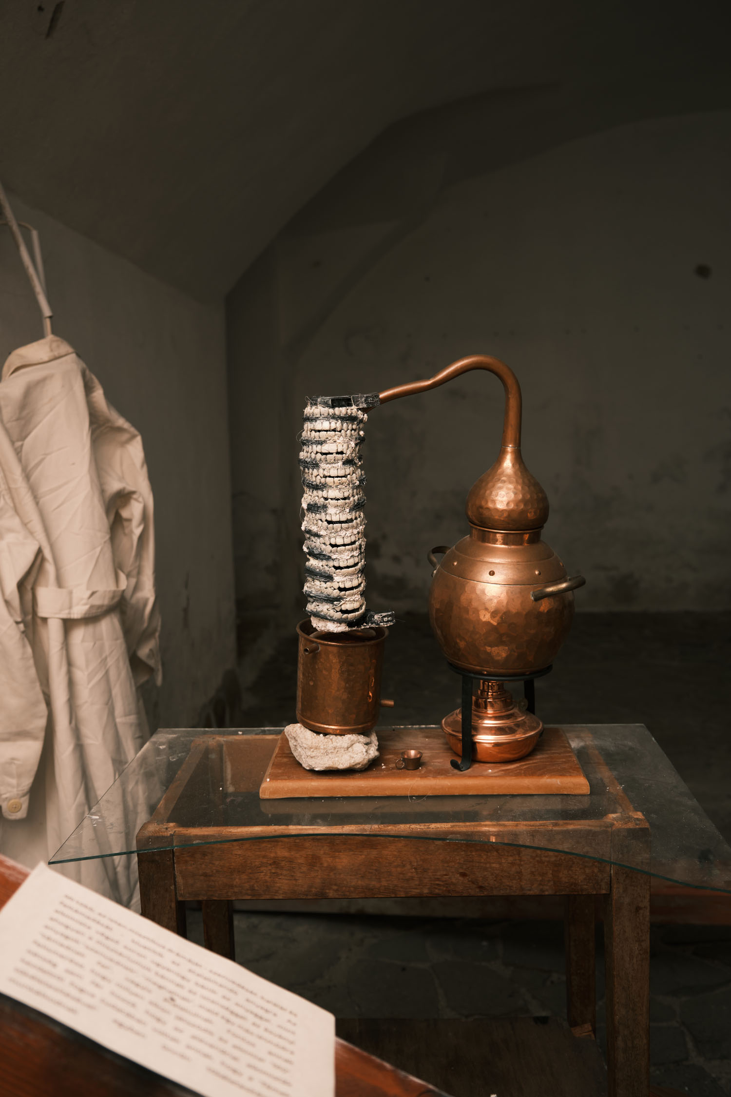 The exhibition is an environment-like space, a journey into the future by aesthetic experiences and free associations based on a lore (background story) that have been published earlier for the visitors. The offsite venue in the heart of Budapest was a haloterapeutical cellar once. Now it is out of use. In our after-the-future saltworld, it is a safe-heaven for scavenger partisans, a secret alchemy laboratory and an antiquities shop for the collected goods and parts. Life is harsh on the salty sand dunes. The ruined city is raided so many times that the few survivors have seek shelter underground. People make a living by mining and processing salt from the scorched earth, while youngsters organize junkcar races in the dried riverbed of the Danube. Saltpunks are the people who try to survive in these rugged conditions, but the term also refers to an aesthetic and political genre, like cyberpunk. The immersive, atmospherical space and the fragmental nature of the exhibited found-like objects make the visitors create their own narratives and stories about this imagined world.