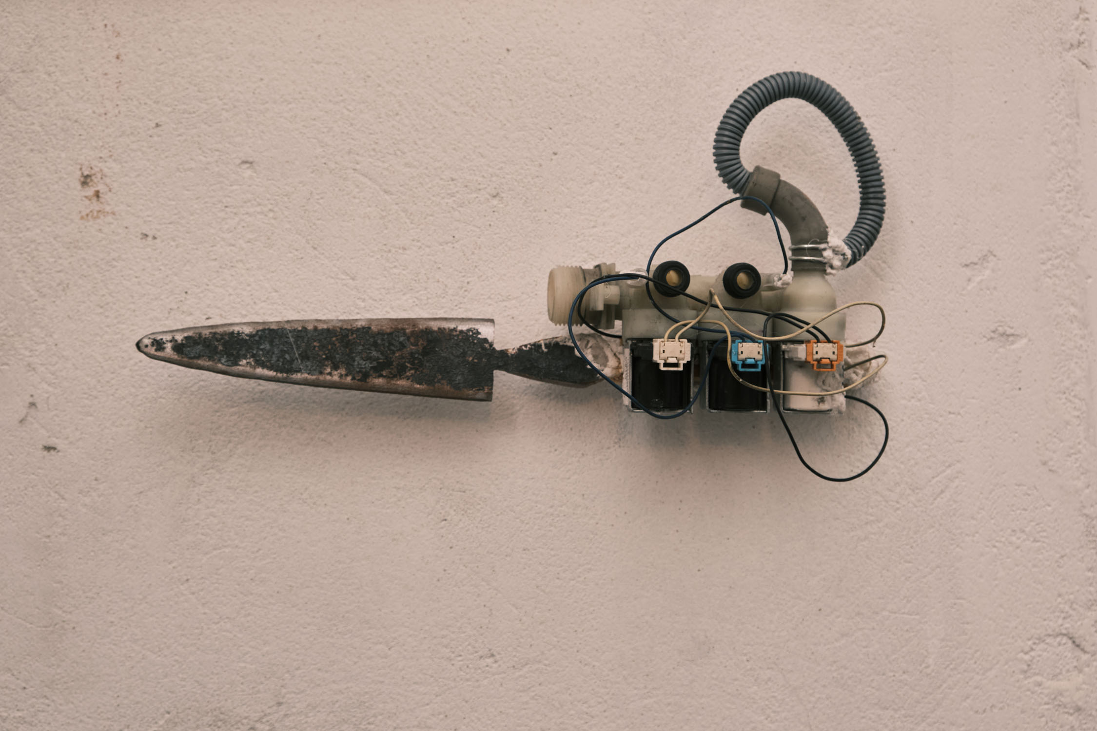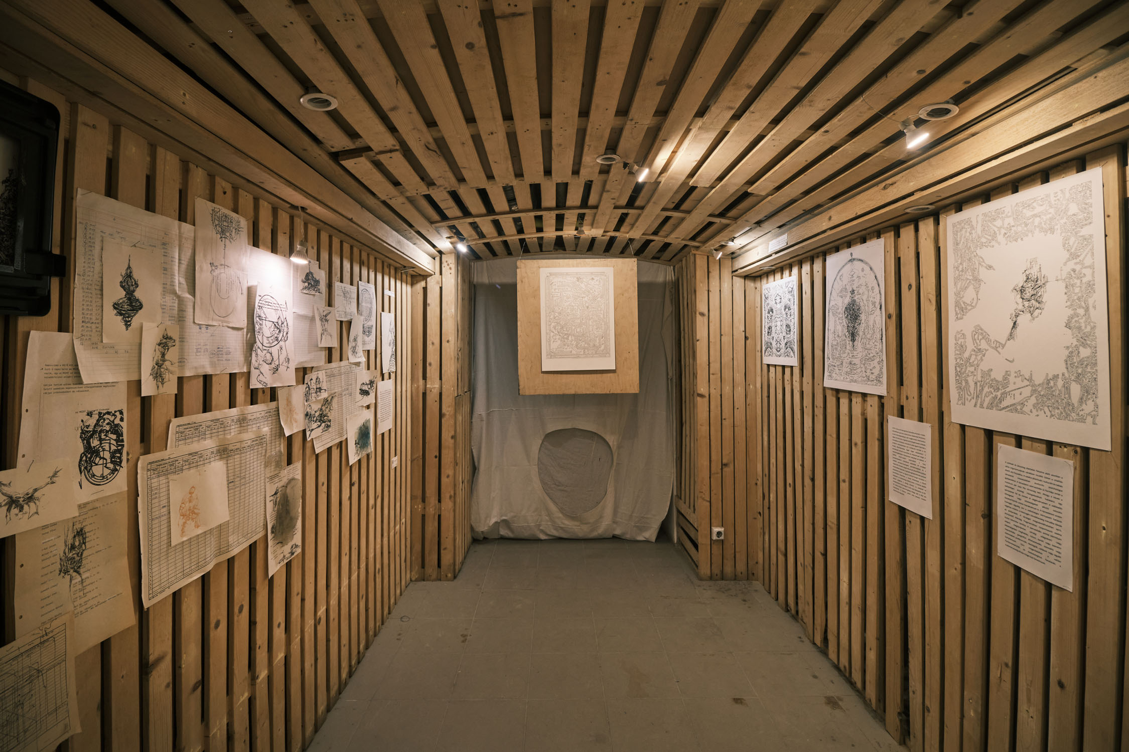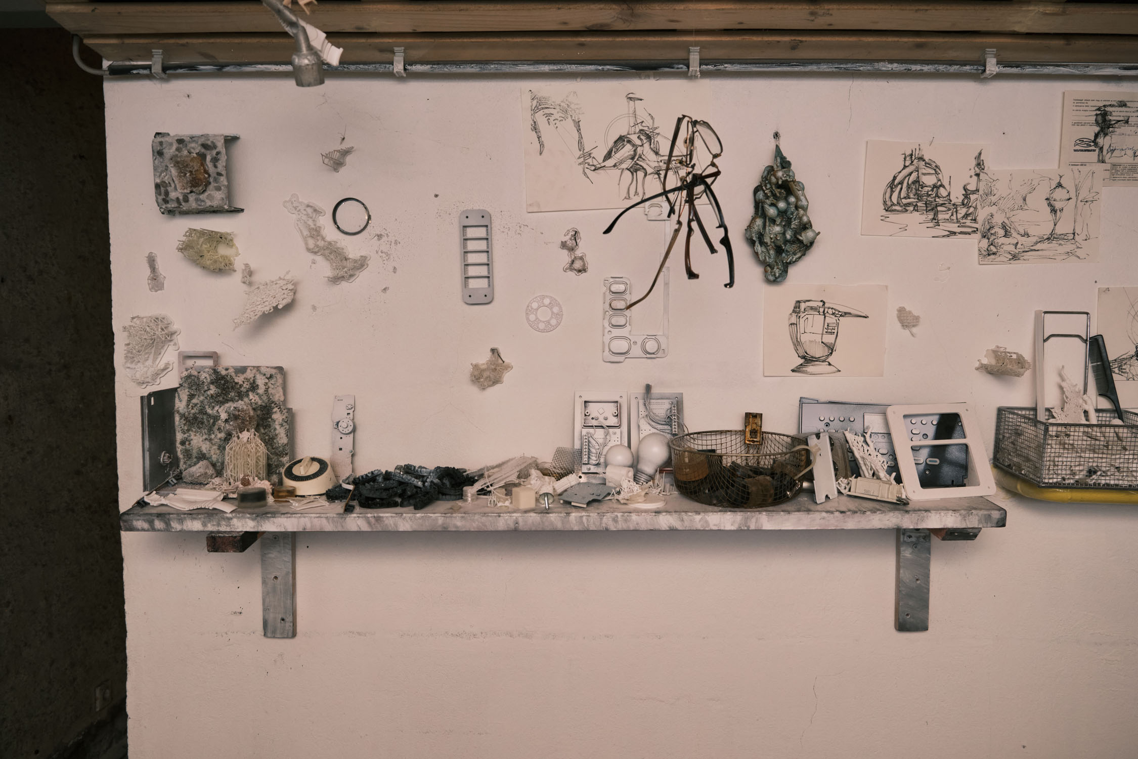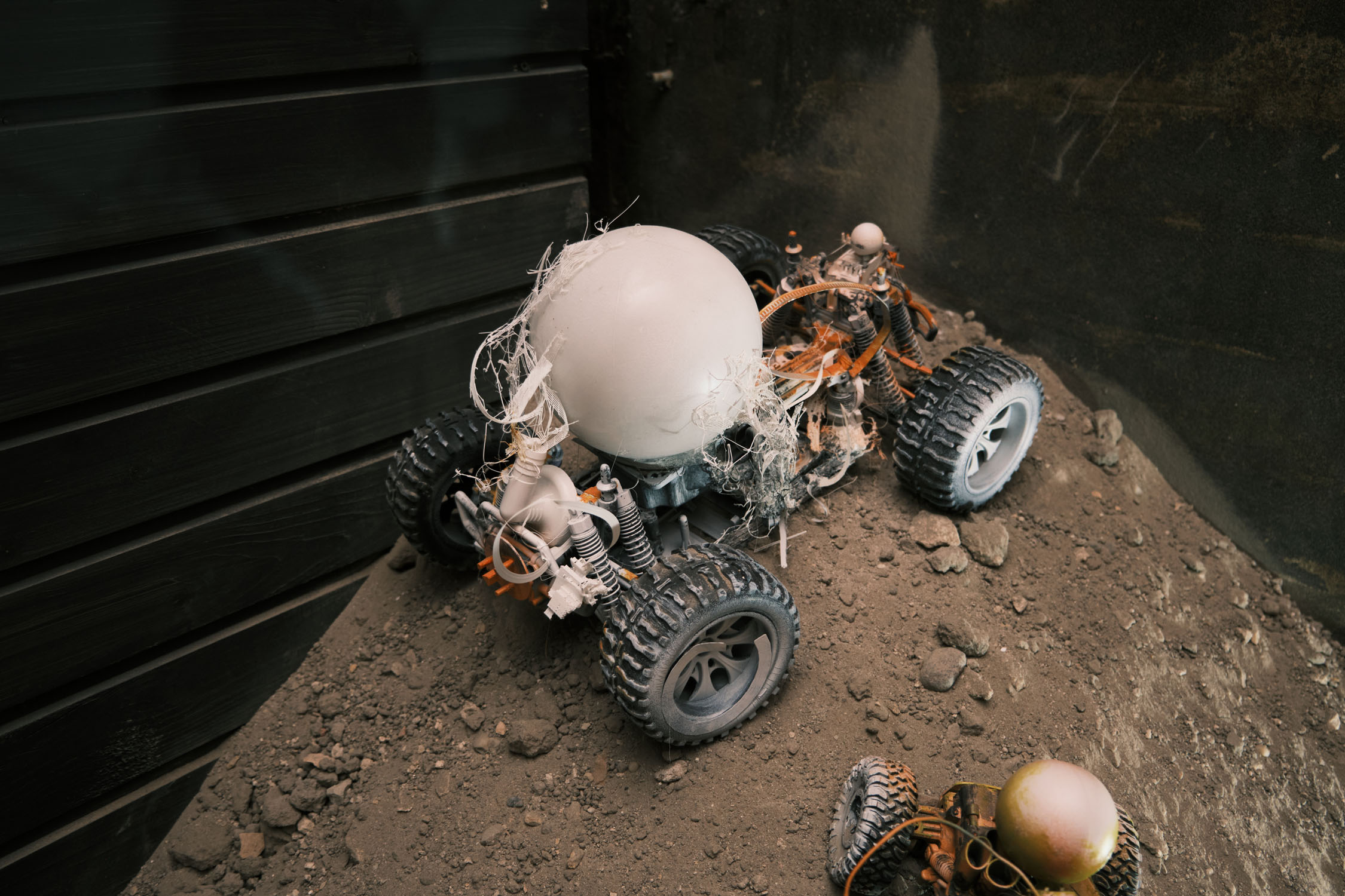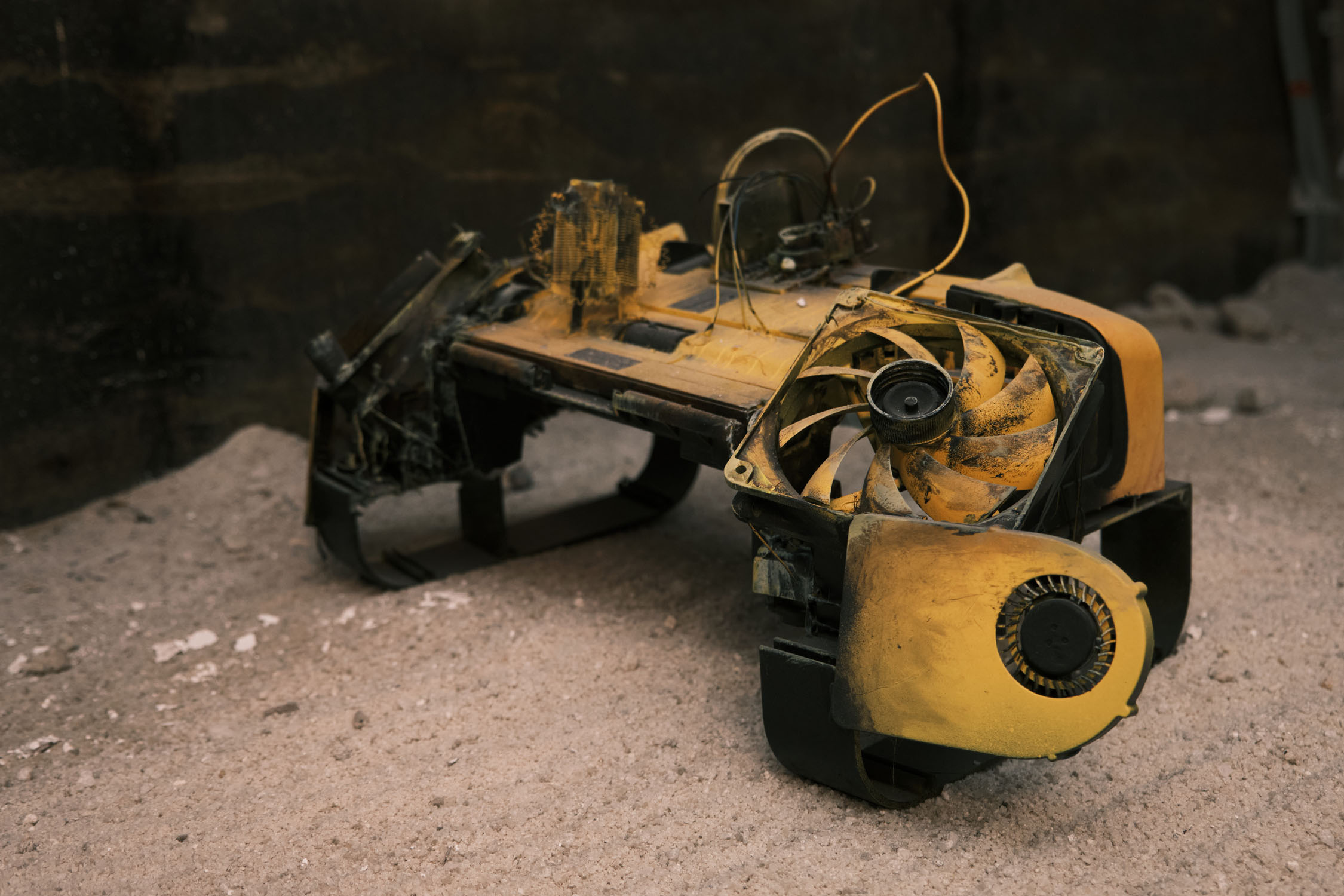 The exhibition is an environment-like space, a journey into the future by aesthetic experiences and free associations based on a lore (background story) that have been published earlier for the visitors. The offsite venue in the heart of Budapest was a haloterapeutical cellar once. Now it is out of use. In our after-the-future saltworld, it is a safe-heaven for scavenger partisans, a secret alchemy laboratory and an antiquities shop for the collected goods and parts. Life is harsh on the salty sand dunes. The ruined city is raided so many times that the few survivors have seek shelter underground. People make a living by mining and processing salt from the scorched earth, while youngsters organize junkcar races in the dried riverbed of the Danube. Saltpunks are the people who try to survive in these rugged conditions, but the term also refers to an aesthetic and political genre, like cyberpunk. The immersive, atmospherical space and the fragmental nature of the exhibited found-like objects make the visitors create their own narratives and stories about this imagined world.