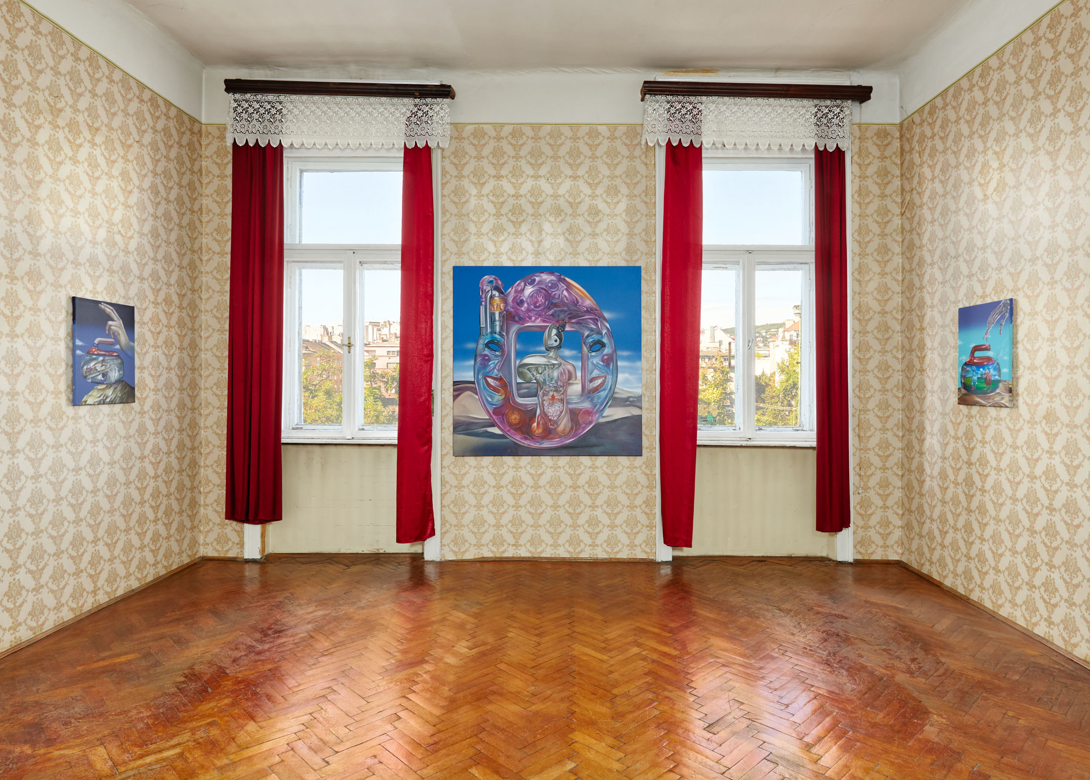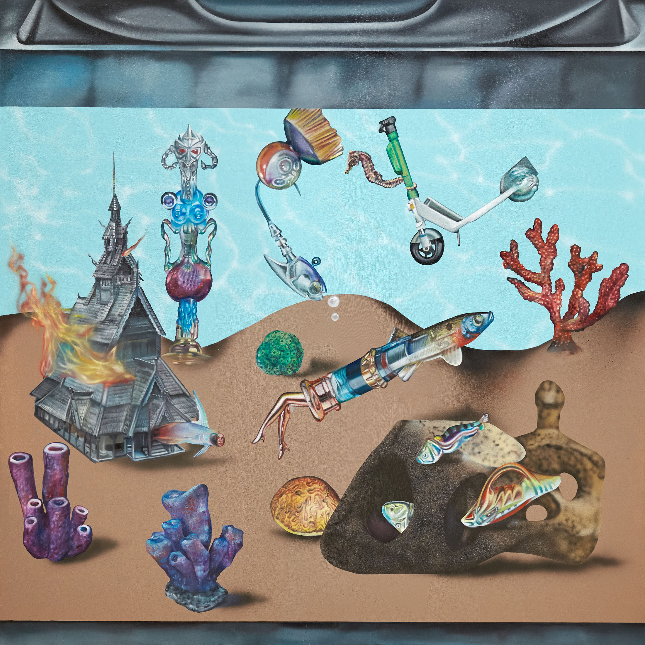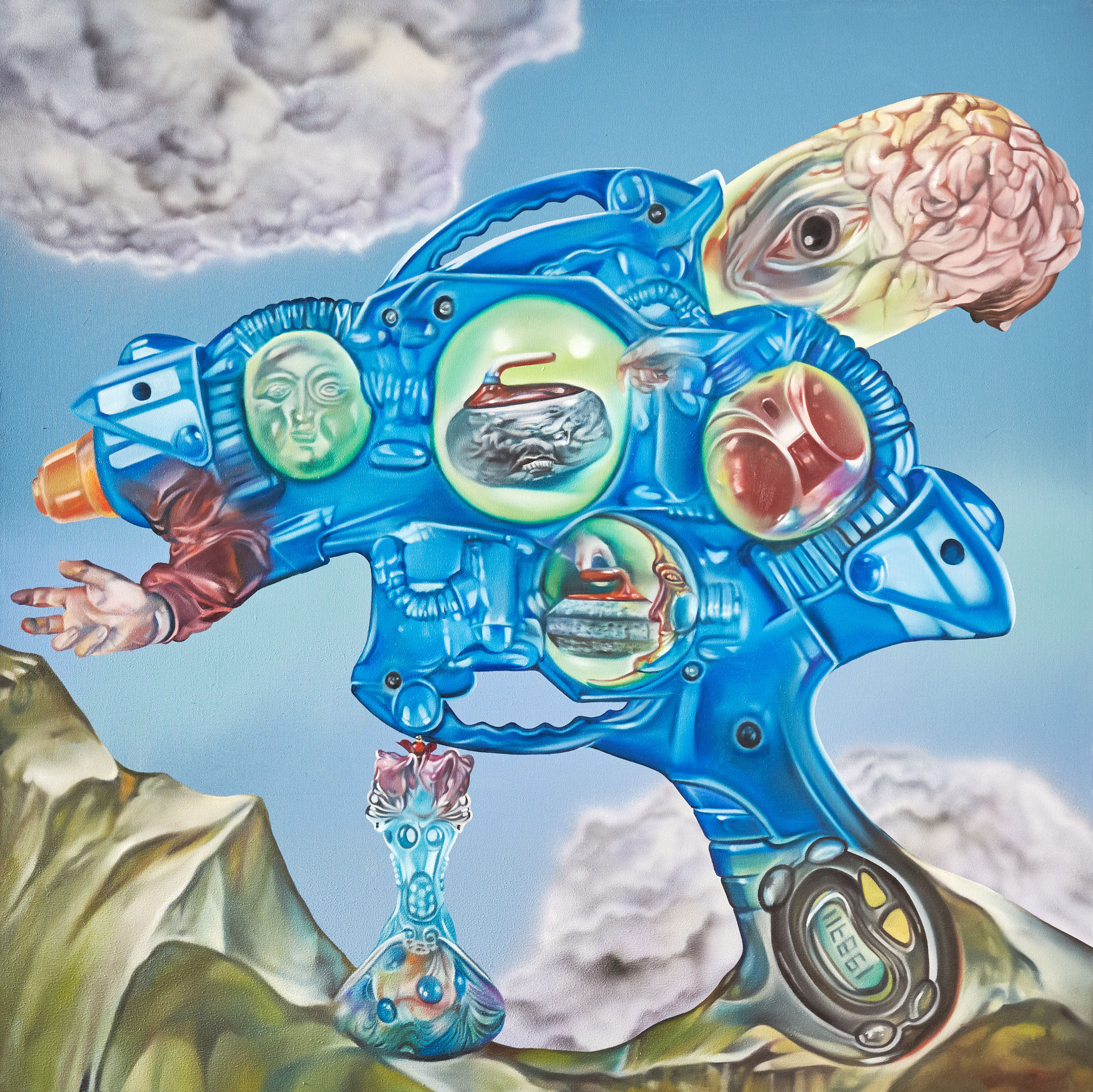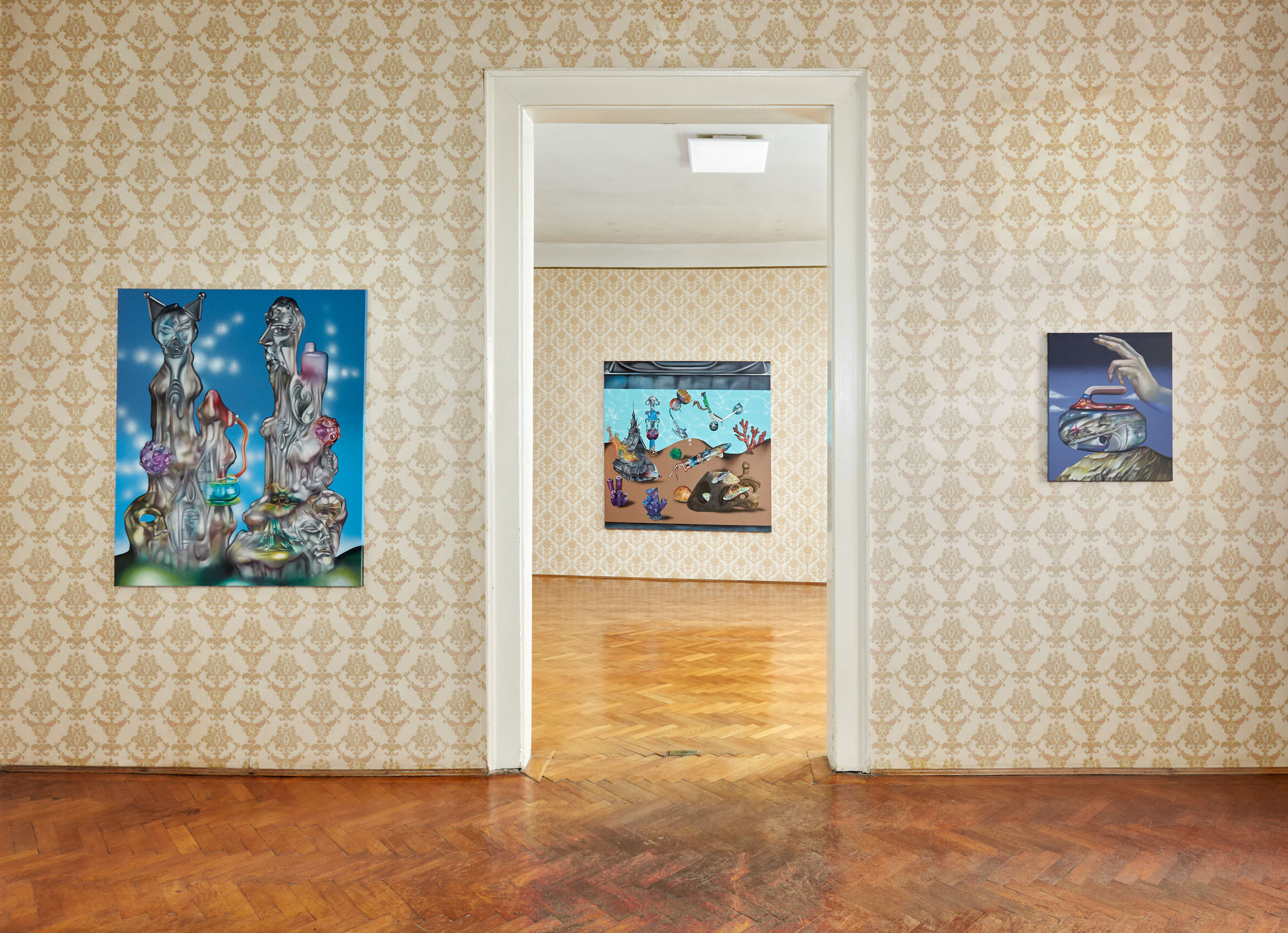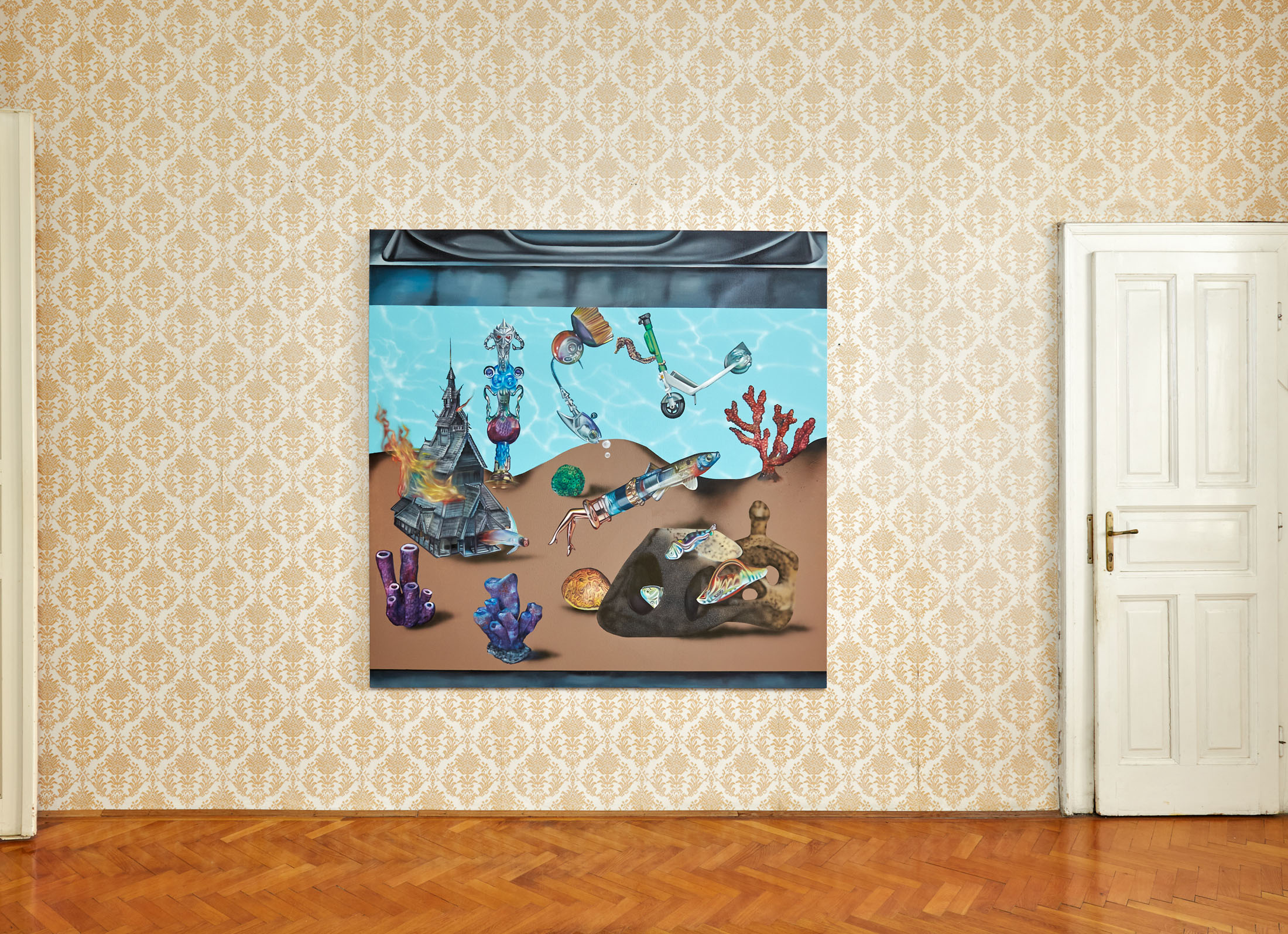 The works on view conjure the burning wooden church of Norwegian black metal, where the space of aquaristics unexpectedly intersects with the motifs of criminology. Steampunk shapes resembling water pistols, along with overdesigned objects that seem almost generated by artificial intelligence, open up new worlds in their details. Curling as a visual motif emerges from a poster glimpsed at a Milan bus stop, while smaller canvases recall Bosch’s grotesque figures, reimagined as if they were mass-produced toy silhouettes.