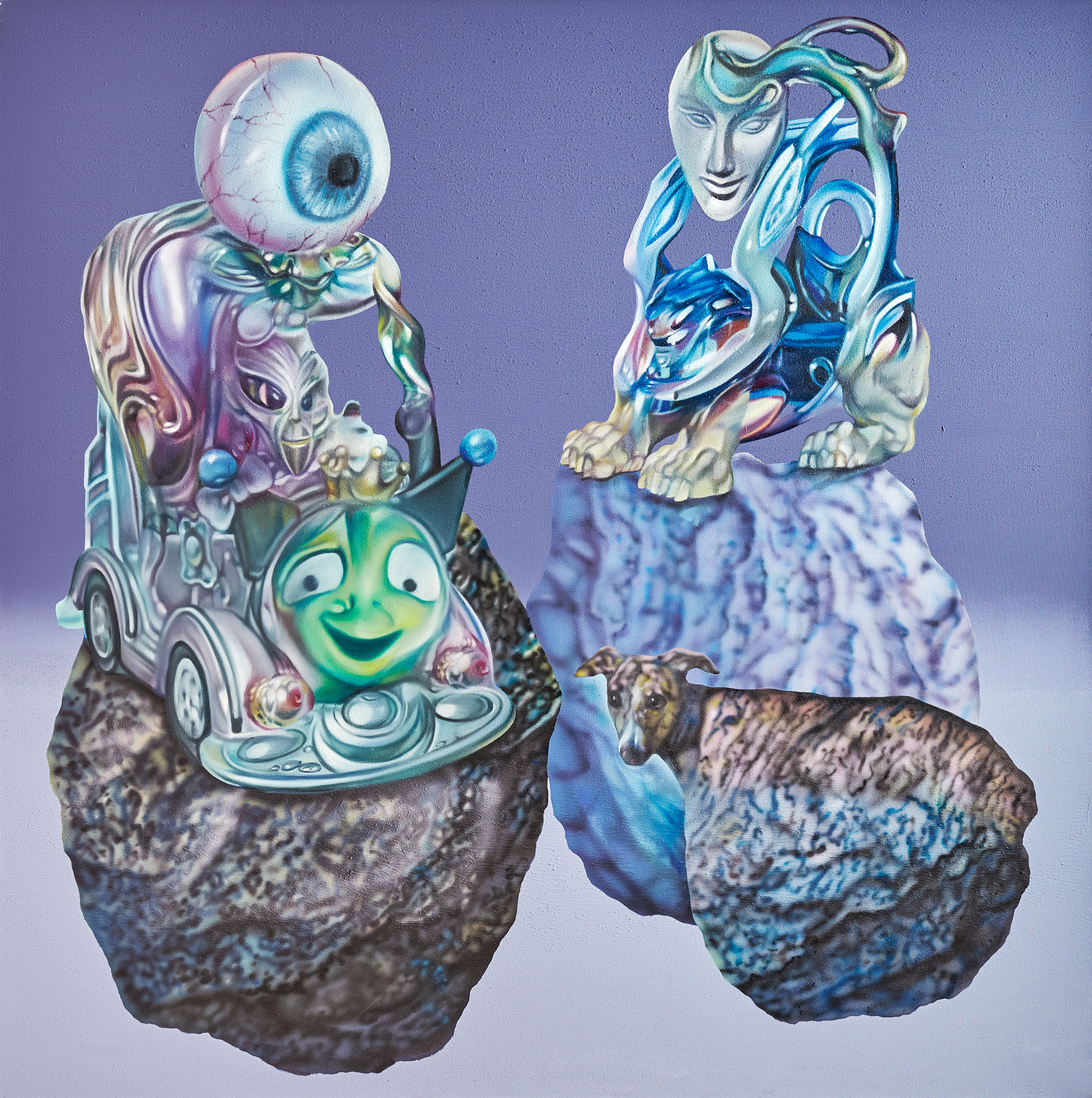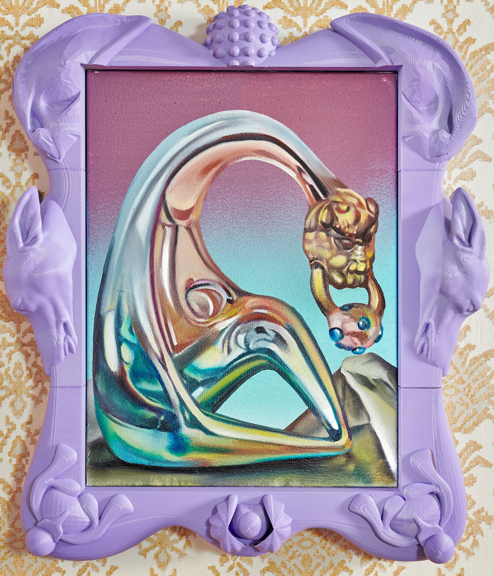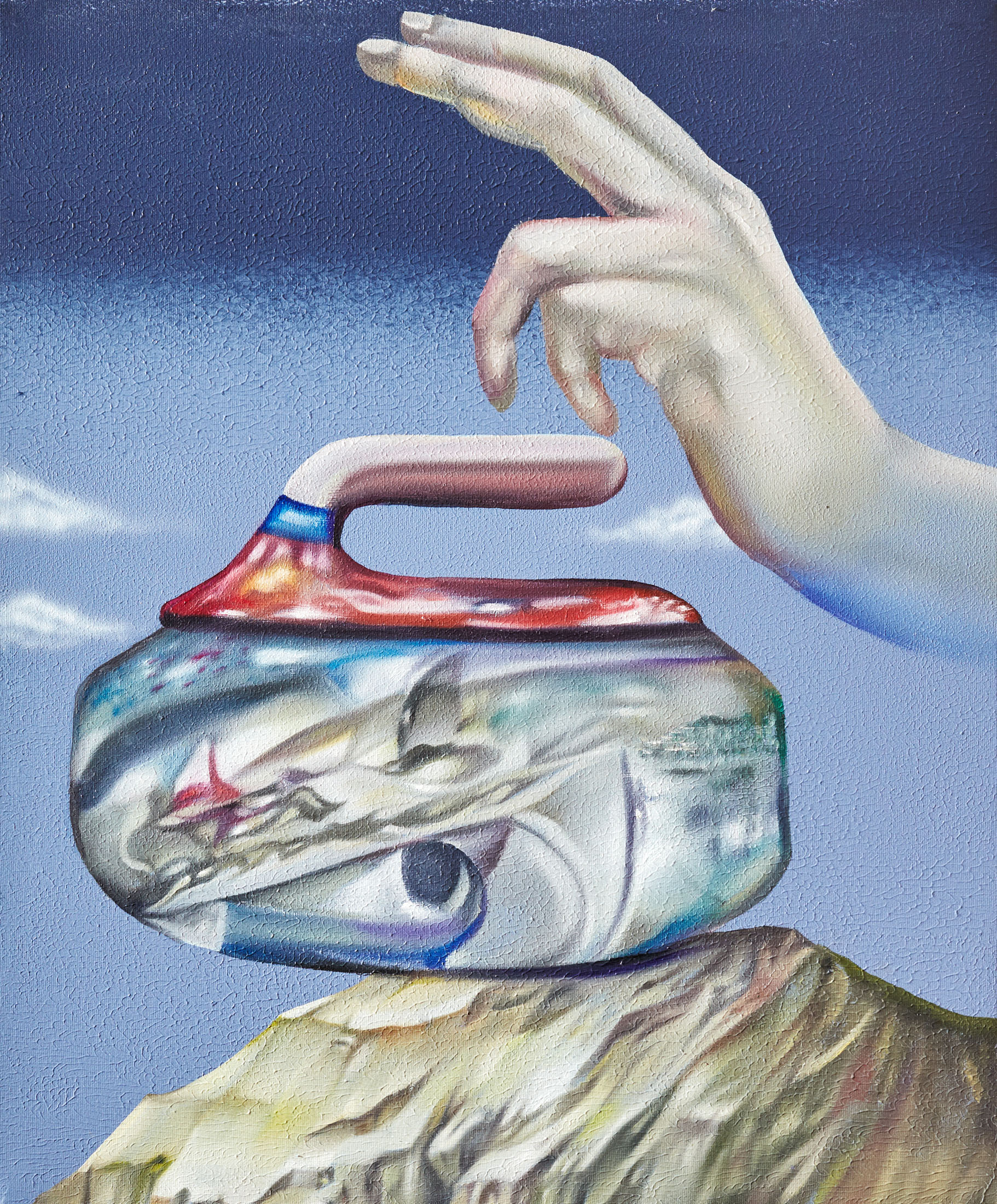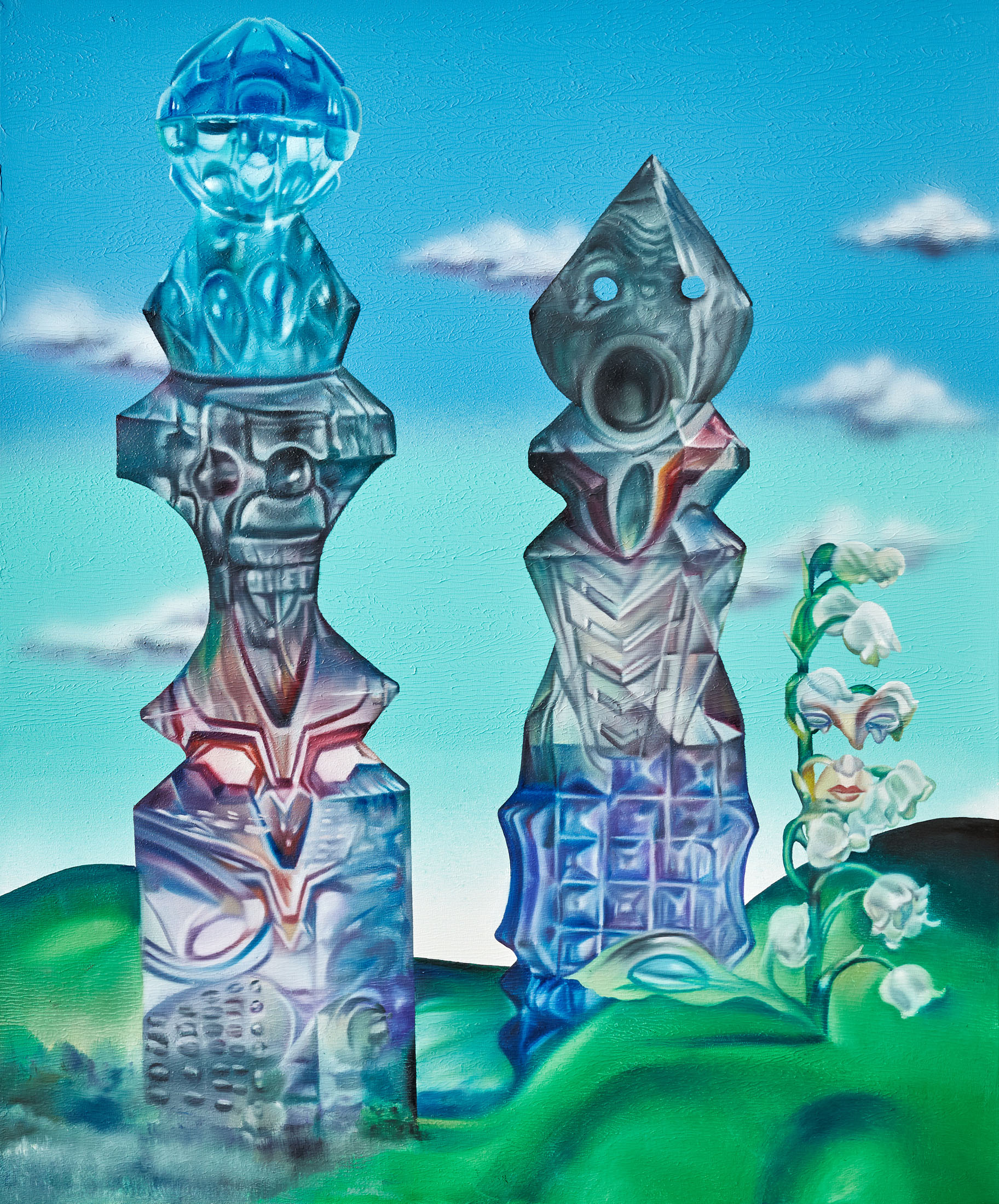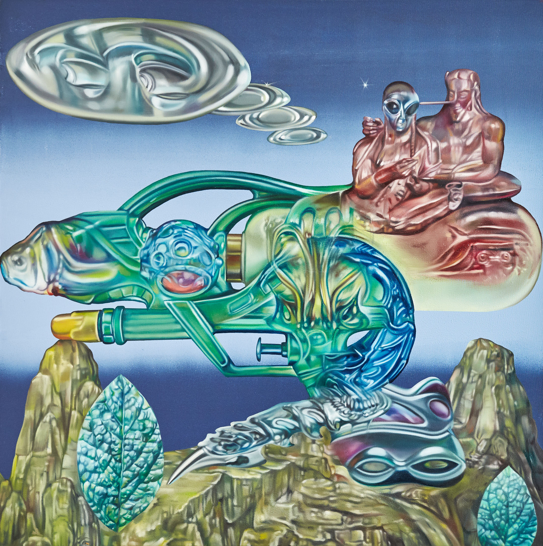 The works on view conjure the burning wooden church of Norwegian black metal, where the space of aquaristics unexpectedly intersects with the motifs of criminology. Steampunk shapes resembling water pistols, along with overdesigned objects that seem almost generated by artificial intelligence, open up new worlds in their details. Curling as a visual motif emerges from a poster glimpsed at a Milan bus stop, while smaller canvases recall Bosch’s grotesque figures, reimagined as if they were mass-produced toy silhouettes.