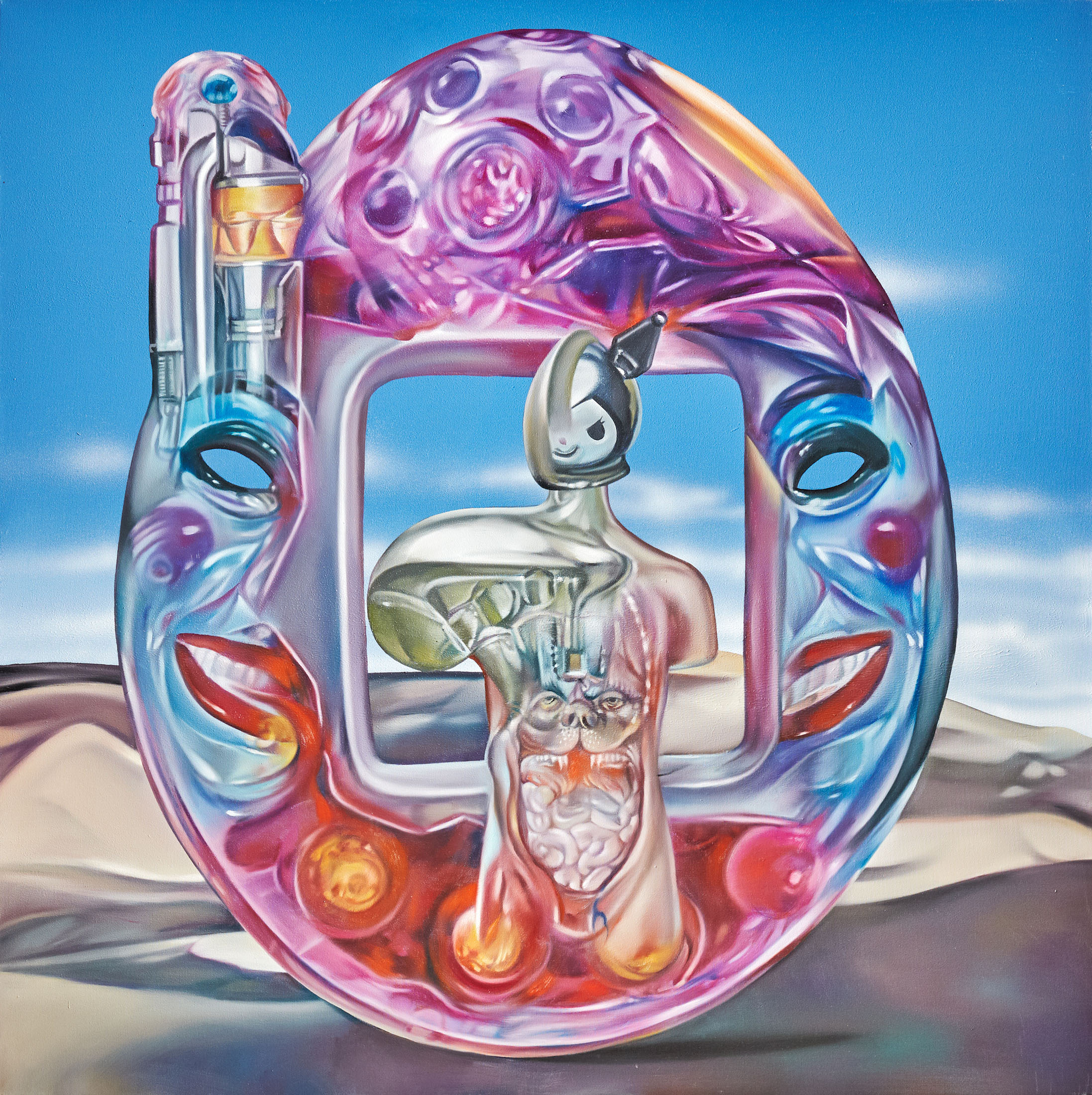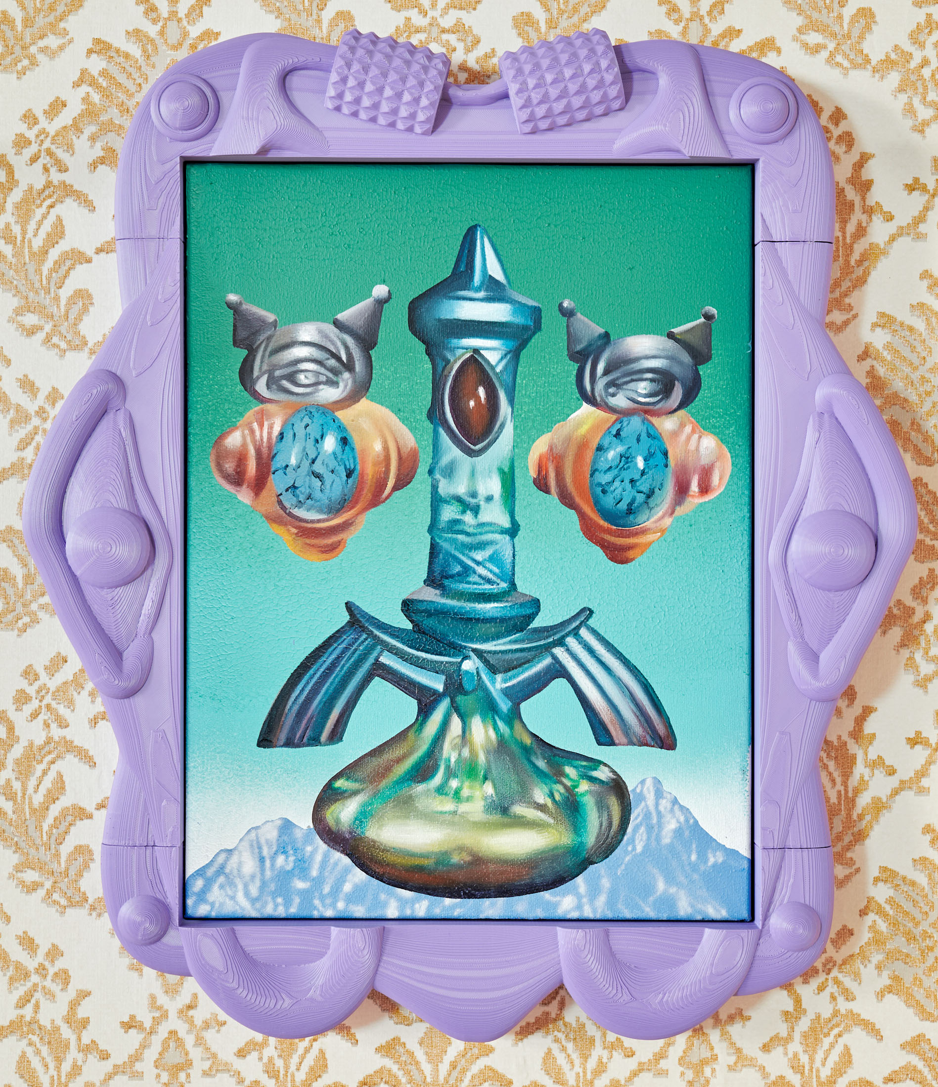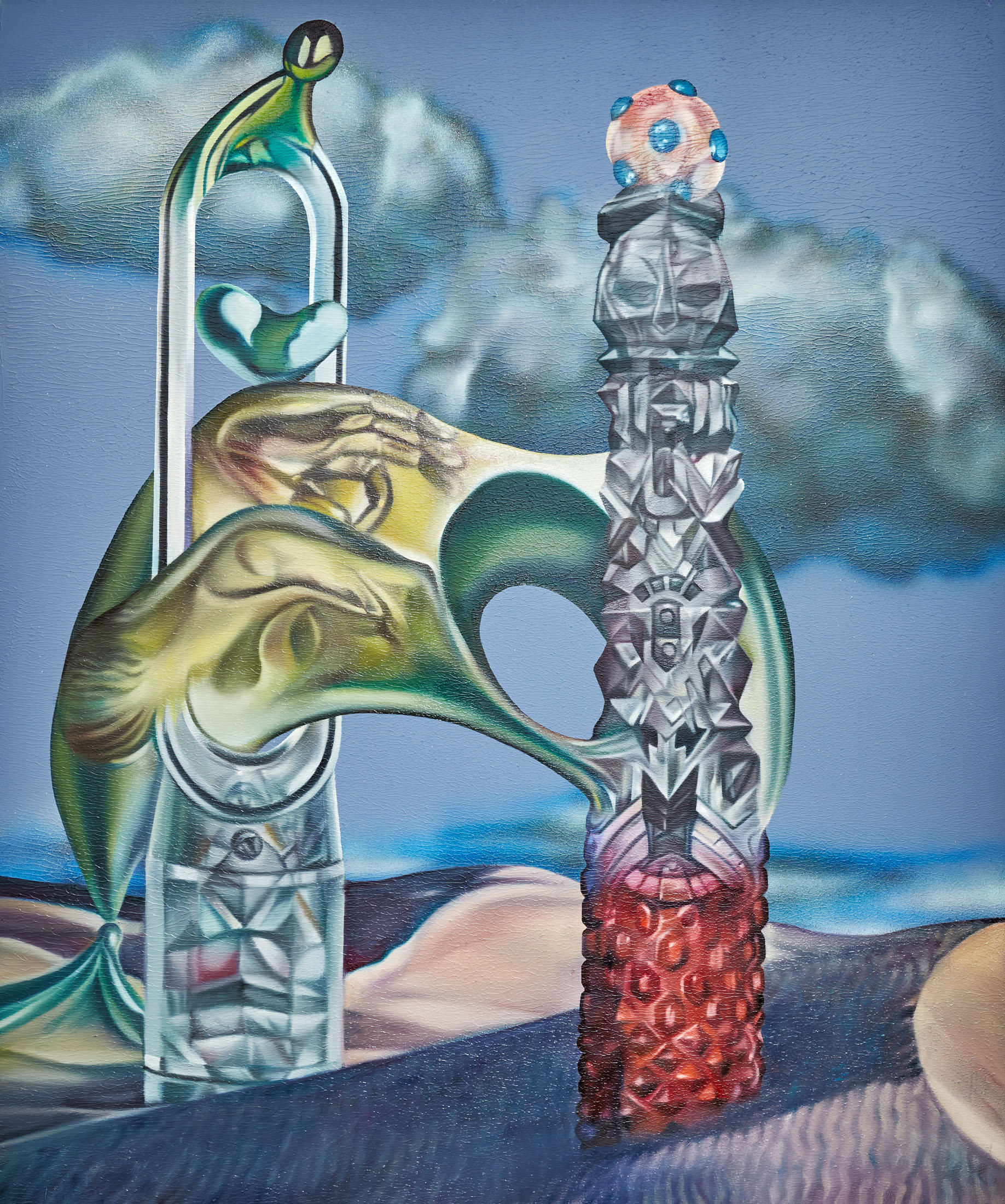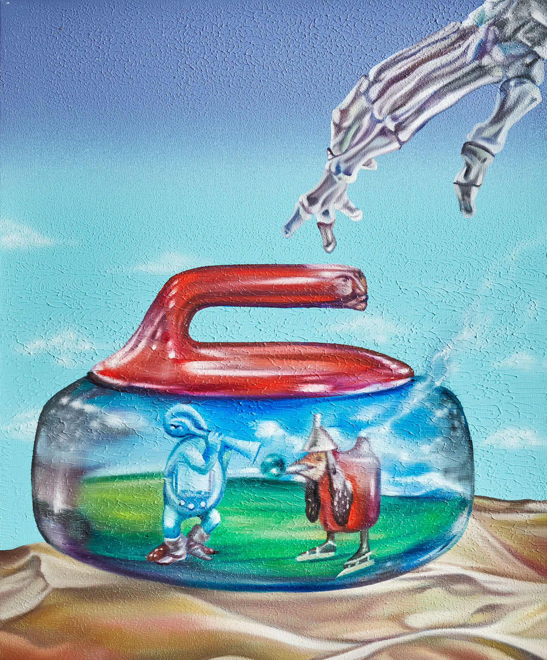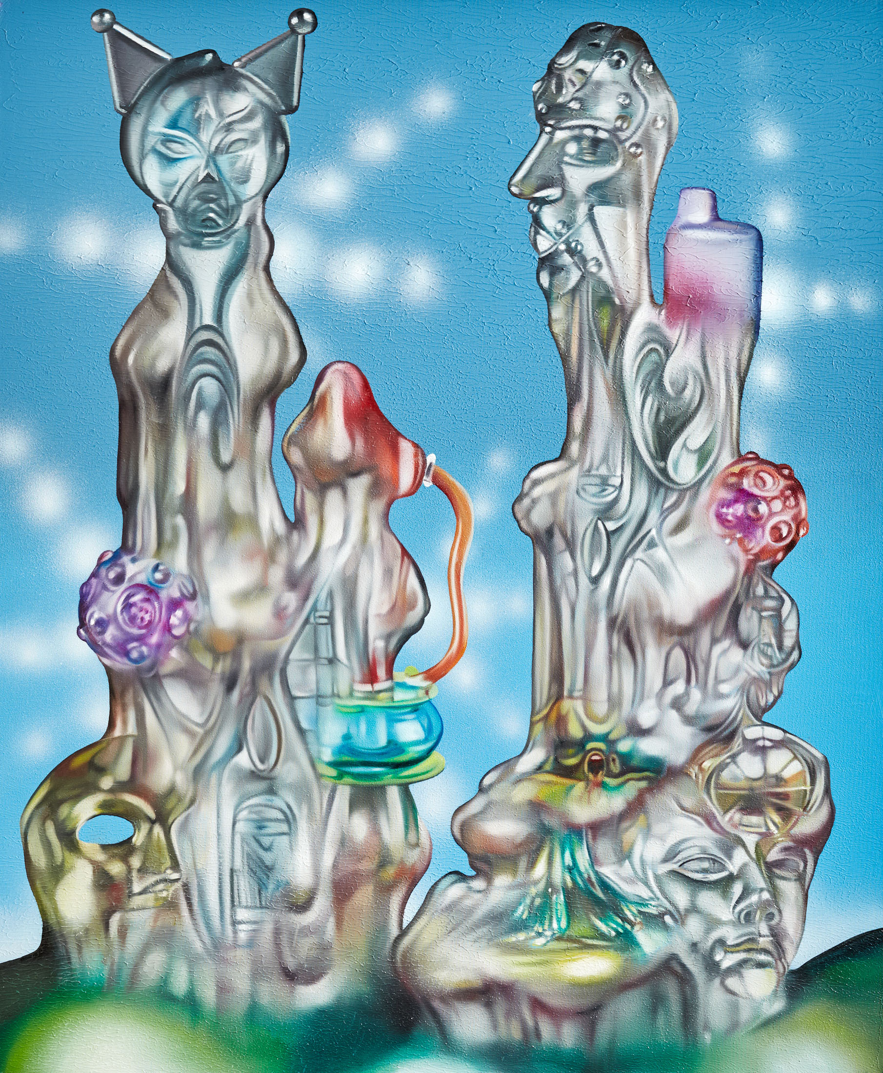 The works on view conjure the burning wooden church of Norwegian black metal, where the space of aquaristics unexpectedly intersects with the motifs of criminology. Steampunk shapes resembling water pistols, along with overdesigned objects that seem almost generated by artificial intelligence, open up new worlds in their details. Curling as a visual motif emerges from a poster glimpsed at a Milan bus stop, while smaller canvases recall Bosch’s grotesque figures, reimagined as if they were mass-produced toy silhouettes.