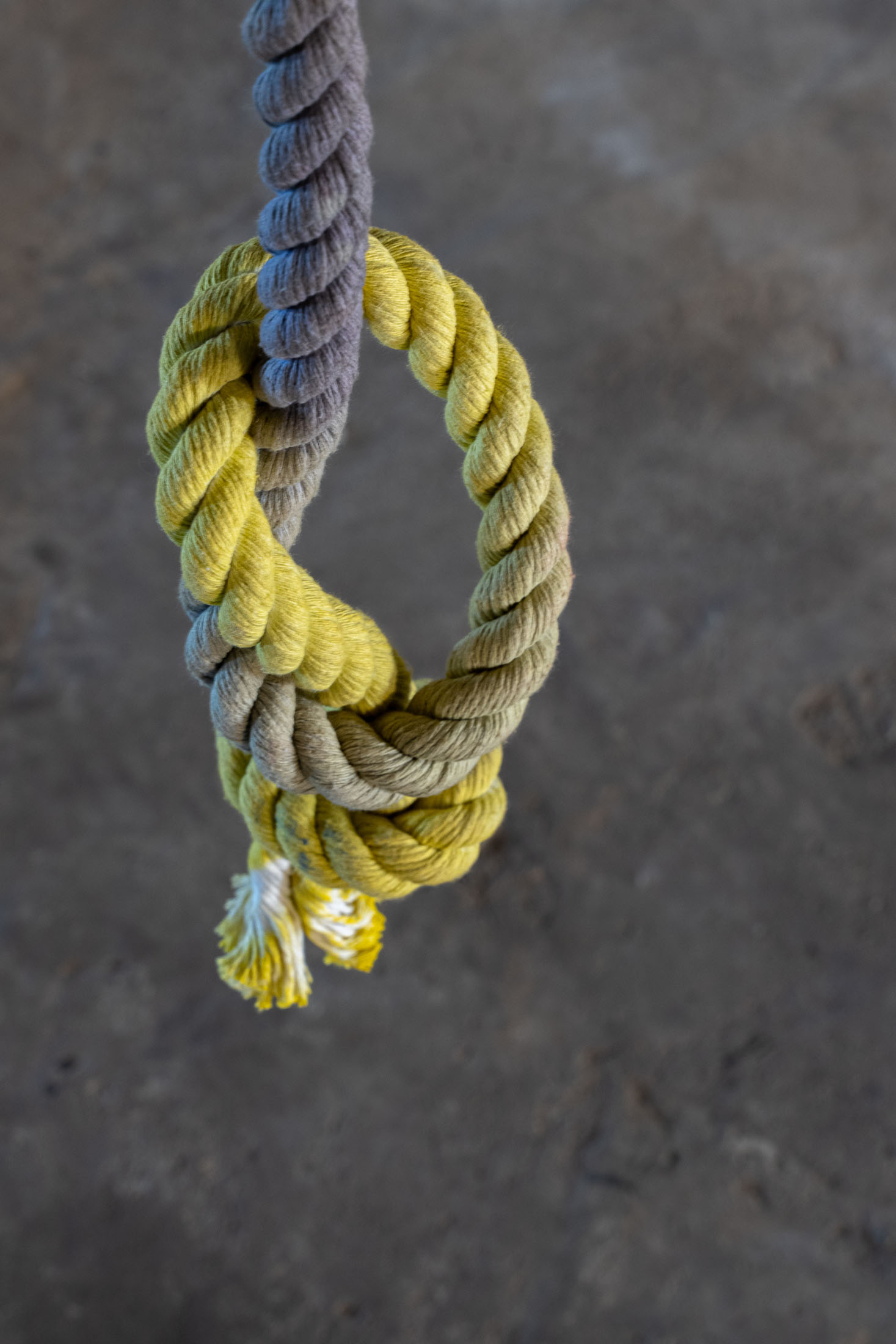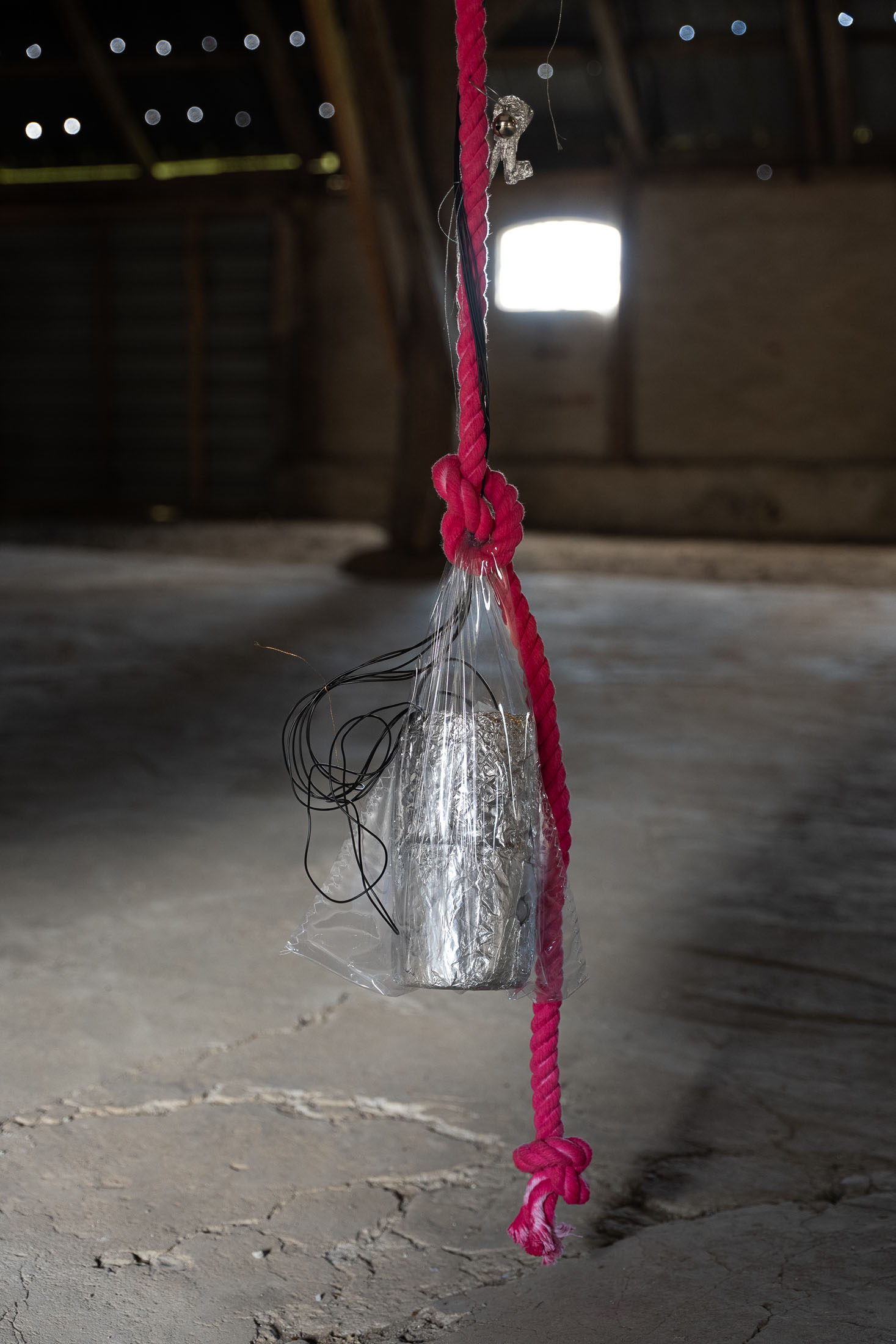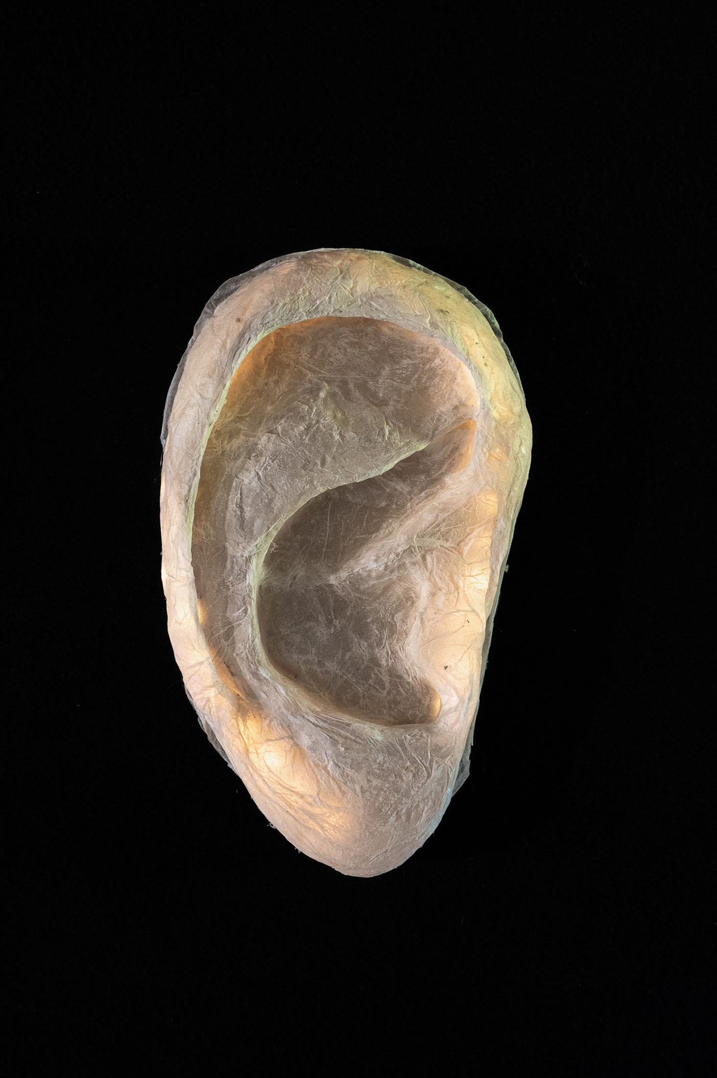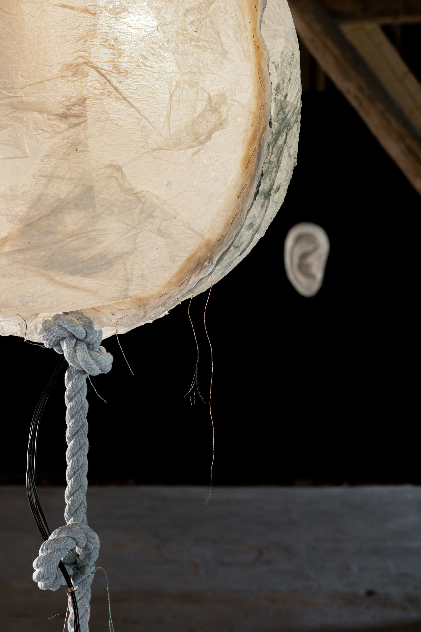 The spheres and ears respond to the presence of visitors by lighting up – unpredictably, each with its own rhythm that reacts to movement and sound in the room. The coloration of the ropes recalls the changing hues of bruises during the healing process – from blue-green to yellow-green to brown-yellow. The shape of the spheres evokes associations with anal beads, objects that connect the inner body with its exterior. Disgust, shudder, or shame that such objects may provoke are not natural, but culturally learned reactions.