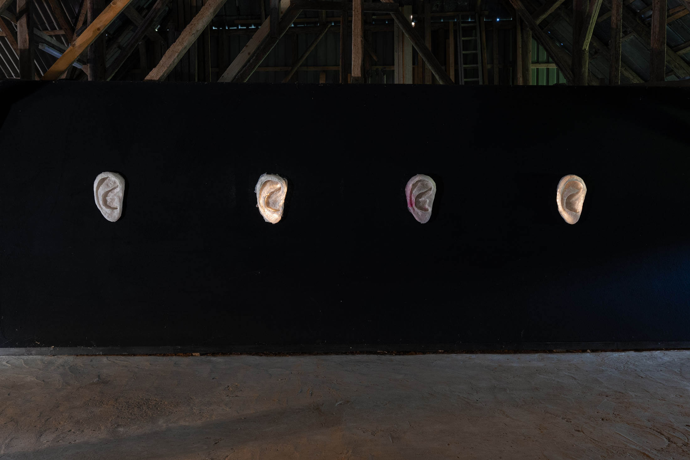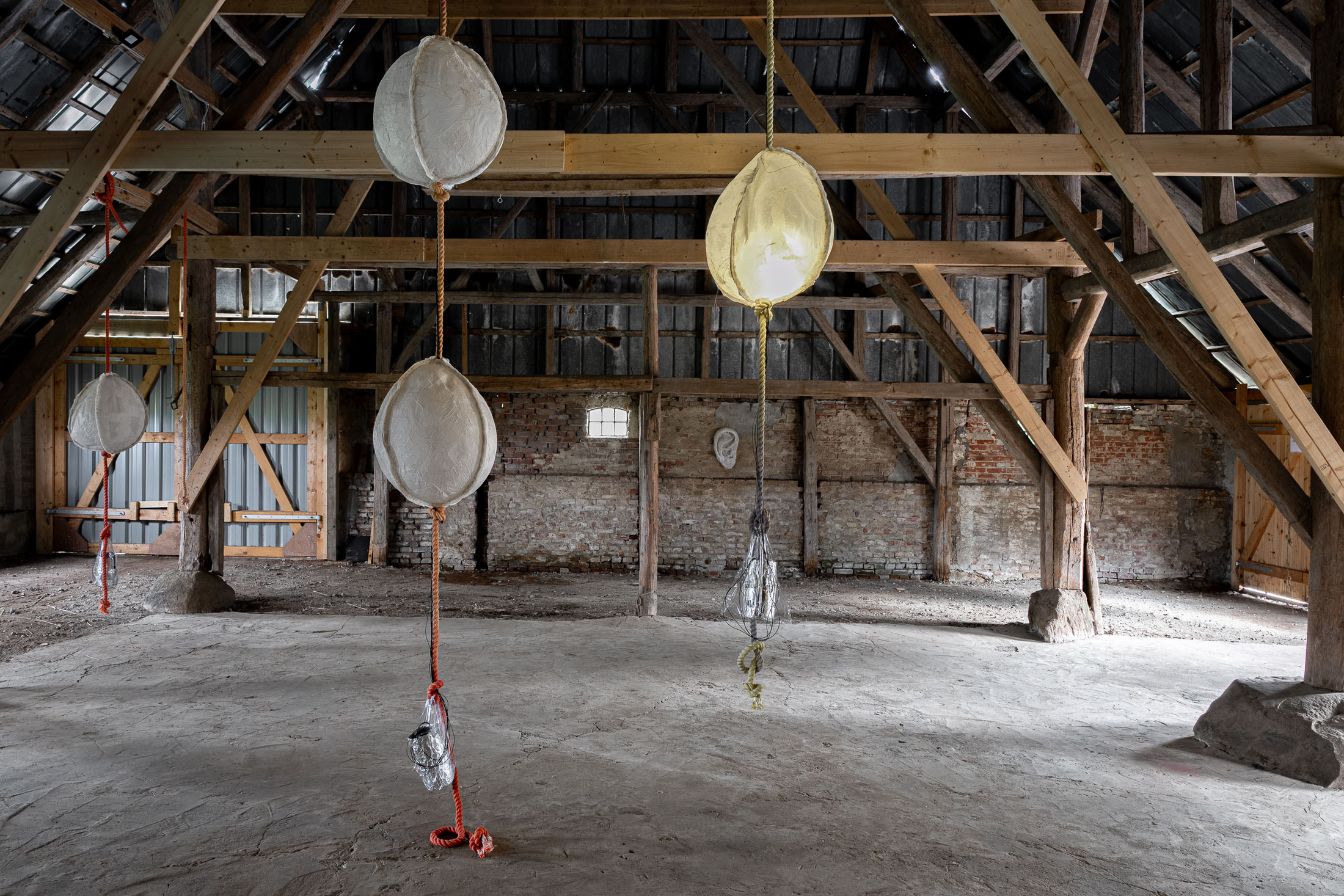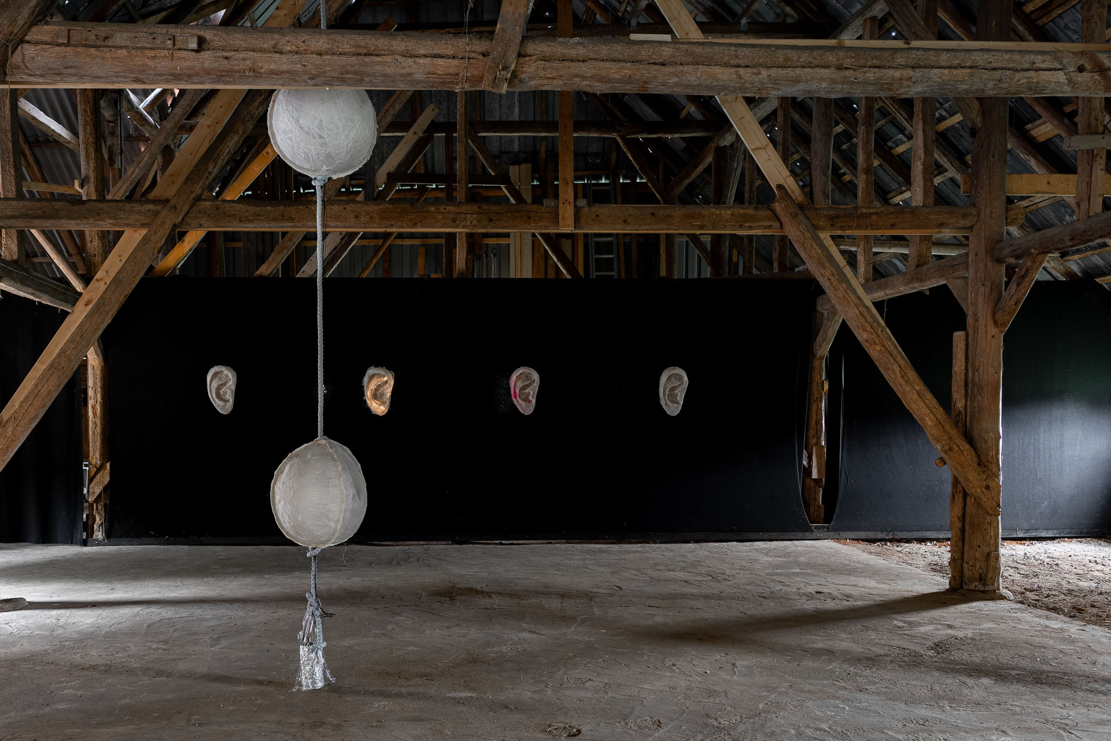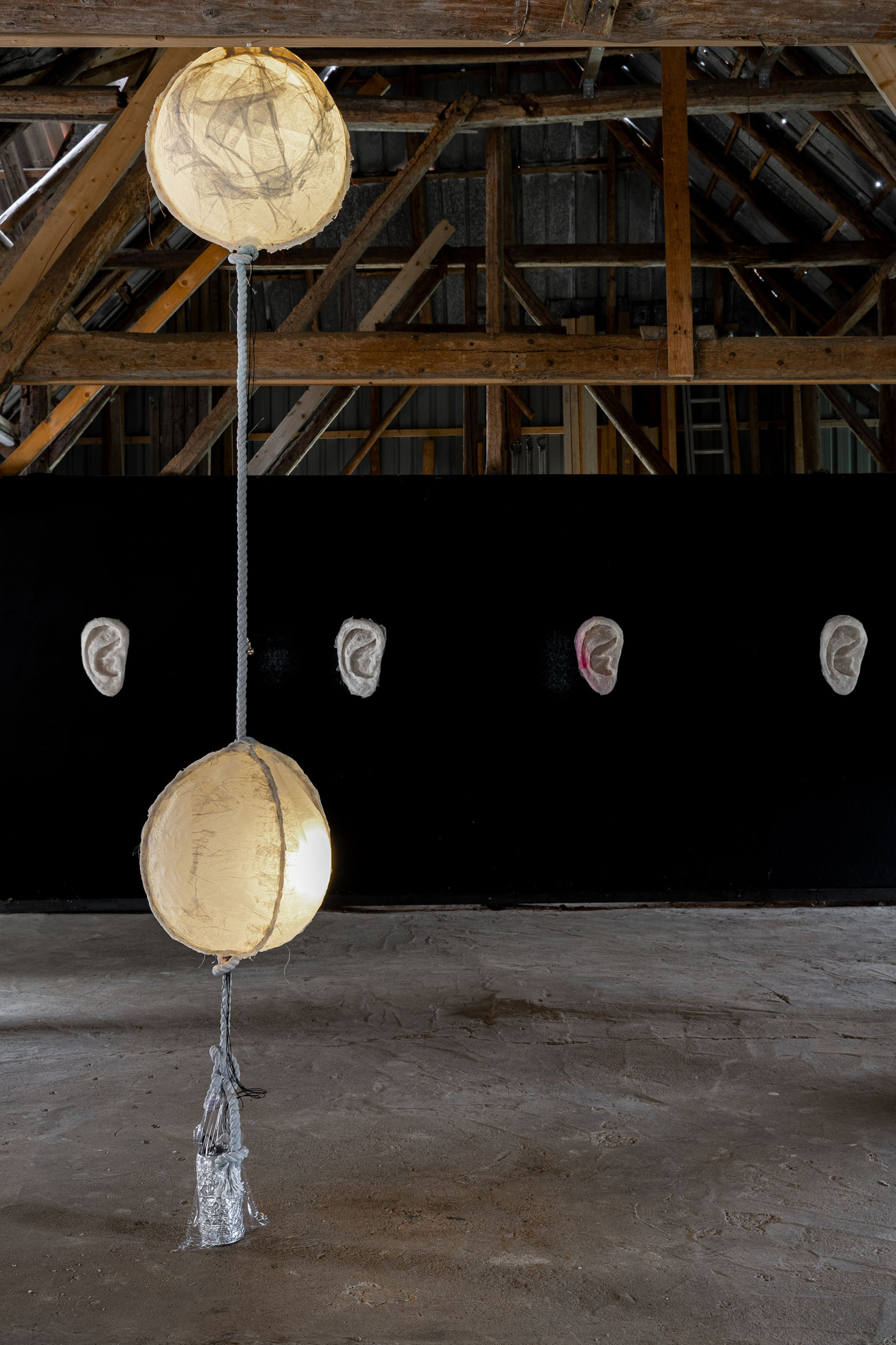 Camilla Steinum’s exhibition at Kunsthal Thy explores the boundaries between the inner and outer body, their transitions, and how they are perceived. Large spheres hang from the ceiling and beams of the old barn, strung together on ropes that resemble pearl necklaces, while oversized ears on the walls hint at a bodily presence. Both elements are made from toilet paper mixed with wallpaper paste – a material that already suggests a connection between the everyday and the intimate.