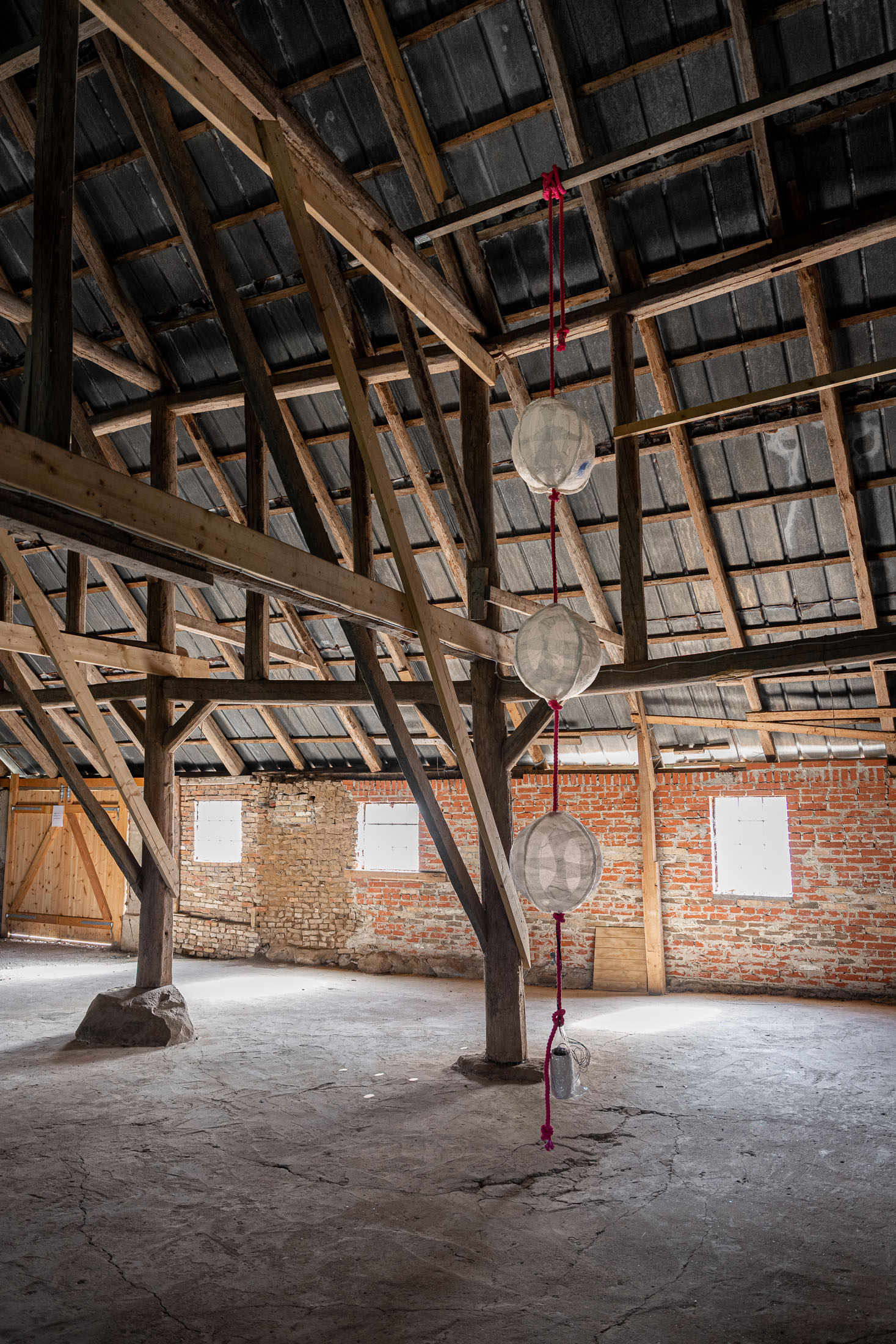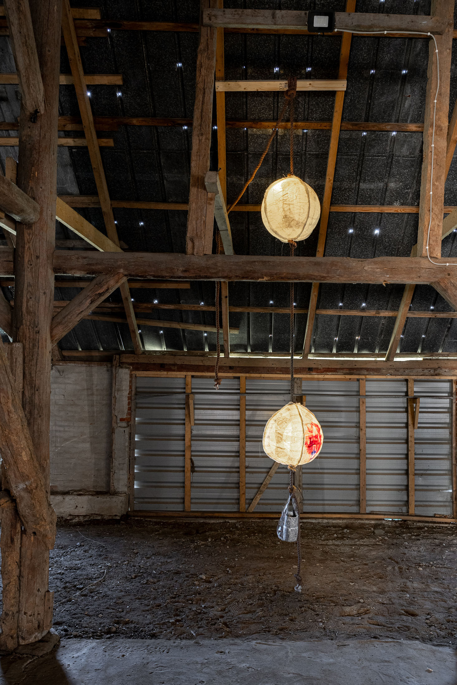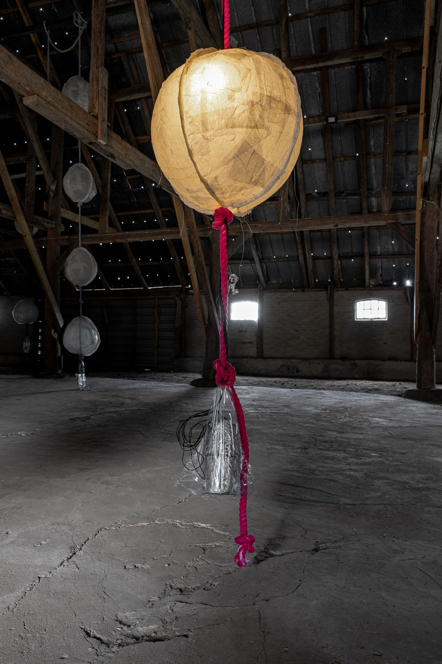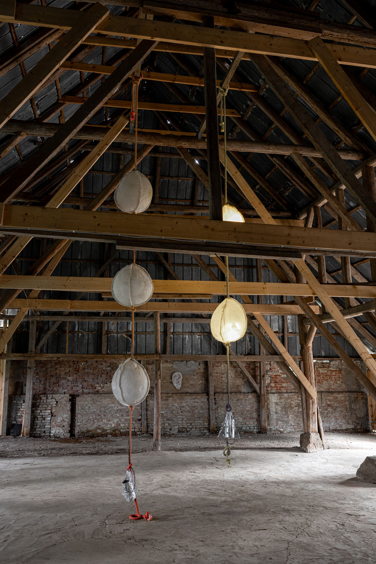 Camilla Steinum’s exhibition at Kunsthal Thy explores the boundaries between the inner and outer body, their transitions, and how they are perceived. Large spheres hang from the ceiling and beams of the old barn, strung together on ropes that resemble pearl necklaces, while oversized ears on the walls hint at a bodily presence. Both elements are made from toilet paper mixed with wallpaper paste – a material that already suggests a connection between the everyday and the intimate.