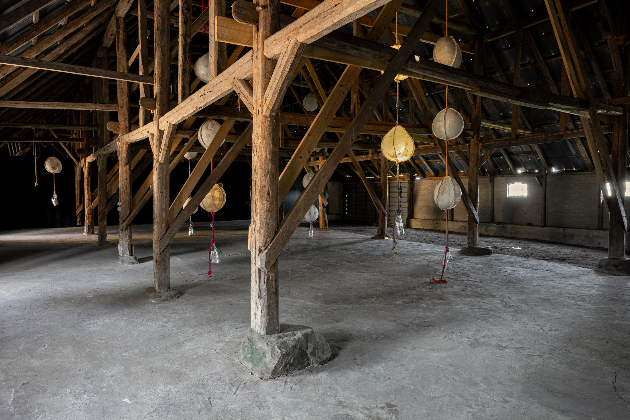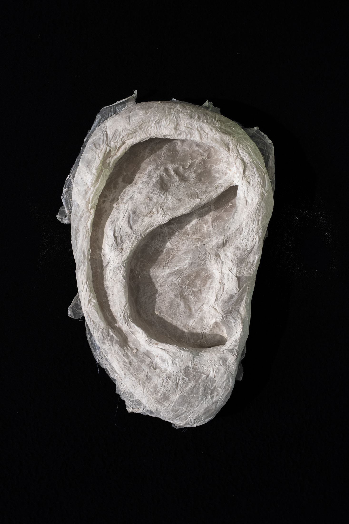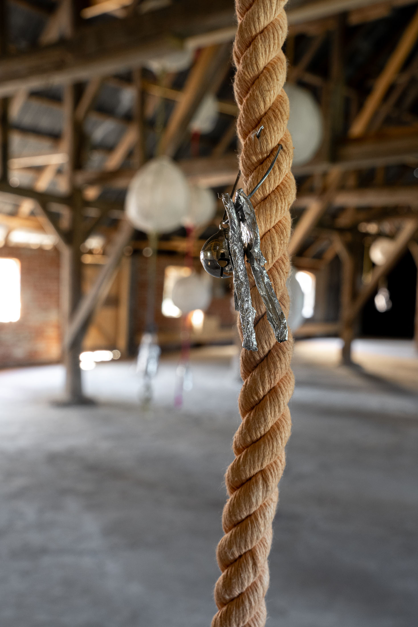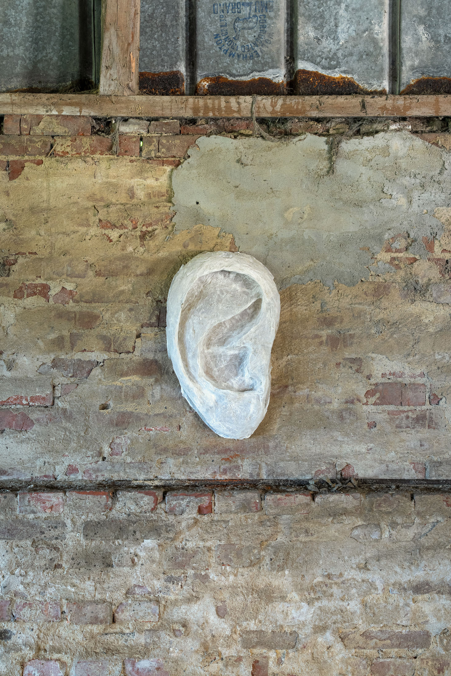Camilla Steinum’s exhibition at Kunsthal Thy explores the boundaries between the inner and outer body, their transitions, and how they are perceived. Large spheres hang from the ceiling and beams of the old barn, strung together on ropes that resemble pearl necklaces, while oversized ears on the walls hint at a bodily presence. Both elements are made from toilet paper mixed with wallpaper paste – a material that already suggests a connection between the everyday and the intimate.