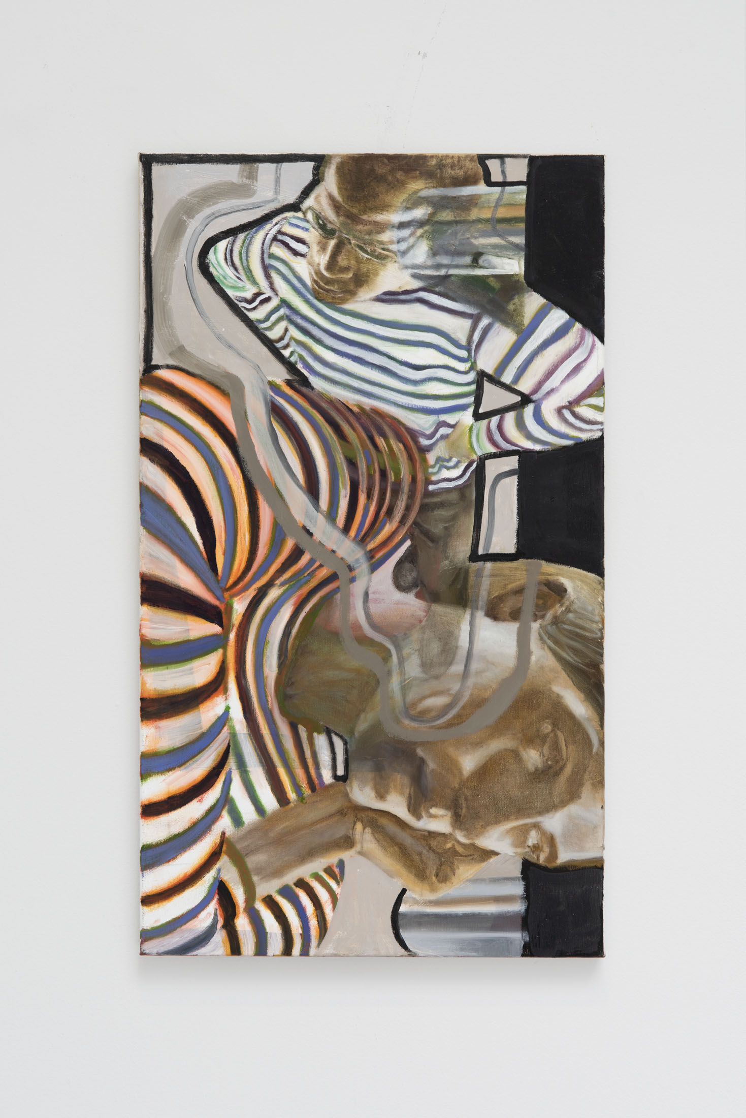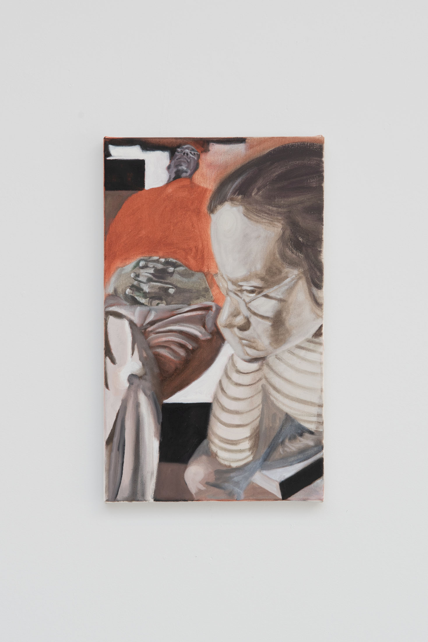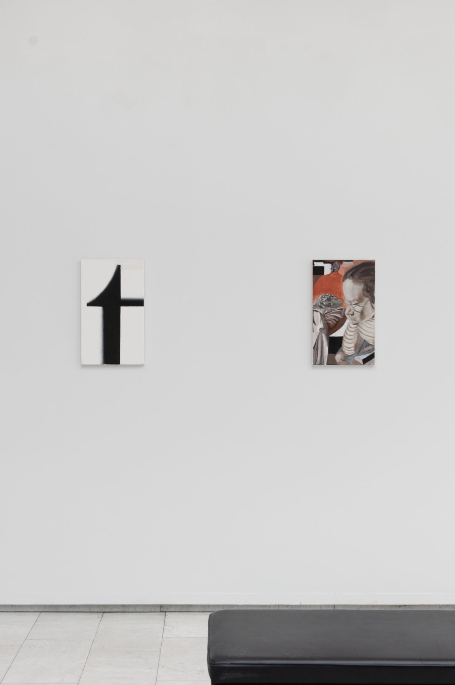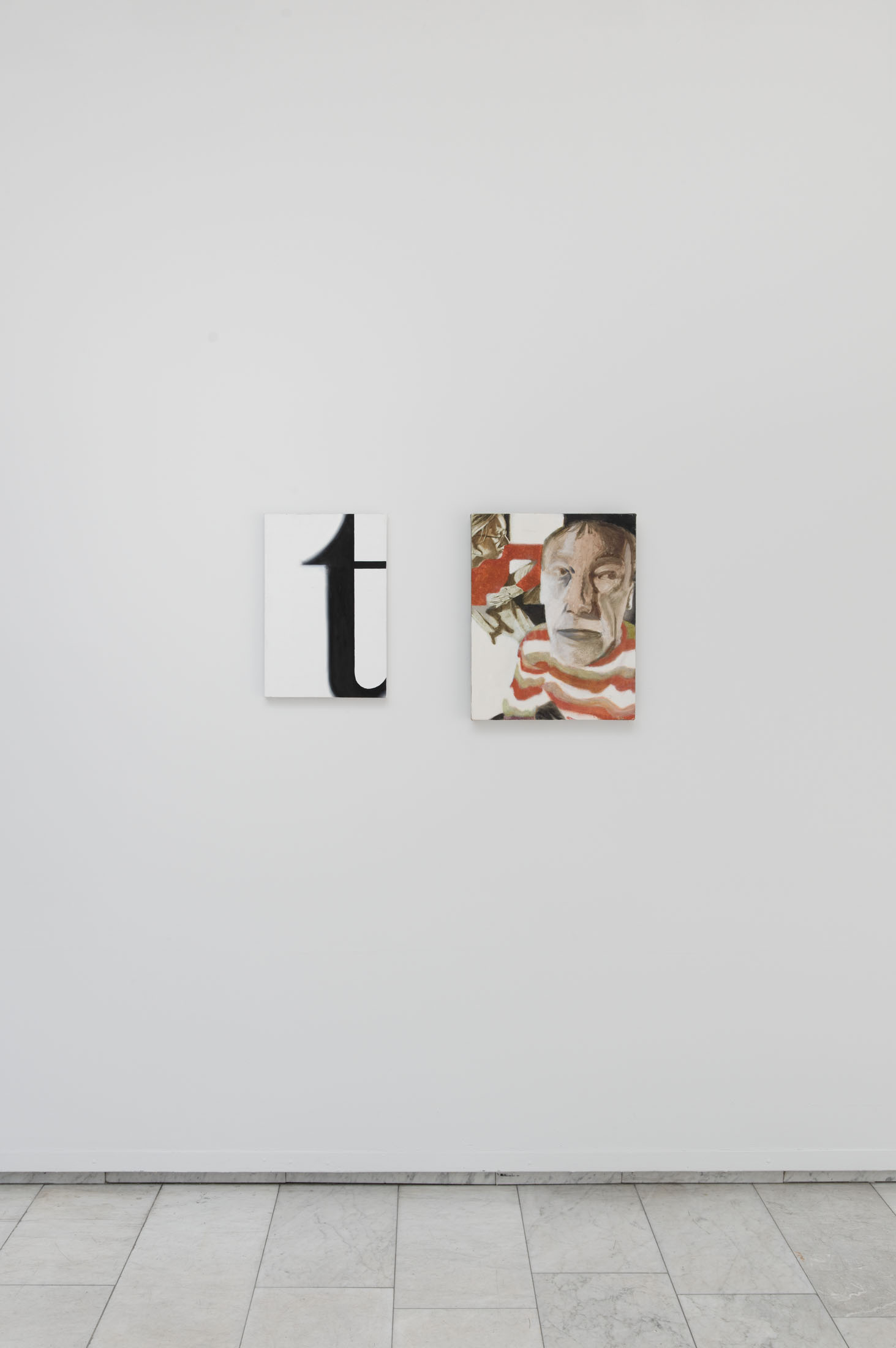 A series of paintings depicts individuals with neutral facial expressions, wearing glasses and striped sweaters. We might feel a sense of familiarity with the characters, but Mannov withholds information and they remain unidentifiable. Other works consist of letter fragments—where, for example, a “t” might possibly represent a column.