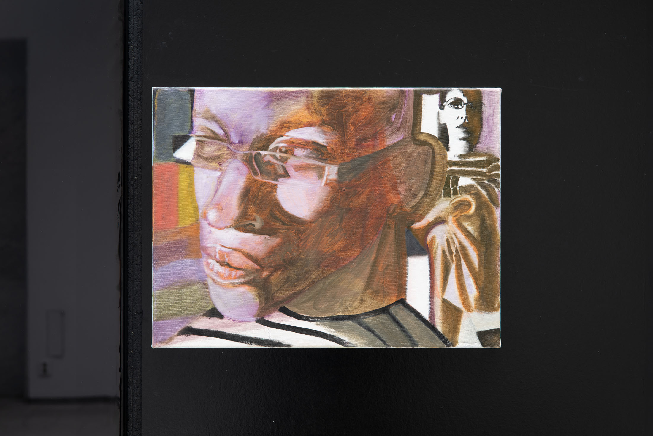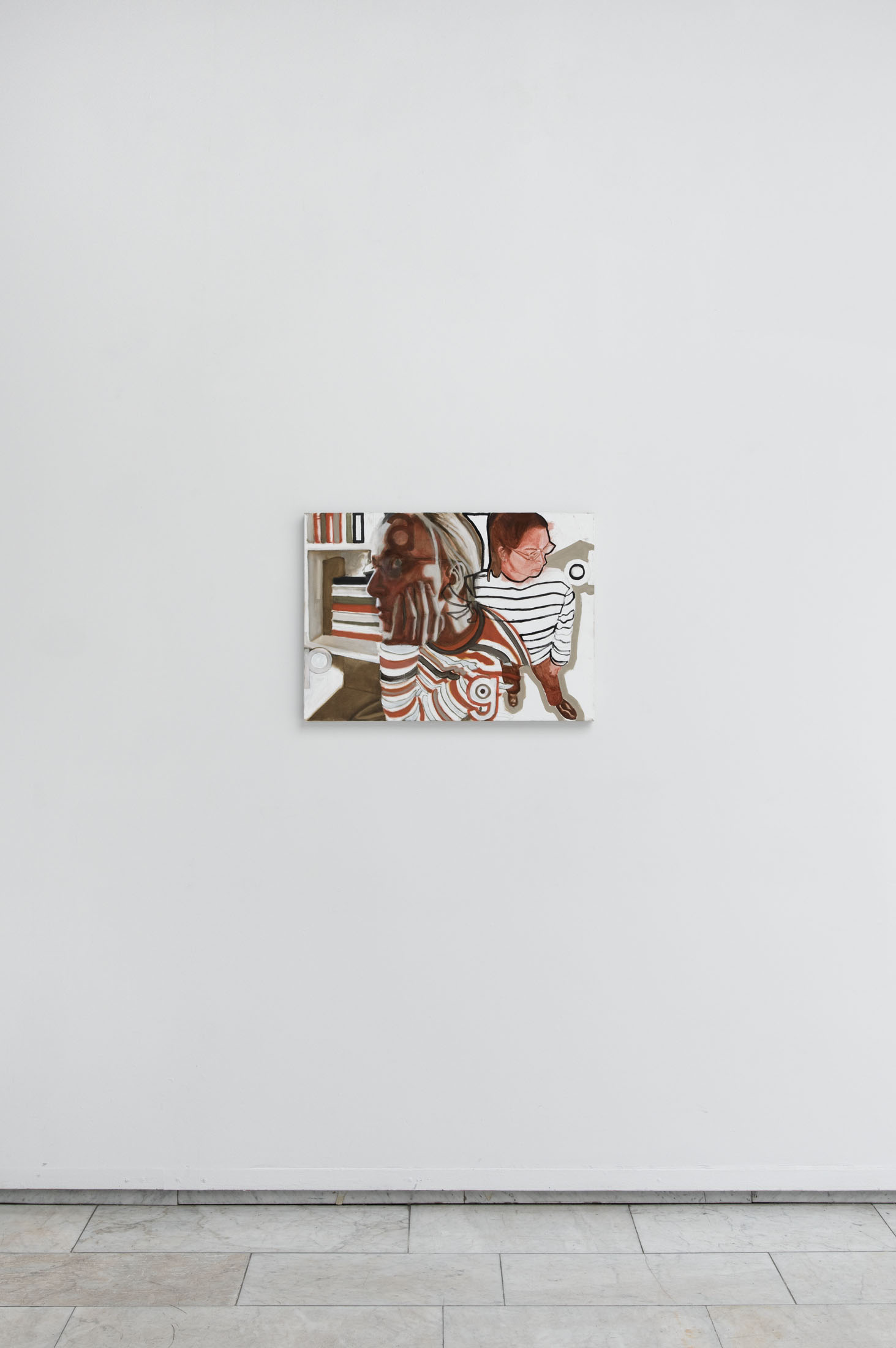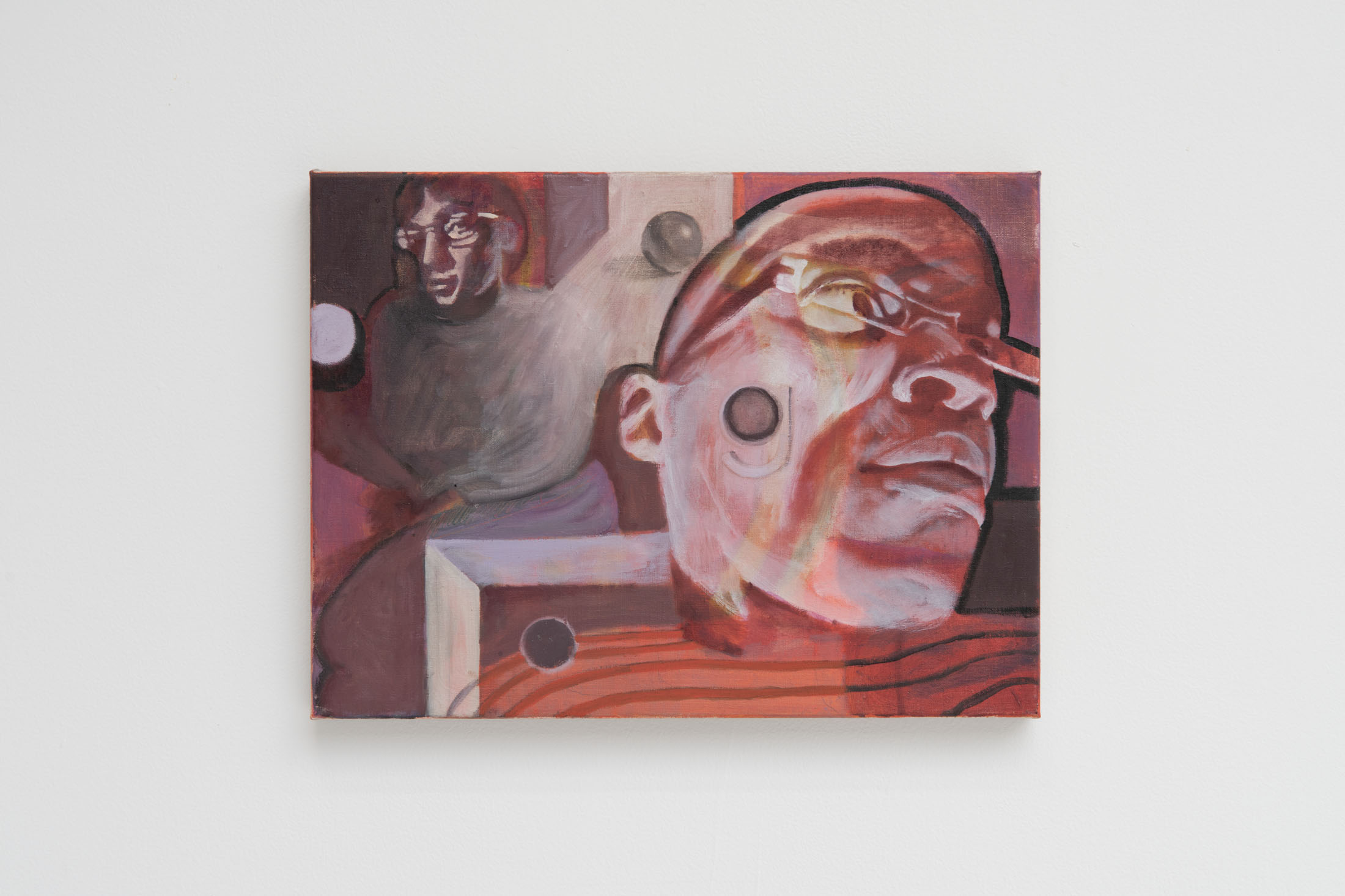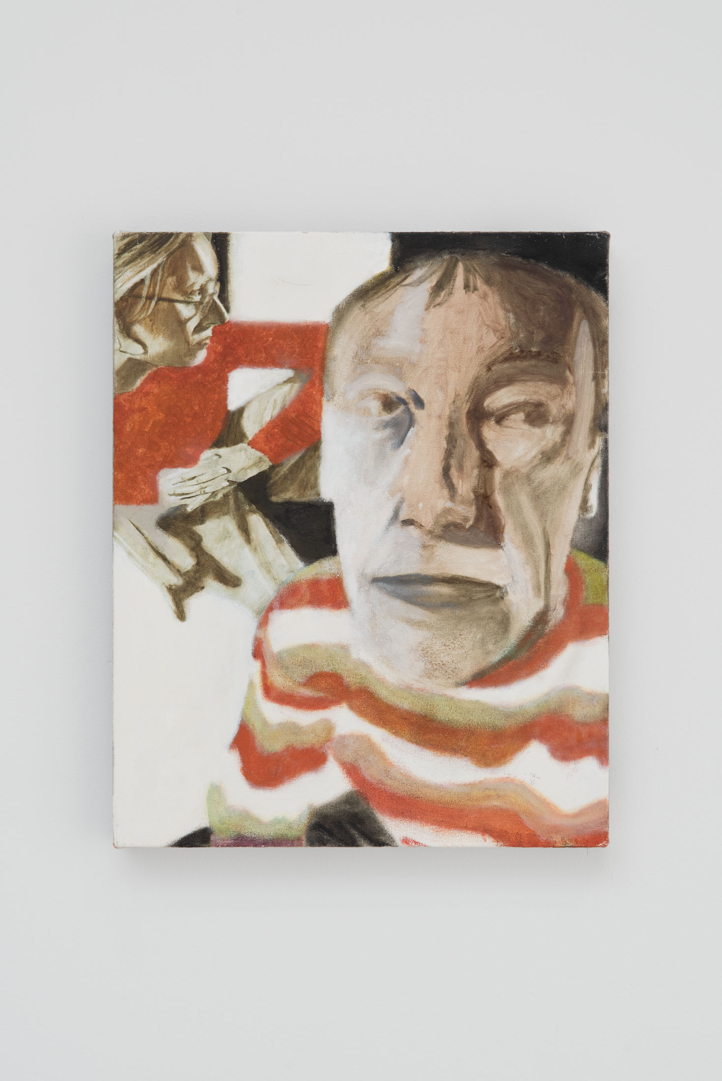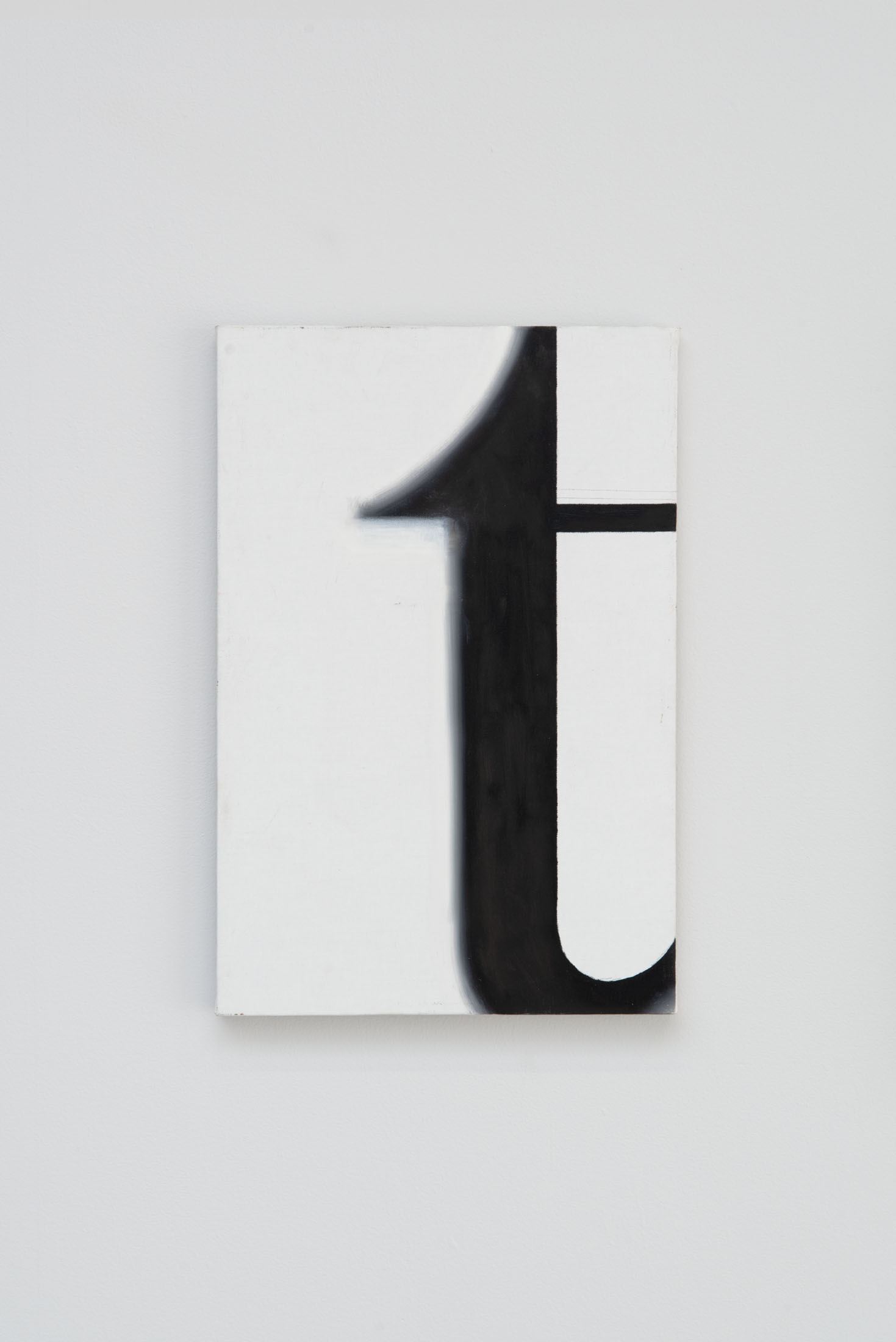 A series of paintings depicts individuals with neutral facial expressions, wearing glasses and striped sweaters. We might feel a sense of familiarity with the characters, but Mannov withholds information and they remain unidentifiable. Other works consist of letter fragments—where, for example, a “t” might possibly represent a column.