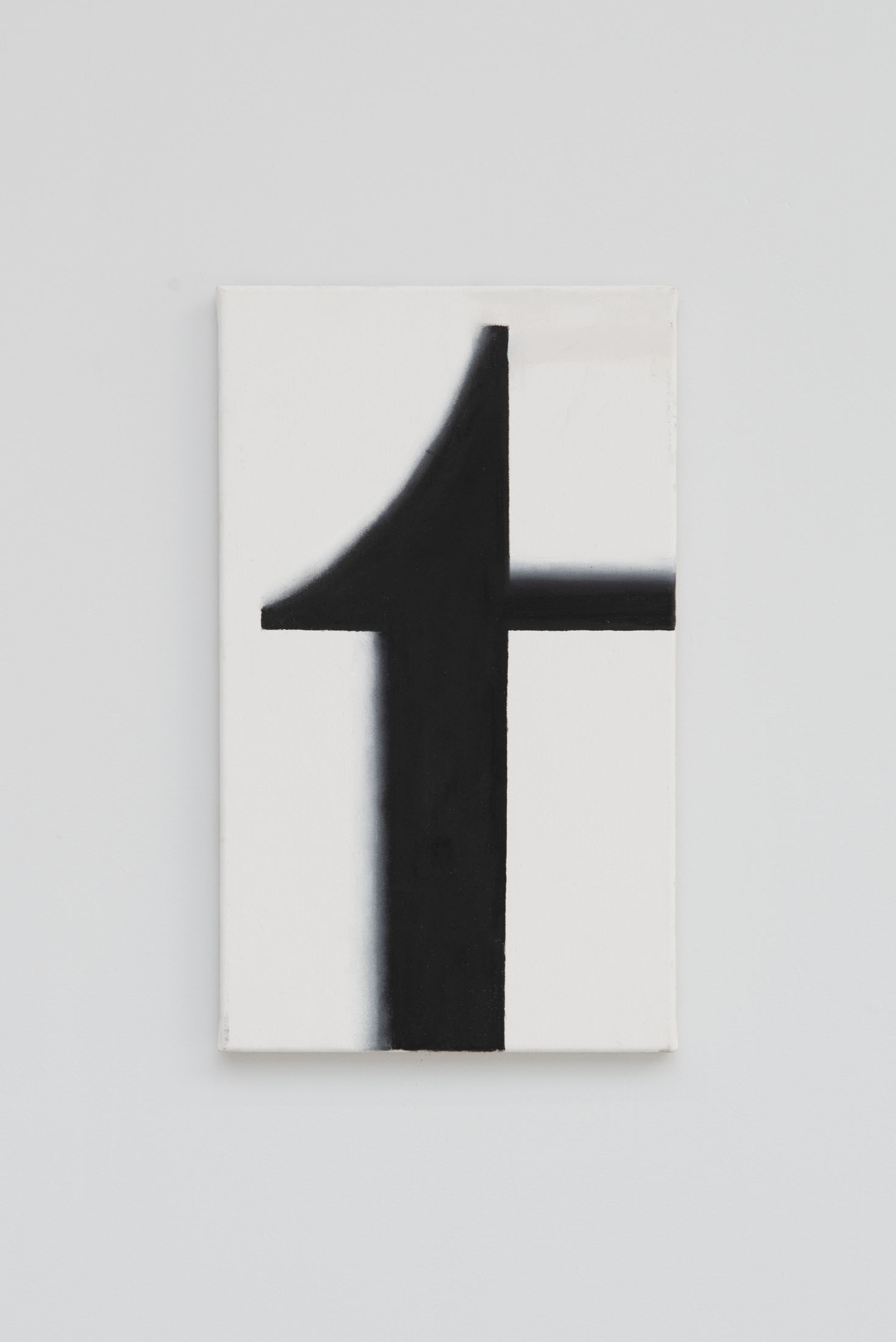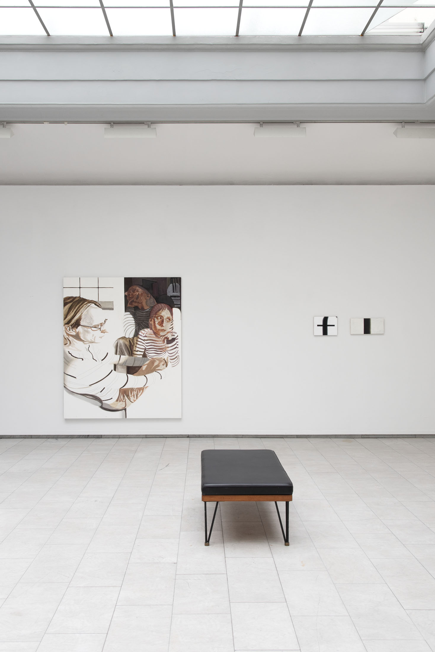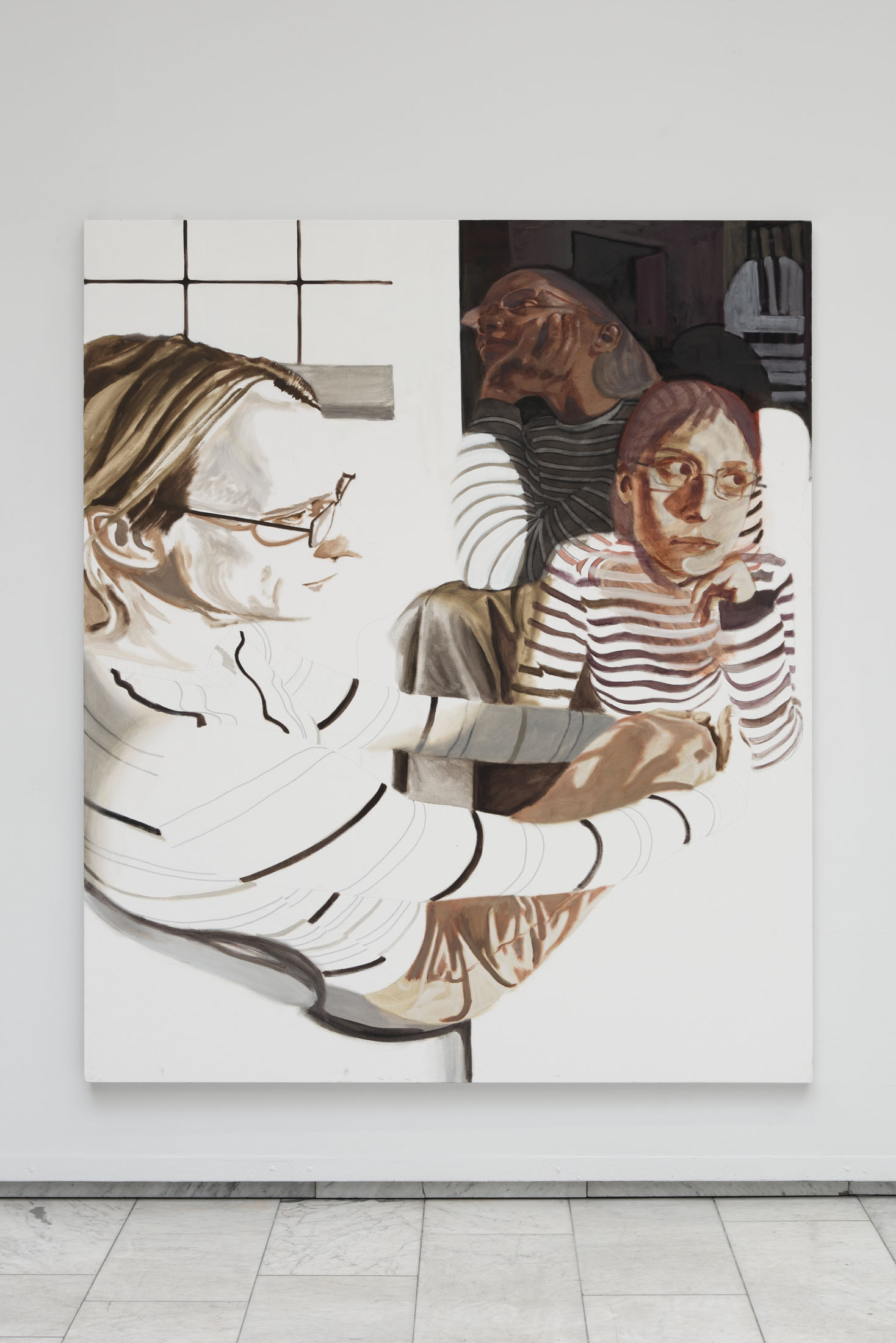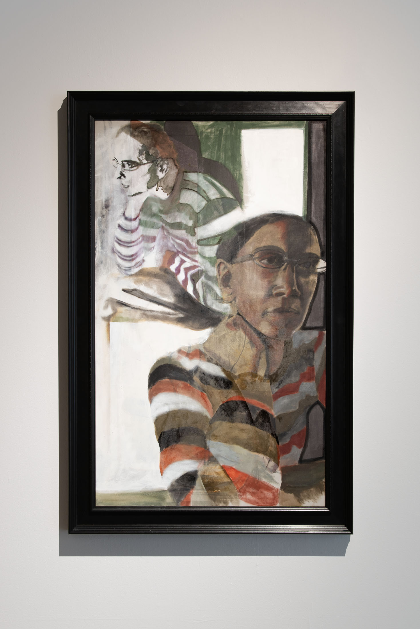 A series of paintings depicts individuals with neutral facial expressions, wearing glasses and striped sweaters. We might feel a sense of familiarity with the characters, but Mannov withholds information and they remain unidentifiable. Other works consist of letter fragments—where, for example, a “t” might possibly represent a column.