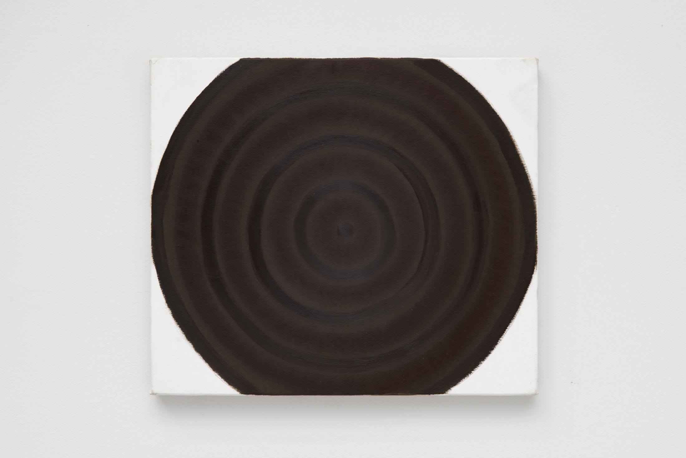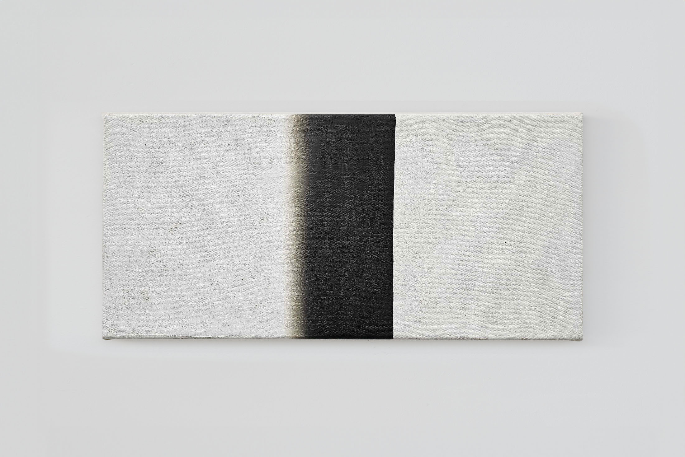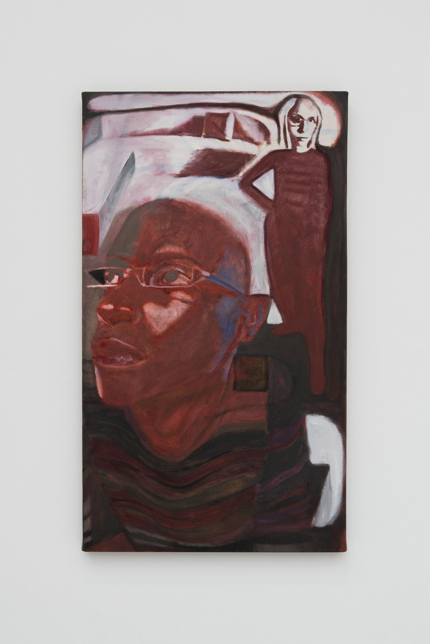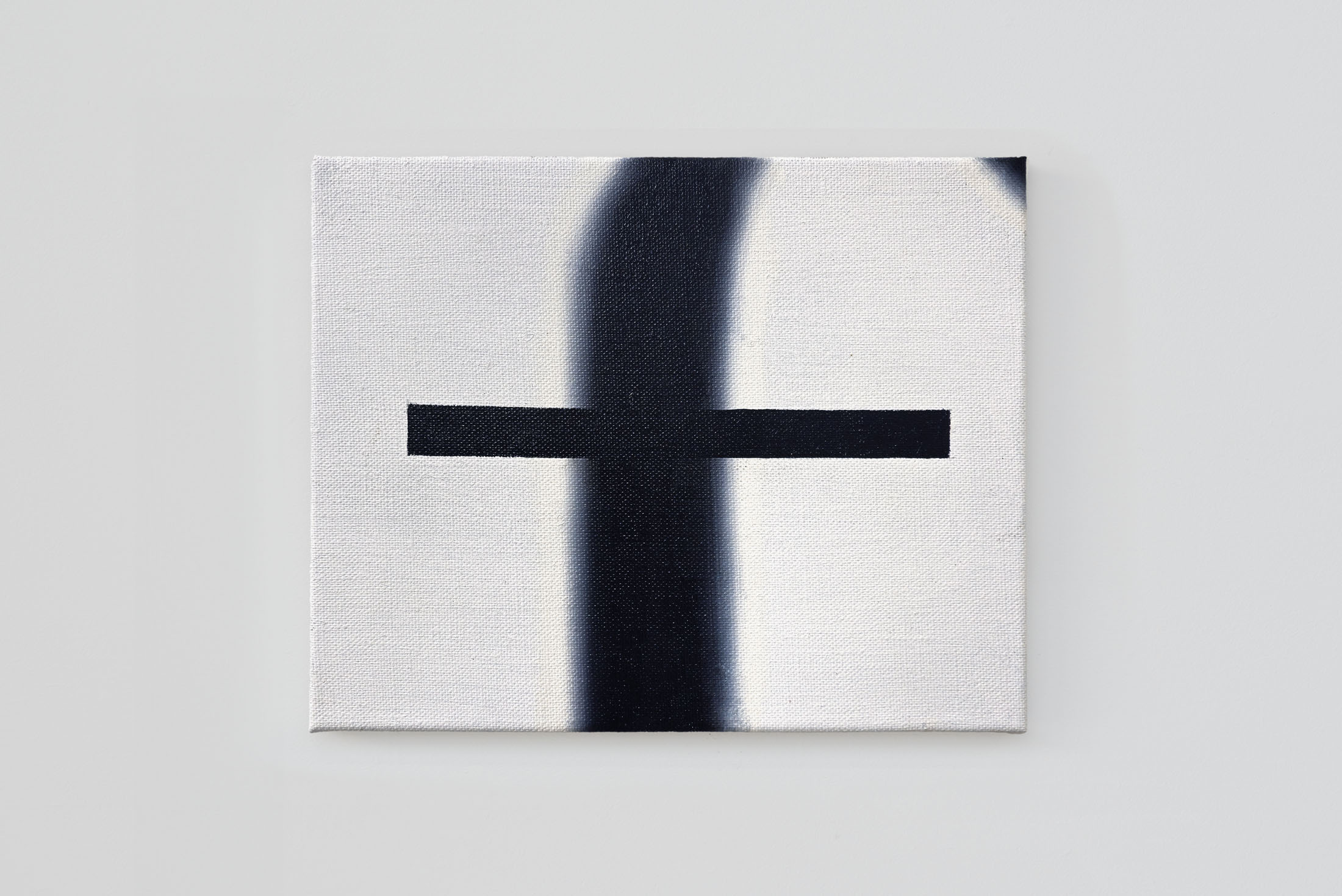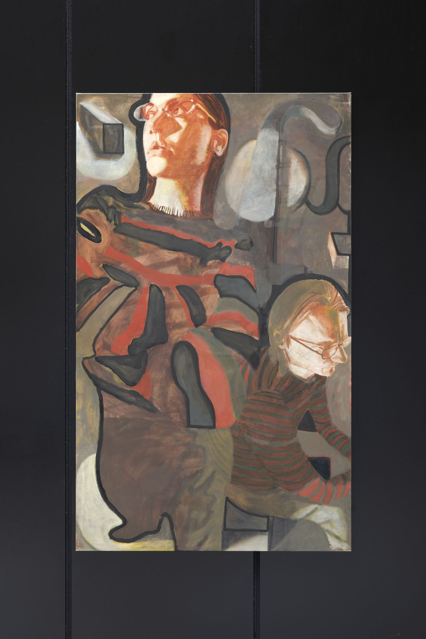 A series of paintings depicts individuals with neutral facial expressions, wearing glasses and striped sweaters. We might feel a sense of familiarity with the characters, but Mannov withholds information and they remain unidentifiable. Other works consist of letter fragments—where, for example, a “t” might possibly represent a column.
