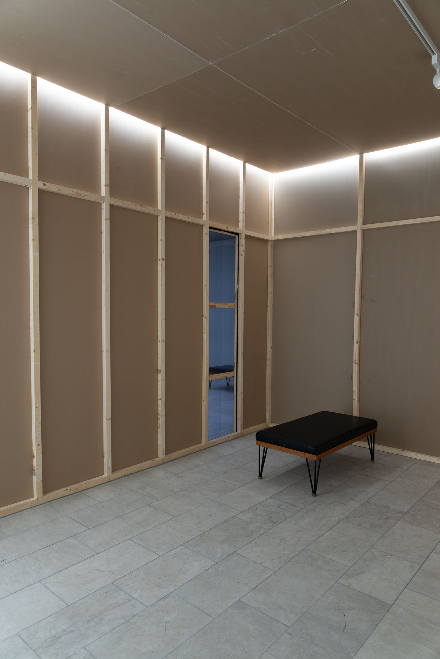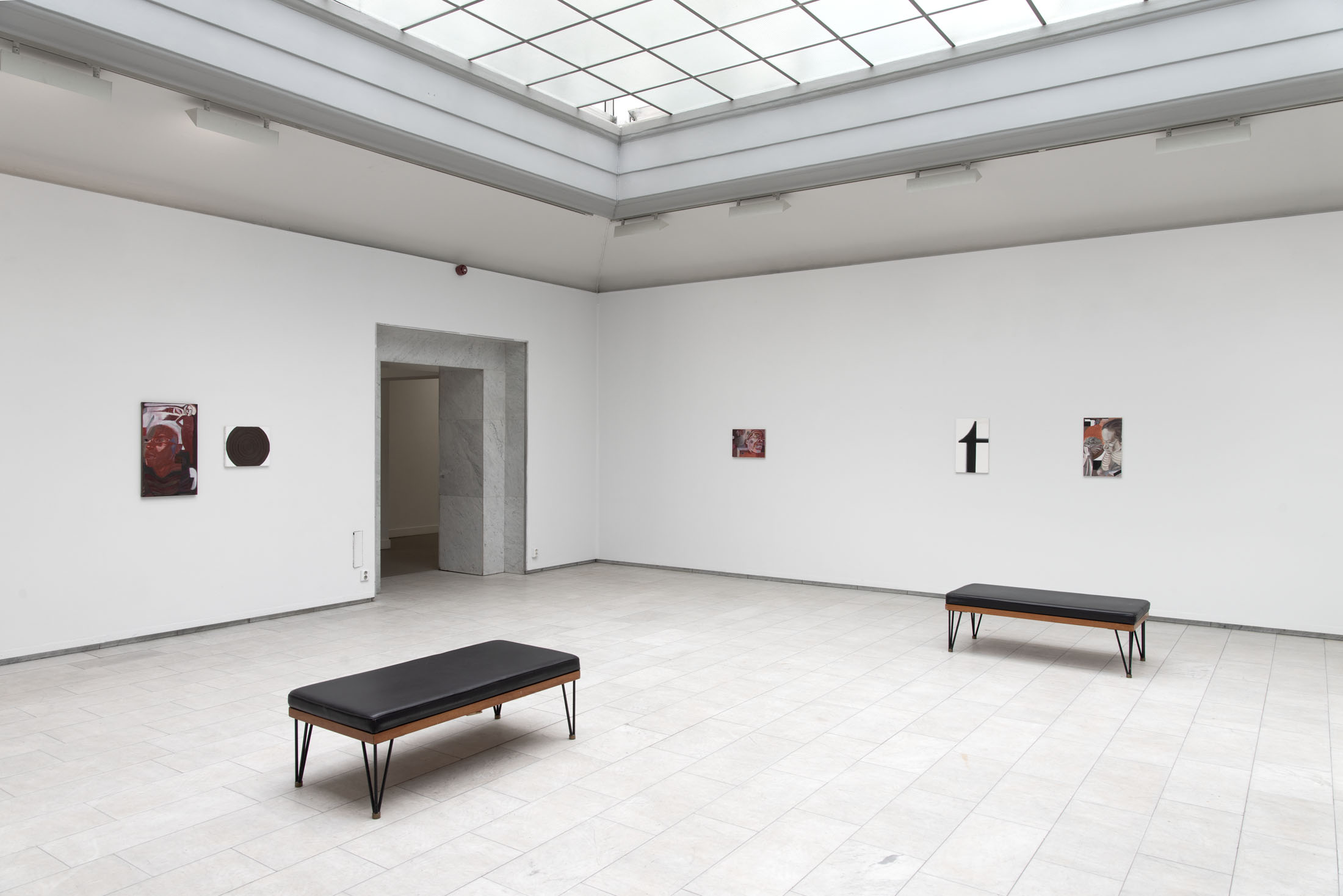 Carl Mannov’s exhibition at Kunstnerforbundet explores the intersection between the staged and the immediate, where everyday elements are inserted into a theatrical reality. In Overlys-salen (the Skylight Hall), he constructs a fragmented narrative in which both people and letters function as visual signs detached from clear meaning.