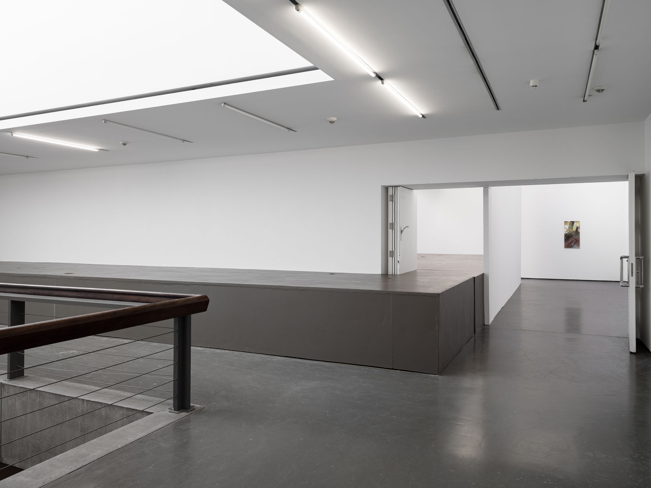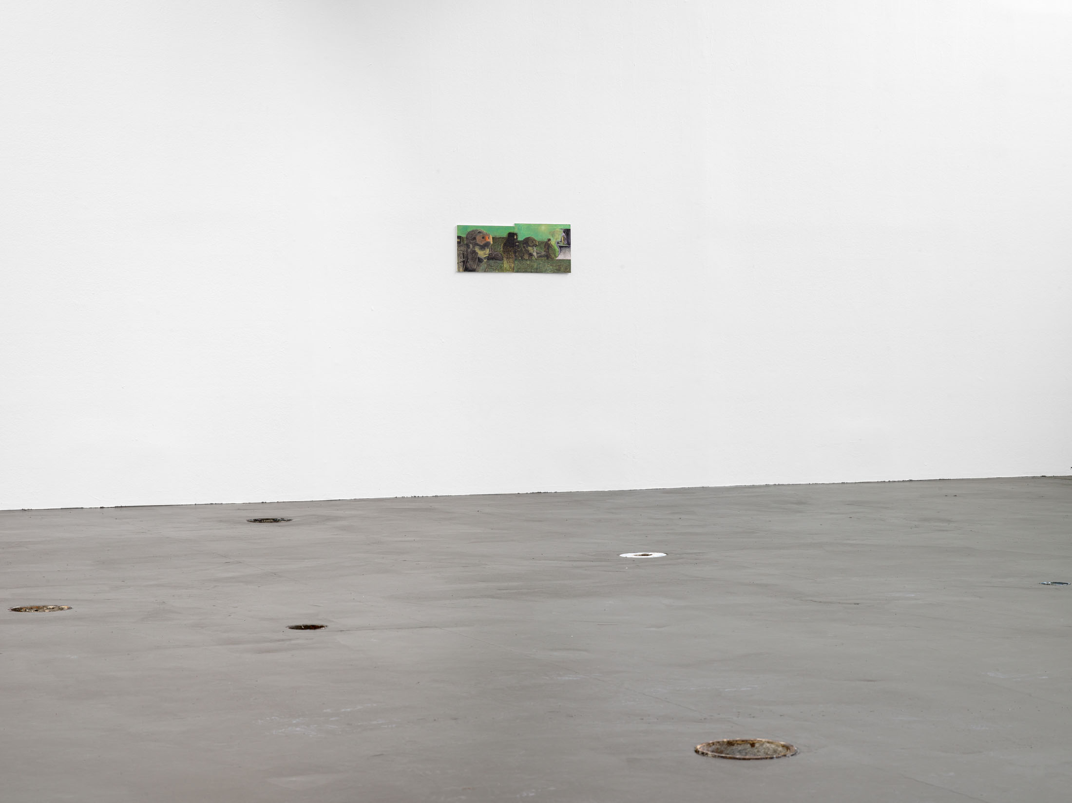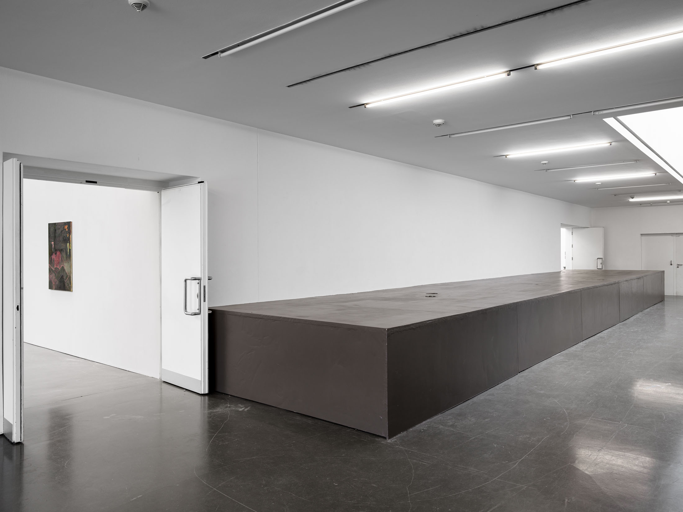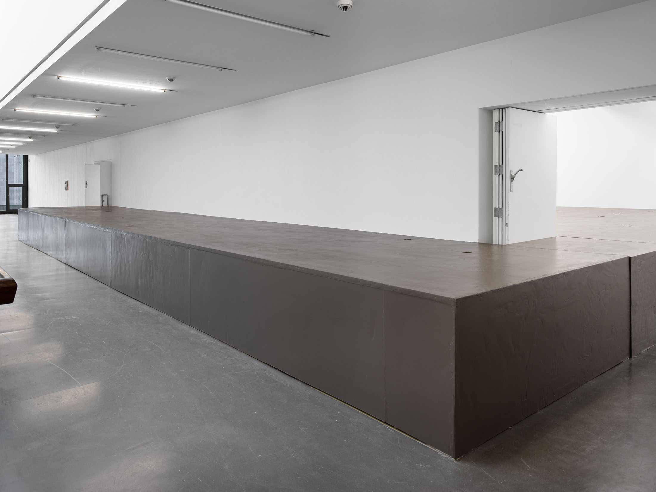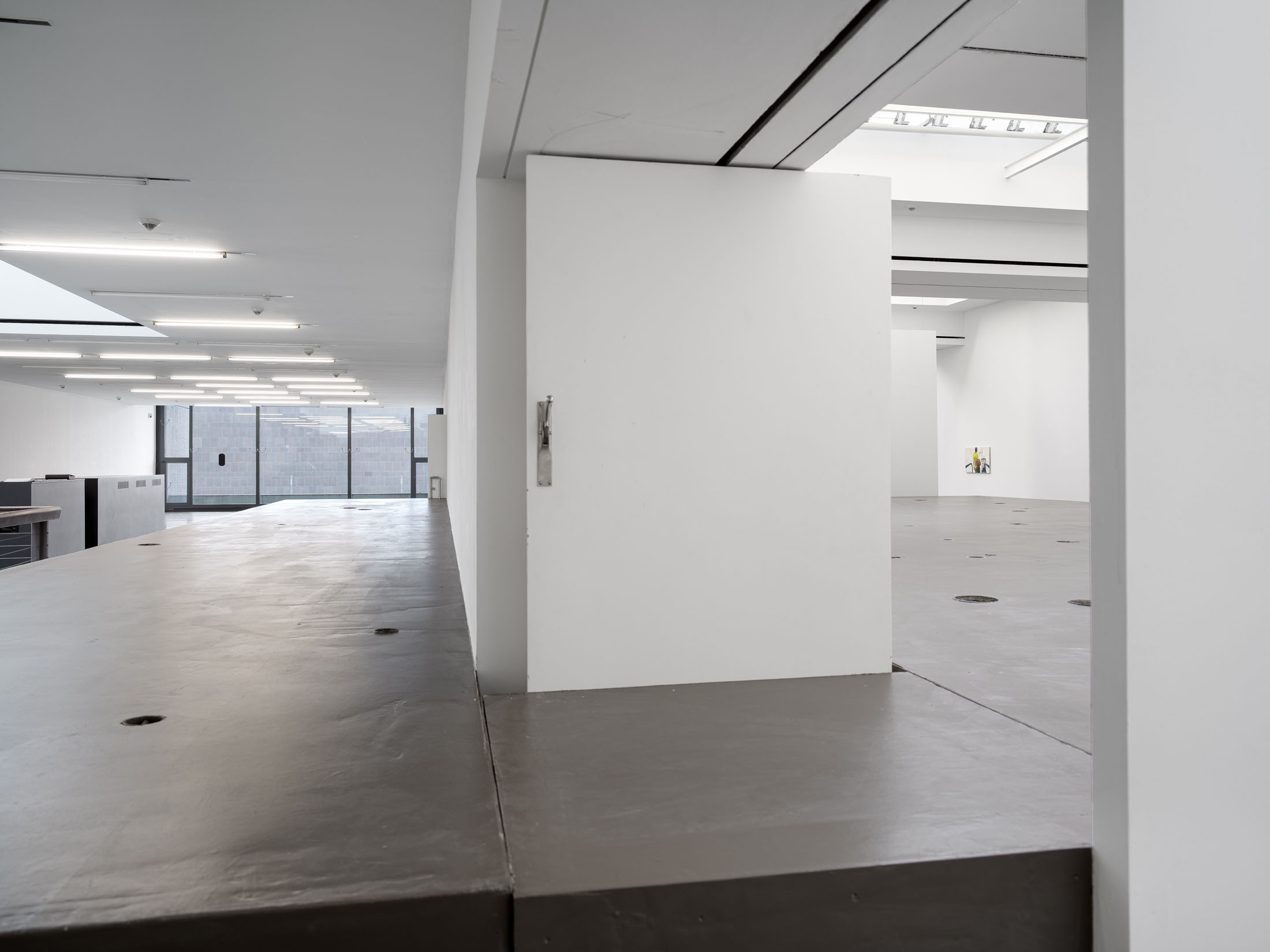 In a physical sense, the exhibition is framed by a large-scale, walkable platform by Bjartmar Hylta, which connects the exterior foyer and the interior gallery through a continuous walkway that wraps around the separating wall. While appearing as a positive, monolithic volume that choreographs movements in the exhibition, the work also incorporates a multitude of negative volumes which lead the eye into an almost bottomless void. These holes are the insides of other positive volumes which have been installed upside down, and that previously had served as bollards to divide and block physical circulation in various cities. This inversion reveals a more clandestine, unpolished interior that shows all that has settled there in the absence of an external gaze. There is a particular latency in this work as it opens up spatial peripheries and cracks of a vacant and lurking kind. Its inanimate presence speaks of an archive of urban space, but subtly withdrawing it from sight and comprehensibility.