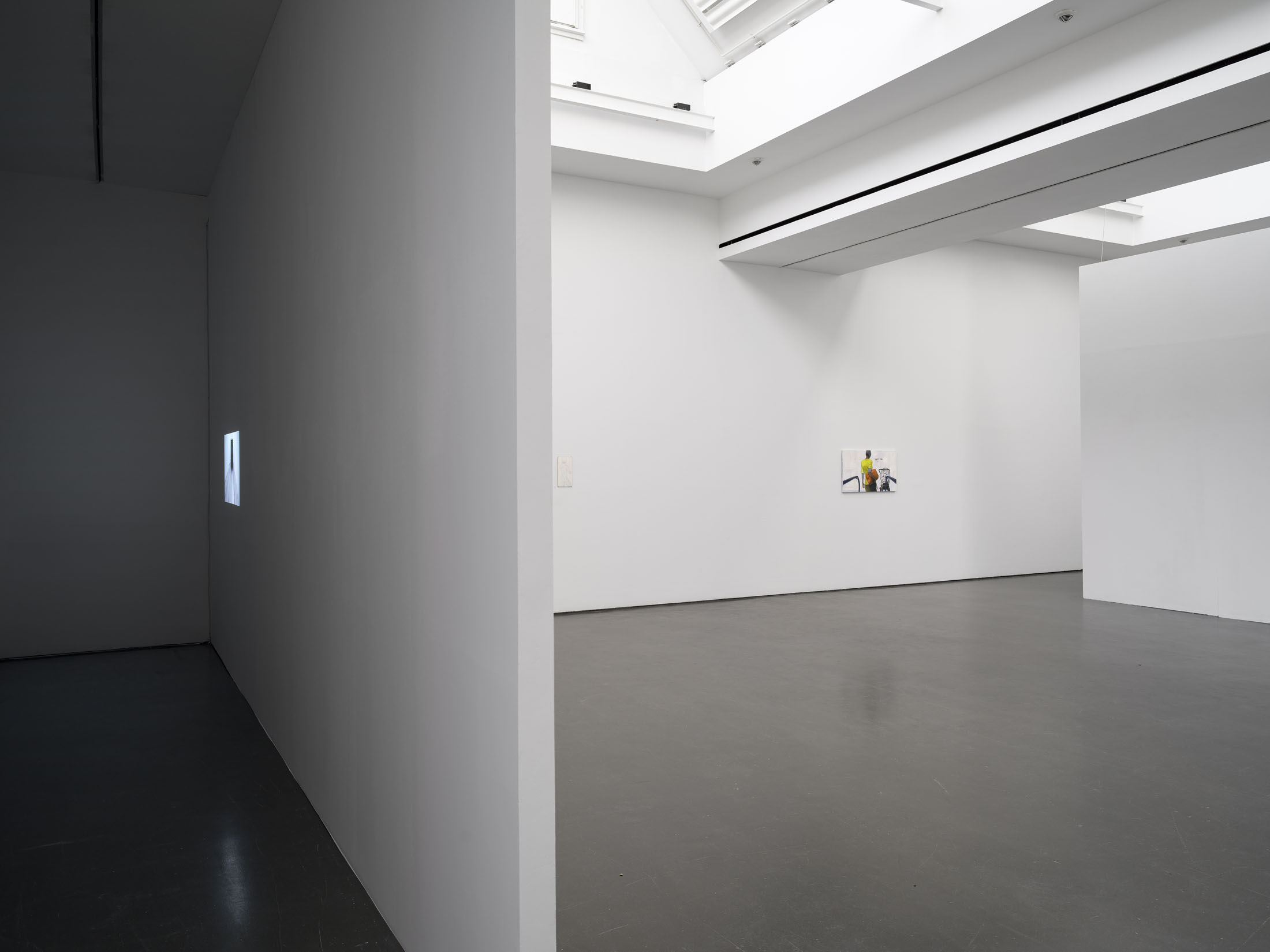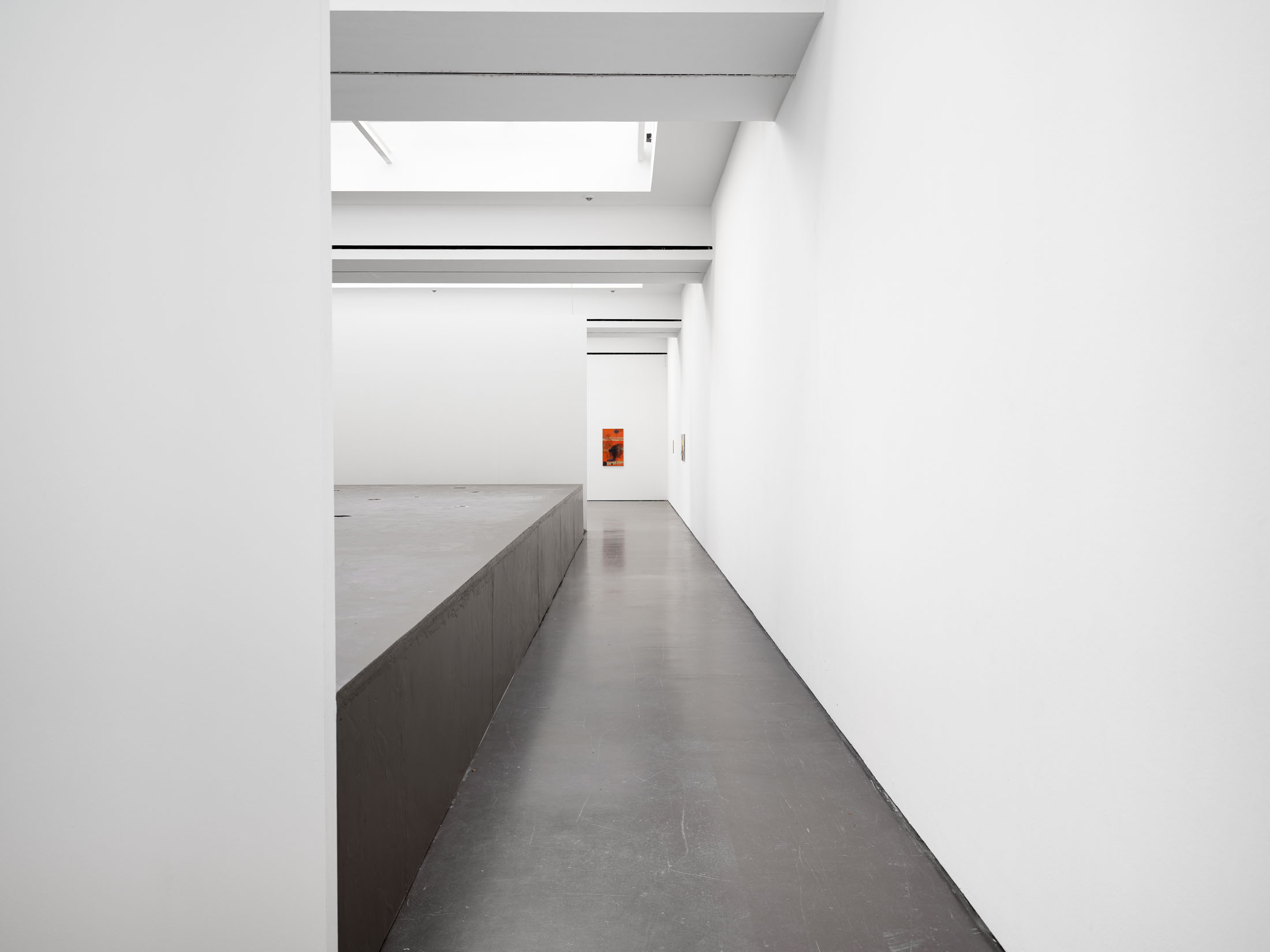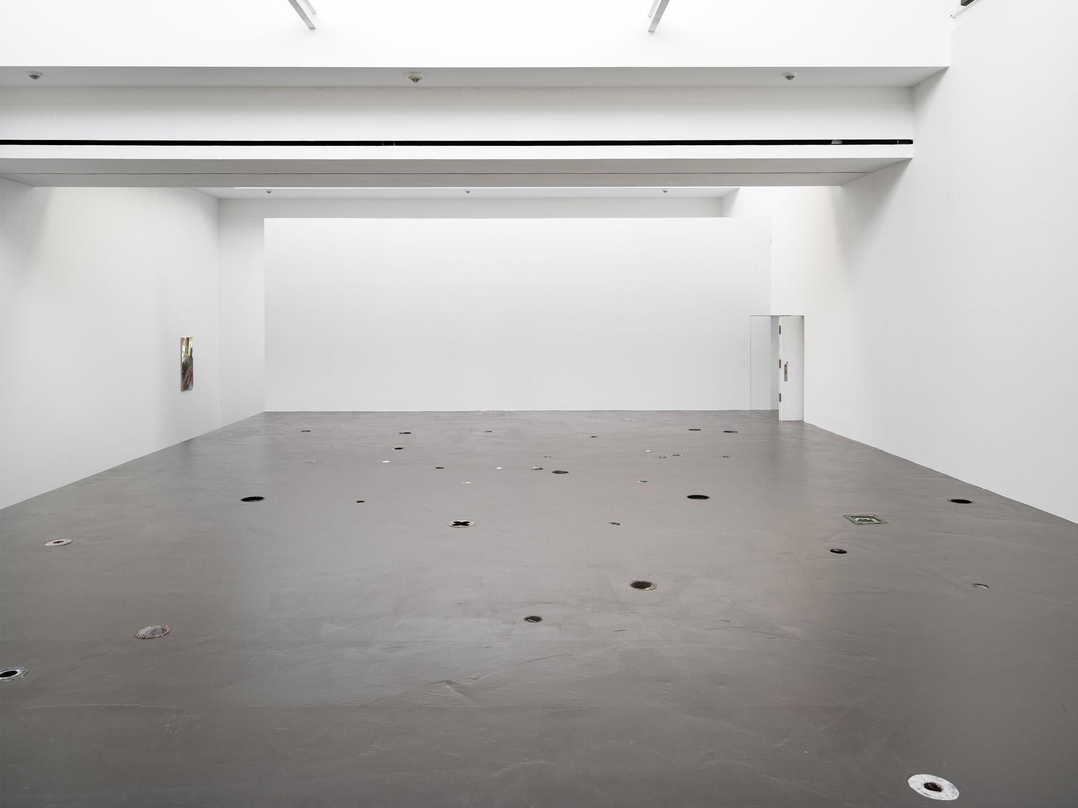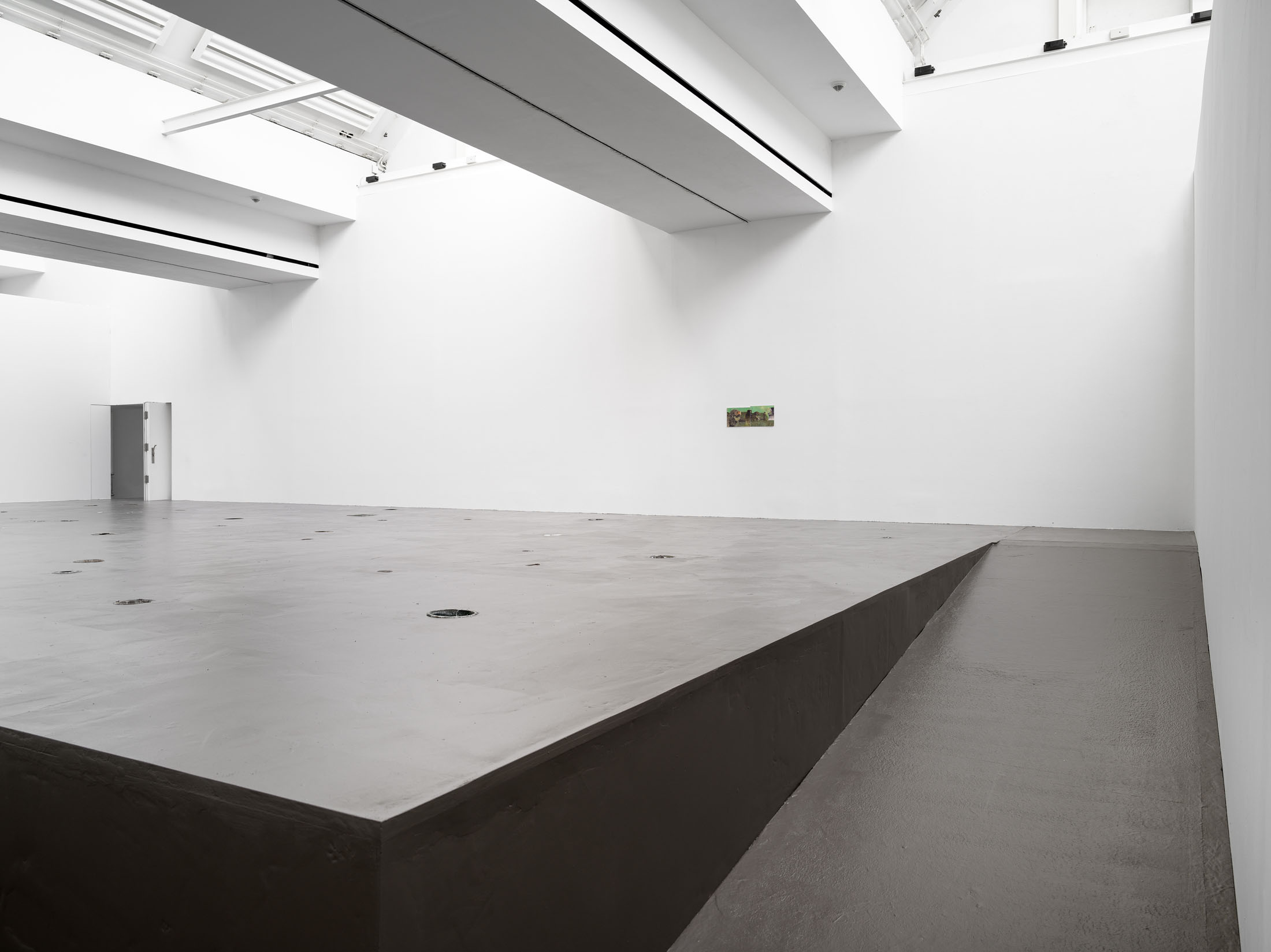 In a physical sense, the exhibition is framed by a large-scale, walkable platform by Bjartmar Hylta, which connects the exterior foyer and the interior gallery through a continuous walkway that wraps around the separating wall. While appearing as a positive, monolithic volume that choreographs movements in the exhibition, the work also incorporates a multitude of negative volumes which lead the eye into an almost bottomless void. These holes are the insides of other positive volumes which have been installed upside down, and that previously had served as bollards to divide and block physical circulation in various cities. This inversion reveals a more clandestine, unpolished interior that shows all that has settled there in the absence of an external gaze. There is a particular latency in this work as it opens up spatial peripheries and cracks of a vacant and lurking kind. Its inanimate presence speaks of an archive of urban space, but subtly withdrawing it from sight and comprehensibility.