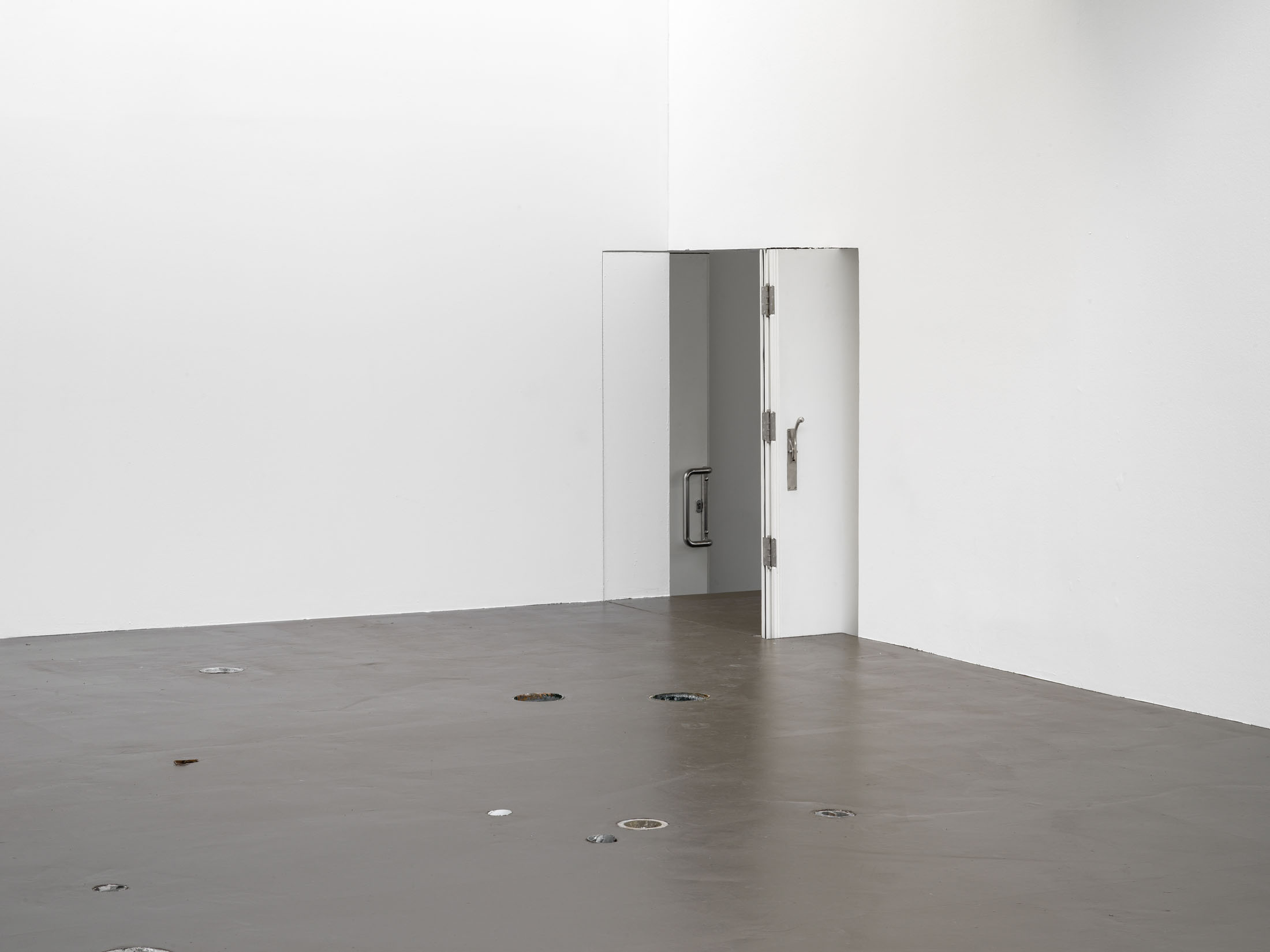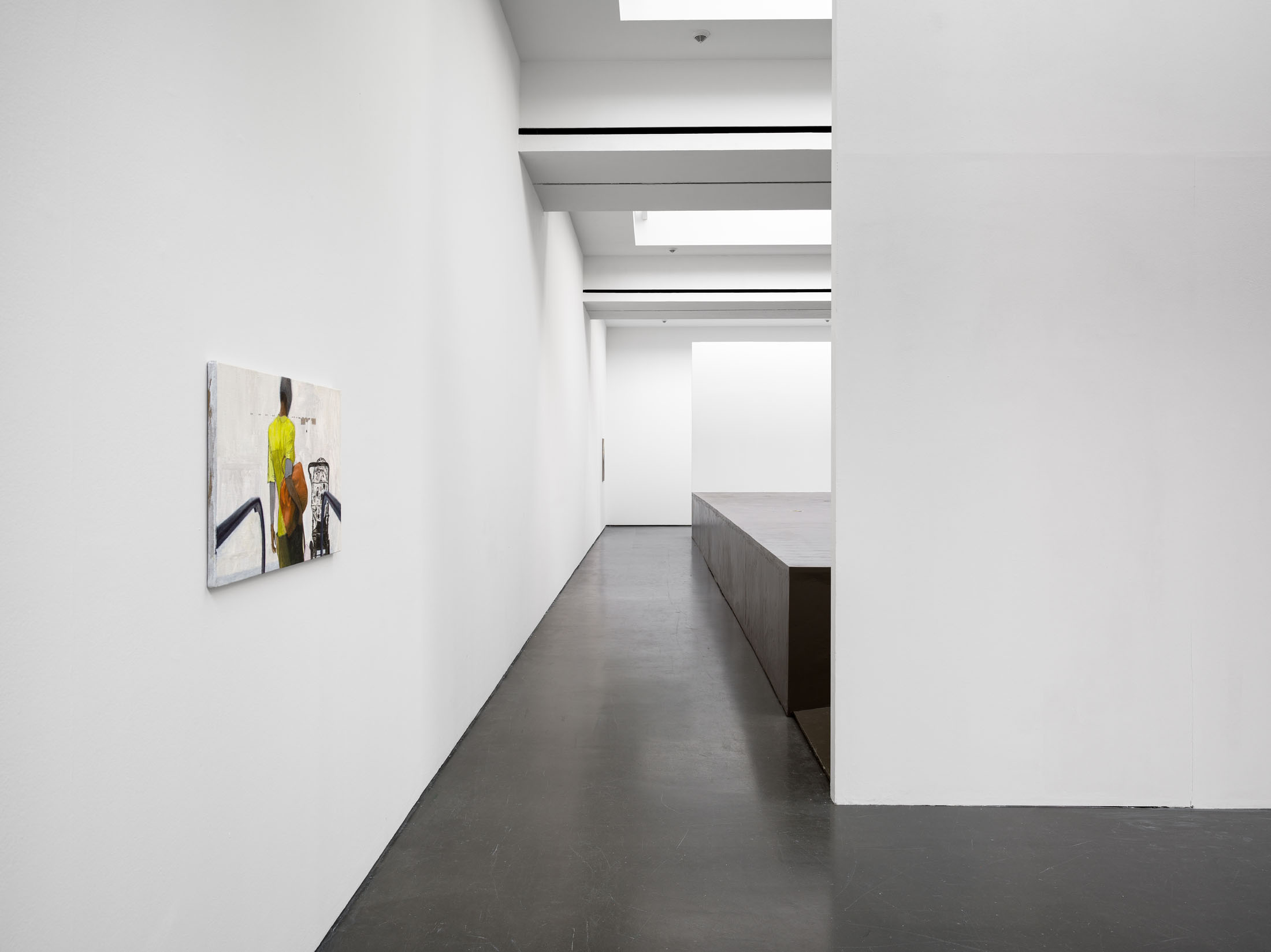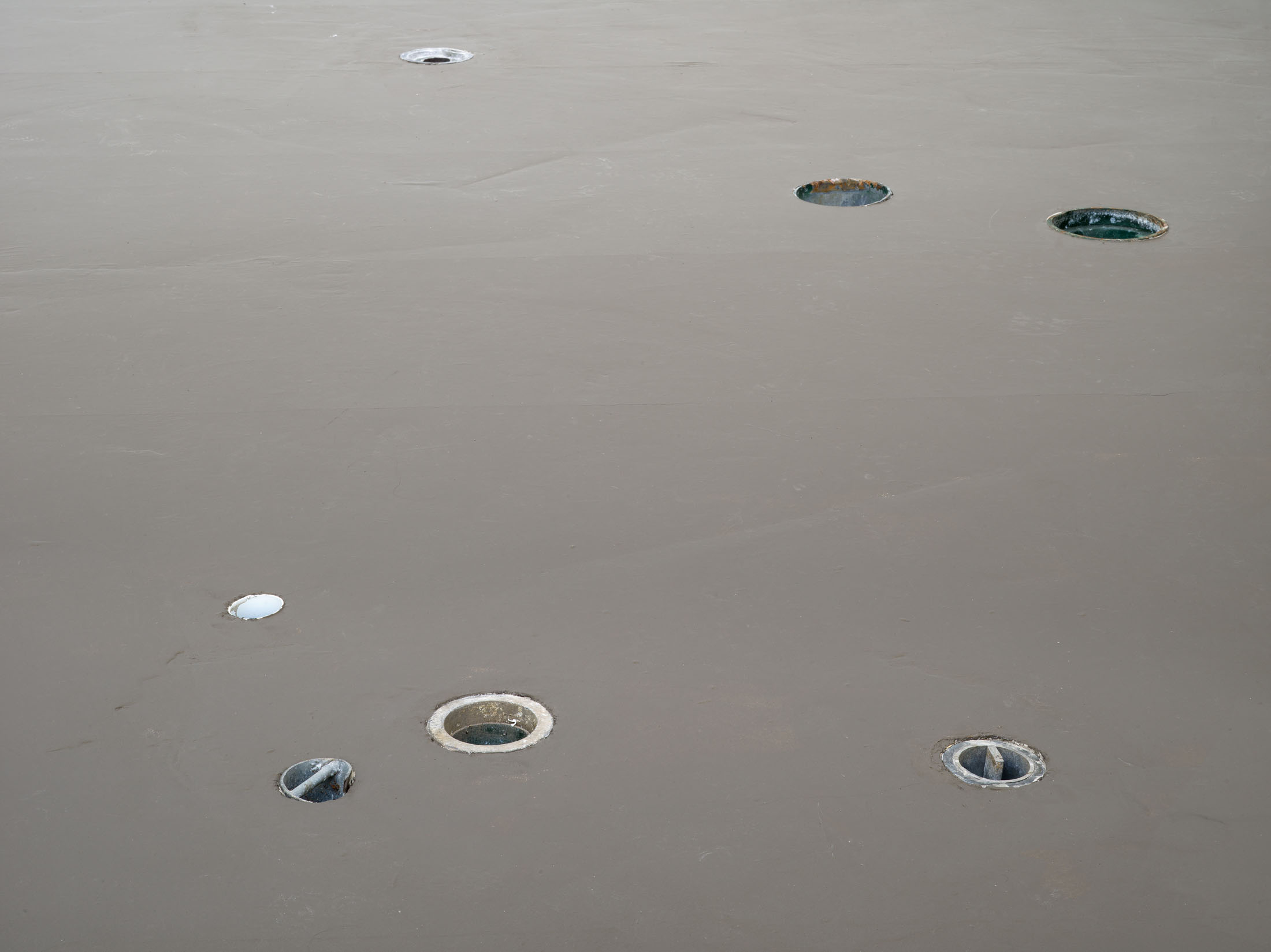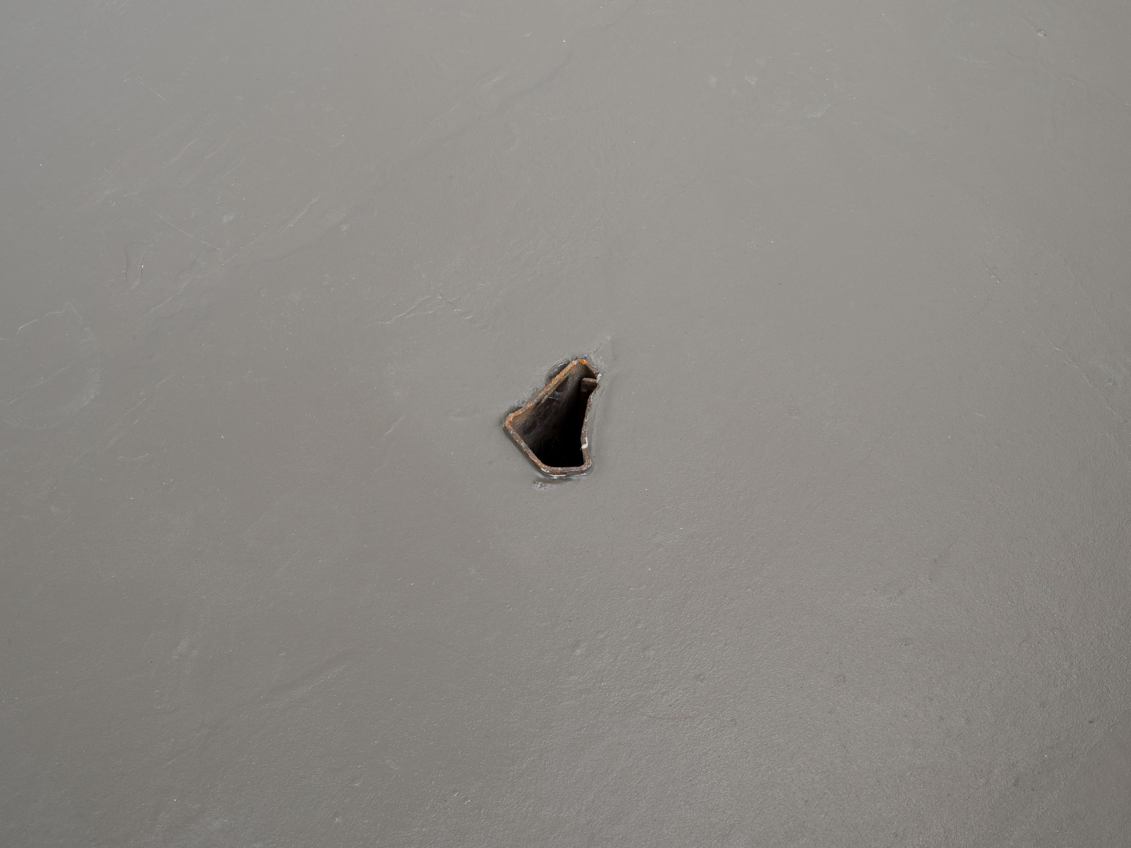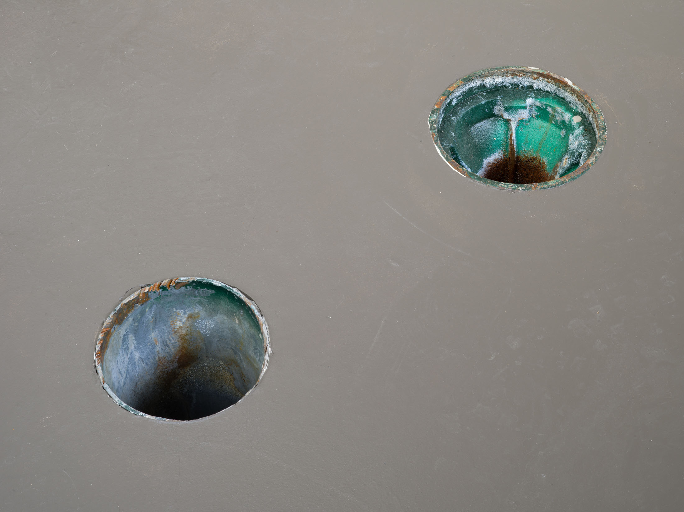 In a physical sense, the exhibition is framed by a large-scale, walkable platform by Bjartmar Hylta, which connects the exterior foyer and the interior gallery through a continuous walkway that wraps around the separating wall. While appearing as a positive, monolithic volume that choreographs movements in the exhibition, the work also incorporates a multitude of negative volumes which lead the eye into an almost bottomless void. These holes are the insides of other positive volumes which have been installed upside down, and that previously had served as bollards to divide and block physical circulation in various cities. This inversion reveals a more clandestine, unpolished interior that shows all that has settled there in the absence of an external gaze. There is a particular latency in this work as it opens up spatial peripheries and cracks of a vacant and lurking kind. Its inanimate presence speaks of an archive of urban space, but subtly withdrawing it from sight and comprehensibility.
