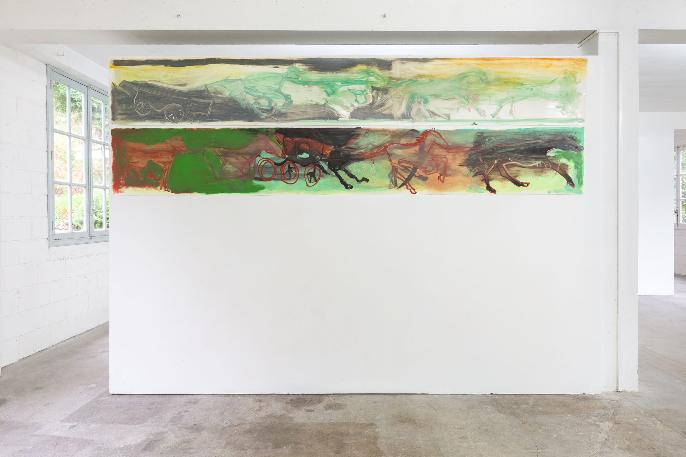 Here, further explorations of equine figures unfold across the canvas. The first work to greet the viewer is Galloping Leg Study (1 + 2), an oblong work on paper which, as its title suggests, takes on the form of a study. Reminiscent of Eadweard Muybridge’s 1878 photographic series Sallie Gardner at