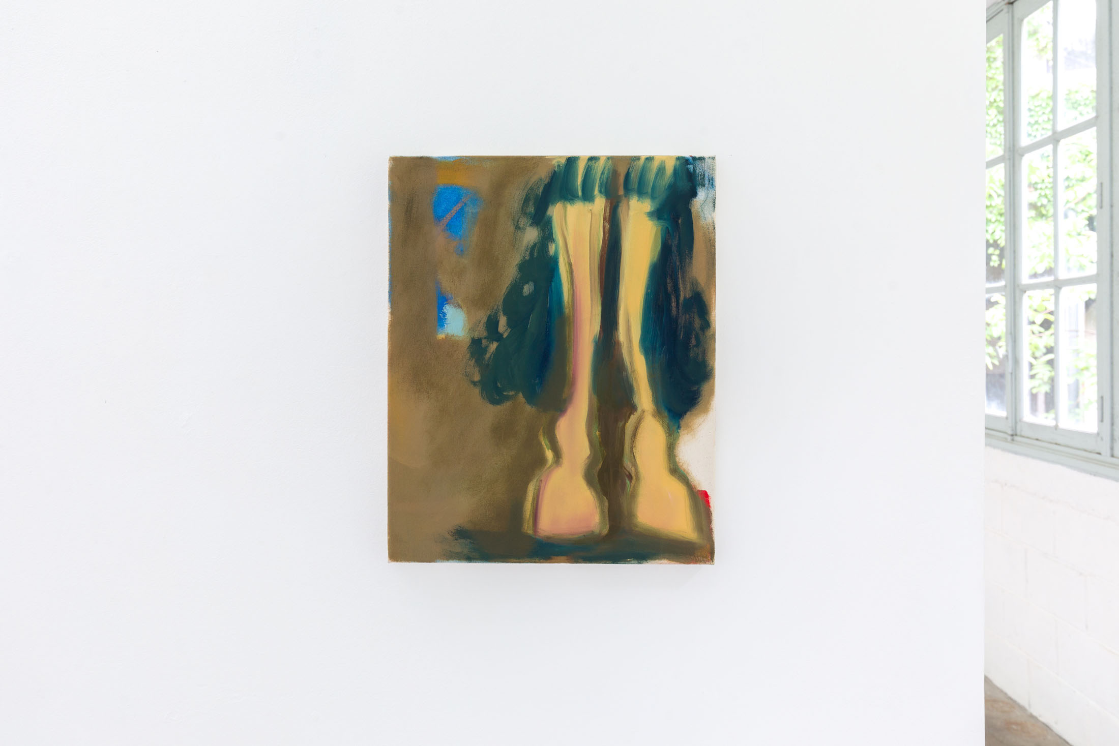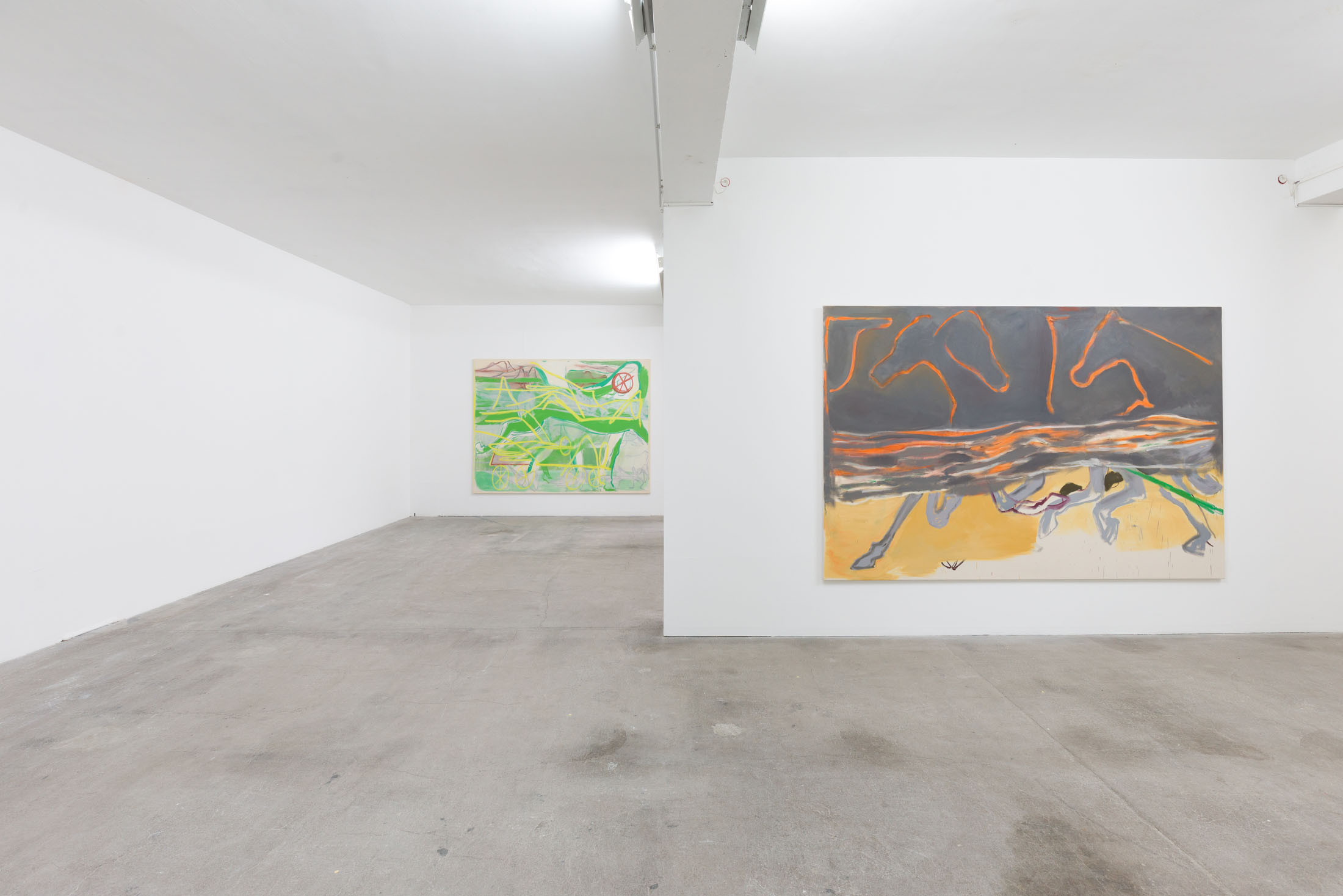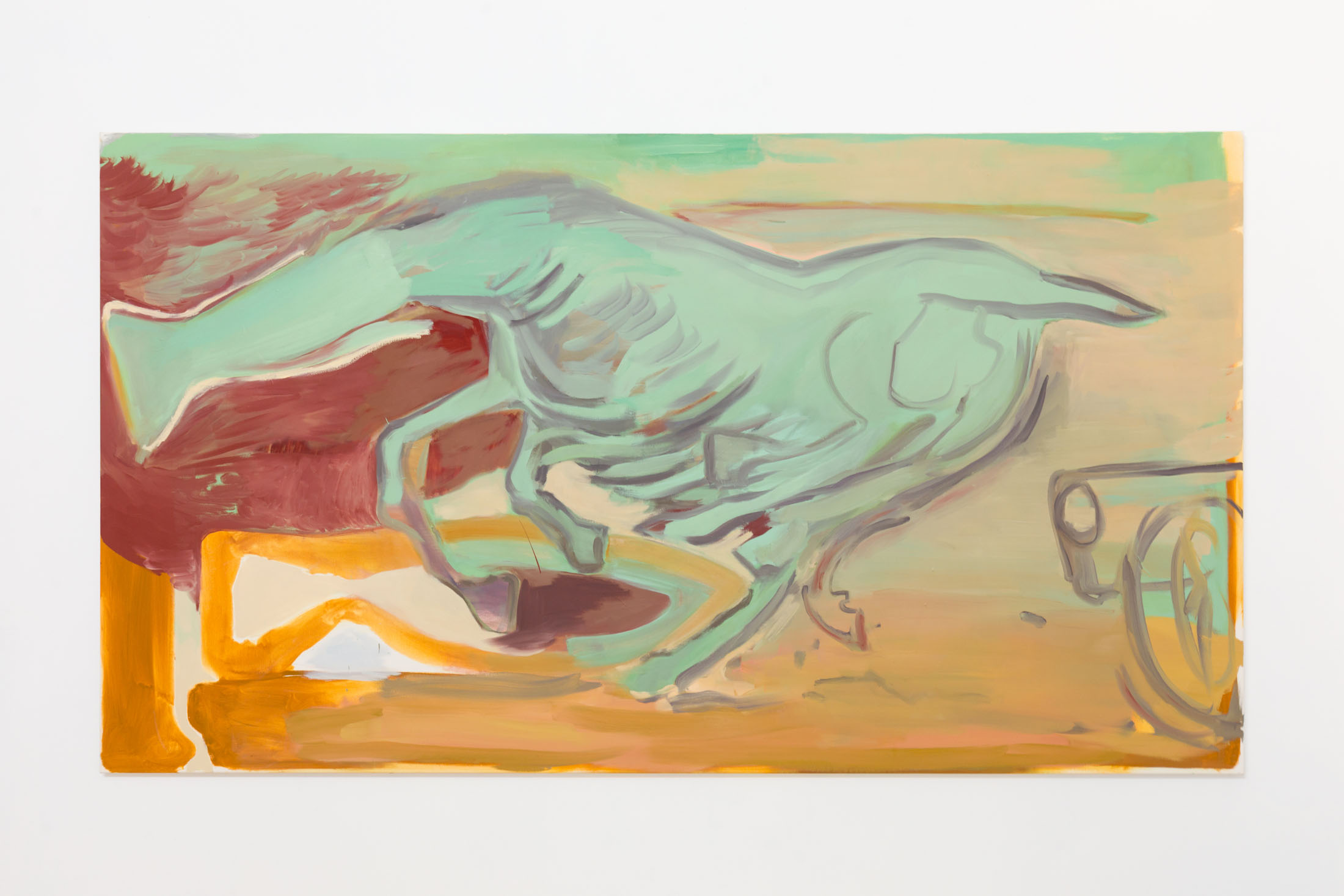In this painting, the horse’s body is captured mid-motion, its head blurred by the velocity of its own movement and the artist’s roving eye, or camera. As it reaches towards the edge of the room, the headless body appears to loop back to the first painting that opens the space, its bodiless counterpart, as if the two were fragments of a single image. This circular gesturing leads the viewer toward the second part of the exhibition, which unfolds across the upper floor galleries.