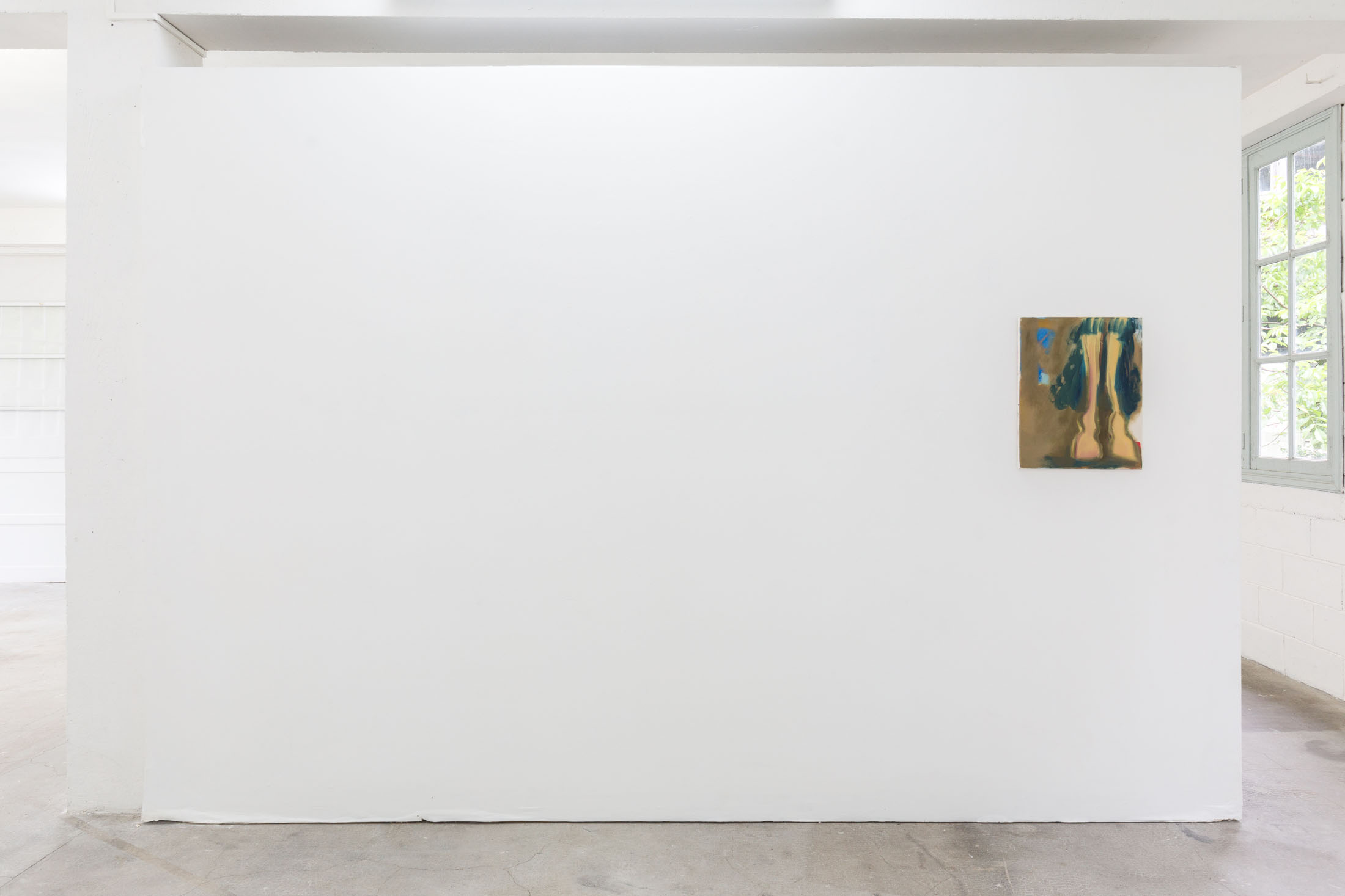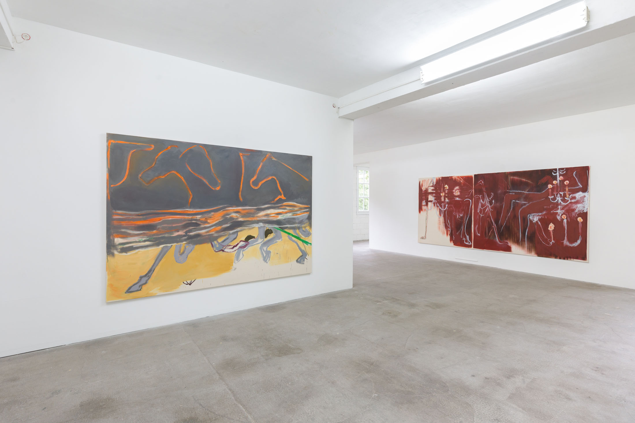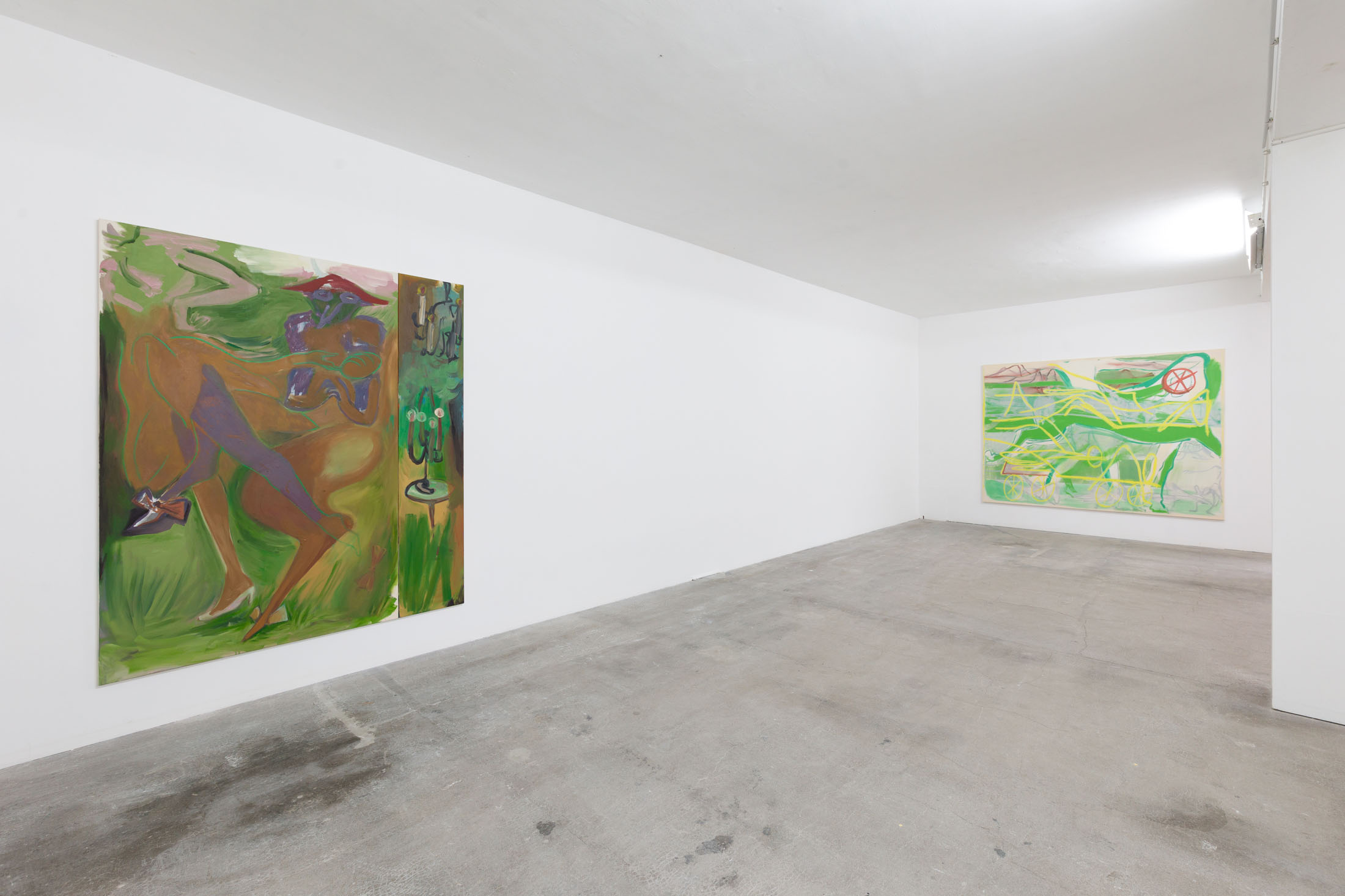 In this painting, the horse’s body is captured mid-motion, its head blurred by the velocity of its own movement and the artist’s roving eye, or camera. As it reaches towards the edge of the room, the headless body appears to loop back to the first painting that opens the space, its bodiless counterpart, as if the two were fragments of a single image. This circular gesturing leads the viewer toward the second part of the exhibition, which unfolds across the upper floor galleries.