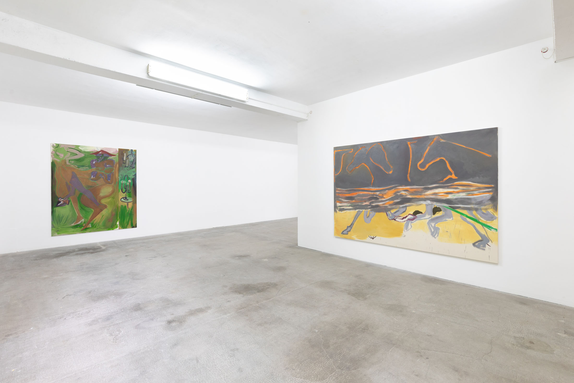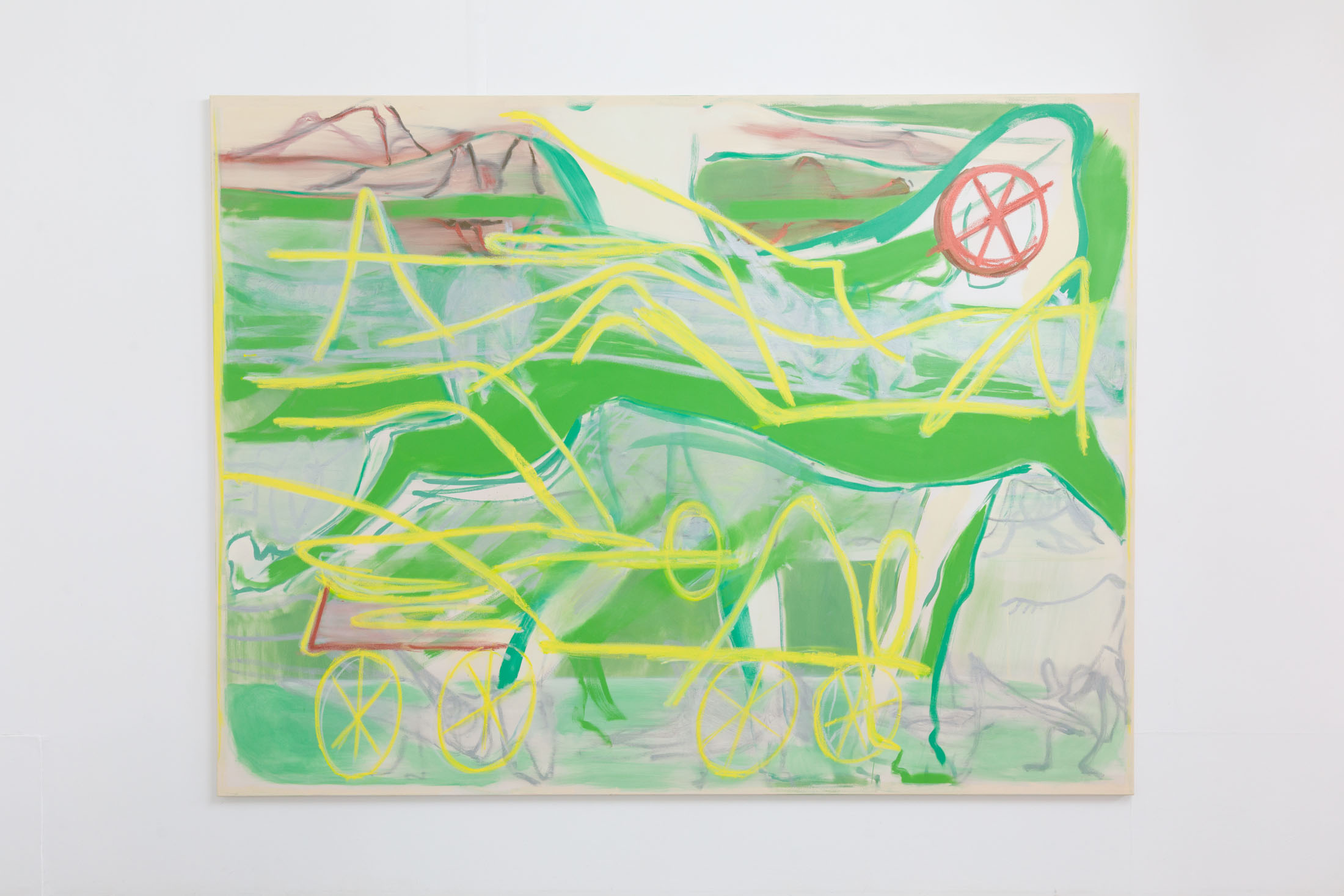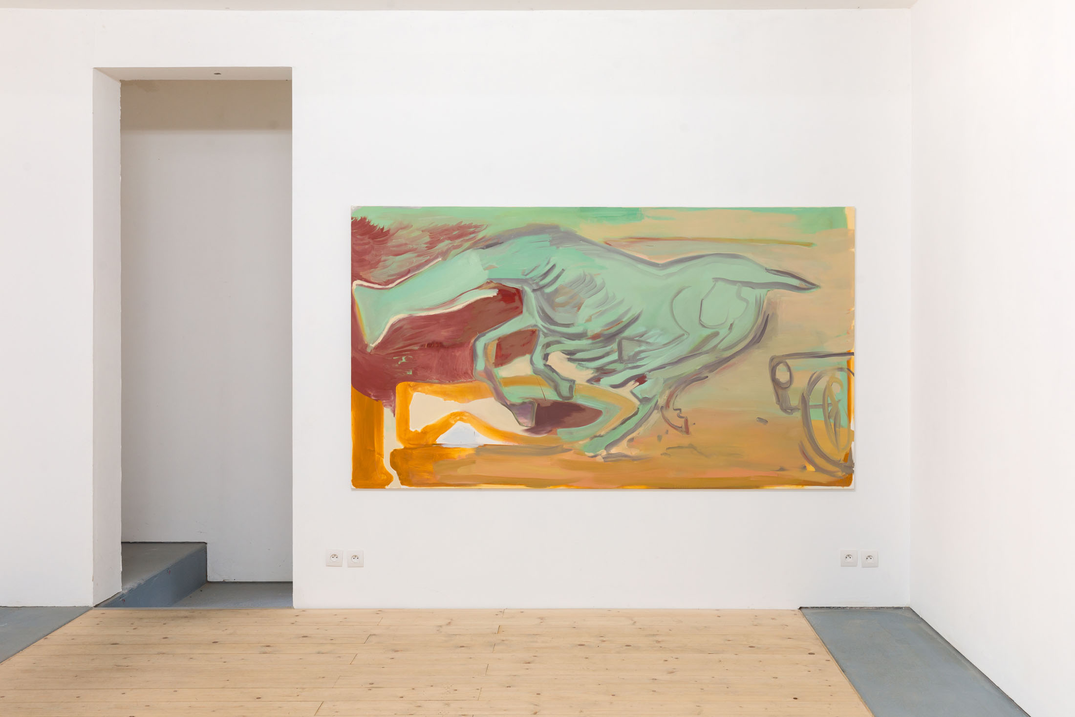 Charlott Weise’s latest body of work, produced for her debut institutional solo exhibition in France at Treignac Project also reflects this approach. Comprising eleven paintings, the series centres on the horse as a powerful visual and symbolic motif. The exhibition, titled Y’a du Zeph, a colloquial French expression suggesting turbulent weather and evoking the zephyr, the ancient god of the wind, uses the equine figure as a means to explore ideas of movement and transformation both as painterly concerns and as broader modes of inquiry.
