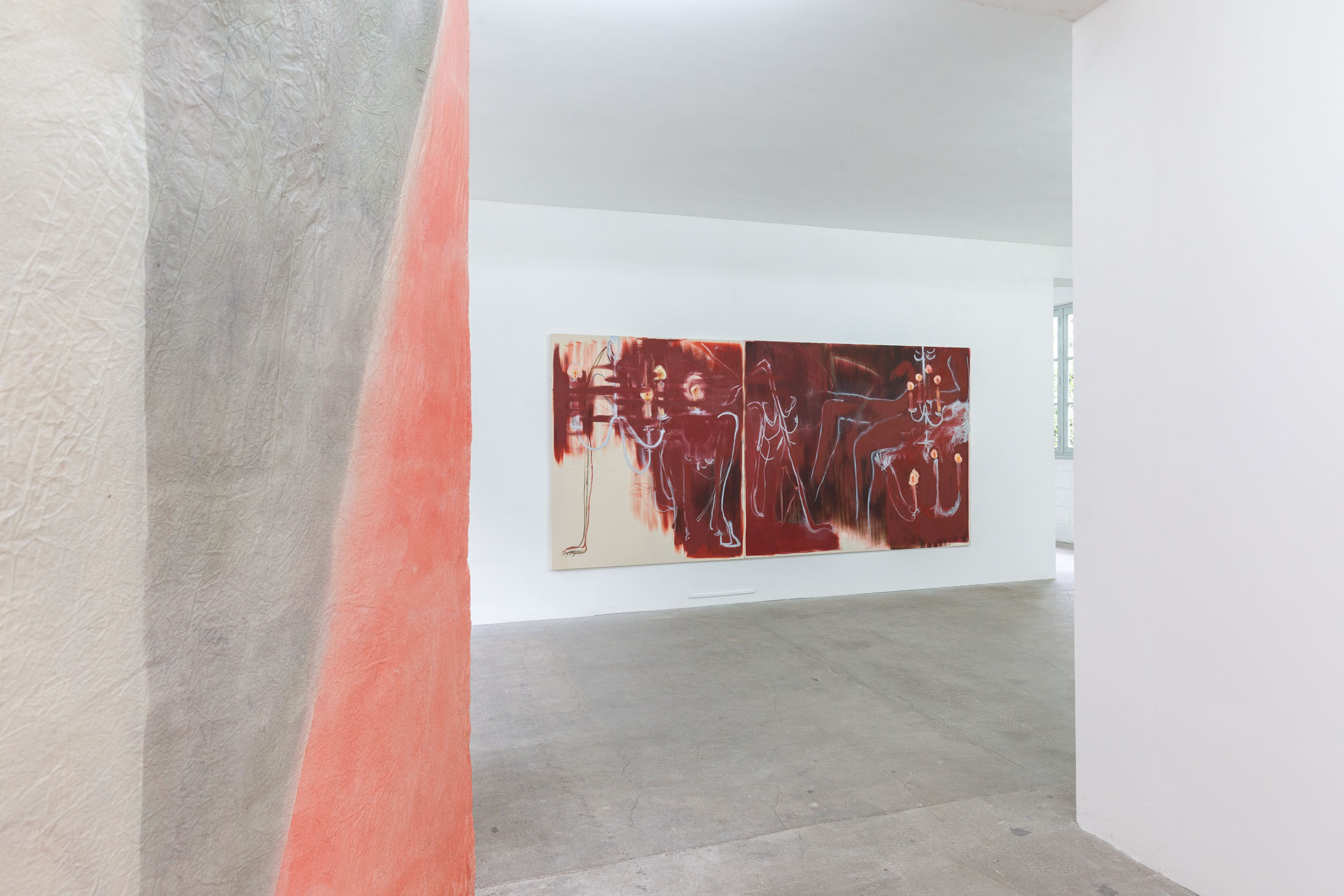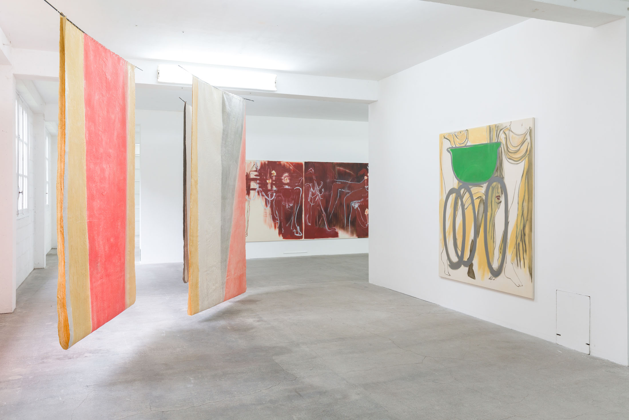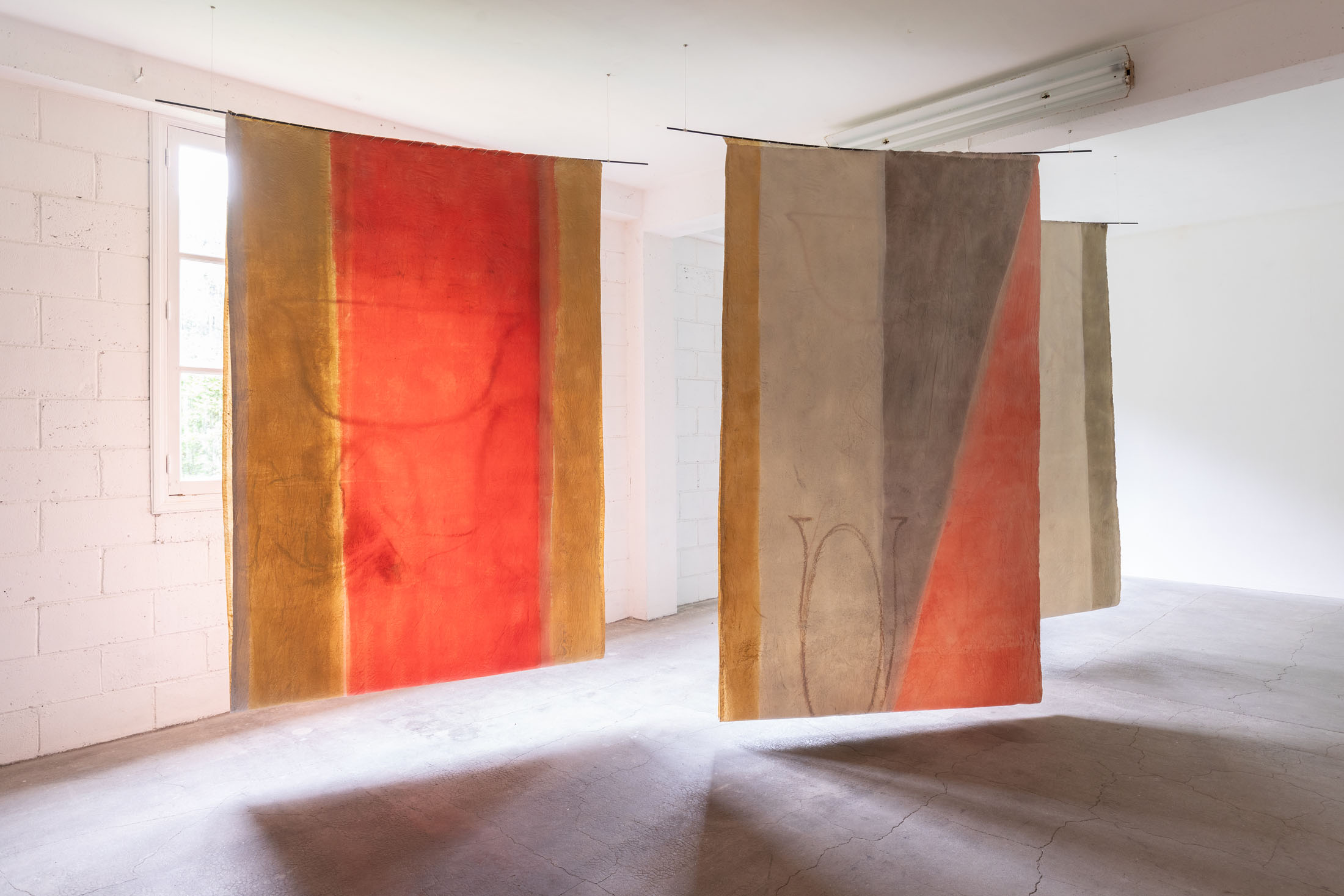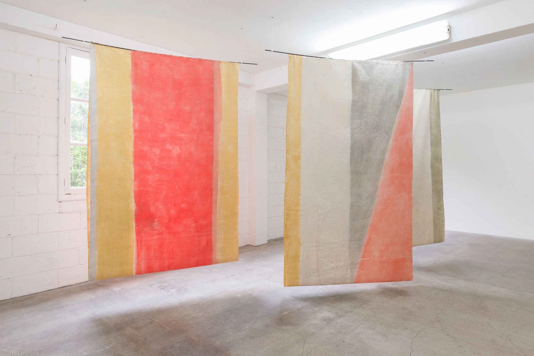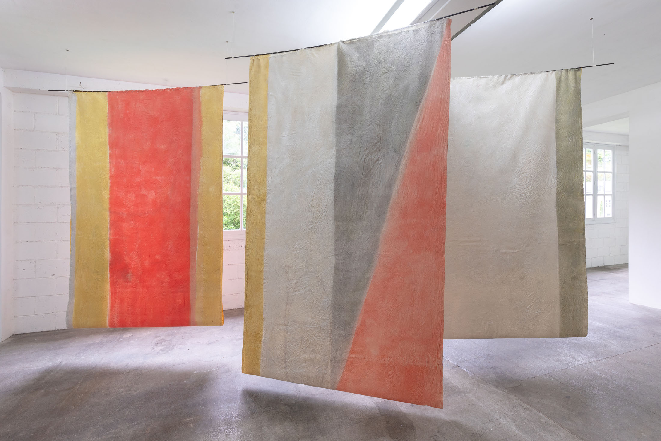 The exhibition reaches a point of rupture with Palio Pages, a work composed of large canvas sheets painted in bands of silver, red, and gold, looped and stitched together at their base. These works generate motion through their very structure, from the unstretched material they are made of, marked by lingering ripples and folds, to their suspended state, as they quietly unfurl across the space. The work interrupts and redirects the gallery’s flow, asserting its own architectural logic. As its title suggests, the work evokes the spectacle of Palio, the historic and often violent Italian horse race held since medieval times in the streets of Siena.