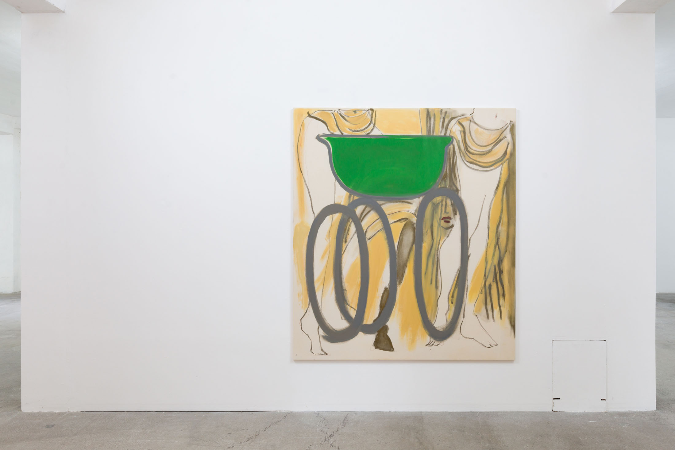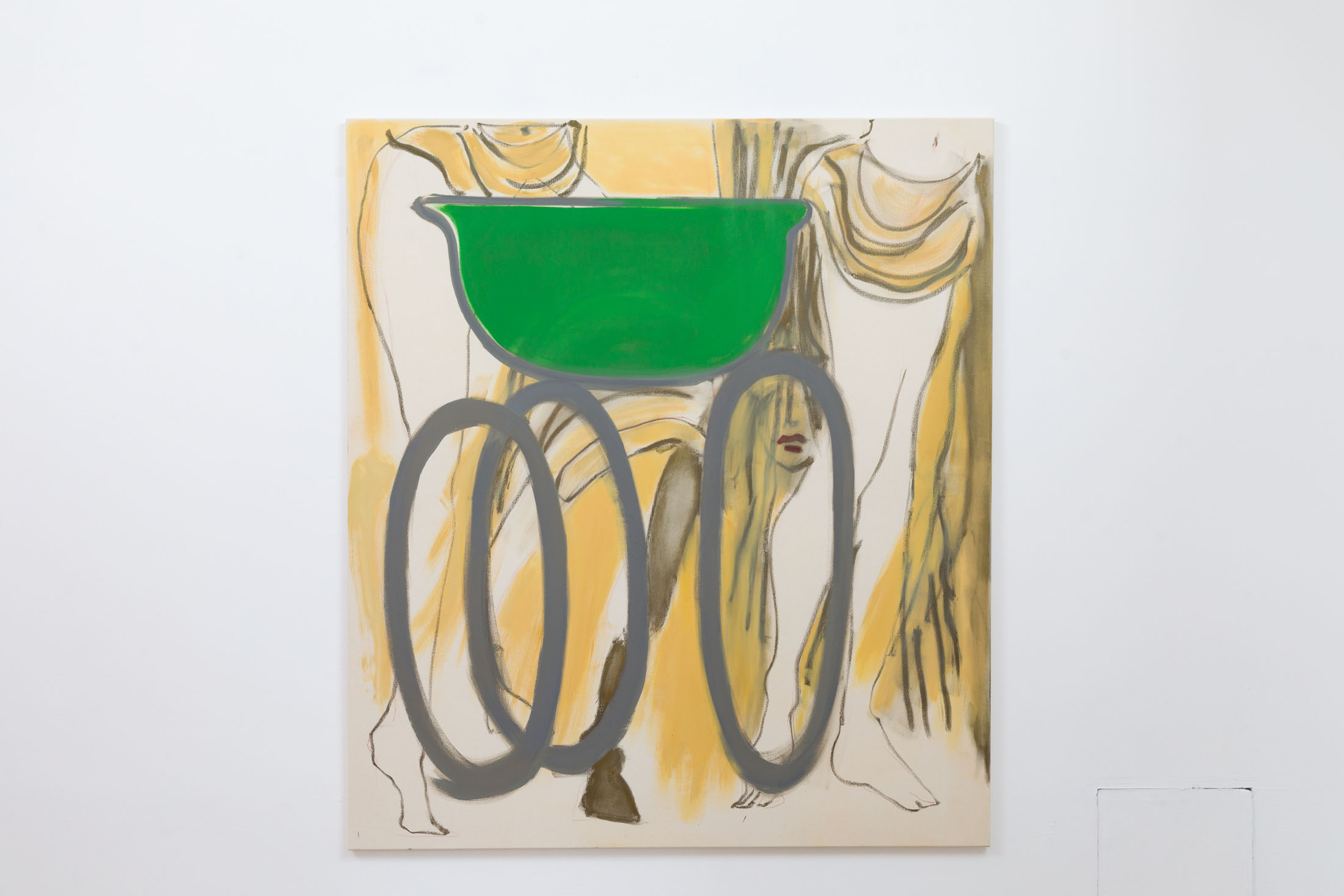 This work sets the tone for two further depictions of equine motion. While Amadeus Shoes focuses on the detail of a horse’s hooves, the very instruments of movement, Galloping Horse Nebula presents a cluster of horses in a state of frenzied charge. A singular green line juts from the corner of the frame, guiding the eye towards another nearby work, Locusts Silver Swarming. Green brushstrokes thicken on its surface into the rough contours of horses, their forms gradually dissolving into a bucolic landscape of lush fields and snow-capped mountains, alive with swarming locusts. The colour green recurs as a visual motif in a work presented on an adjoining wall, Aeoliphonic Cauldron, where a large green vessel is encircled by the lower halves of two human-like figures, draped in cascading fabric. Here, the figure of the horse dissolves, giving way to a scene that evokes an ancient ritual from a bygone world.