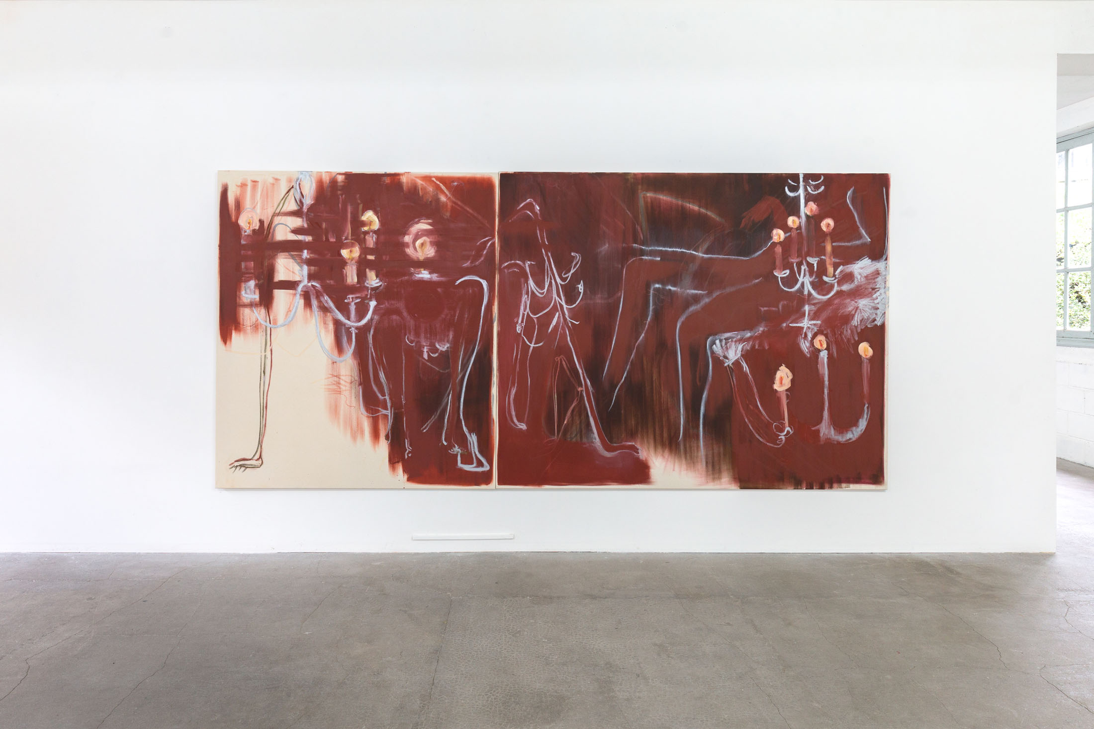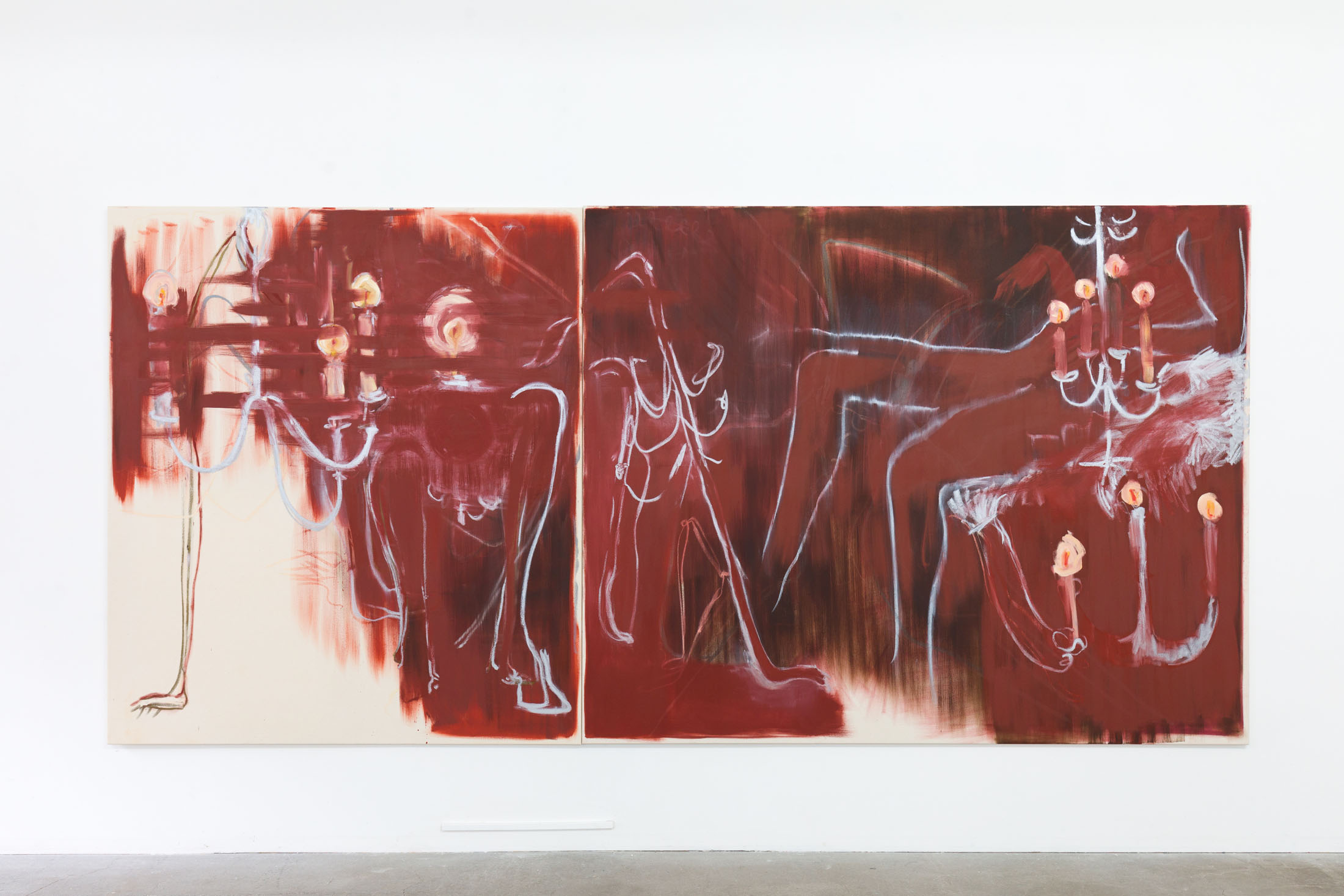 The exhibition becomes a spectacle unto itself, saturated with the palette of the human condition, all culminating in the final scene of Weise’s painting of moving image, Girandola. Rendered in sumptuous Venetian red, the work nods to the tradition of early modern painting and its affinity for heightened theatricality. In contrast to the bucolic idylls found elsewhere in the exhibition, Girandola presents an opulent Italian interior anchored by flamboyant chandeliers, around which a mass of naked bodies gathers. What begins as a tableau of decadence, ripe with erotic charge, gradually reveals itself as a scene of violent potential, the aftermath of an unspoken undoing.