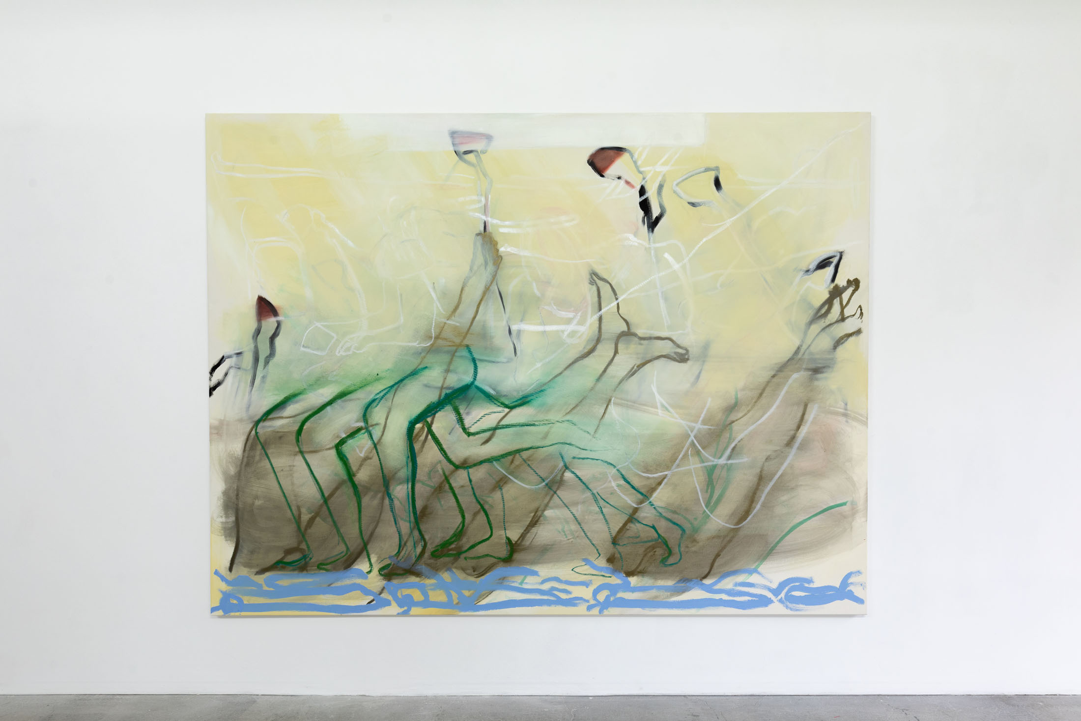 These same human forms resurface in Y’a du Zeph, the painting that gives the exhibition its title. In this work, a chain of bare legs plunges into azur waters. In the distance, hooves emerge mid-motion as ghostly echoes of equine forms. The body appears suspended in the swell of metamorphosis, part human, part animal, evoking the hybrid mythical figure of the centaur, a symbol of the natural world’s untouched, primordial force.