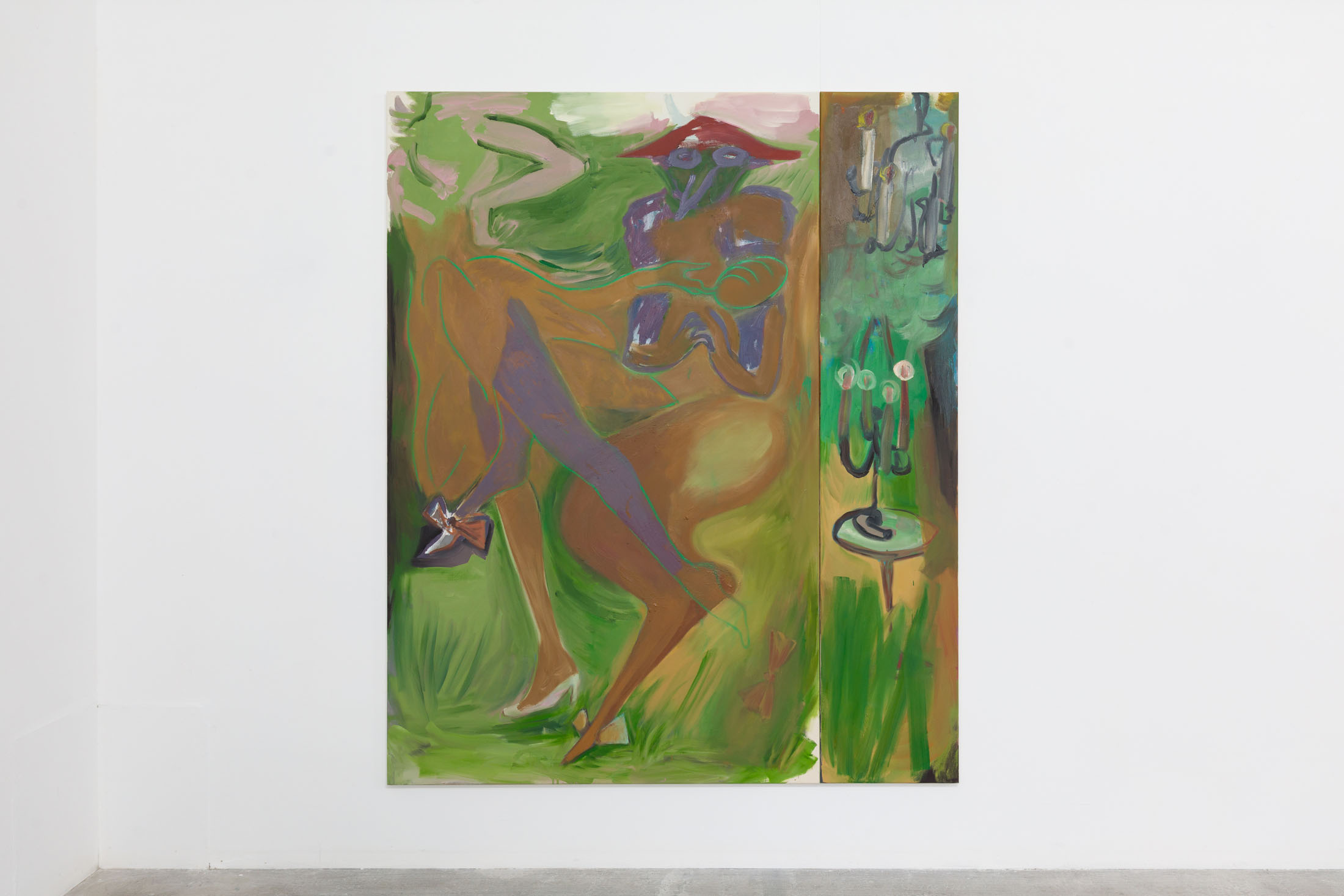 A similar scene emerges in Neckerei (dans le jardin), where hybrid figures recline across a verdant setting. They inhabit a space where past and present intertwine, as they bear the accoutrements of modern life, adorned by a bow and high heels, while reposing next to a metallic side table topped with a lamp. The work offers a quiet nod to Édouard Manet’s Déjeuner sur l’herbe (1863) which transposed the pastoral ideal of ancient Arcadia to the context of 19th-century modernity.