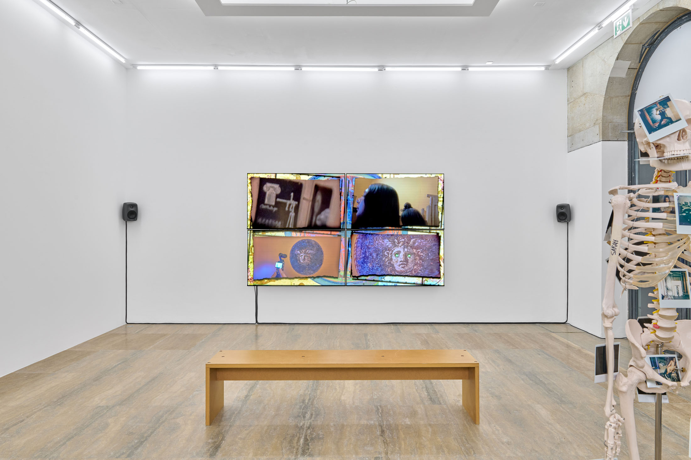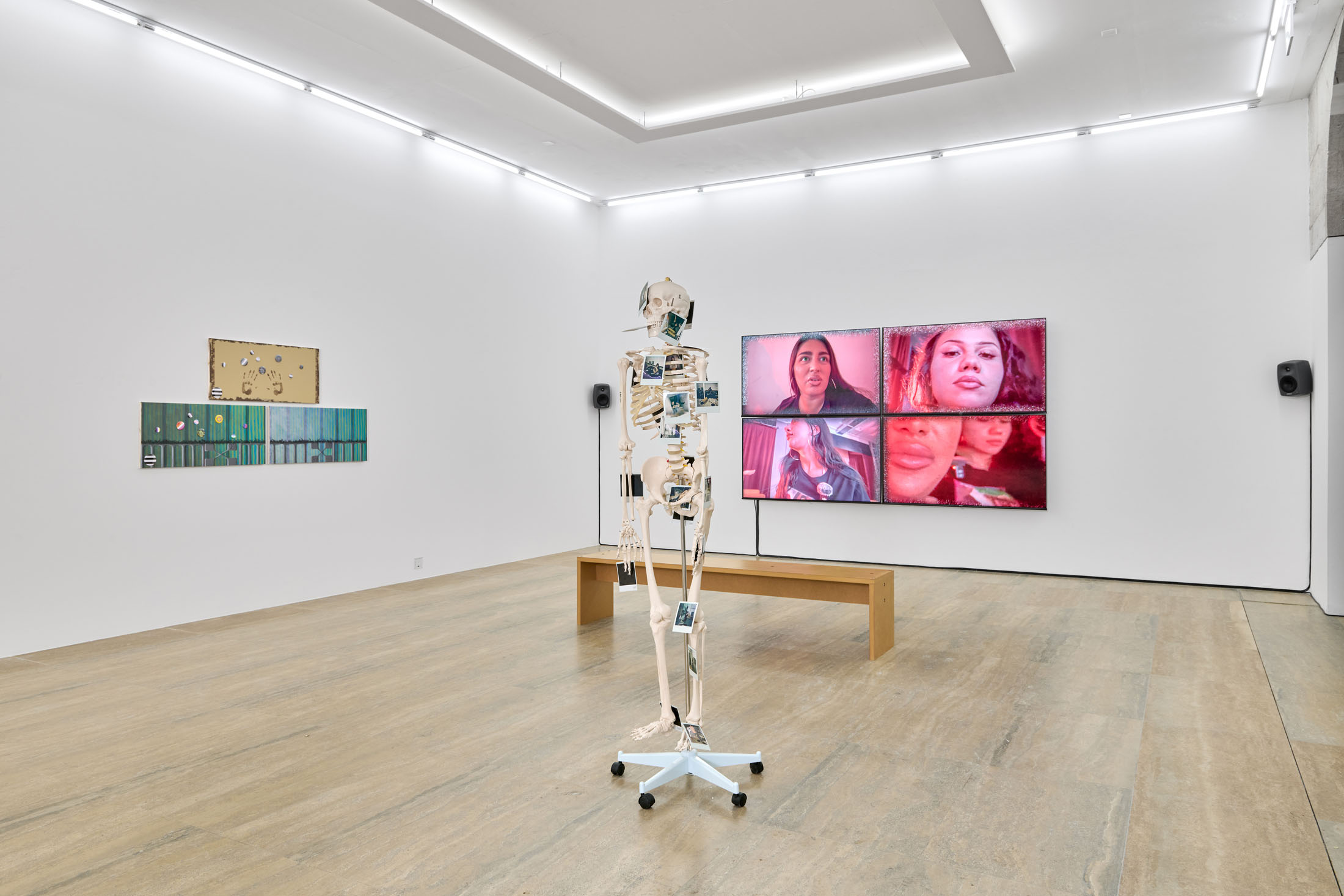 At the heart of Mammoth steps. One for Kevin, two for Lisa unfolds a new multi-channel video, conceived to inhabit the physical space and enter into dialogue with two groups of paintings as well as several mixed-media installations. An escape room inspired by Pompeii serves as the backdrop for this claustrophobic narrative, in which the artist seeks to document a present condemned to near-instant obsolescence. Within a universe at once dreamlike and trashy—evoking Pink Flamingos by John Waters as much as Temple Time by Ryan Trecartin—Kauffmann’s charactersoperate through precise codes: performative endurance, heightened logorrhea, self-referential gestures and attitudes.