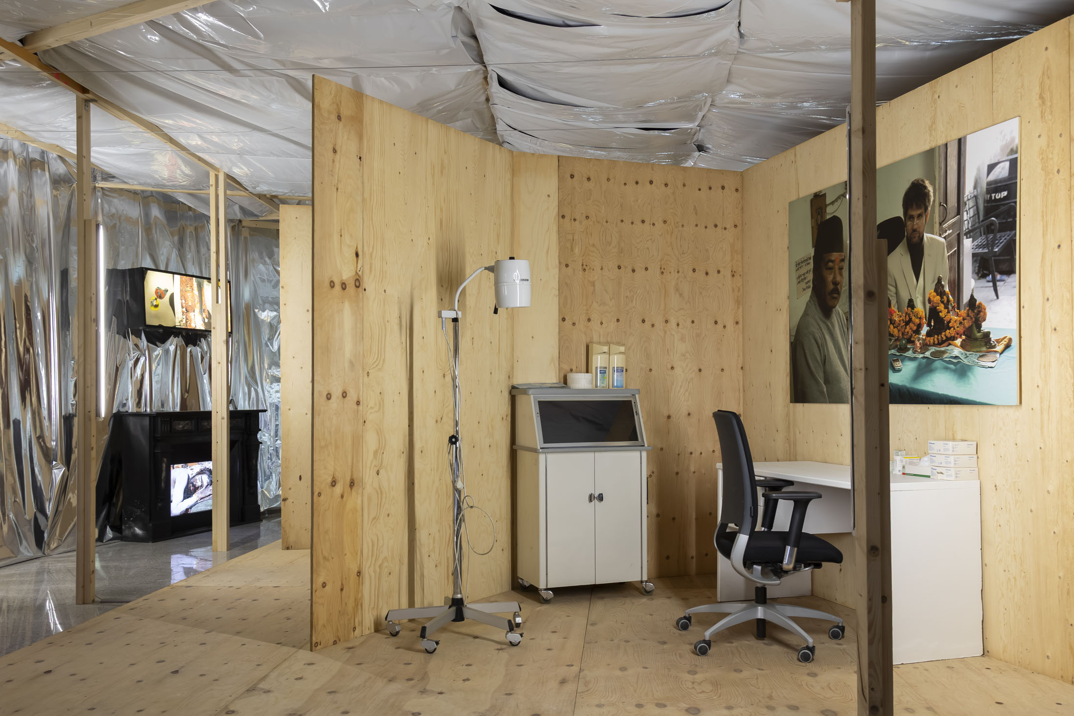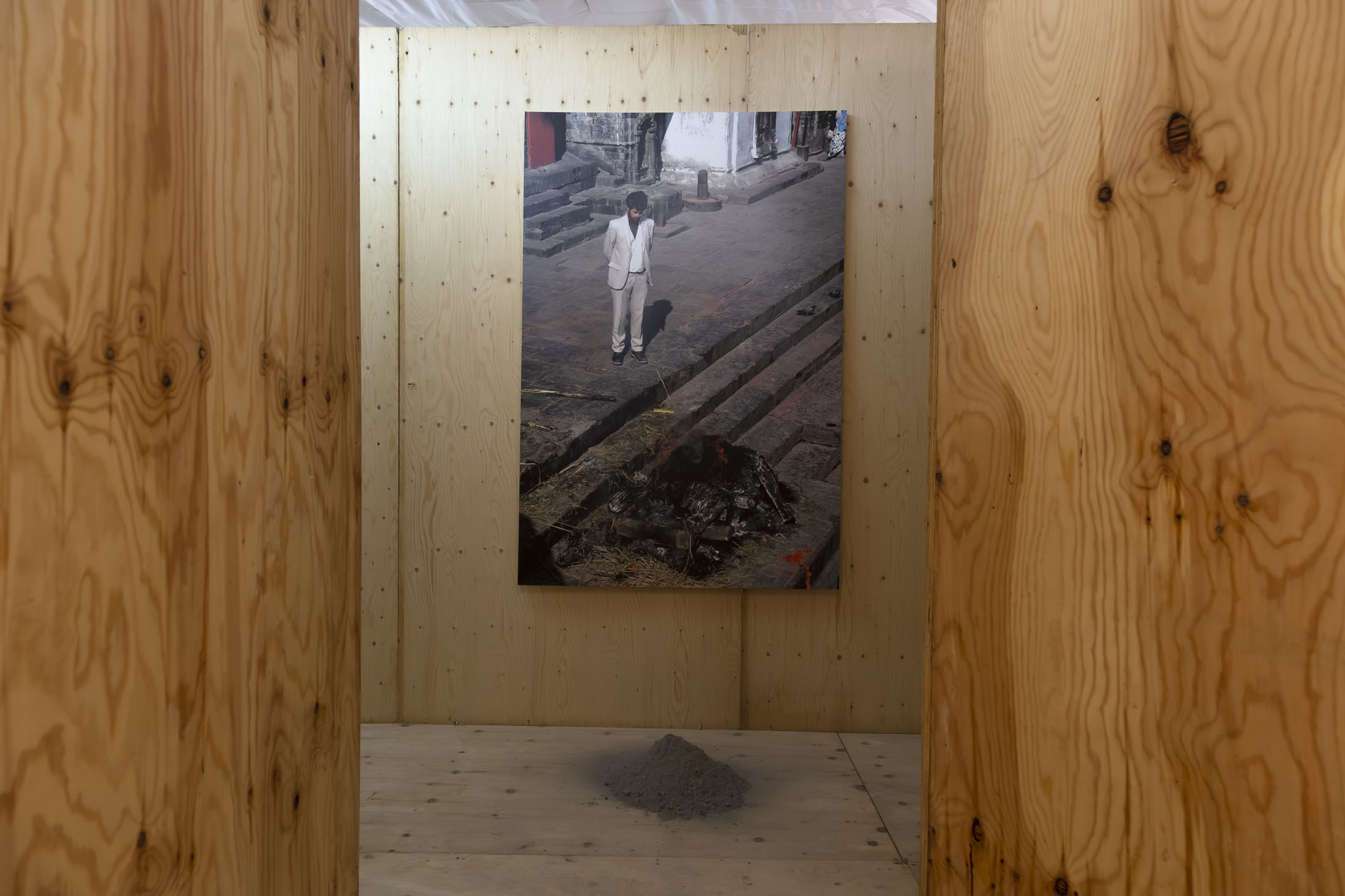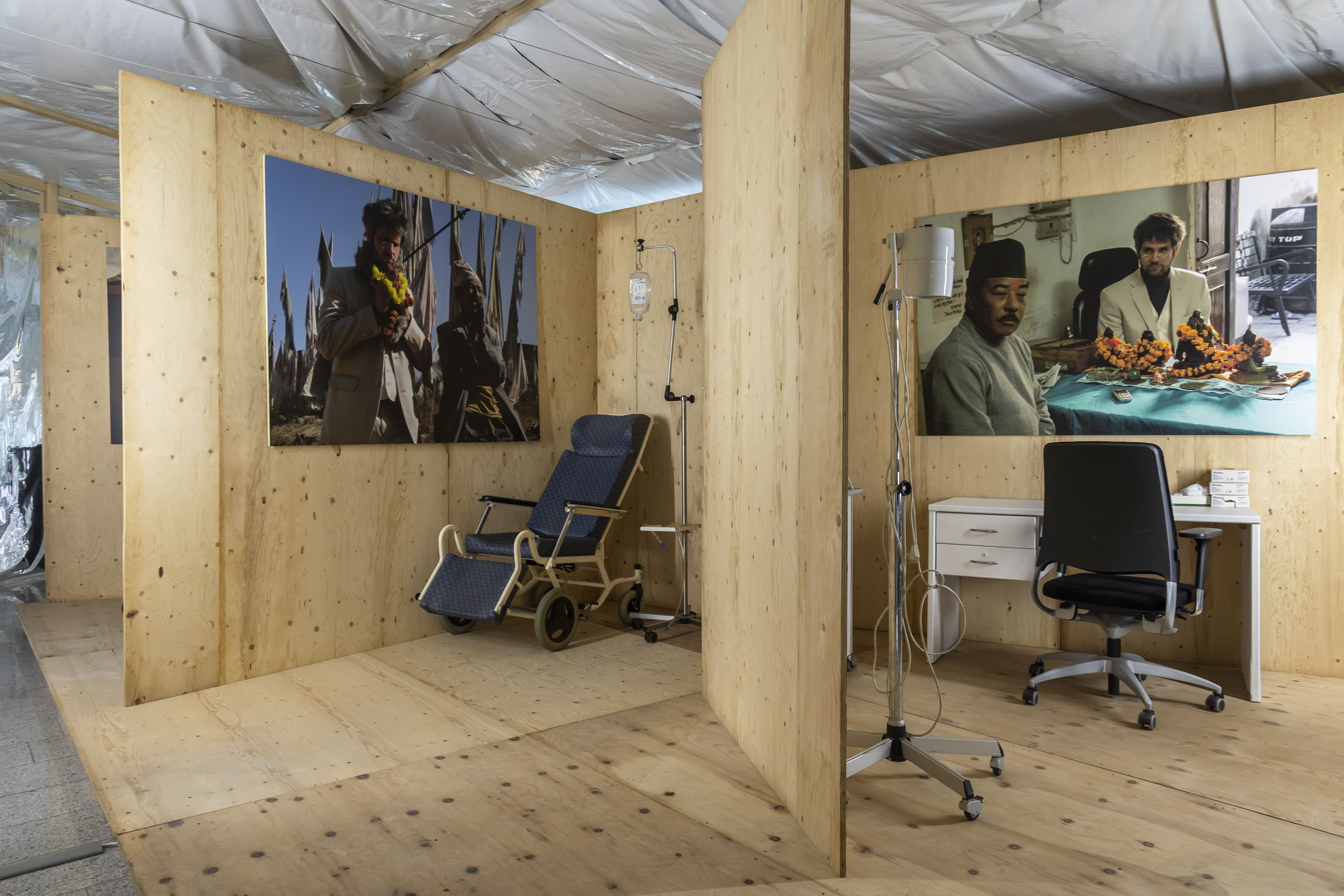 „NACH Christoph Schlingensief“ includes works from different creative periods. The installation „Der König wohnt in Mir“ (2008) incorporates six films and photographs from Kathmandu and Bhaktapur, taken in the winter of 2007/08, some during Hindu funeral rituals. In one of the films, the artist appears himself as part of the scene, highlighting the inseparability of observation and participation in the process of artistic intervention. The installation, designed as a treatment room, confronts visitors with themes of illness, mortality, and redemption.