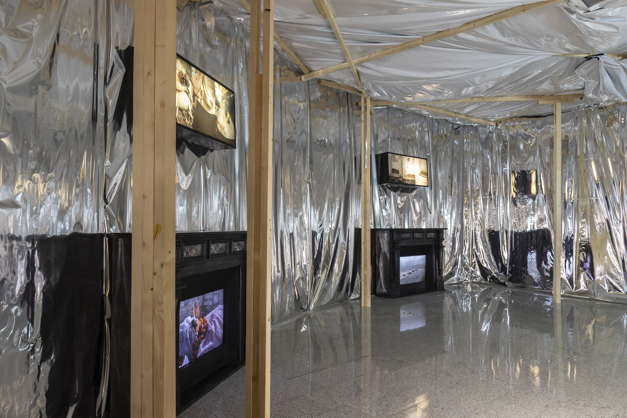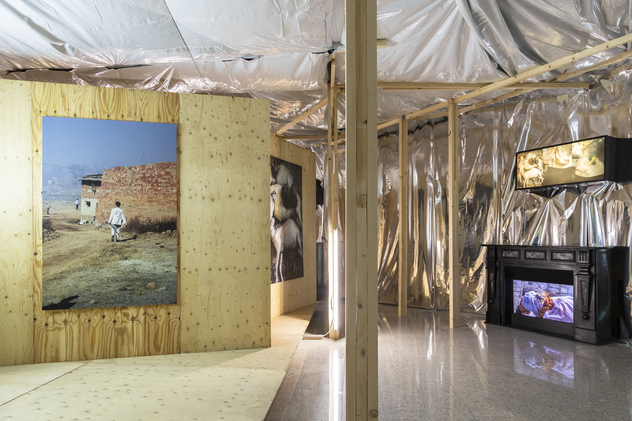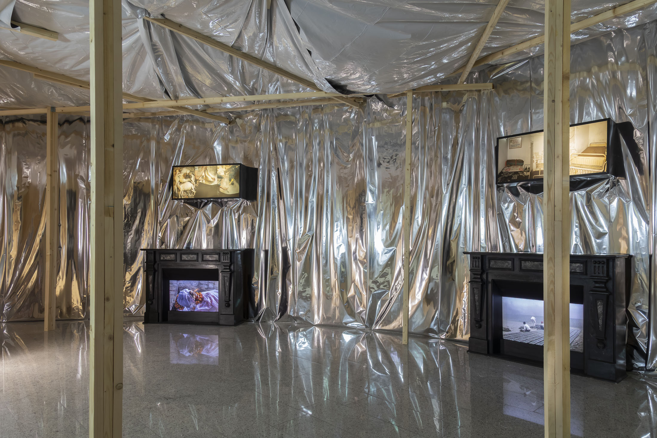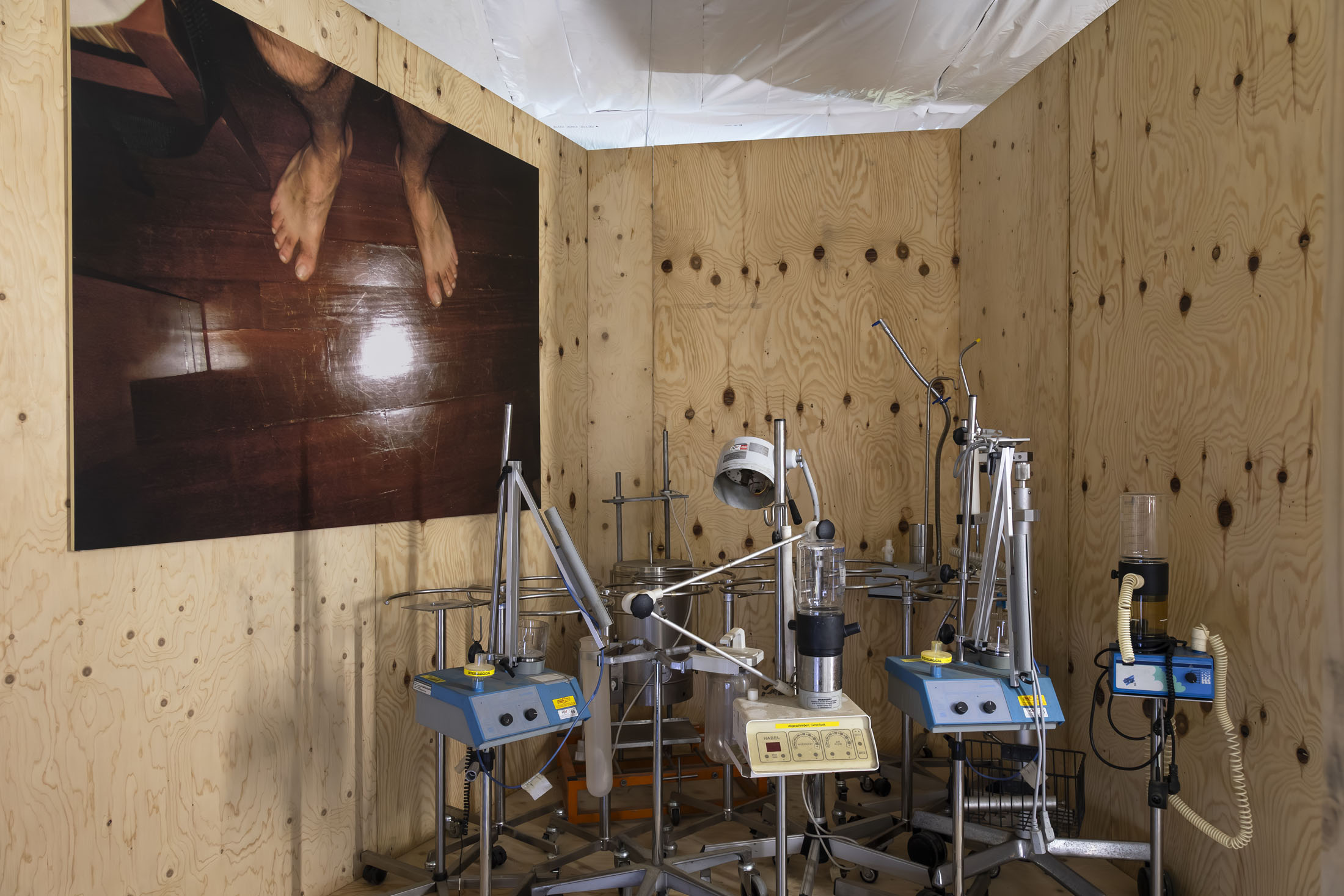 „NACH Christoph Schlingensief“ includes works from different creative periods. The installation „Der König wohnt in Mir“ (2008) incorporates six films and photographs from Kathmandu and Bhaktapur, taken in the winter of 2007/08, some during Hindu funeral rituals. In one of the films, the artist appears himself as part of the scene, highlighting the inseparability of observation and participation in the process of artistic intervention. The installation, designed as a treatment room, confronts visitors with themes of illness, mortality, and redemption.