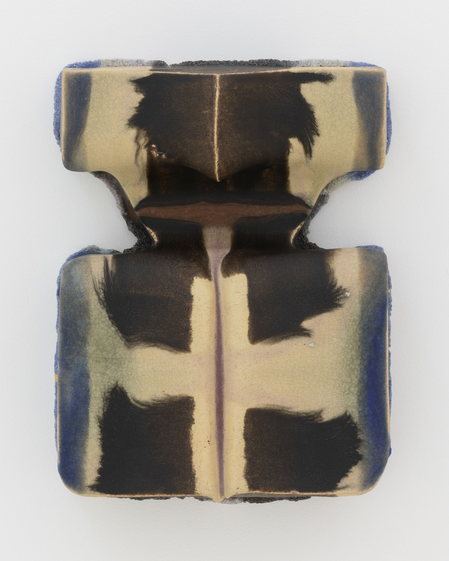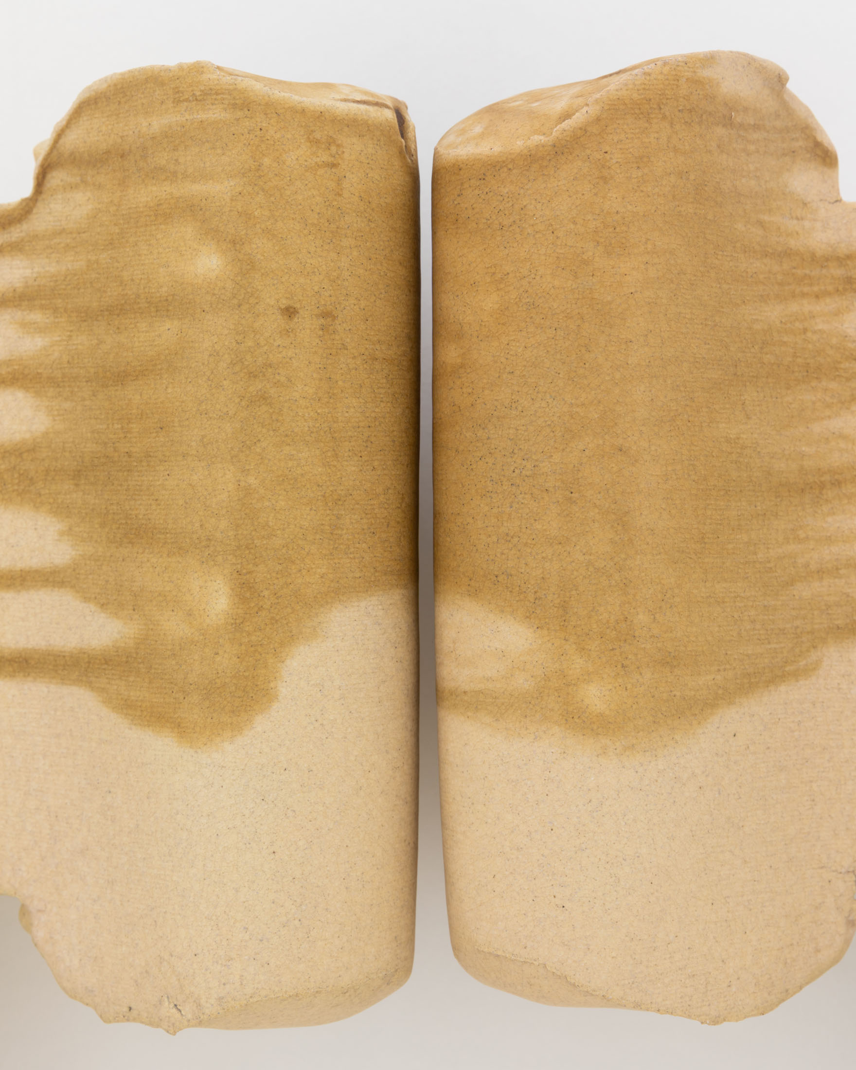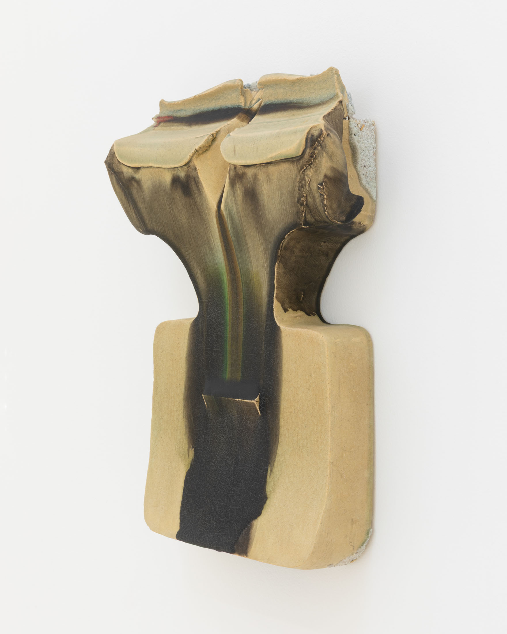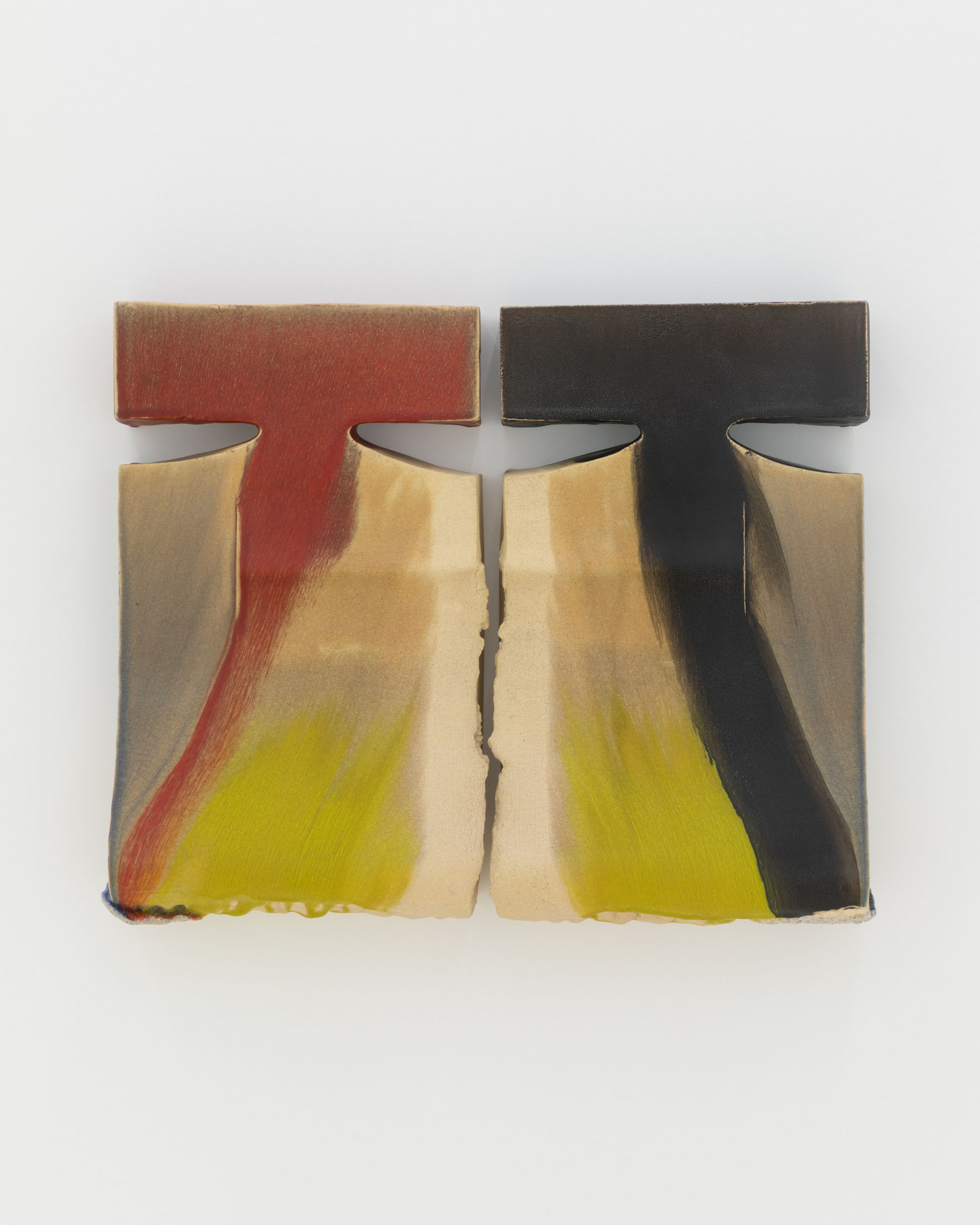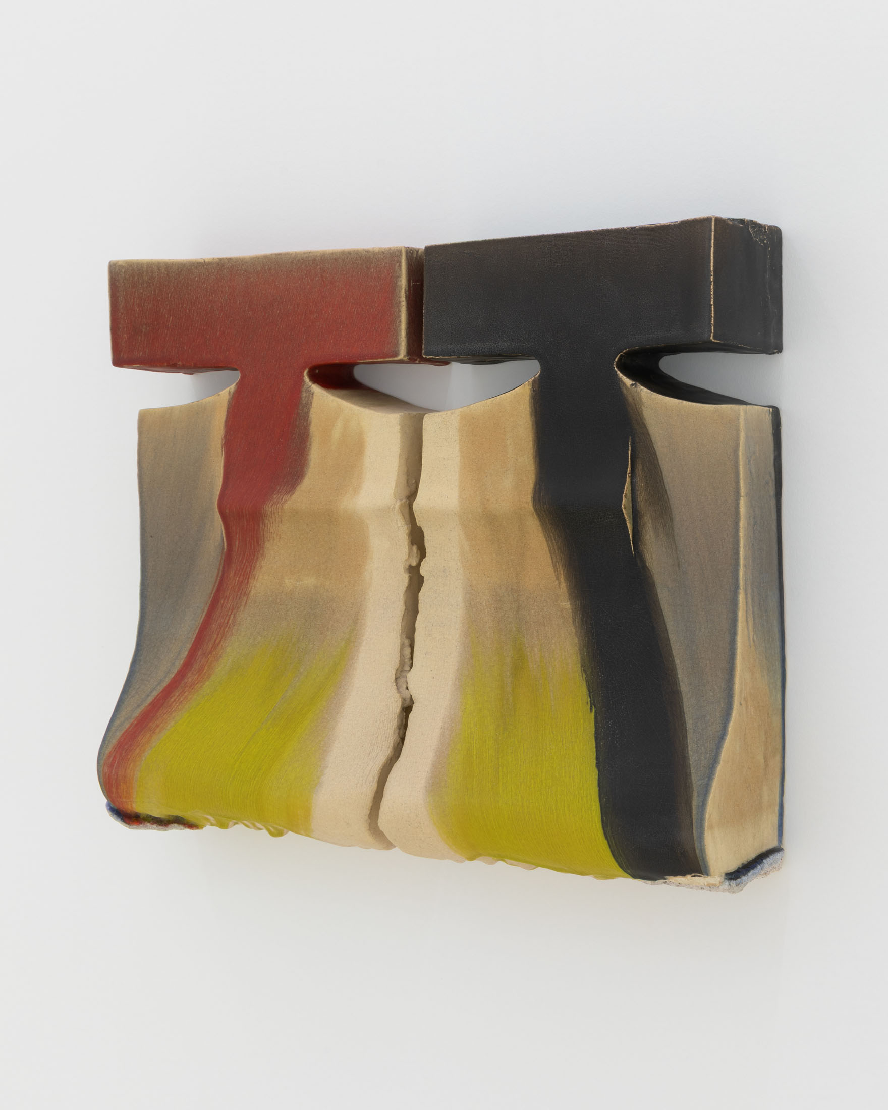 Life partners who have been collaborating together for almost a decade, Tyler Cross and Kyle Lypka make ceramic sculptures which are both freestanding and exist on the wall. The stark, if severe simplicity of what they create elegantly yields a multiplicity of allusions and significations. Loamy and alluvial, the work extends the sensuous line of the body over the rugged, coastal landscape of Northern California, as if the grainy complexion of the sculptures was buffeted smooth by the surf and wind. The formal silhouettes of the work, which are known to double or butterfly, teem with lexical, typographical, or heraldic evocations, bringing to mind an alien semiotics whose key has either been lost or has yet to be found.