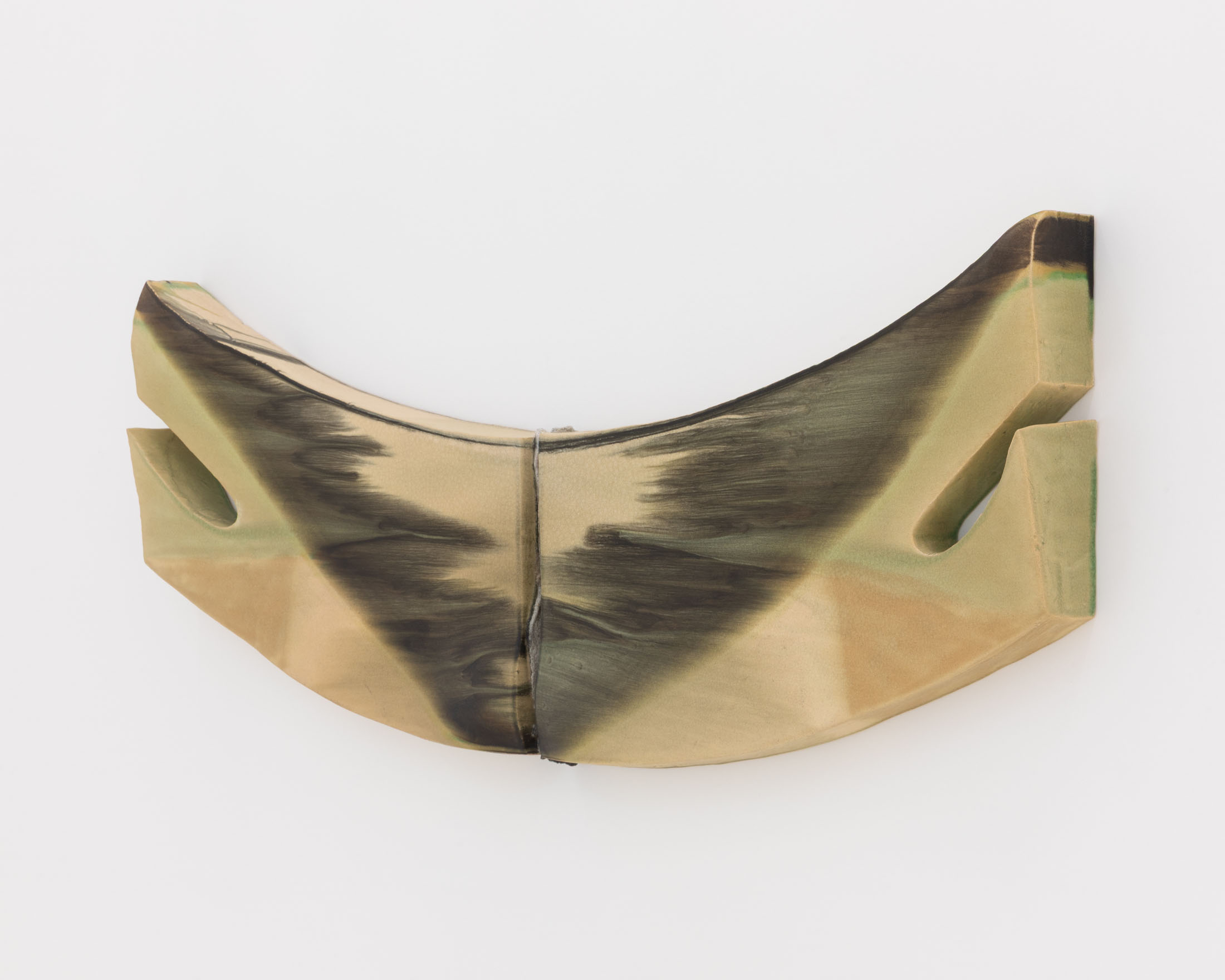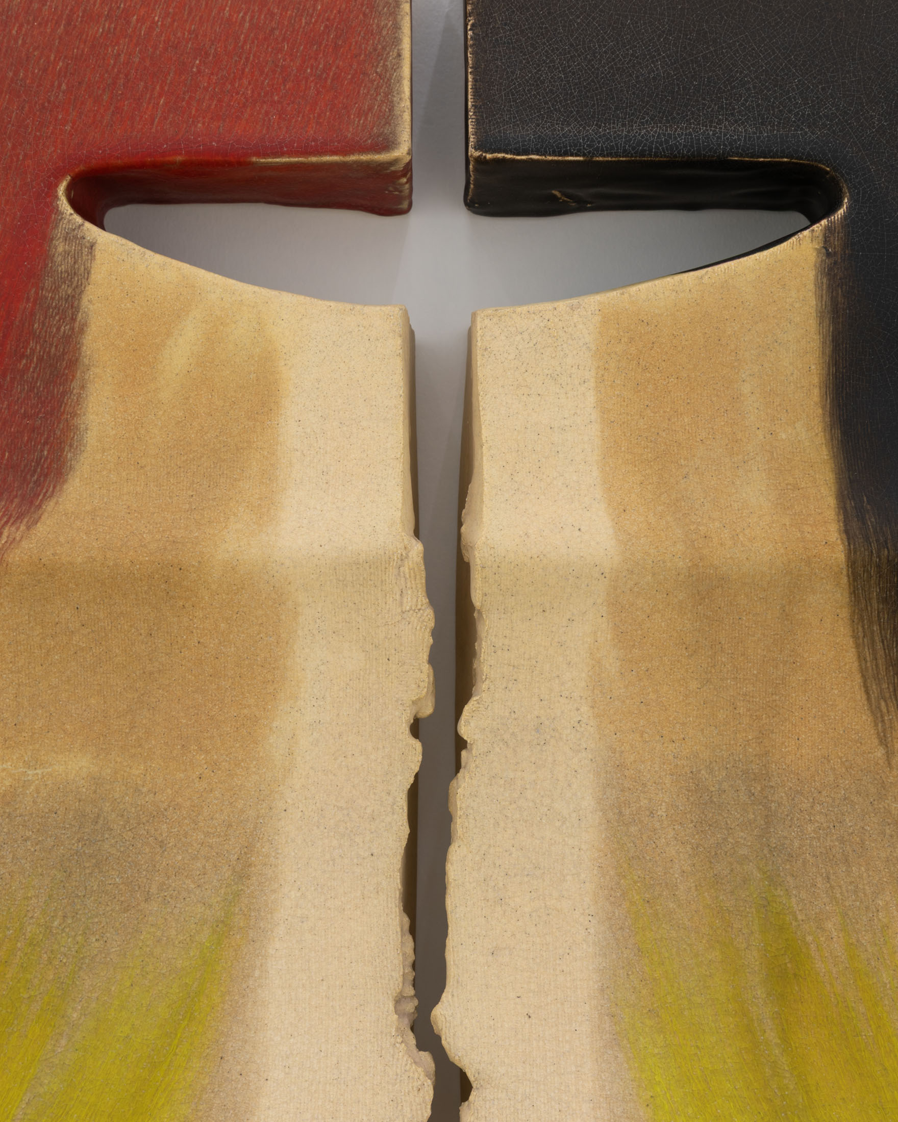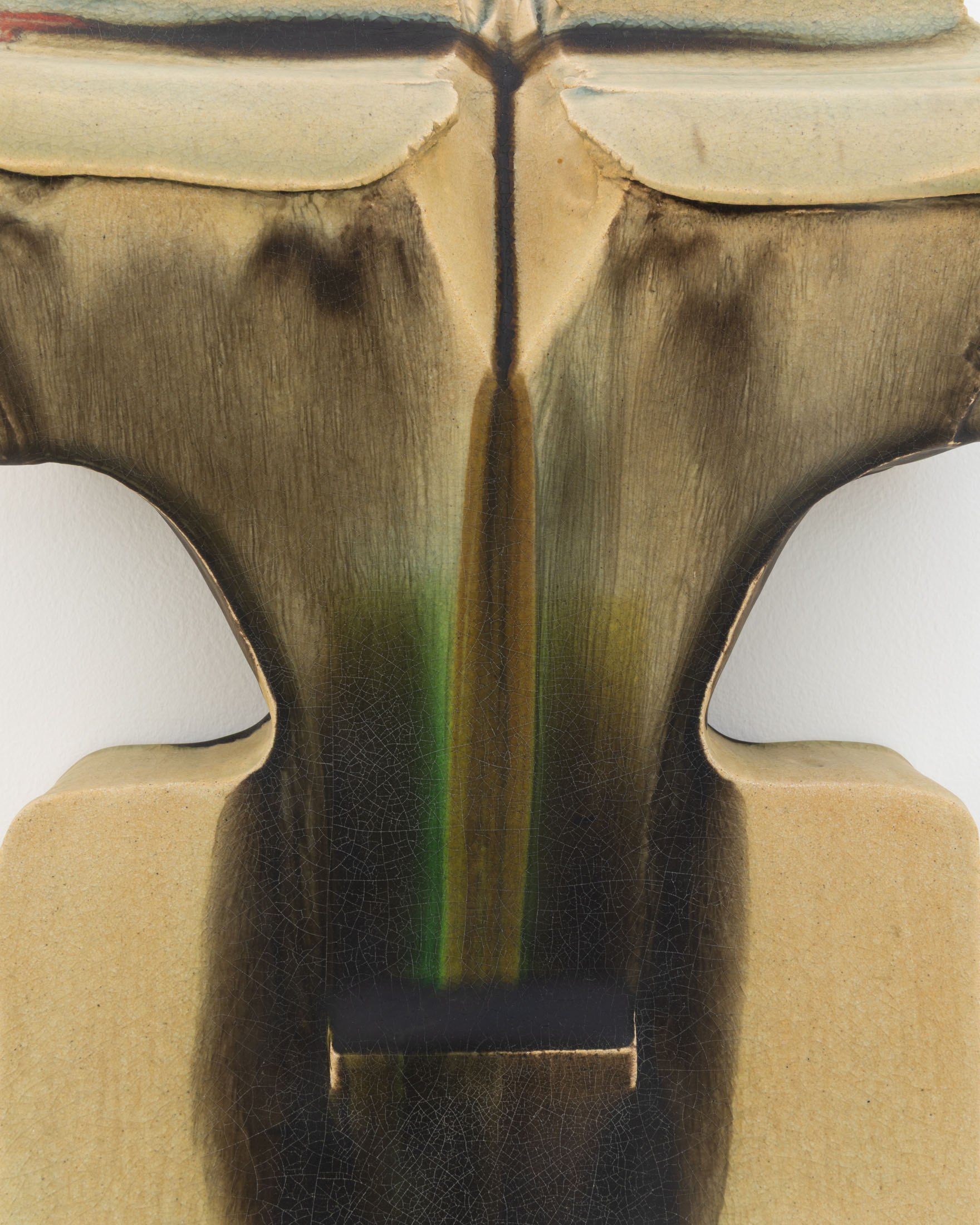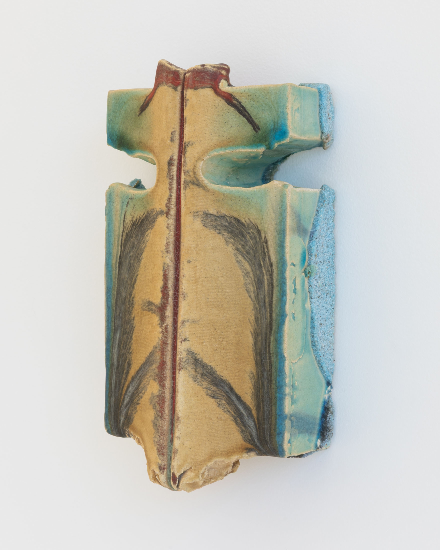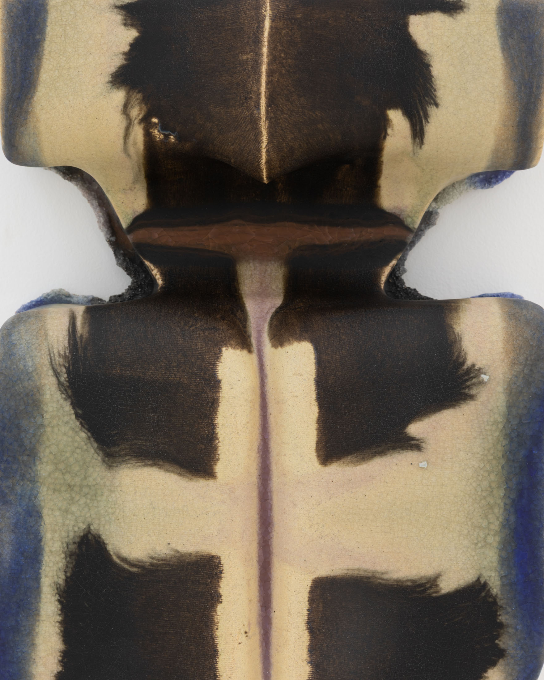 Life partners who have been collaborating together for almost a decade, Tyler Cross and Kyle Lypka make ceramic sculptures which are both freestanding and exist on the wall. The stark, if severe simplicity of what they create elegantly yields a multiplicity of allusions and significations. Loamy and alluvial, the work extends the sensuous line of the body over the rugged, coastal landscape of Northern California, as if the grainy complexion of the sculptures was buffeted smooth by the surf and wind. The formal silhouettes of the work, which are known to double or butterfly, teem with lexical, typographical, or heraldic evocations, bringing to mind an alien semiotics whose key has either been lost or has yet to be found.