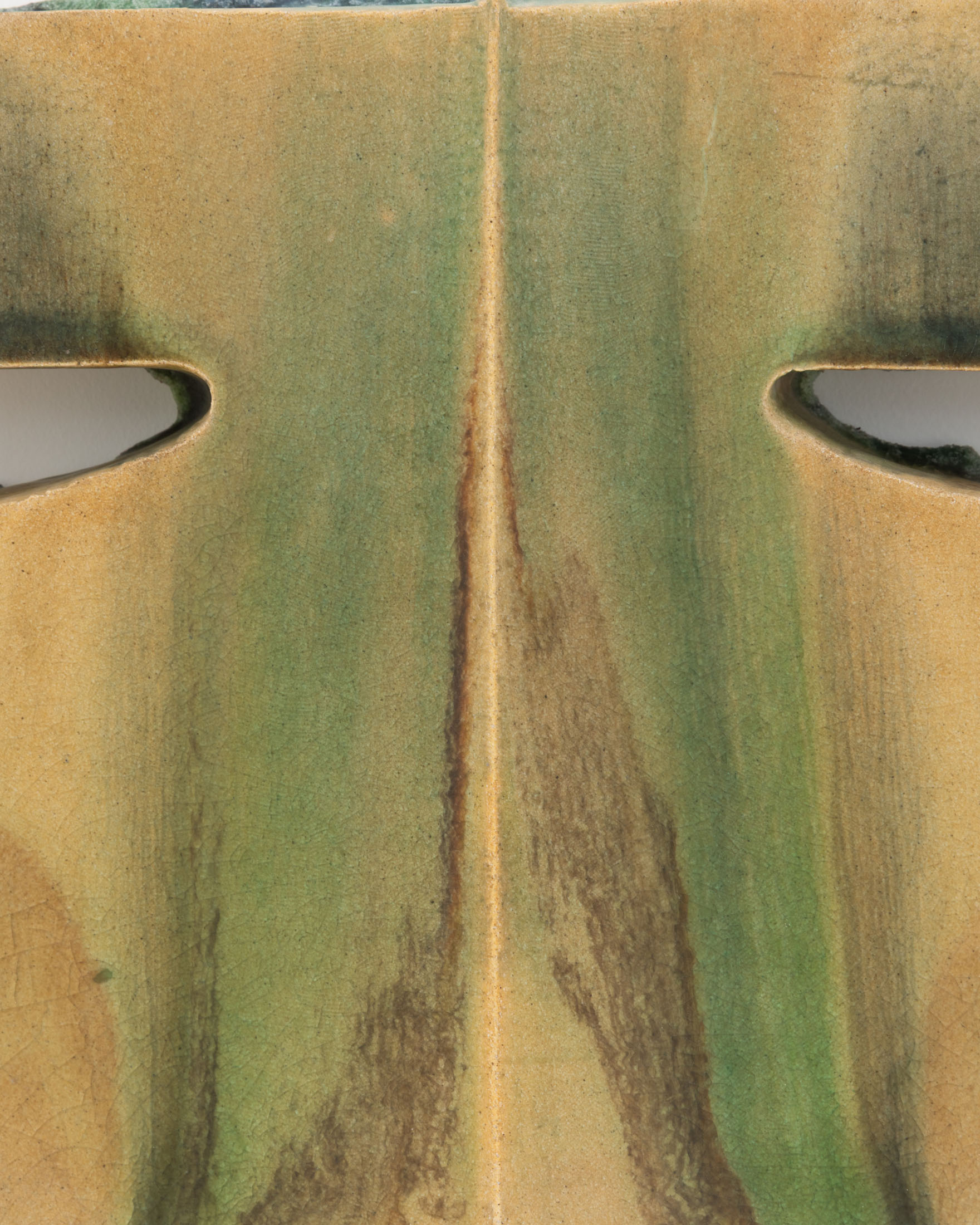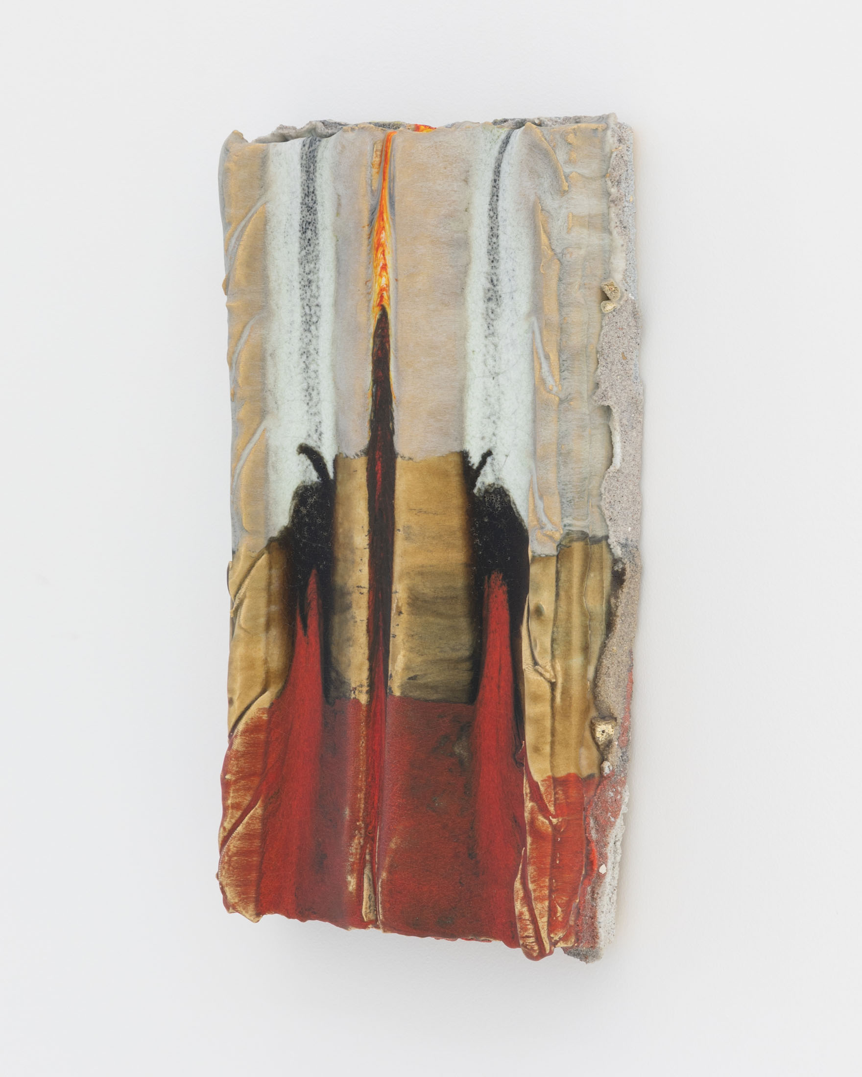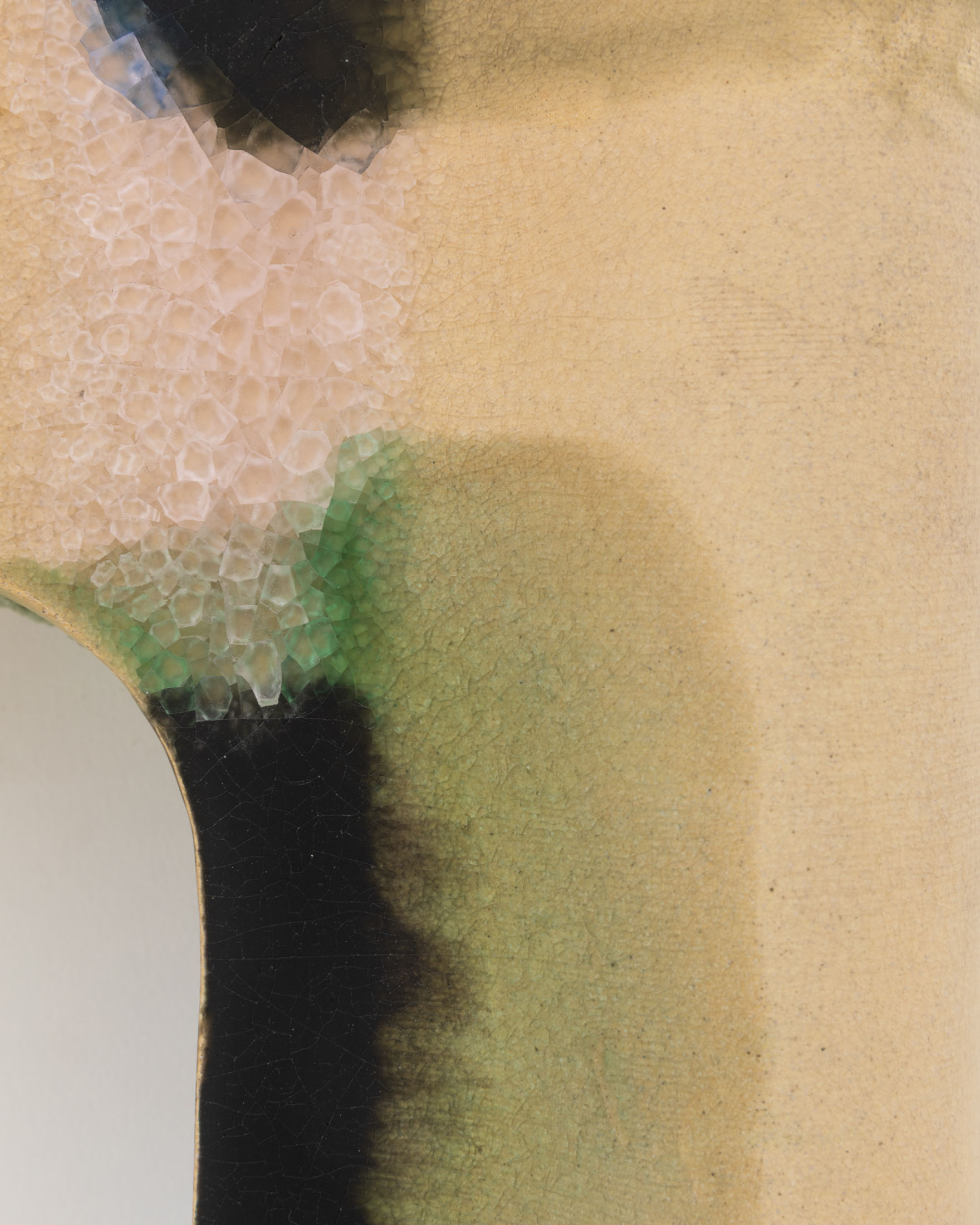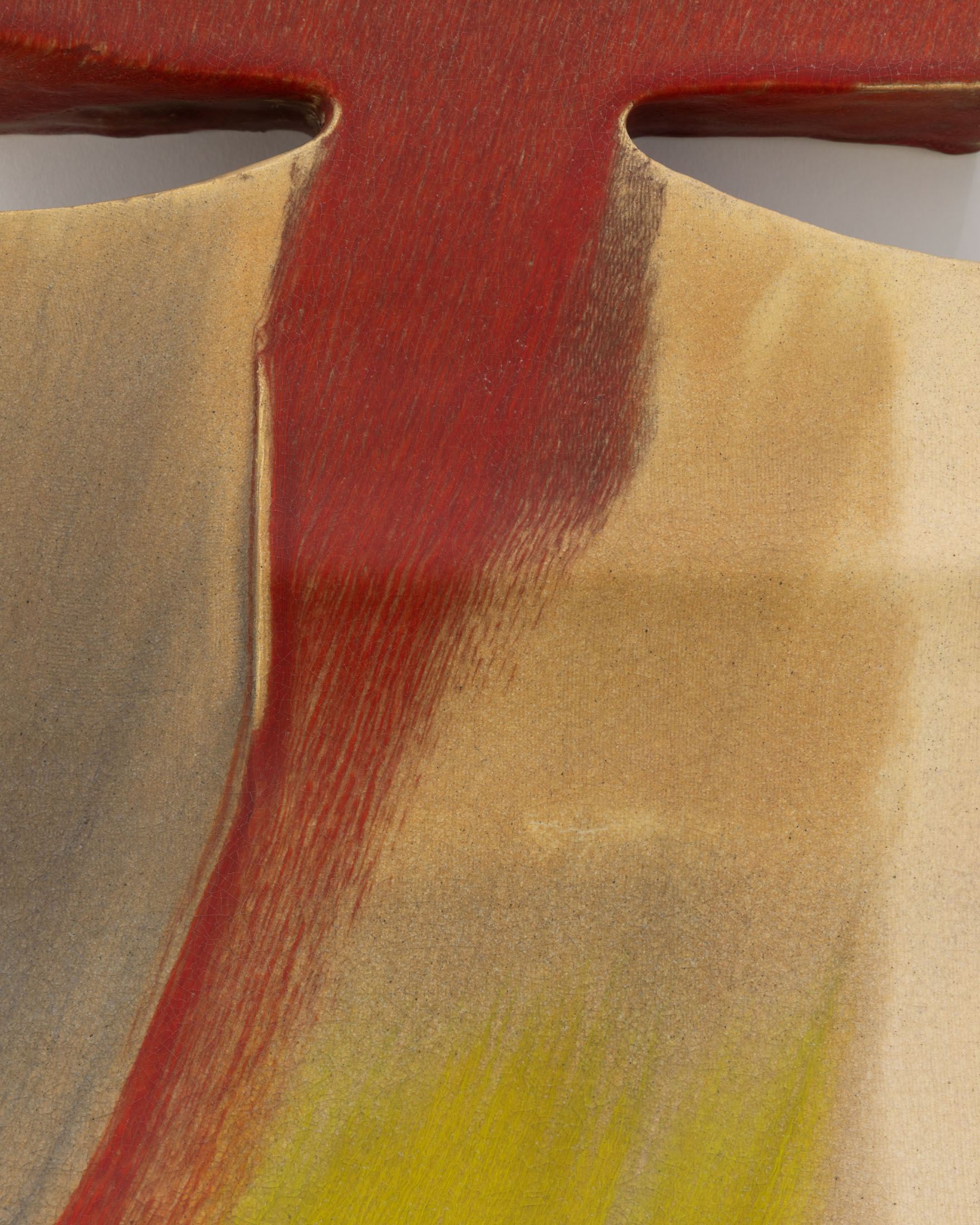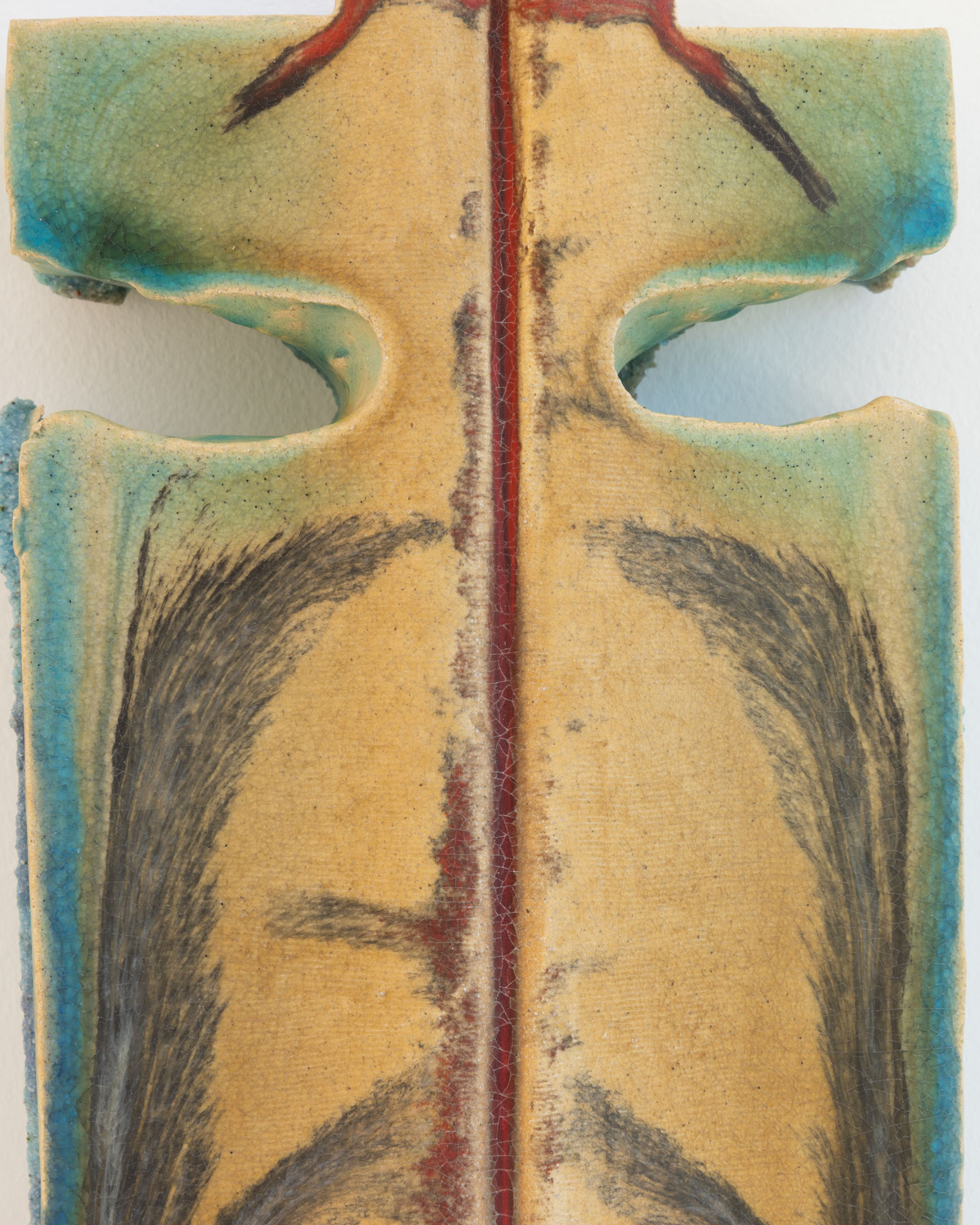 What they make is not foreign to Donald Judd’s notion of the “specific object.” Neither “painting nor sculpture,” but closely related to both, these objects are as pictorially entrancing as they are spatially compelling, to say nothing of the myriad subtleties that dwell on, within, and around them. Yet their so-called specific objecthood is compli-cated by the graphic nature of the fluid, if imperfect curvilinear contours which shape them– that which ultimately speaks to a starting point grounded in drawing. The glazes that both adorn and are indivisible from their surfaces are anything but excessive, but rather seem to have been reduced to their essence. Here color functions not so much as an embellishment but more as a trace or wash. For all its allusiveness, however, there is nothing coy about this work; its intentionality is as lucid as the occasionally cracked and transparent veneer of glass caked on and wedded to its forms.