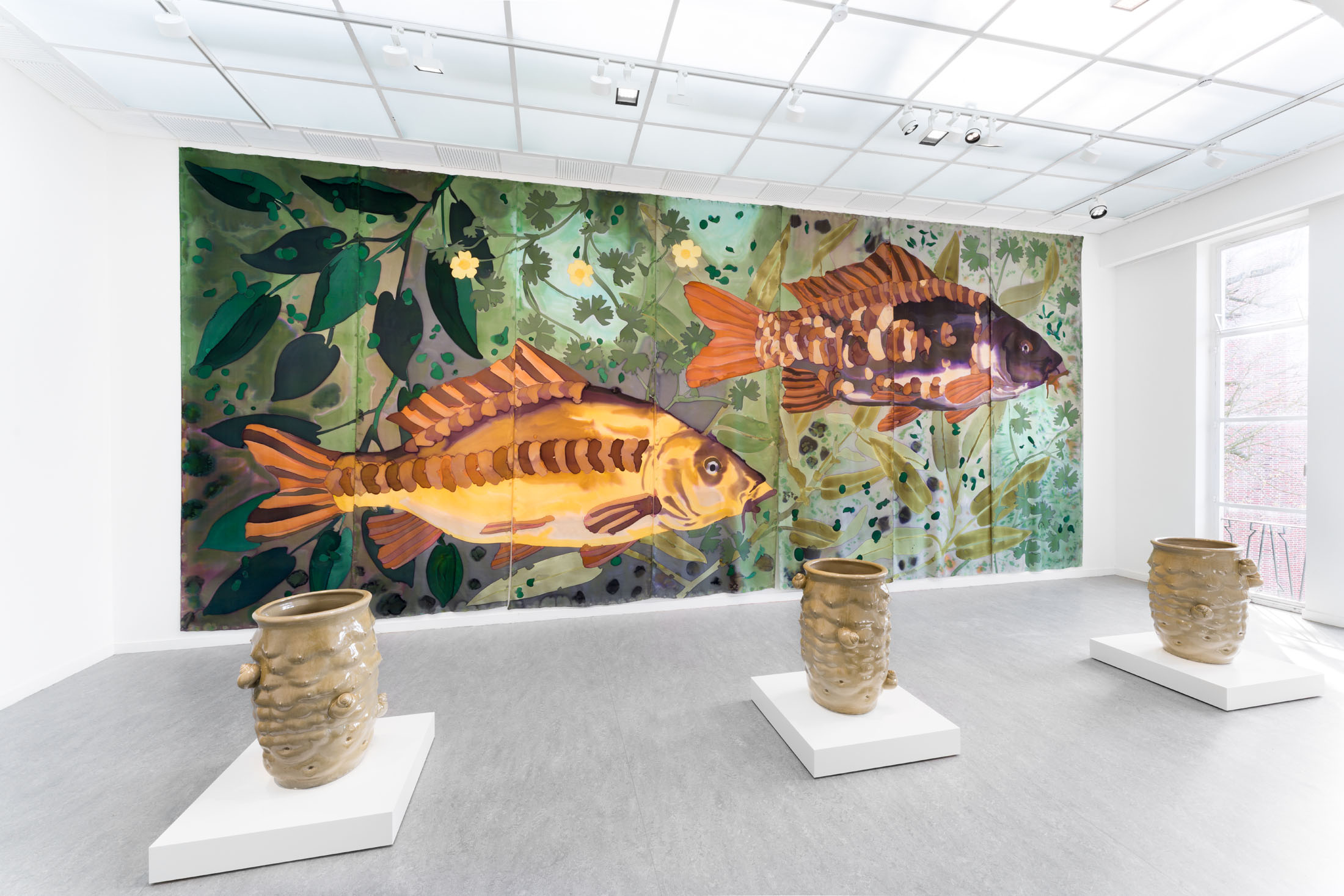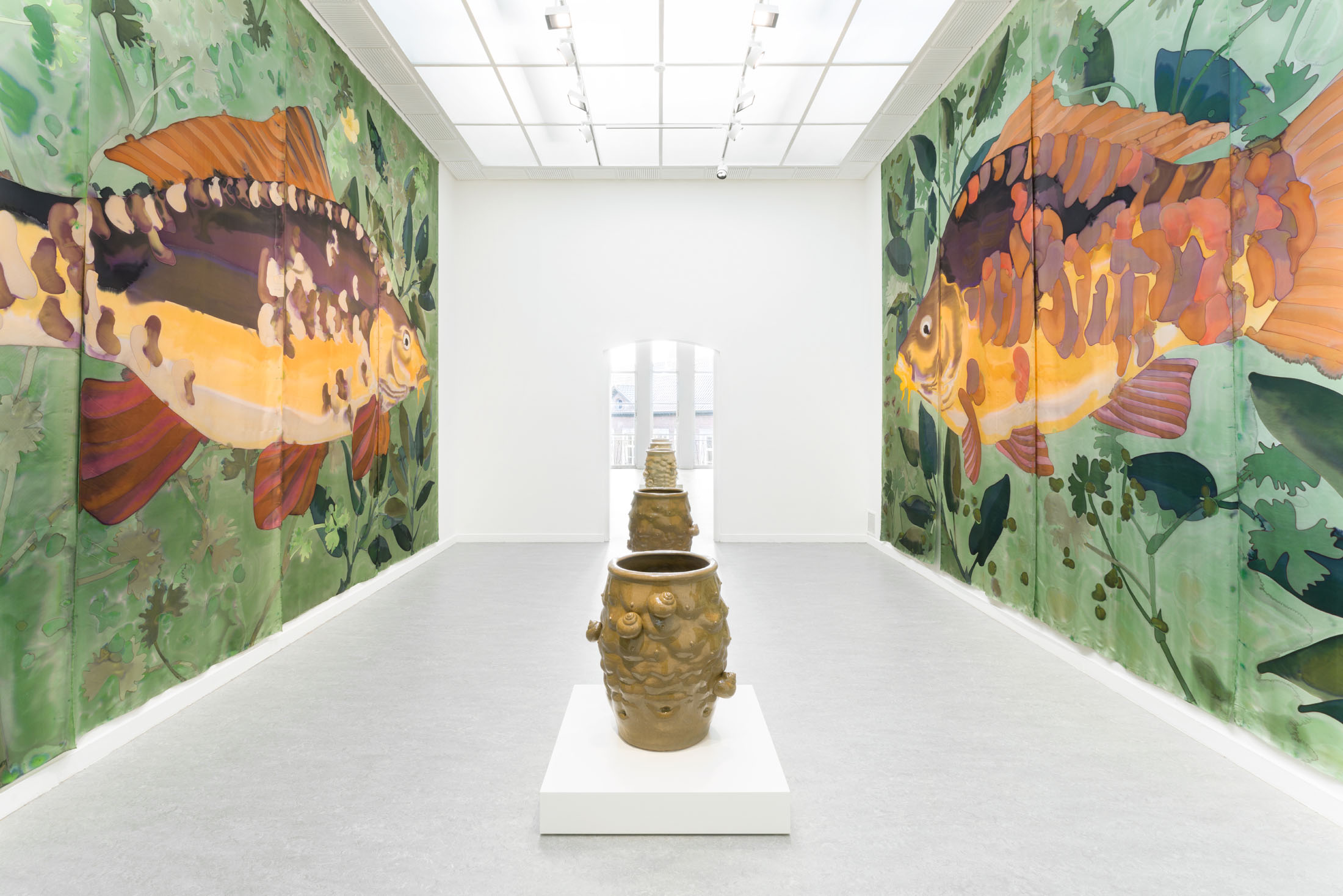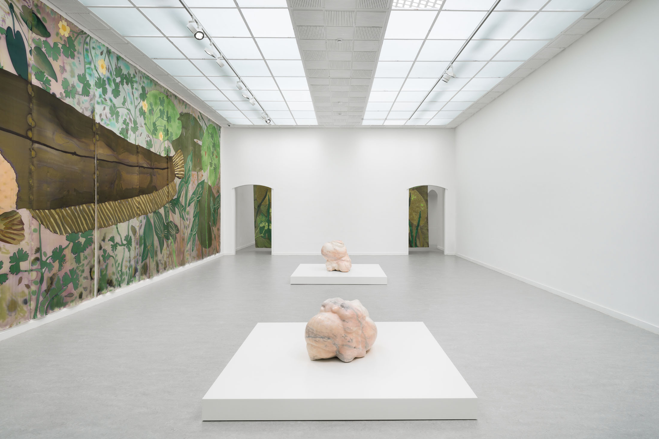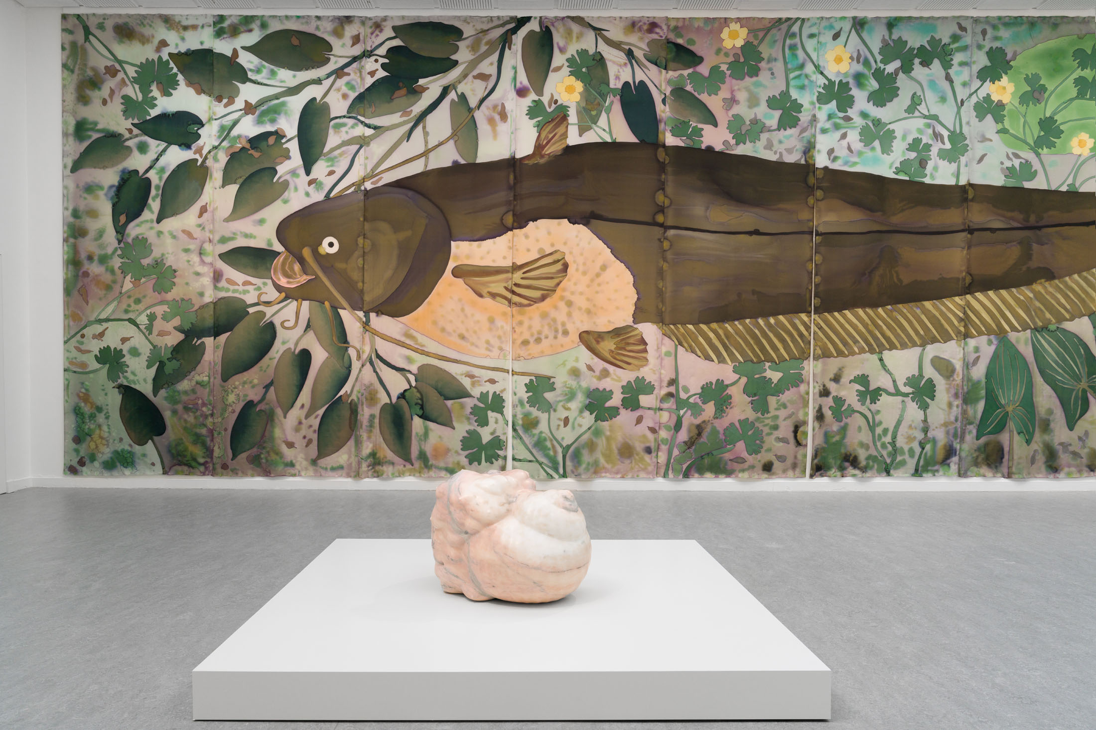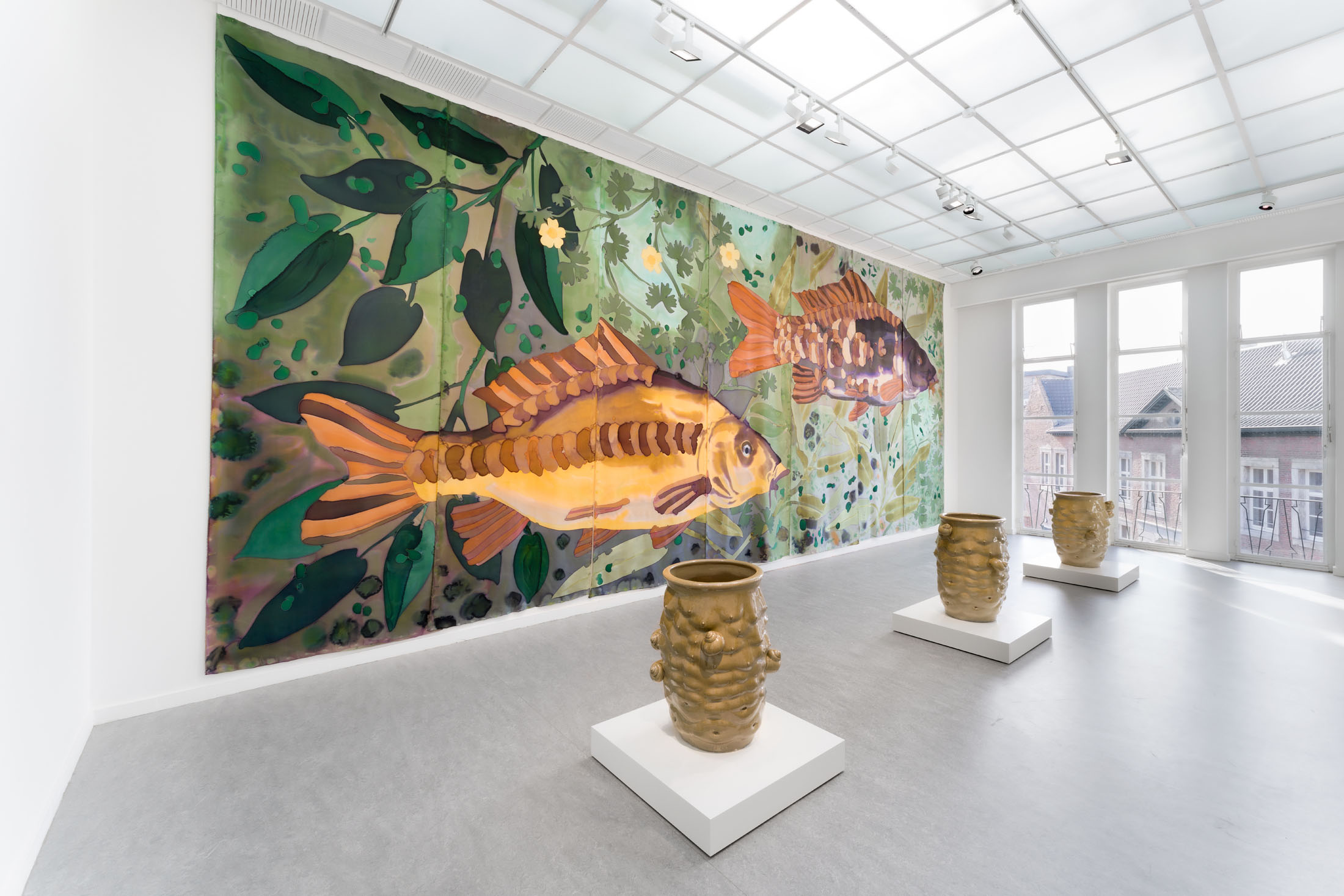 For their upcoming solo exhibition at Z33, Dewar and Gicquel are embarking on the production of a new monumental silk painting, which will stream through the five galleries of the historic Vleugel 58. For this epic painting, the duo have chosen to depict a river scene with freshwater fish. As companions to this immersive aquatic scene, Dewar and Gicquel will be presenting a new series of sculptures made of stoneware ceramics and pink marble.