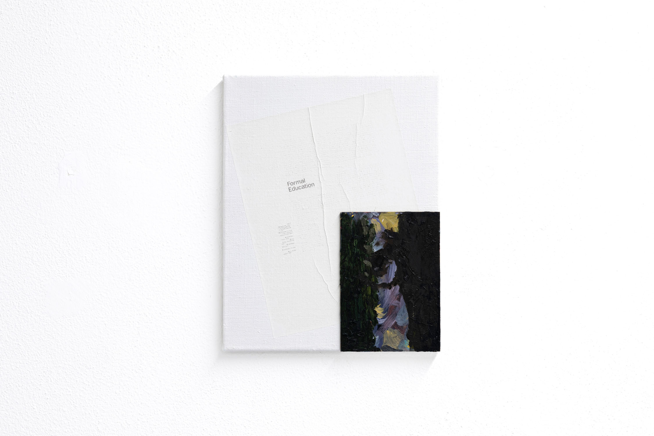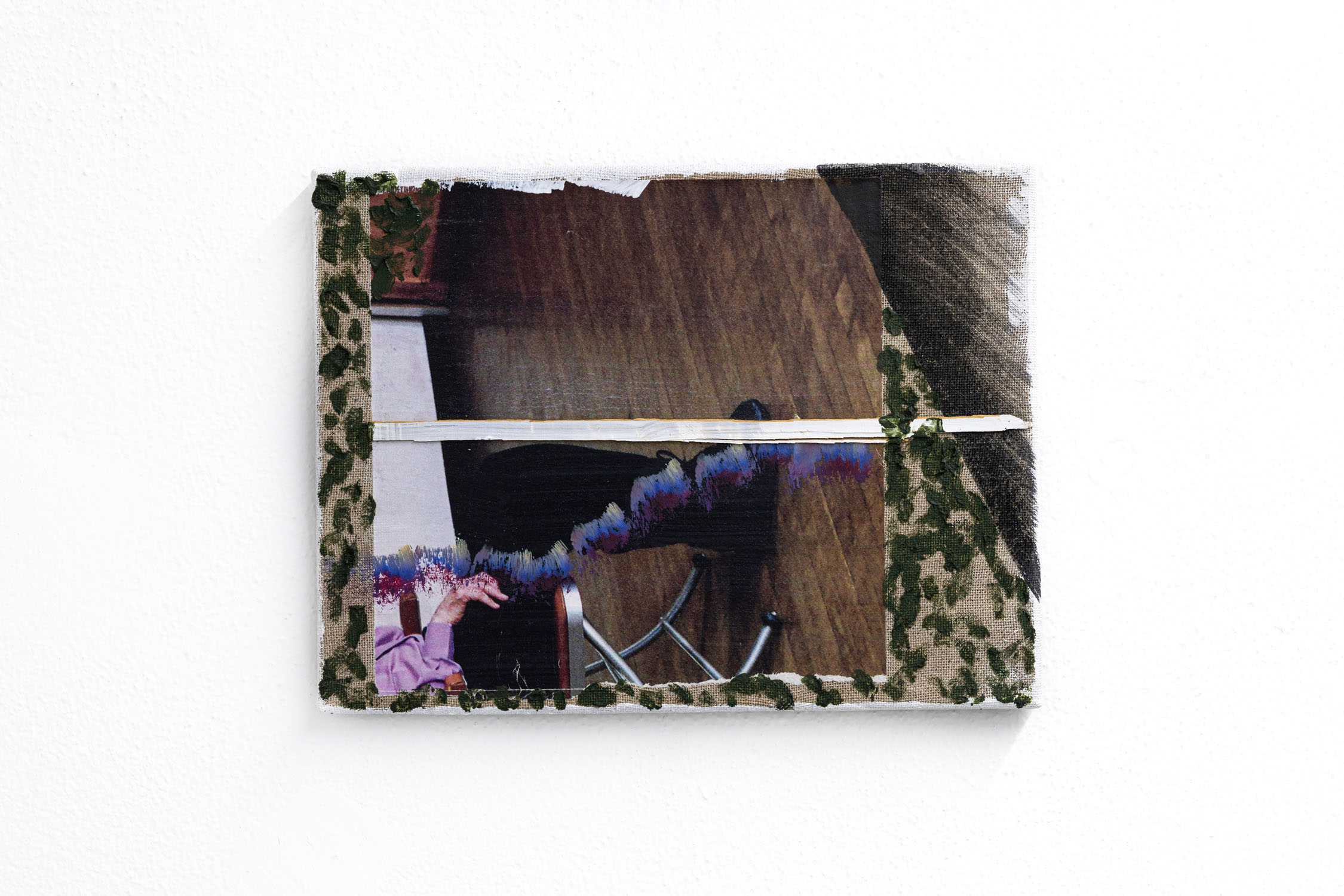 Obscuring areas by a white collar on a rolling chair. Title: The Dog With the Strongest Grip. Section around the man’s foot. Layering of paint above the photograph, with the found wood object. Paint, found object, photograph, paint. Four layers. Bureaucratic office space. Do you remember the Soviet Union folder? Gripping the side of the chair. “From afar it’s a very formal abstract painting.” The man wears a proper shirt. Vertebrae. The uncomfortable position of sitting all day on a chair. Hands like the head of a peacock or pink flamingo.