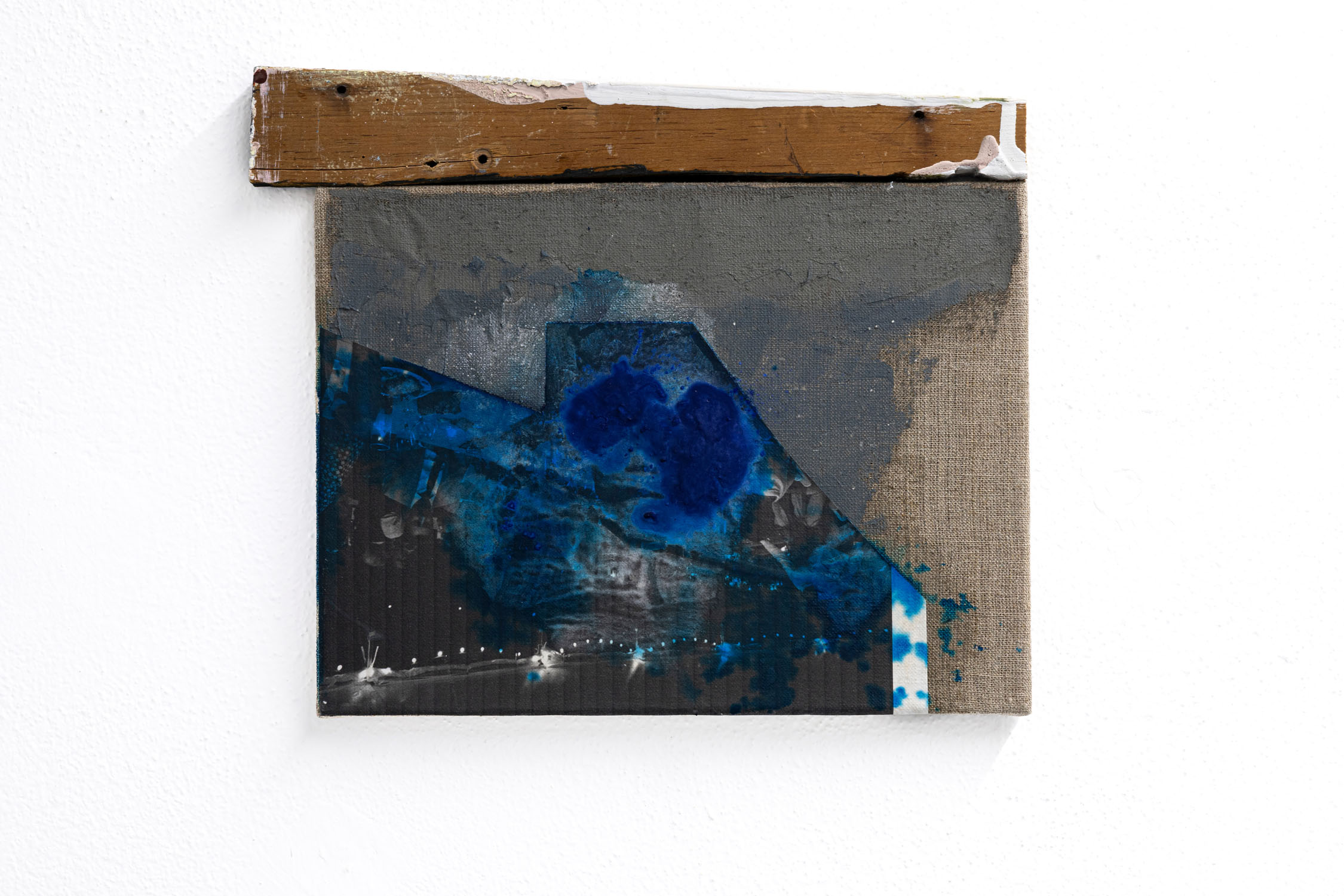 The blue with the stick on the edge. A radiography. If you turn it upside down you can see the lighting of a party. And figures of people at the party. Dan took that photo at a friend’s wedding. Blue and white interact. It’s about a painting process reversing into a photographic one. “The blue pigment is a precious one. It’s about purity. Not being affected by other paintings.” The image has a pregnant woman turned upside down, obscured by the blue pigment. Renaissance Venetian Madonna. Dots evoking lights, or stars in a Medieval baptistery chapel. The stick addresses perspective. Wood adds a feeling of contractive space. Painting, operations. Architecture is like love, which is a big construction based on words. Architecture is like love and art.