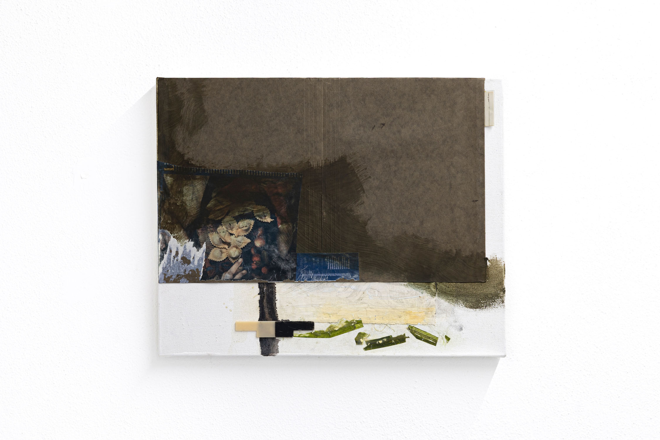 Soviet Union era found folder with plastic elements. References to Jasmine Gregory on American excess. “We make fun of the puerilism of the American political system.” A stupid article about the birth of tortellini in Italy. Found image glued and overpainted in Leonardo’s sfumato style (obviously for an American audience). Tortellini tourism. Title: Tortellini. Plastic elements are also found objects. Enigmatic objects, black and white. He found them on the sidewalk while walking. They’re glued over the oil painting (reversed from the image of the tortellini). It has the look of pasta… industrial tortellini. You don’t know what is inside the folder, but below the folder is a layer of oil painting from another canvas. “Green parts as green onions to be cooked, somewhere.”