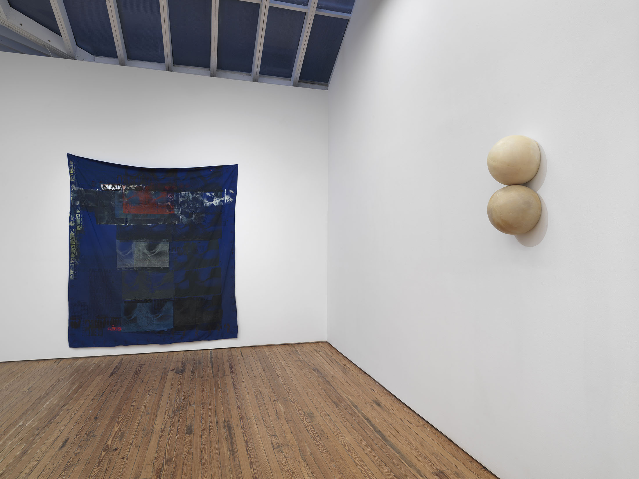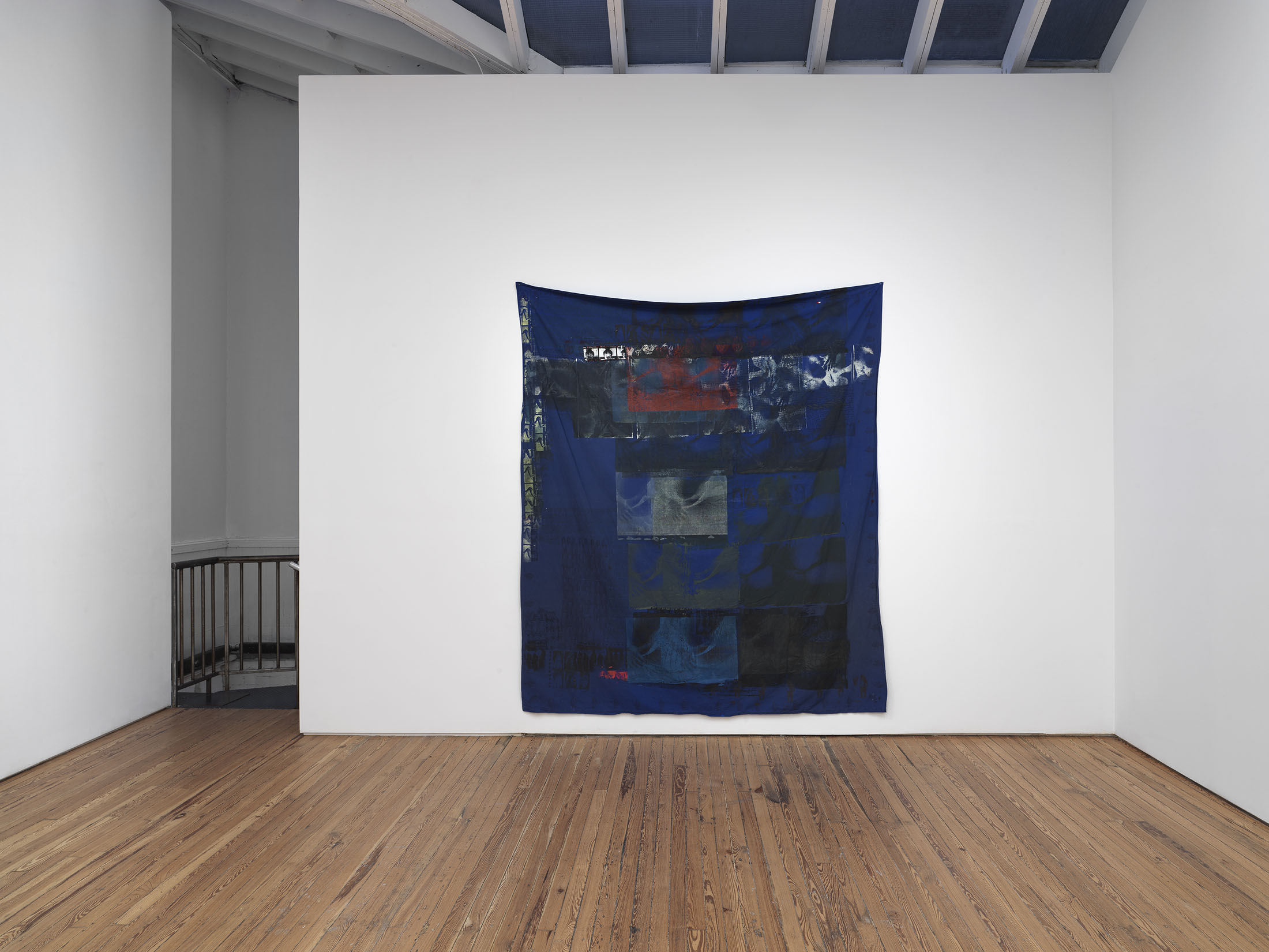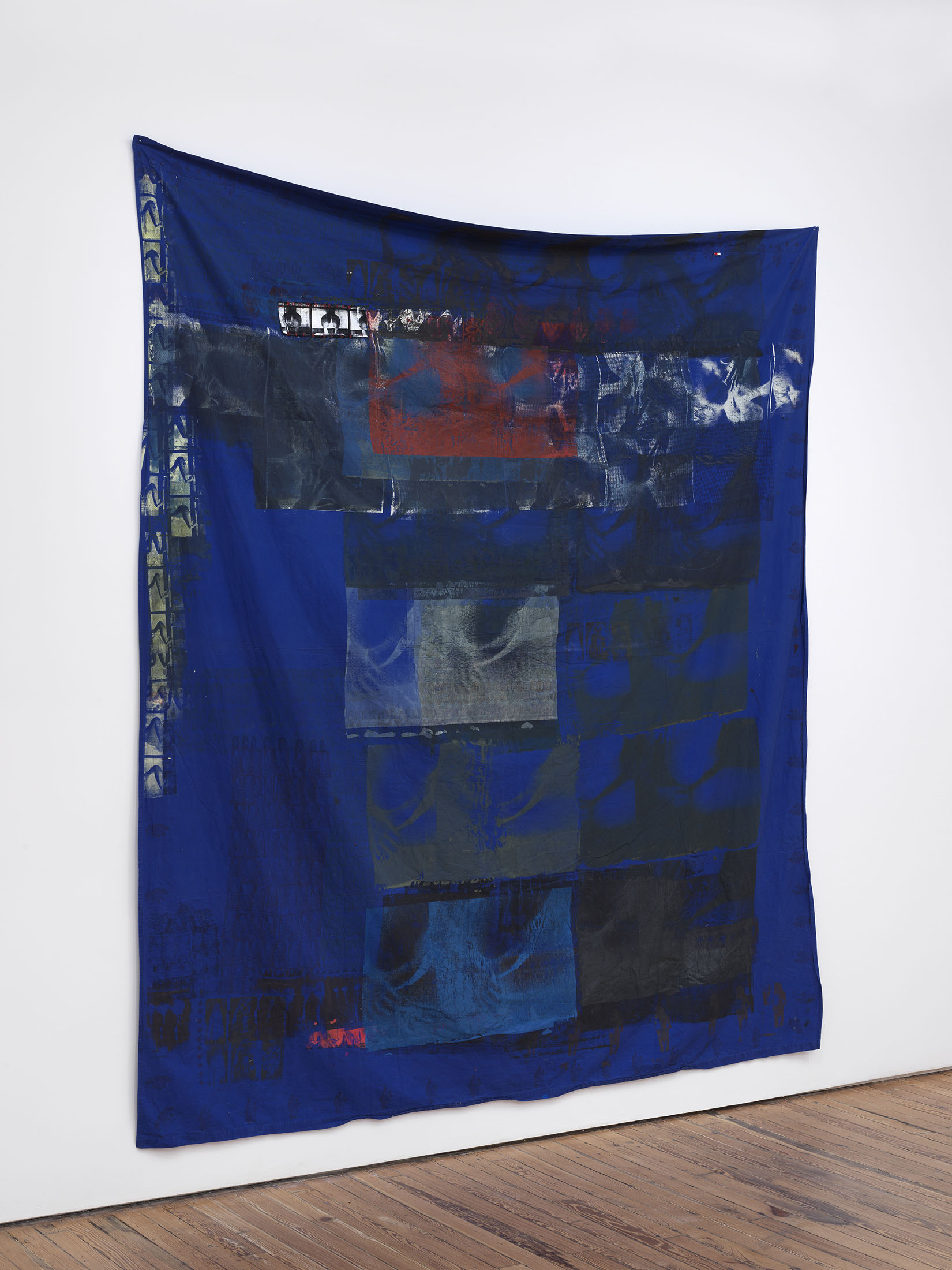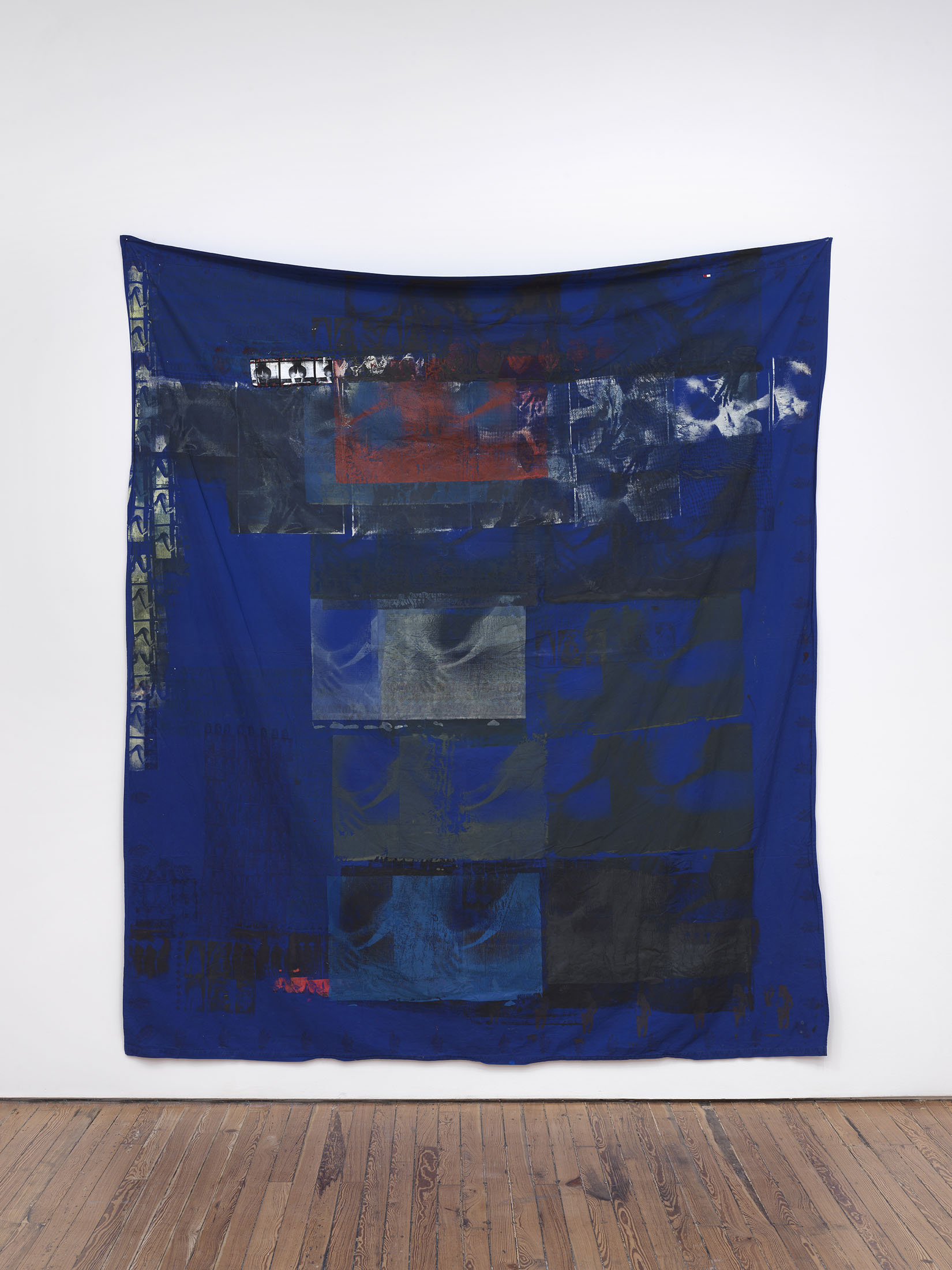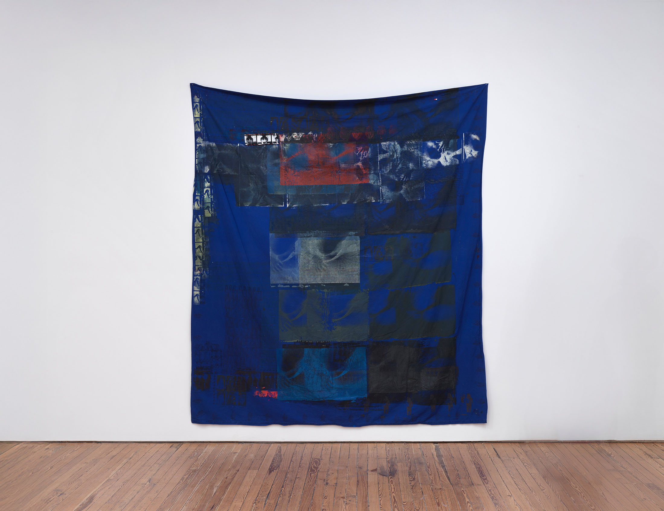 Materiality is unstable. The site stains, absorbs, and memory are woven into the fiber. Bedsheets from hotels and home, altered by block print and silk-screened stills, pornographic fragments. Each work is named for its origin: stark white cotton, Premiere Inn; crisp blue, 13 Gairloch Road. Anatomy and fabric double as setting and script, monuments to choreography that lingers in the mind. Tattoos surface as relics, performance, and labor etched over time. The body is a workplace, transaction, living archive.