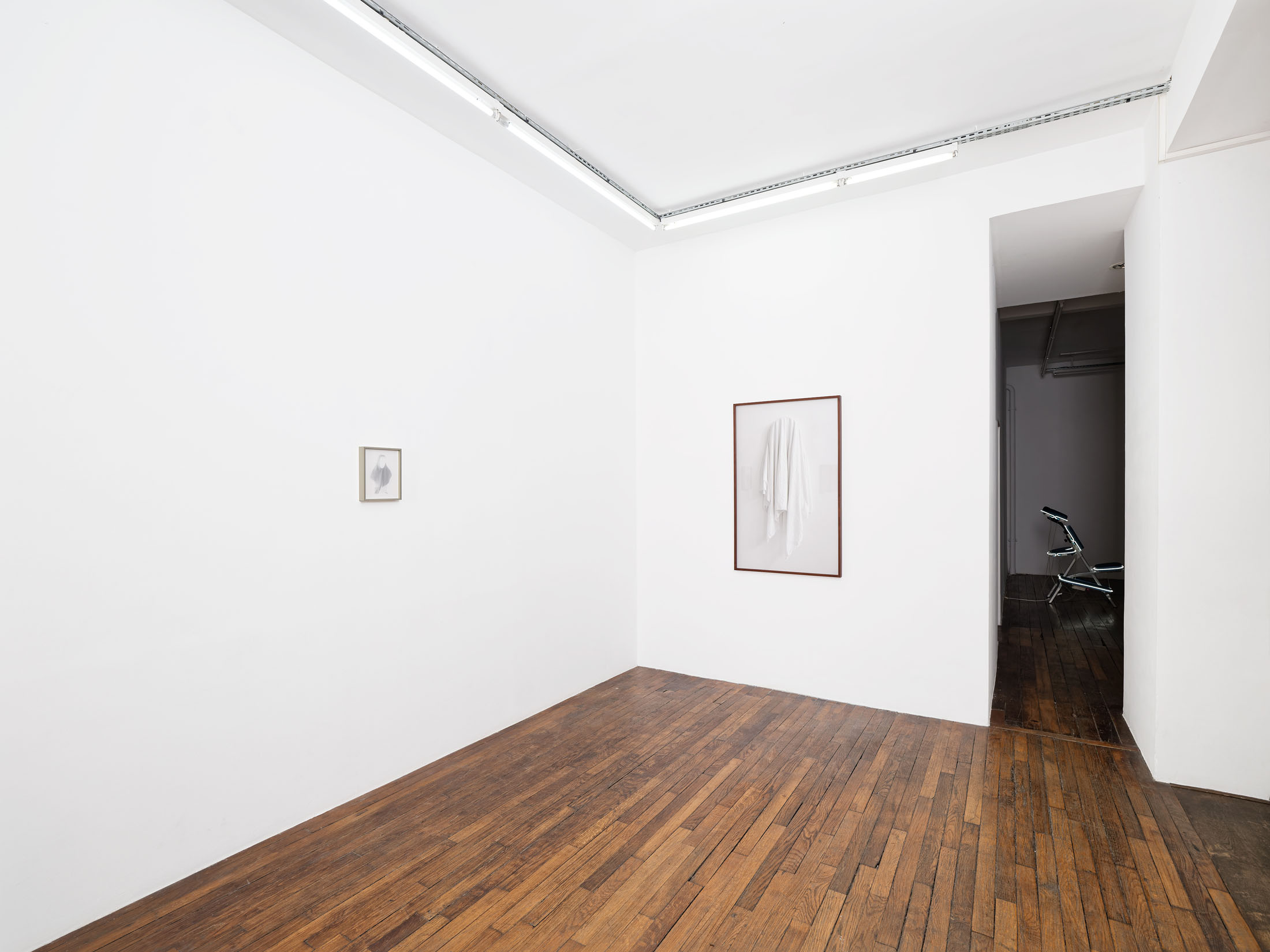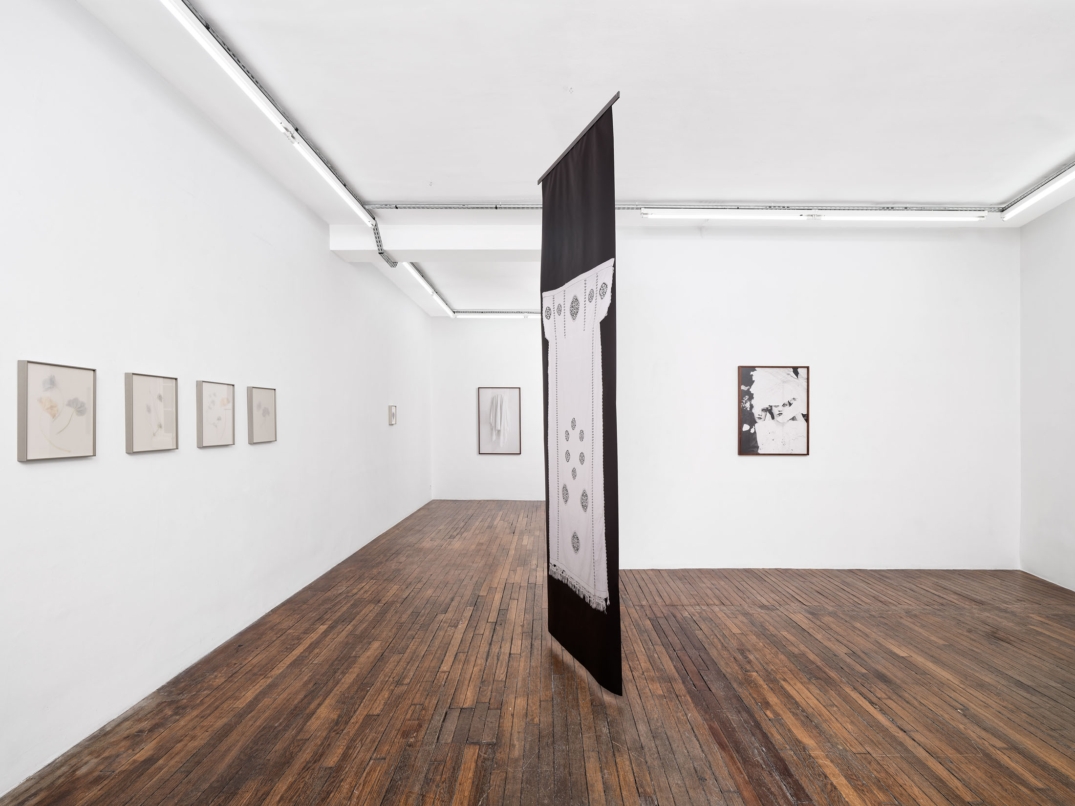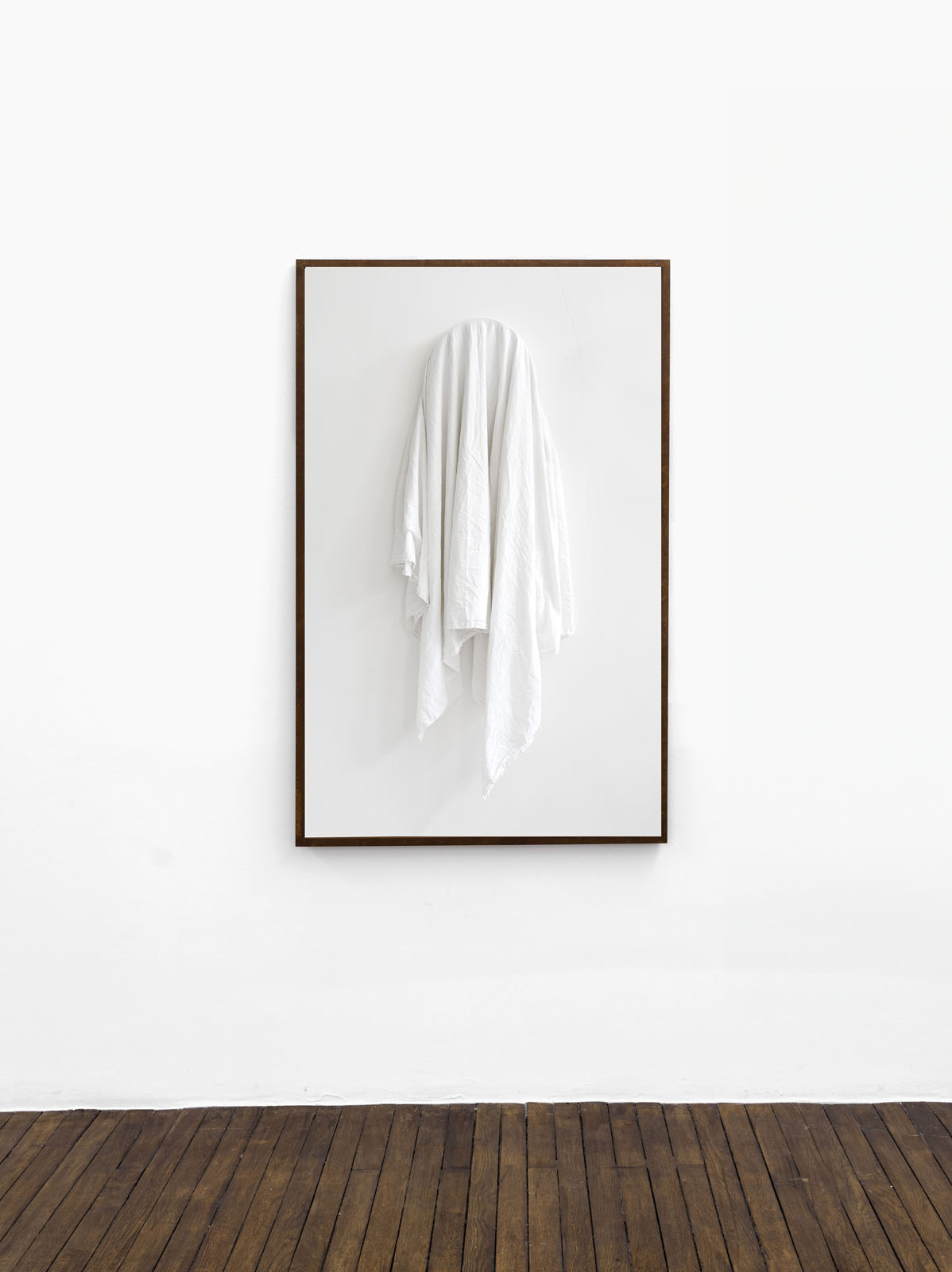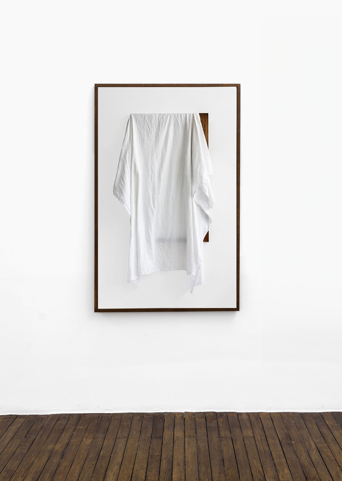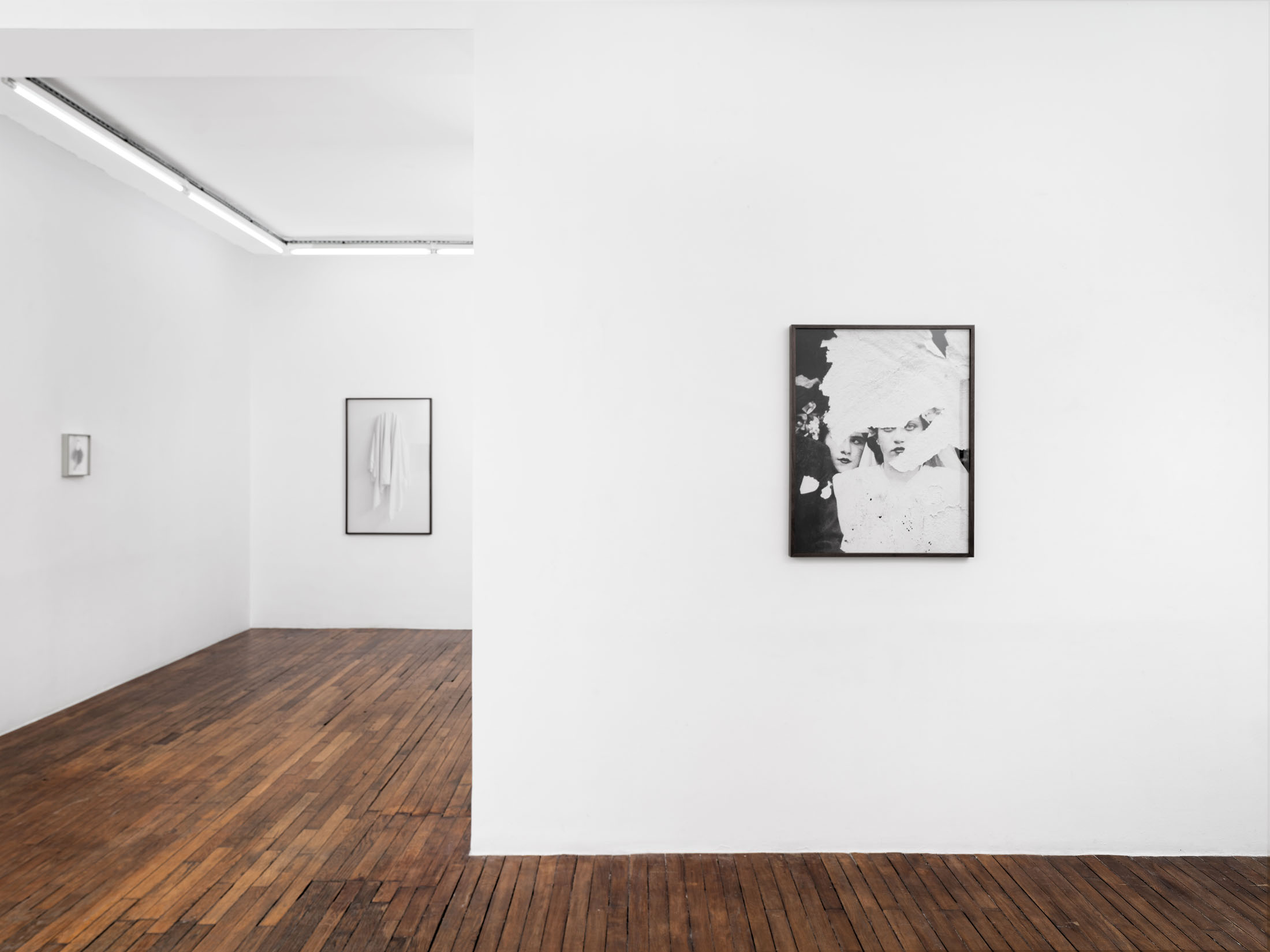 In a new series, Guez returns to a tradition practiced in his father’s family, some of whom migrated to France from Tunisia after it was occupied by the Nazis. Photographs depict mirrors draped in white cloth—a gesture shared across cultures as a sign of mourning, sanctity, or transition. In Judaism, as in other traditions, covering can signify grief but also reverence. The veiled mirrors suggest an image that is simultaneously hidden and heightened; absence becomes a presence of its own.