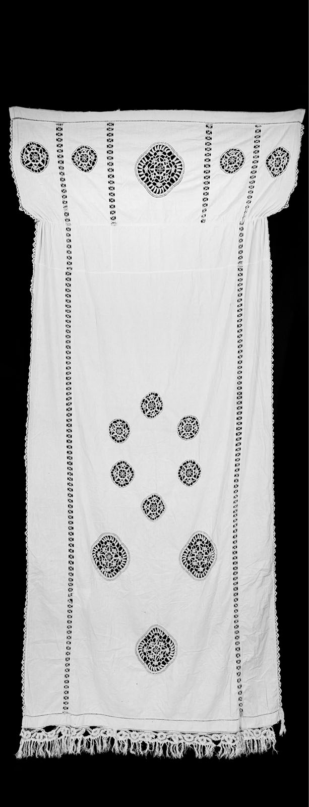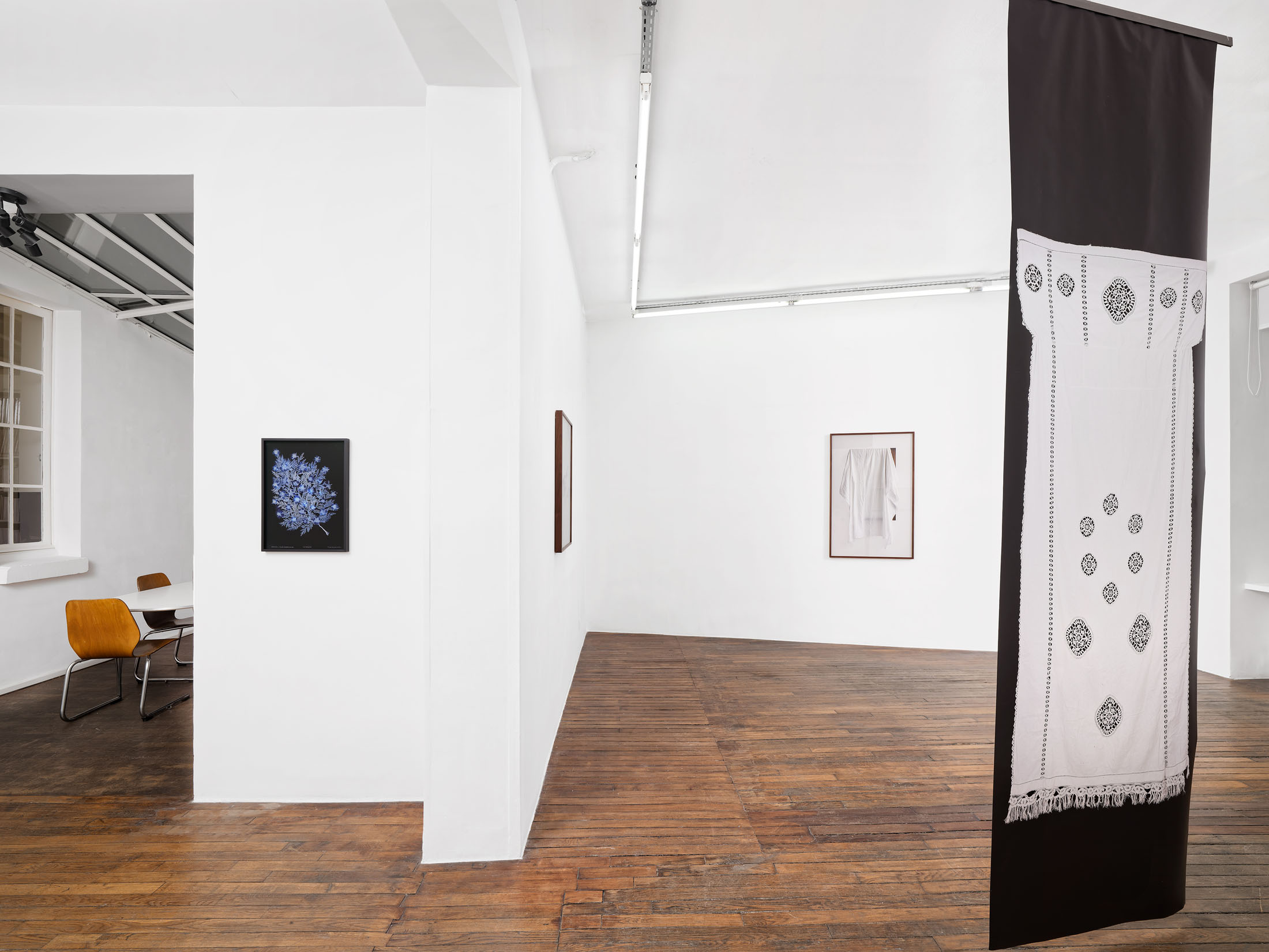 Paper, for Guez, has never been neutral. It holds, it breaks, it carries, it fails. This logic continues in a sculptural photograph suspended from the ceiling: a printed image of a lace curtain once handmade by his grandmother. This curtain, one of the few objects salvaged from the family’s home before their displacement, becomes a poignant trace of what endures. Suspended in space, it becomes a membrane—between interior and exterior, memory and forgetting, visibility and obscurity.