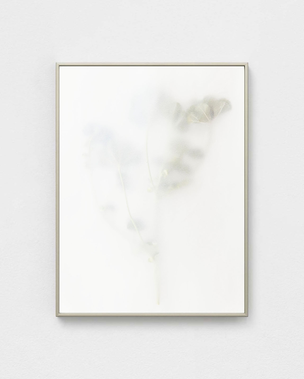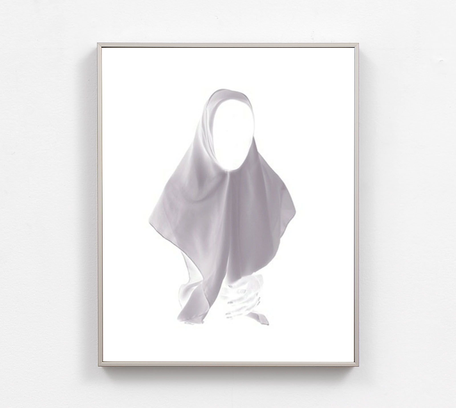 Another new work in the exhibition is based on a portrait of a Palestinian woman, a friend of the artist, photographed twenty years ago in Jerusalem. Her figure oscillates between common imagery of mourning and the iconic depiction of the Virgin Mary as a grieving mother. The photograph is printed as is, as a negative, on a transparent surface, allowing light to pass through and cast a shadow onto a smooth archival paper beneath. Her silhouette undergoes a doubling, shifting from a negative image to a shadow—existing on the boundary between presence and trace, visible and invisible.