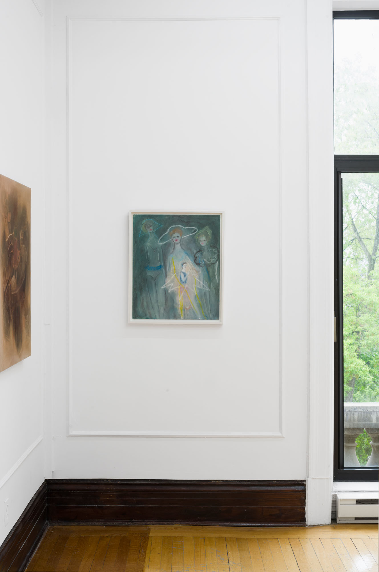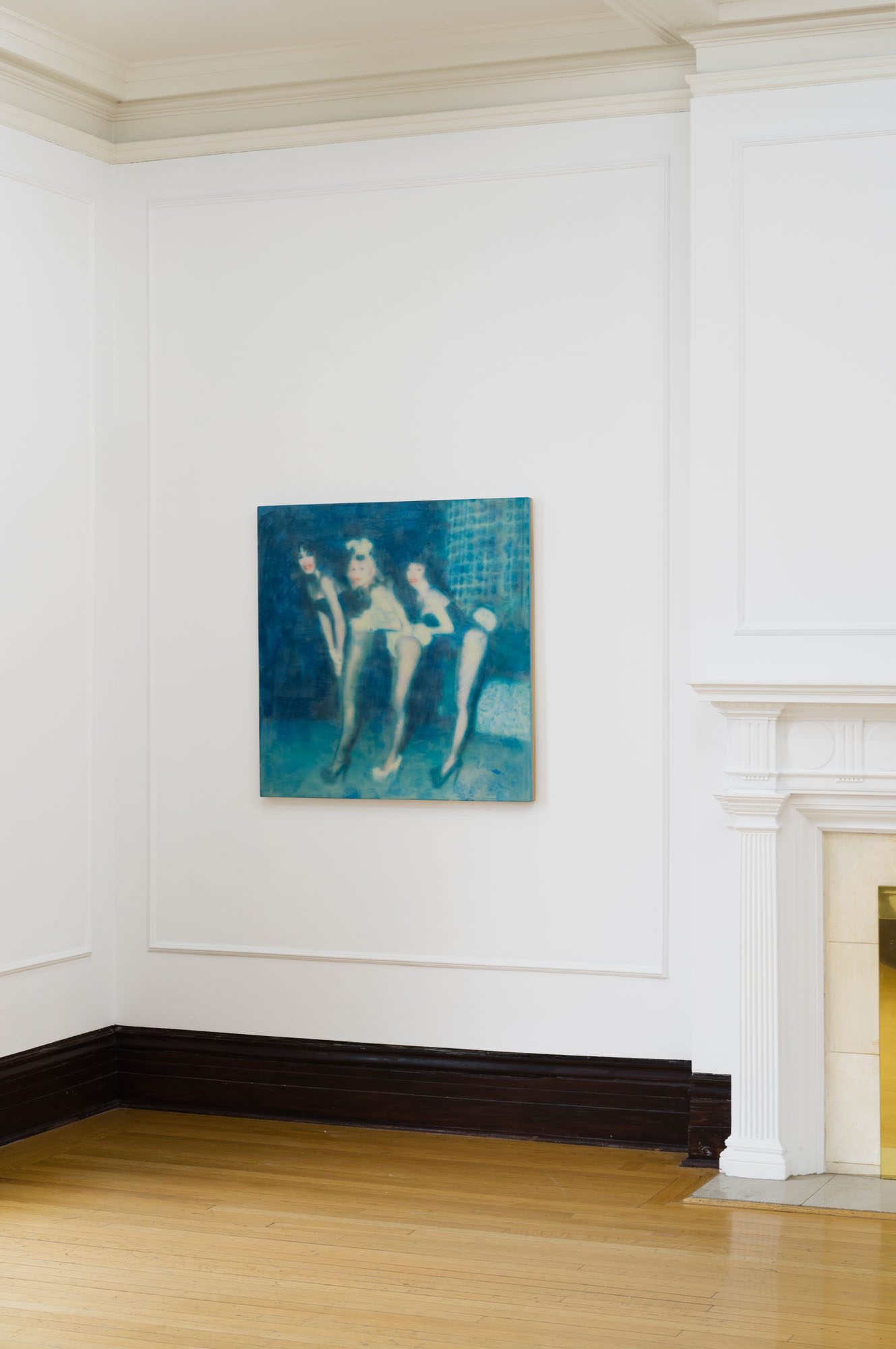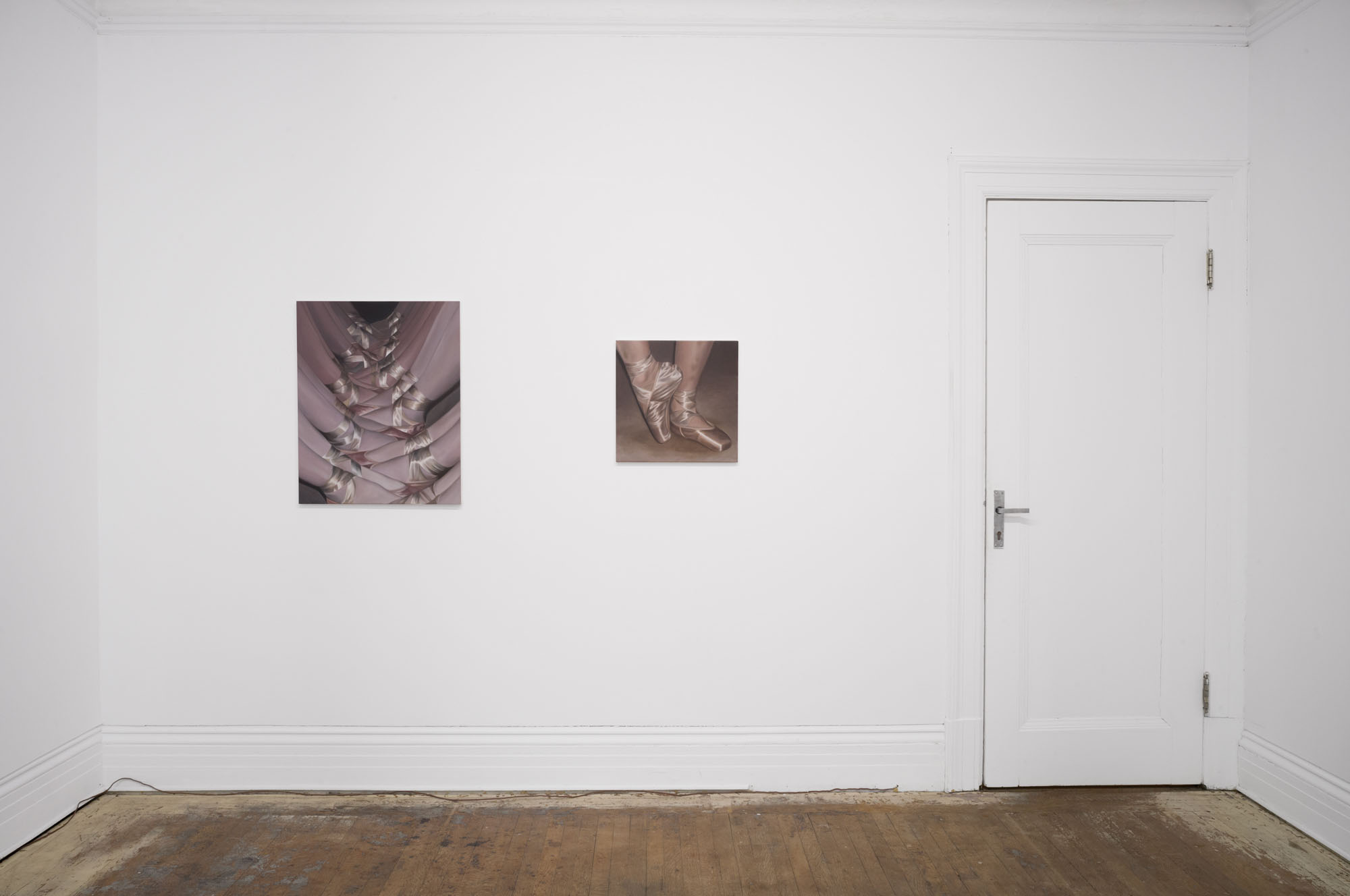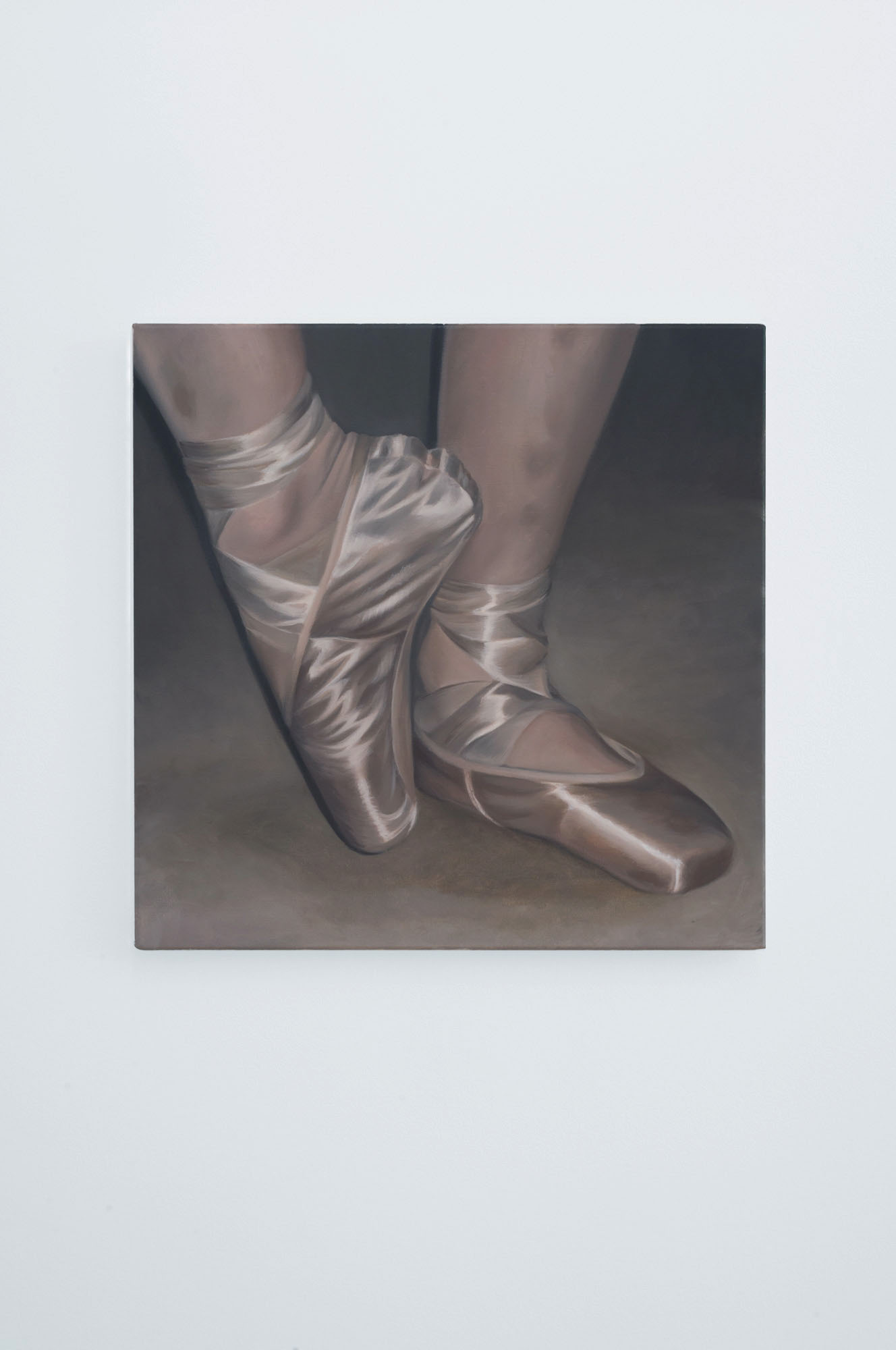 And how do we realize that show? What work is required to get to opening night? Sets must be built; lighting cues developed; lines rehearsed and committed to memory. If blocking maps movement across the stage, then set design decides the contours of that movement, and the body is the instrument that brings it all to life. The triangulated relationship between space, movement, and the body is reproduced in miniature in the work of Max Keene, who presents a series of maquettes dotted with mirrored silhouettes stretching across each piece. In a related gesture, Brittany Shepherd, Cristine Brache, and Corri-Lynn Tetz dissect the repetition of embodied performance through a series of carefully crafted portraits. Using ballet as a lens through which to examine the pains and pleasures of feminine performance, Shepherd presents only a fragment of her subjects—a bruised shin, a criss-cross of pointe shoes—to draw our hungry eyes to the action presumably happening just off stage, while the hazy portraits of Tetz and Brache, painted from film stills and found photographs, evoke the softly lit melancholy of vintage Playboys and Turner Classic Movies. In all three cases, the artists leave us to wonder who the subject of each painting might be: a company soloist, an amateur drag queen, or another ingénue ready for her closeup.