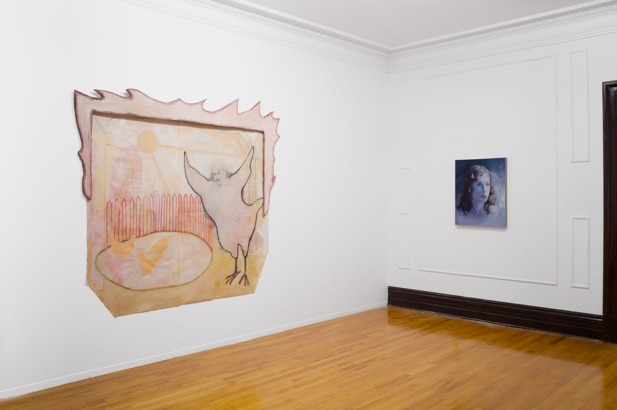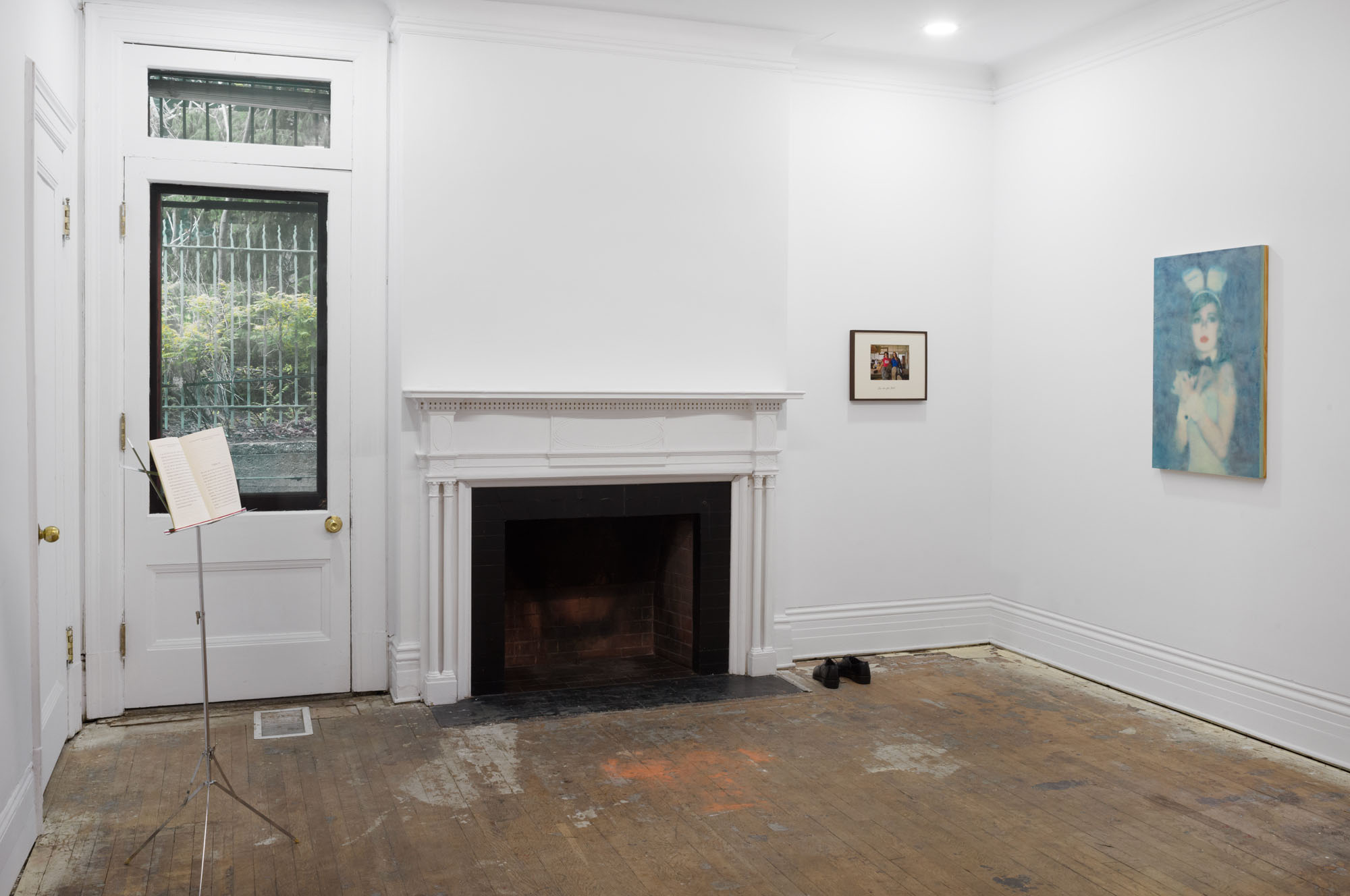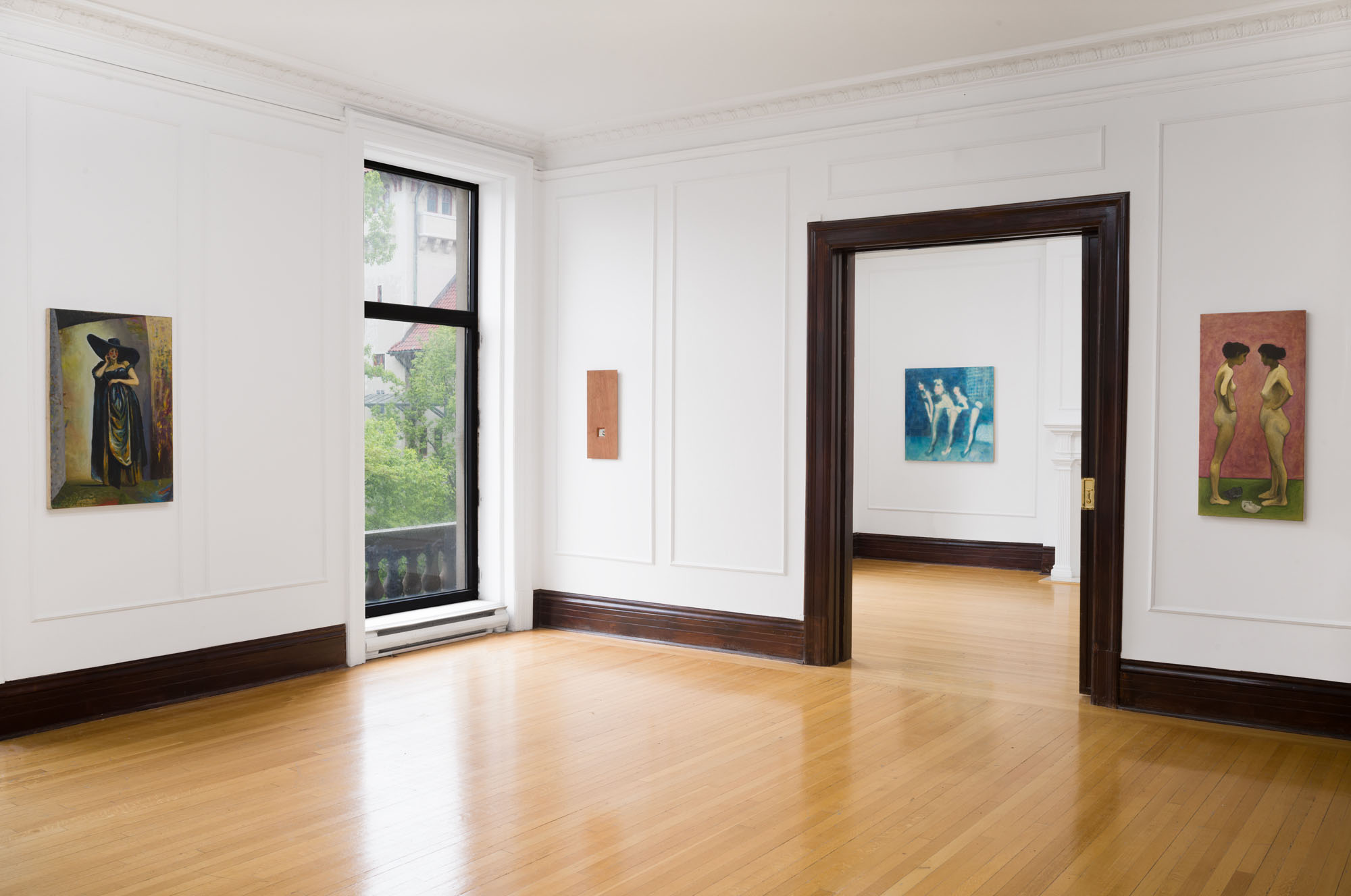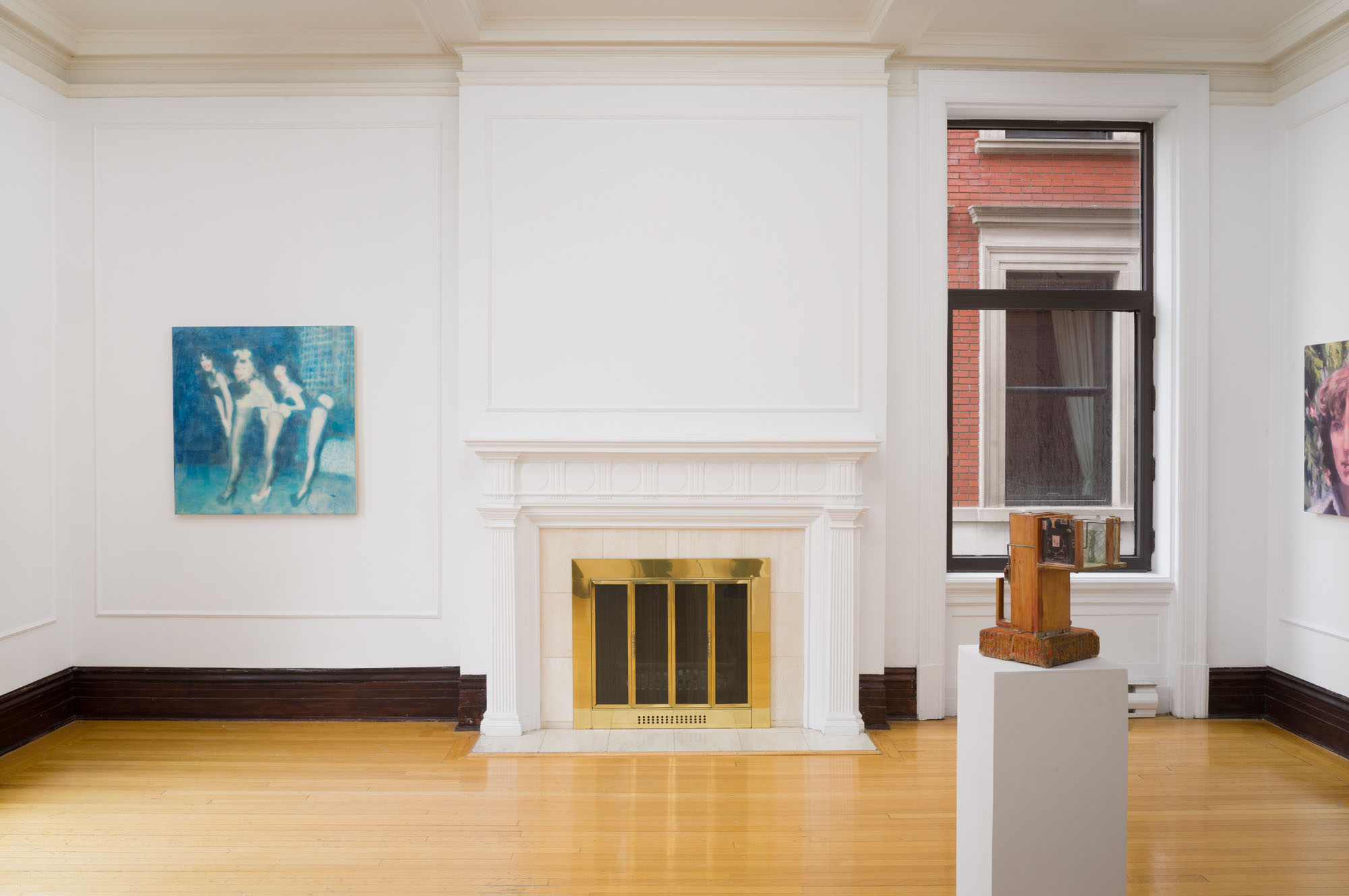 And how do we realize that show? What work is required to get to opening night? Sets must be built; lighting cues developed; lines rehearsed and committed to memory. If blocking maps movement across the stage, then set design decides the contours of that movement, and the body is the instrument that brings it all to life. The triangulated relationship between space, movement, and the body is reproduced in miniature in the work of Max Keene, who presents a series of maquettes dotted with mirrored silhouettes stretching across each piece. In a related gesture, Brittany Shepherd, Cristine Brache, and Corri-Lynn Tetz dissect the repetition of embodied performance through a series of carefully crafted portraits. Using ballet as a lens through which to examine the pains and pleasures of feminine performance, Shepherd presents only a fragment of her subjects—a bruised shin, a criss-cross of pointe shoes—to draw our hungry eyes to the action presumably happening just off stage, while the hazy portraits of Tetz and Brache, painted from film stills and found photographs, evoke the softly lit melancholy of vintage Playboys and Turner Classic Movies. In all three cases, the artists leave us to wonder who the subject of each painting might be: a company soloist, an amateur drag queen, or another ingénue ready for her closeup.