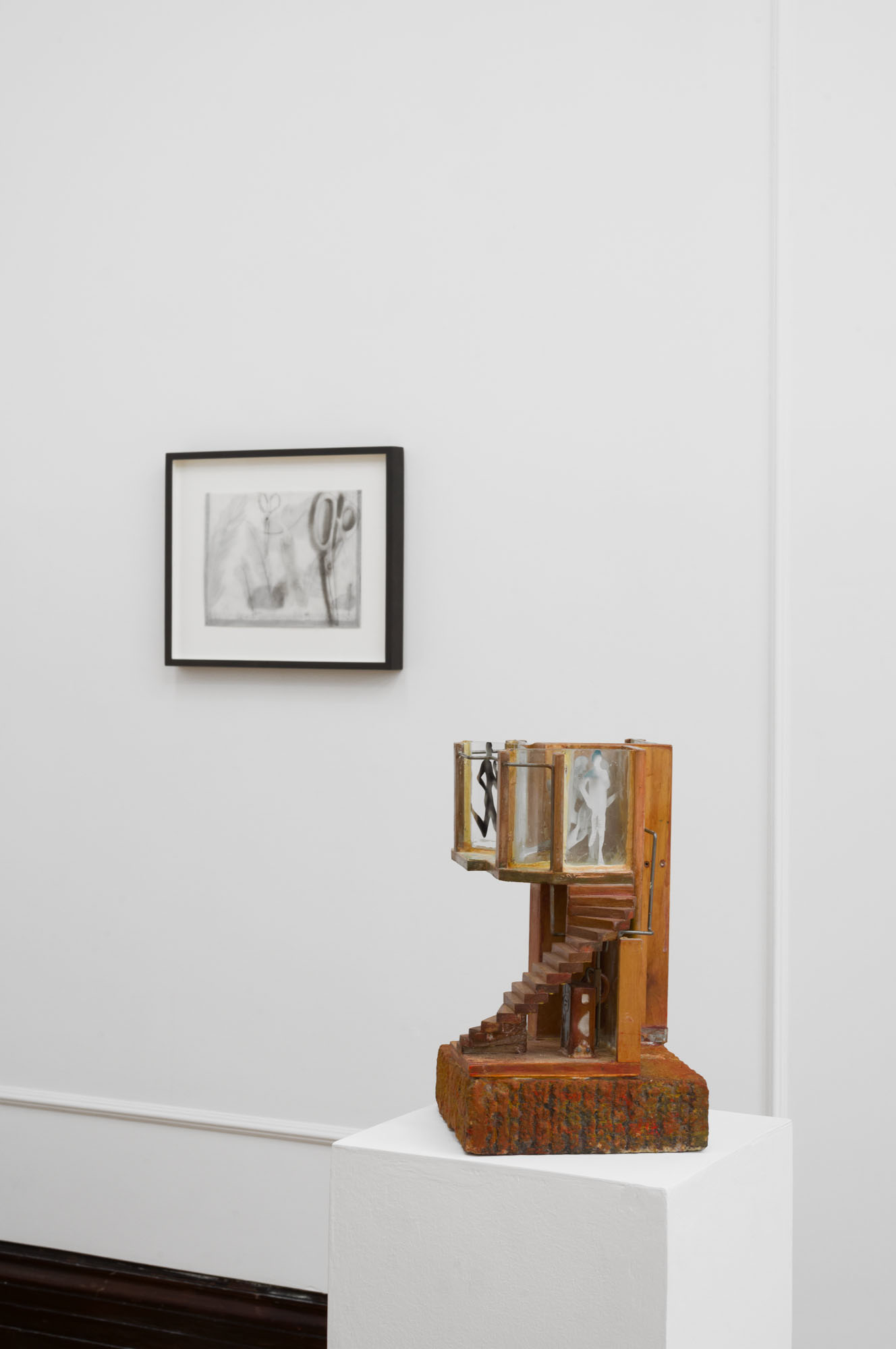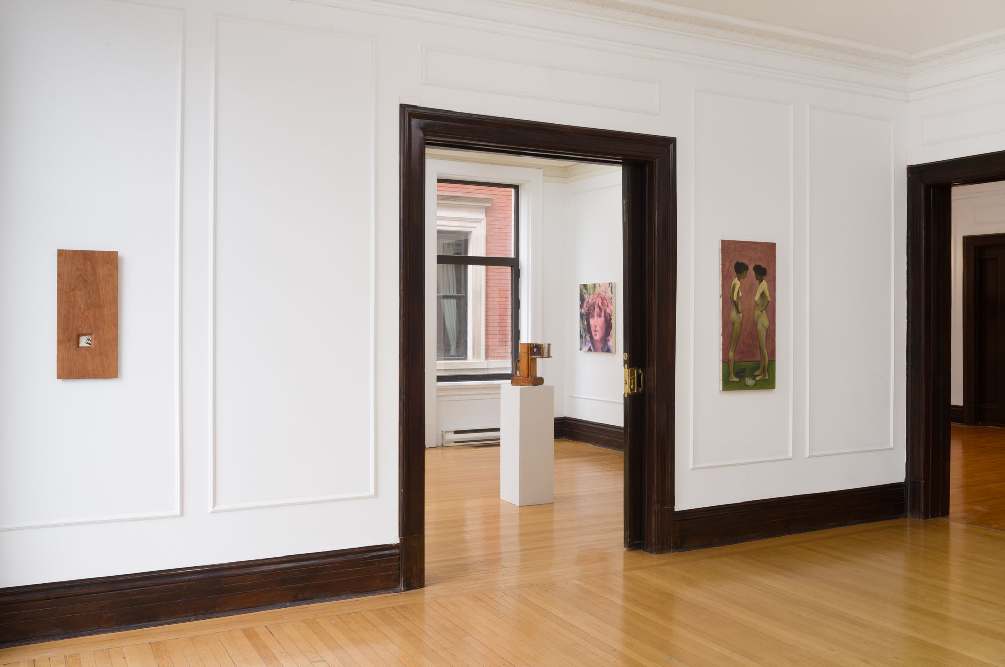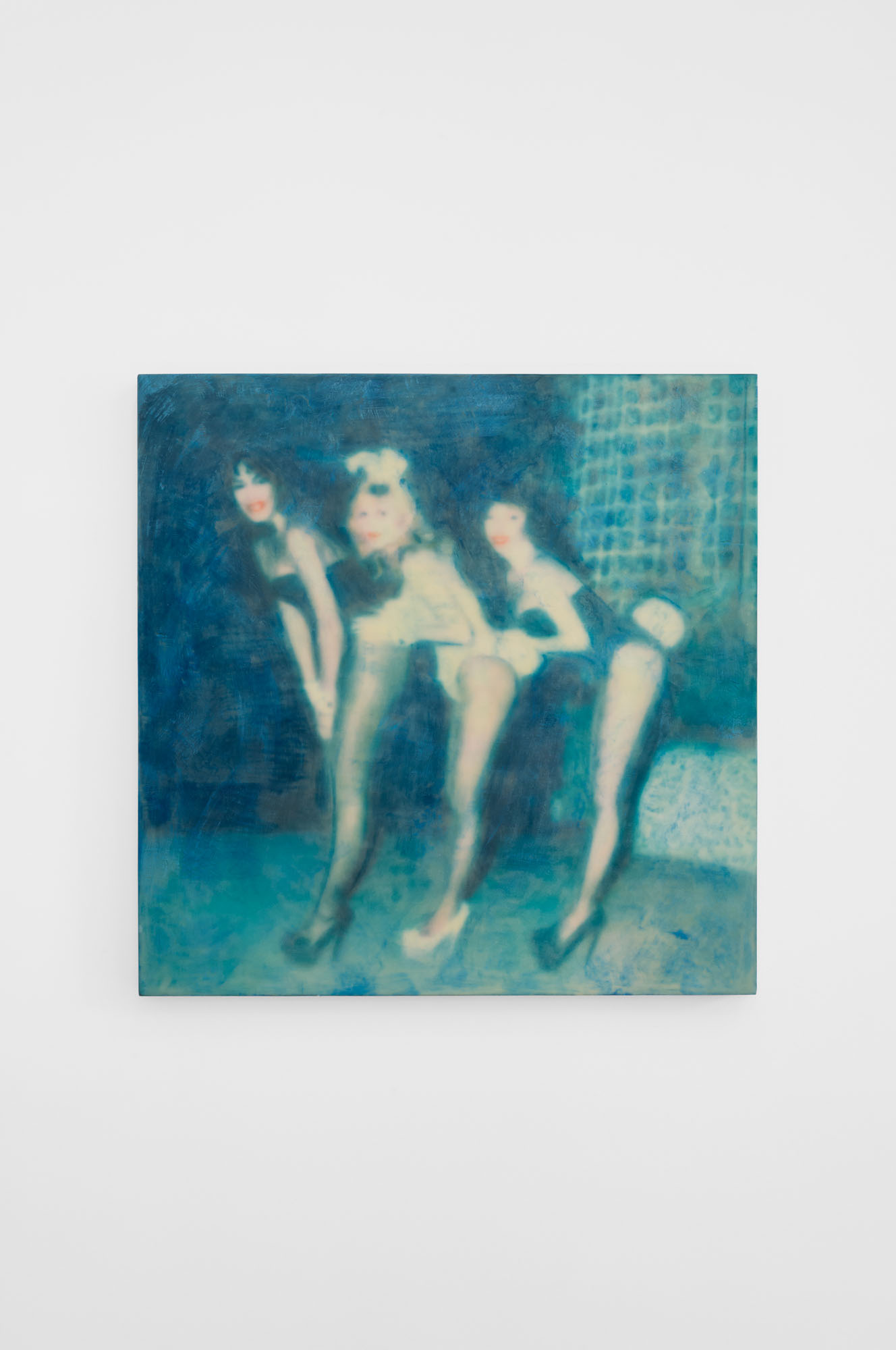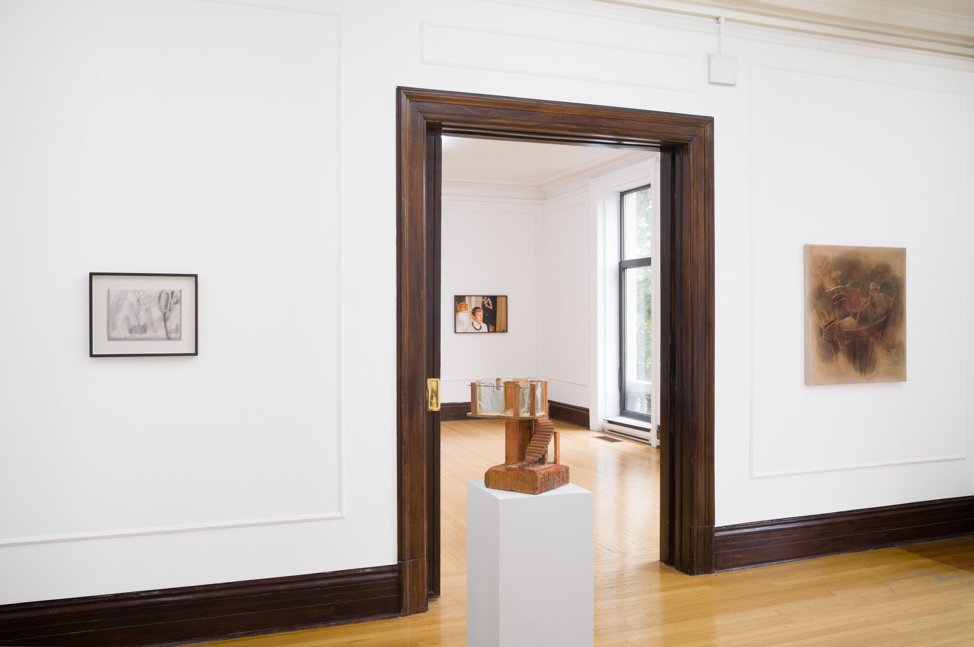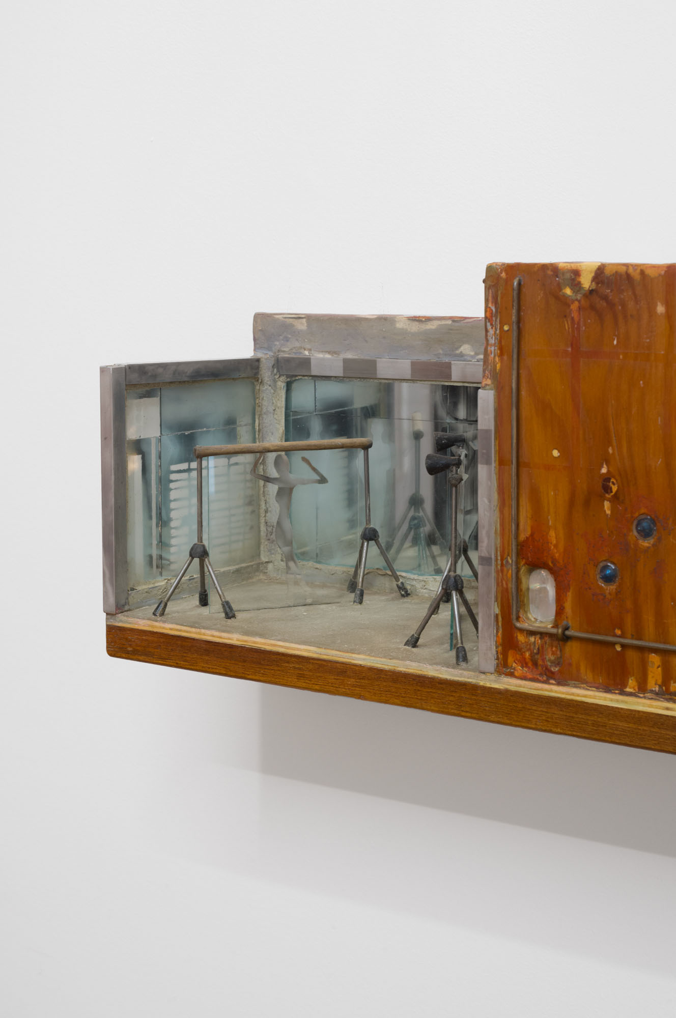 And how do we realize that show? What work is required to get to opening night? Sets must be built; lighting cues developed; lines rehearsed and committed to memory. If blocking maps movement across the stage, then set design decides the contours of that movement, and the body is the instrument that brings it all to life. The triangulated relationship between space, movement, and the body is reproduced in miniature in the work of Max Keene, who presents a series of maquettes dotted with mirrored silhouettes stretching across each piece. In a related gesture, Brittany Shepherd, Cristine Brache, and Corri-Lynn Tetz dissect the repetition of embodied performance through a series of carefully crafted portraits. Using ballet as a lens through which to examine the pains and pleasures of feminine performance, Shepherd presents only a fragment of her subjects—a bruised shin, a criss-cross of pointe shoes—to draw our hungry eyes to the action presumably happening just off stage, while the hazy portraits of Tetz and Brache, painted from film stills and found photographs, evoke the softly lit melancholy of vintage Playboys and Turner Classic Movies. In all three cases, the artists leave us to wonder who the subject of each painting might be: a company soloist, an amateur drag queen, or another ingénue ready for her closeup.
