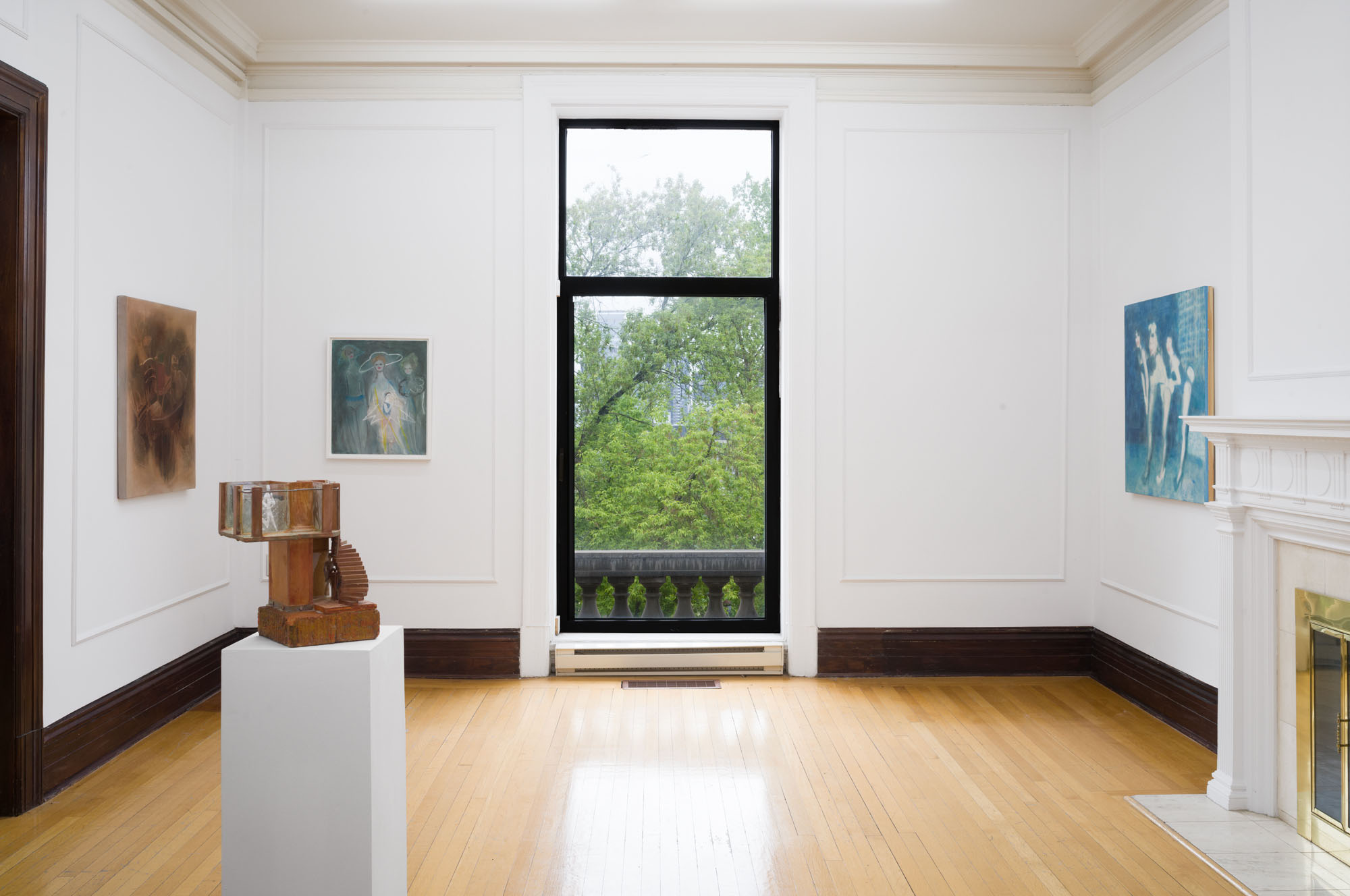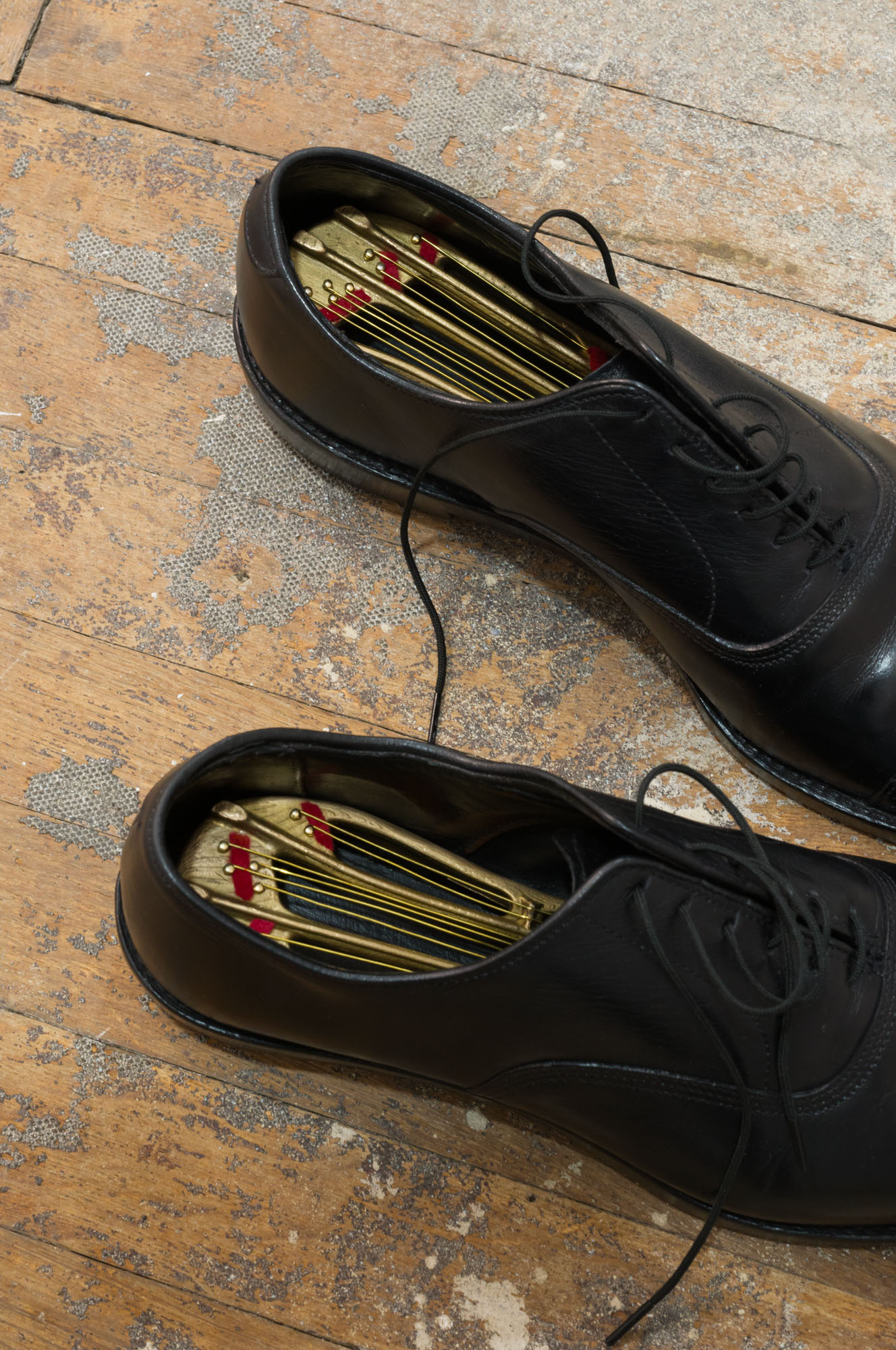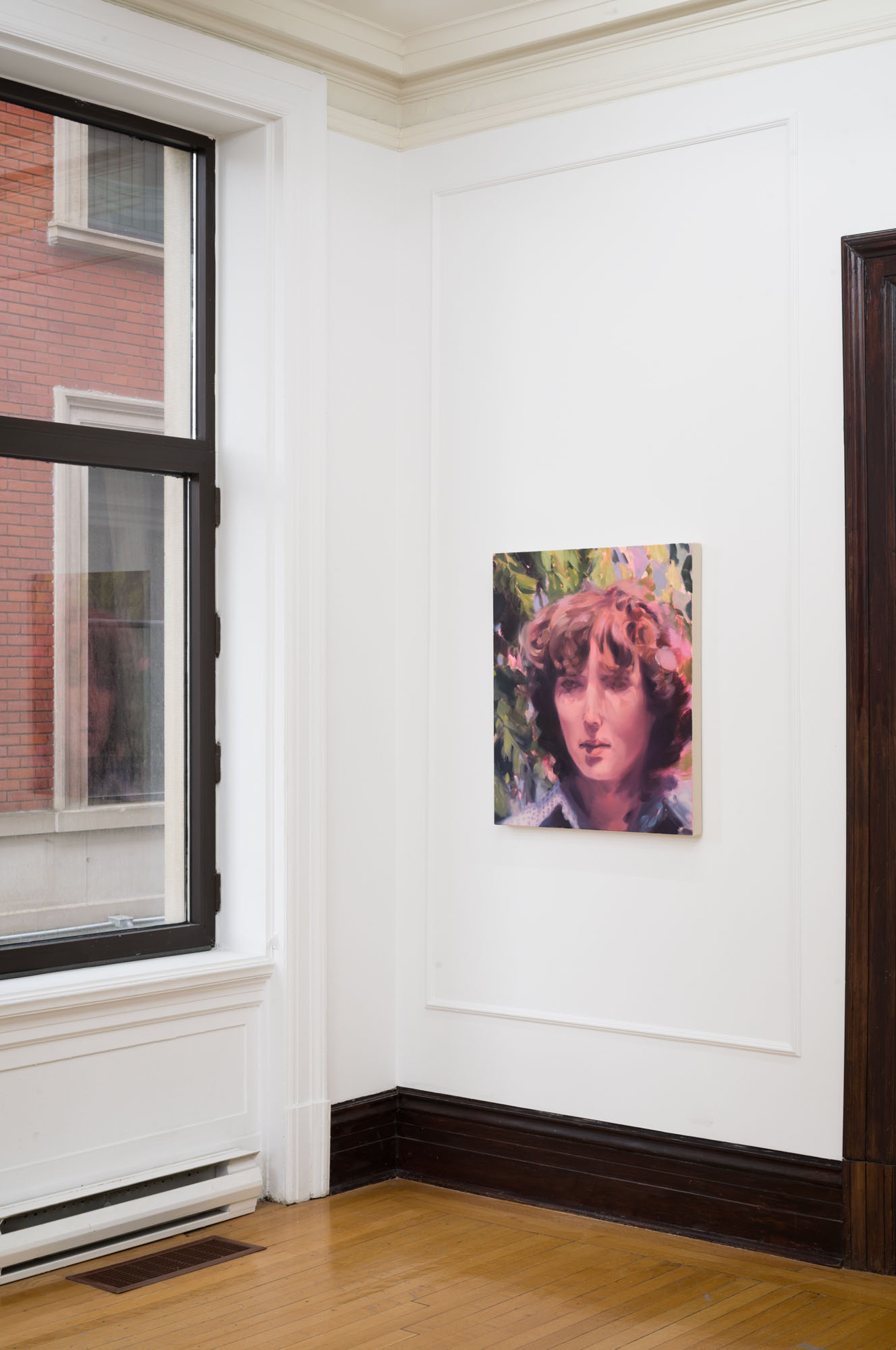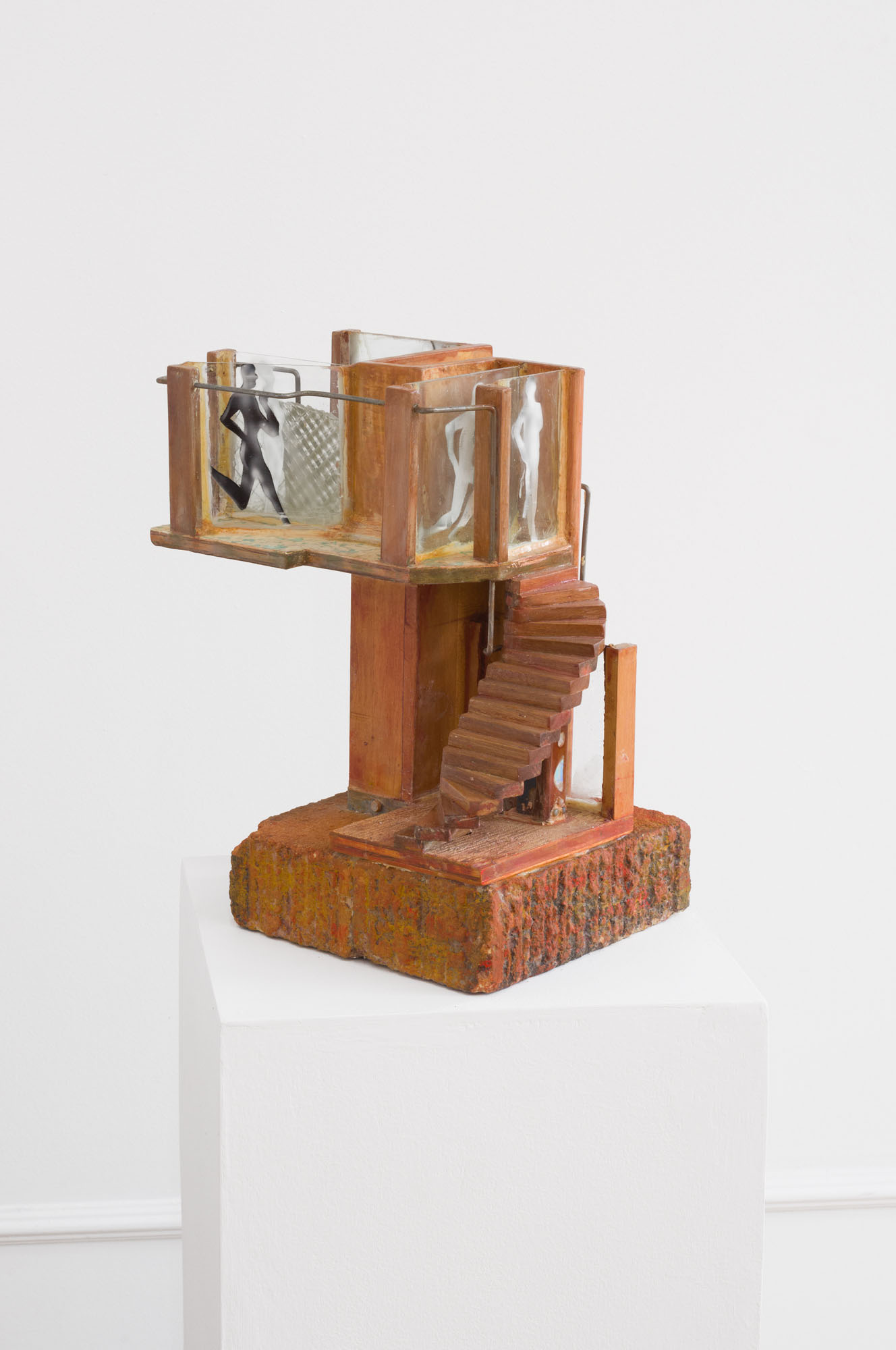 And how do we realize that show? What work is required to get to opening night? Sets must be built; lighting cues developed; lines rehearsed and committed to memory. If blocking maps movement across the stage, then set design decides the contours of that movement, and the body is the instrument that brings it all to life. The triangulated relationship between space, movement, and the body is reproduced in miniature in the work of Max Keene, who presents a series of maquettes dotted with mirrored silhouettes stretching across each piece. In a related gesture, Brittany Shepherd, Cristine Brache, and Corri-Lynn Tetz dissect the repetition of embodied performance through a series of carefully crafted portraits. Using ballet as a lens through which to examine the pains and pleasures of feminine performance, Shepherd presents only a fragment of her subjects—a bruised shin, a criss-cross of pointe shoes—to draw our hungry eyes to the action presumably happening just off stage, while the hazy portraits of Tetz and Brache, painted from film stills and found photographs, evoke the softly lit melancholy of vintage Playboys and Turner Classic Movies. In all three cases, the artists leave us to wonder who the subject of each painting might be: a company soloist, an amateur drag queen, or another ingénue ready for her closeup.