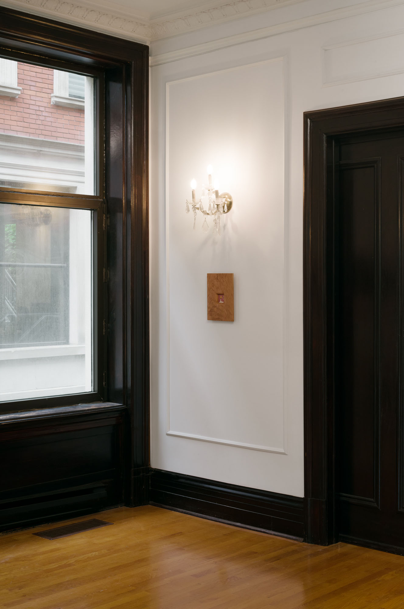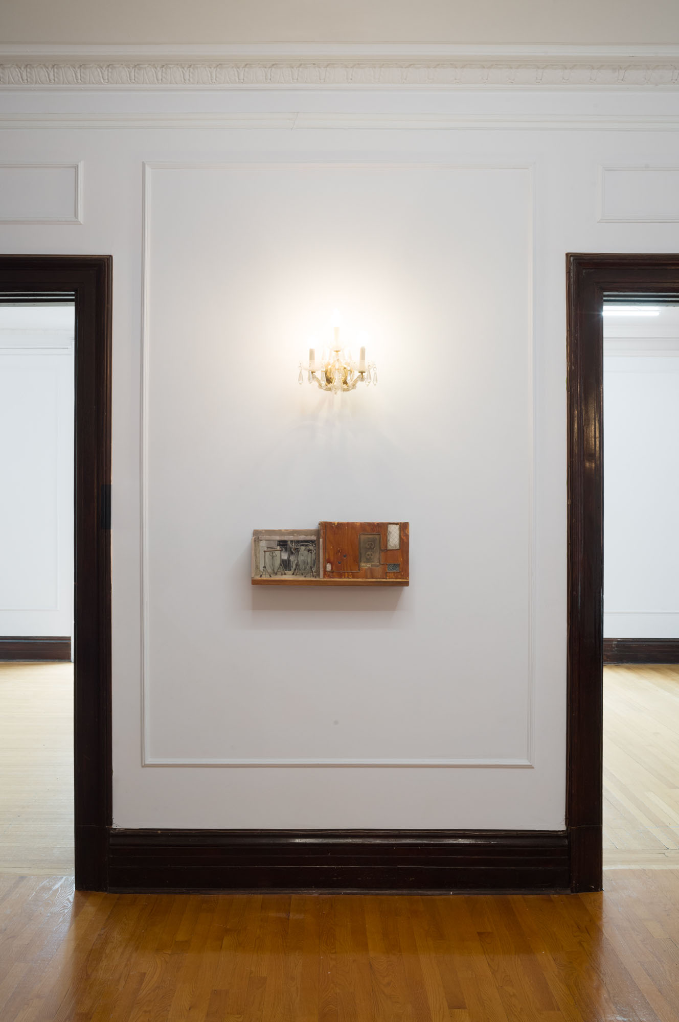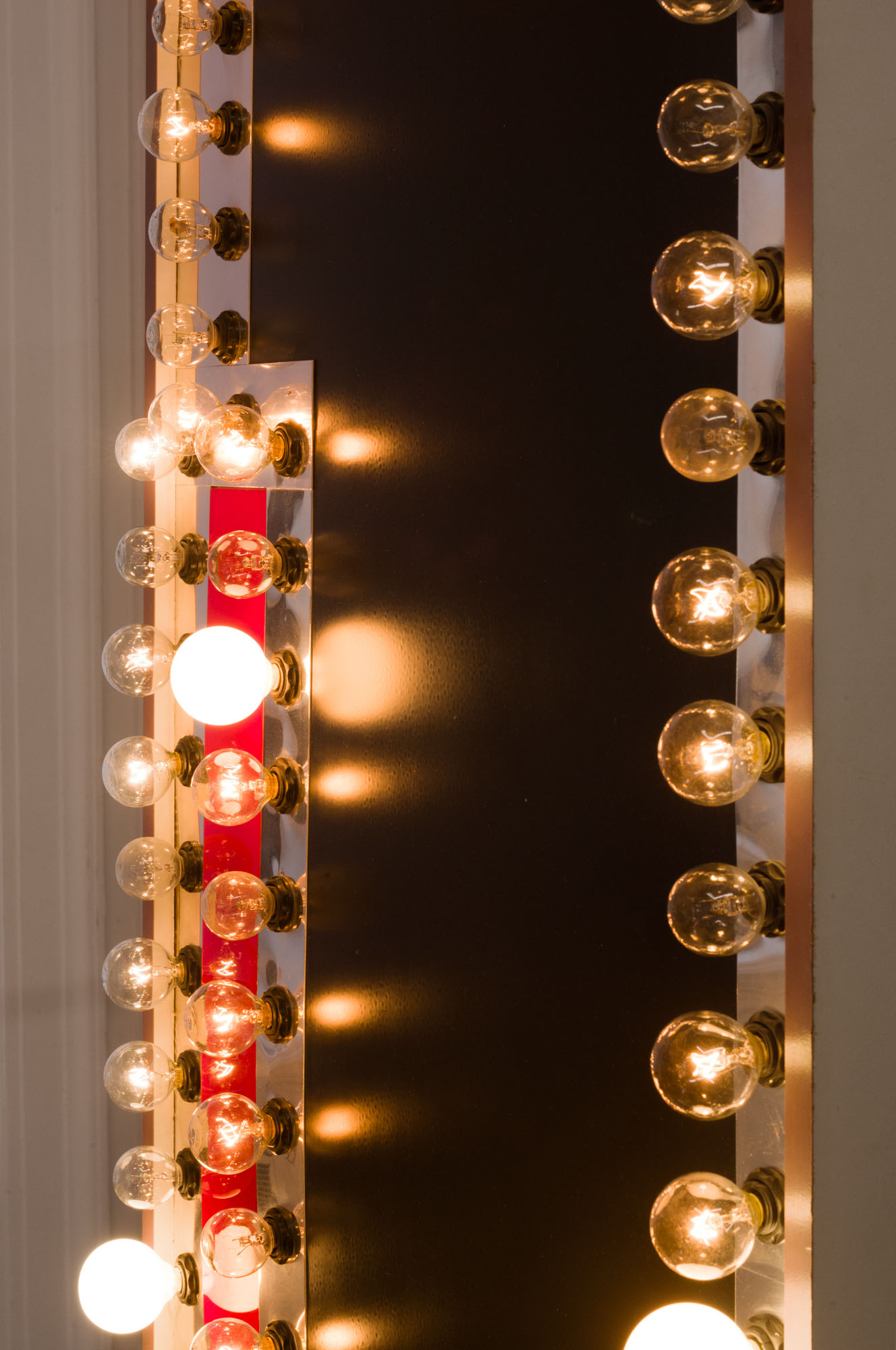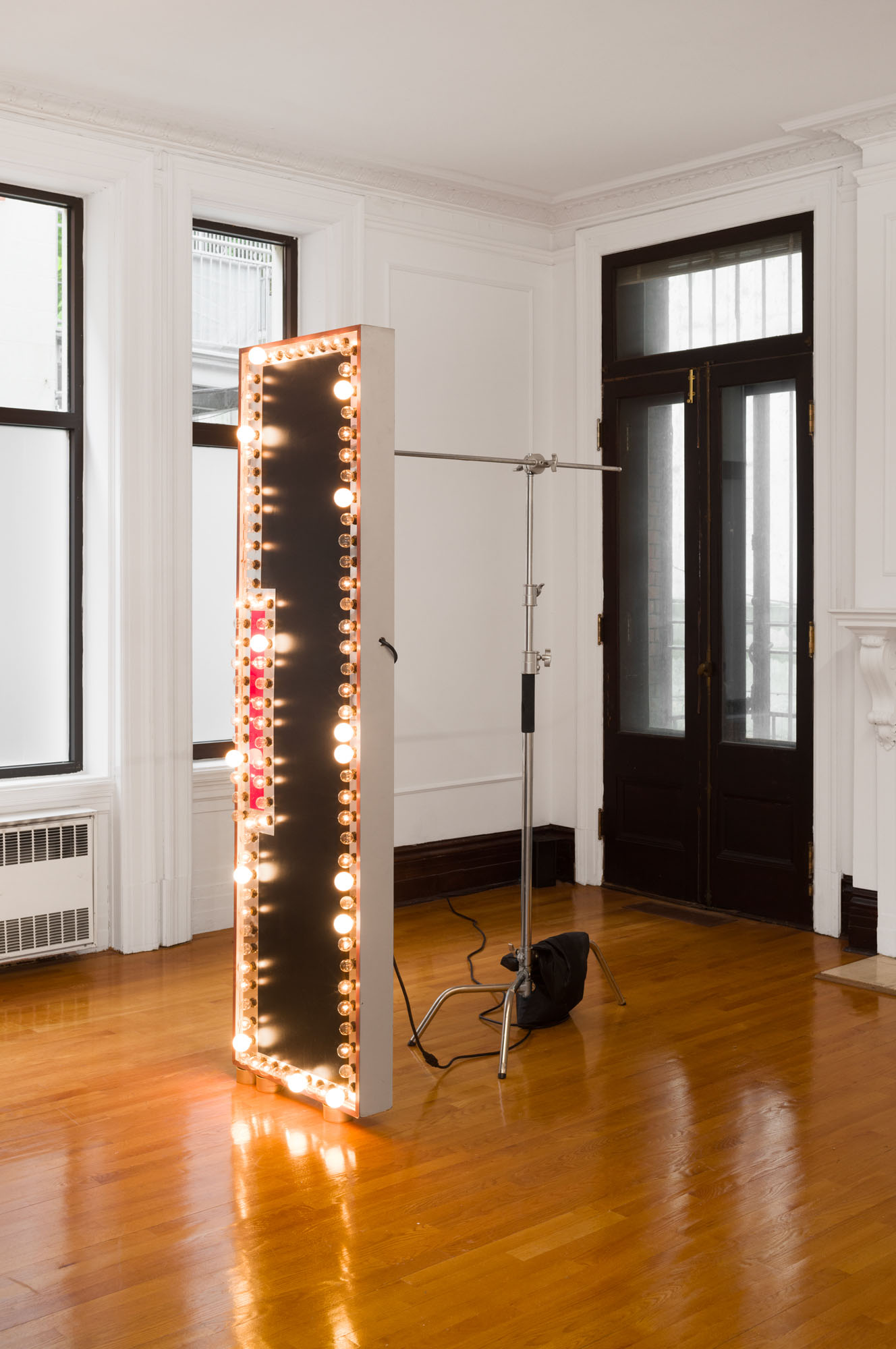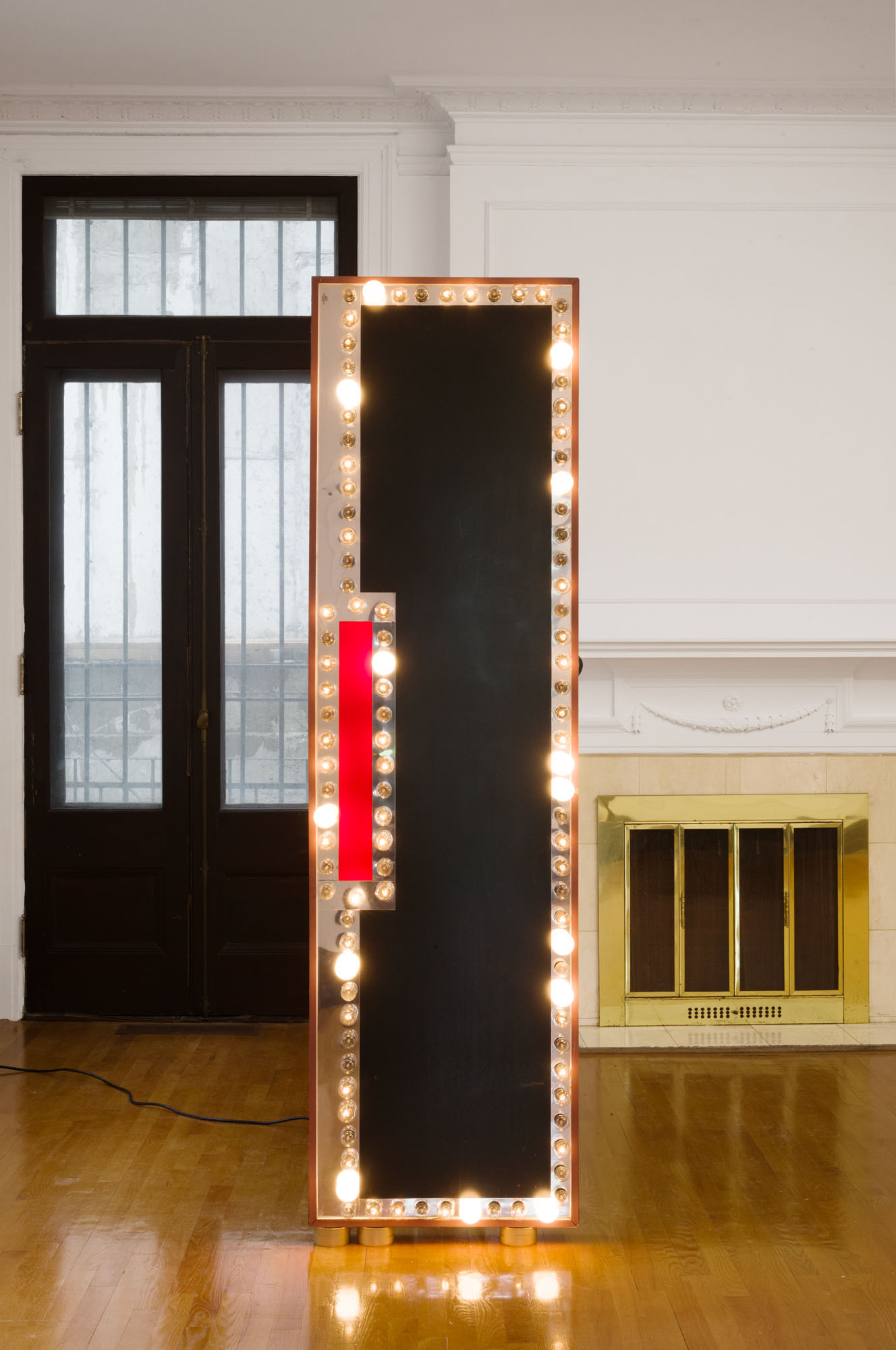 What makes a performer different from an audience? The artists in Dress Parade suggest the difference is a matter of perspective, one that can easily be flipped on its head through the manipulation of material, composition, scale, and light. In Belerique’s accompanying sculptural work, the artist tips the rectangular panel of a marquee on its side, transforming public signage into the private sanctuary of the dressing room mirror, its perimeter lined by lightbulbs, but in this mirror we find no reflection, only our warped shadows staring back at us, a self- contained world, a play-within-a-play.