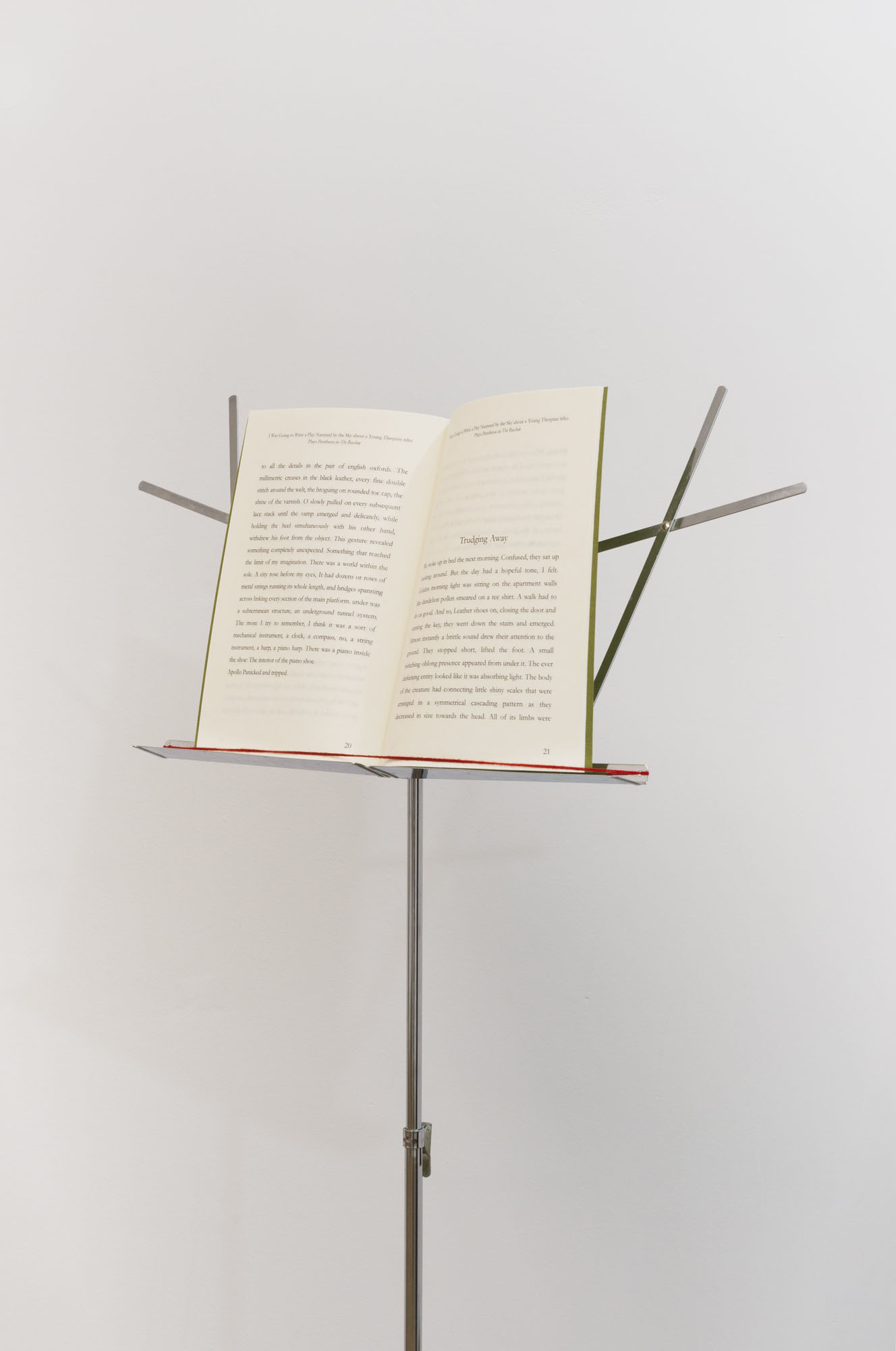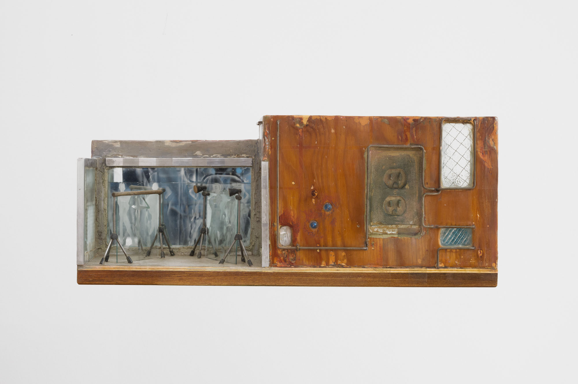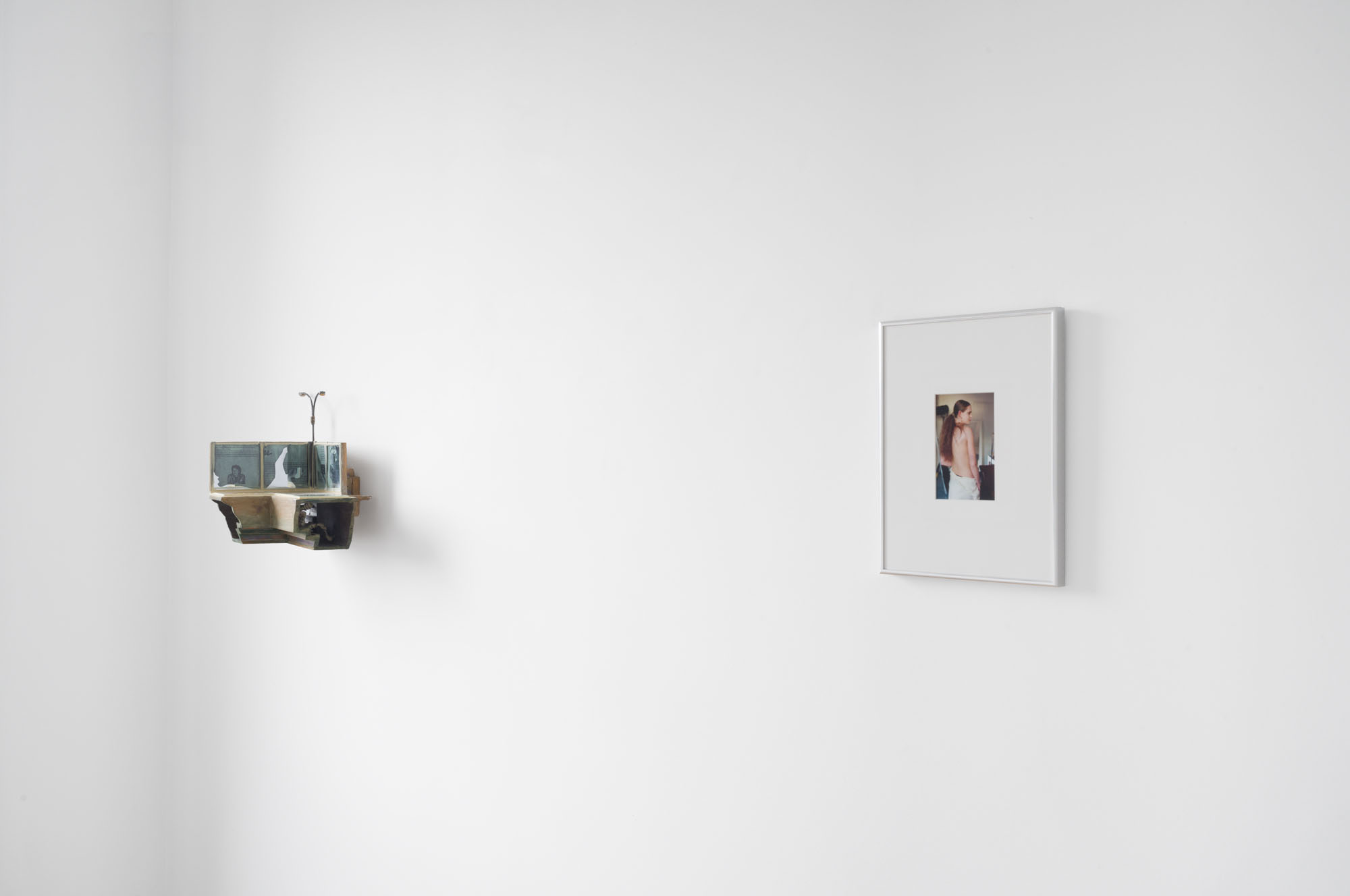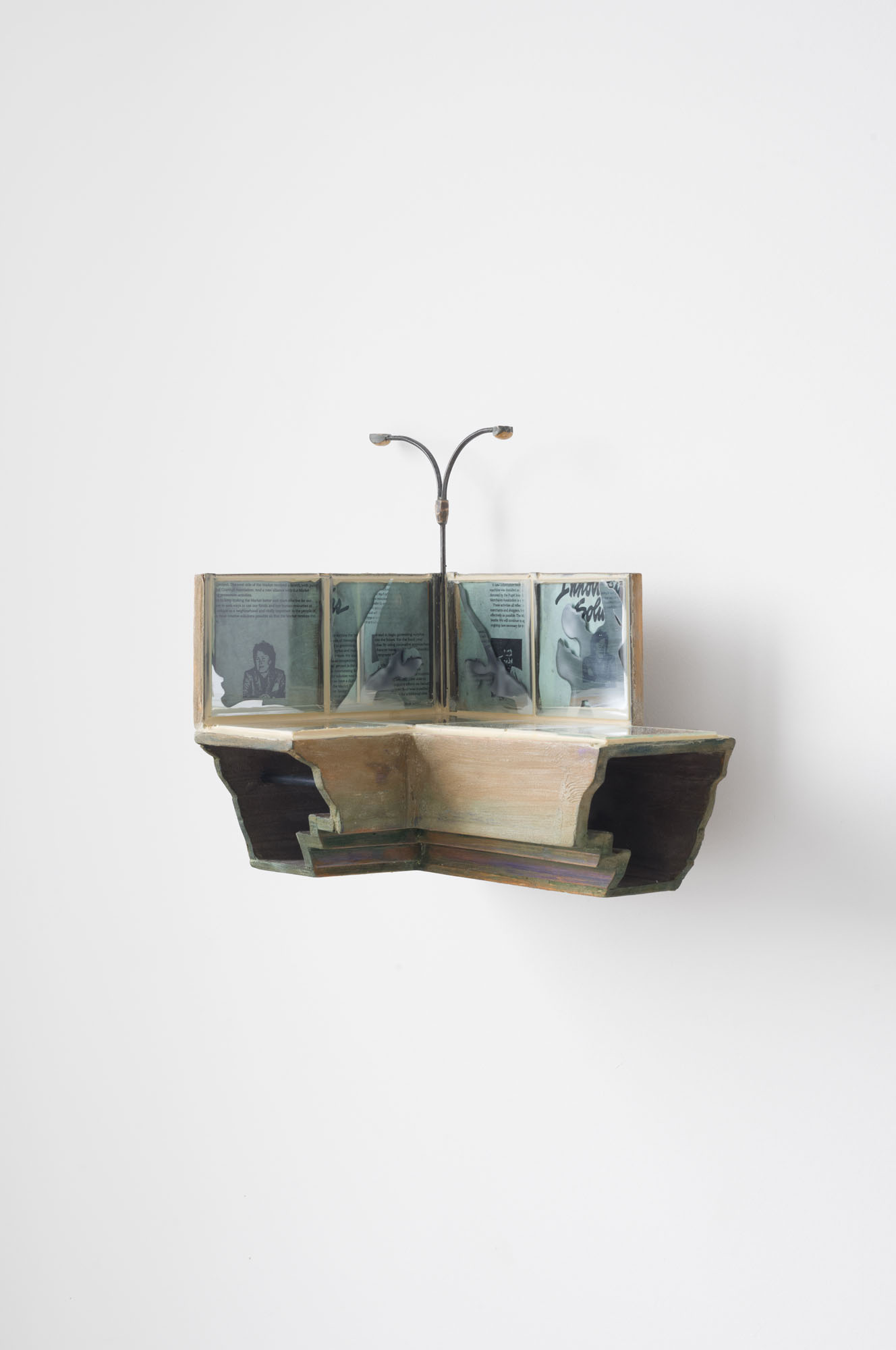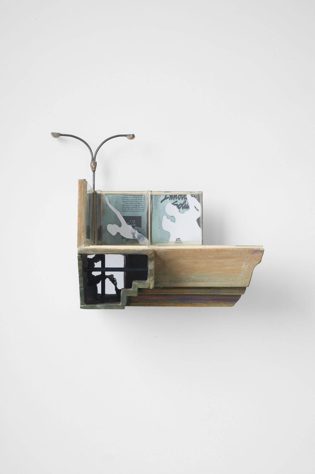 What makes a performer different from an audience? The artists in Dress Parade suggest the difference is a matter of perspective, one that can easily be flipped on its head through the manipulation of material, composition, scale, and light. In Belerique’s accompanying sculptural work, the artist tips the rectangular panel of a marquee on its side, transforming public signage into the private sanctuary of the dressing room mirror, its perimeter lined by lightbulbs, but in this mirror we find no reflection, only our warped shadows staring back at us, a self- contained world, a play-within-a-play.