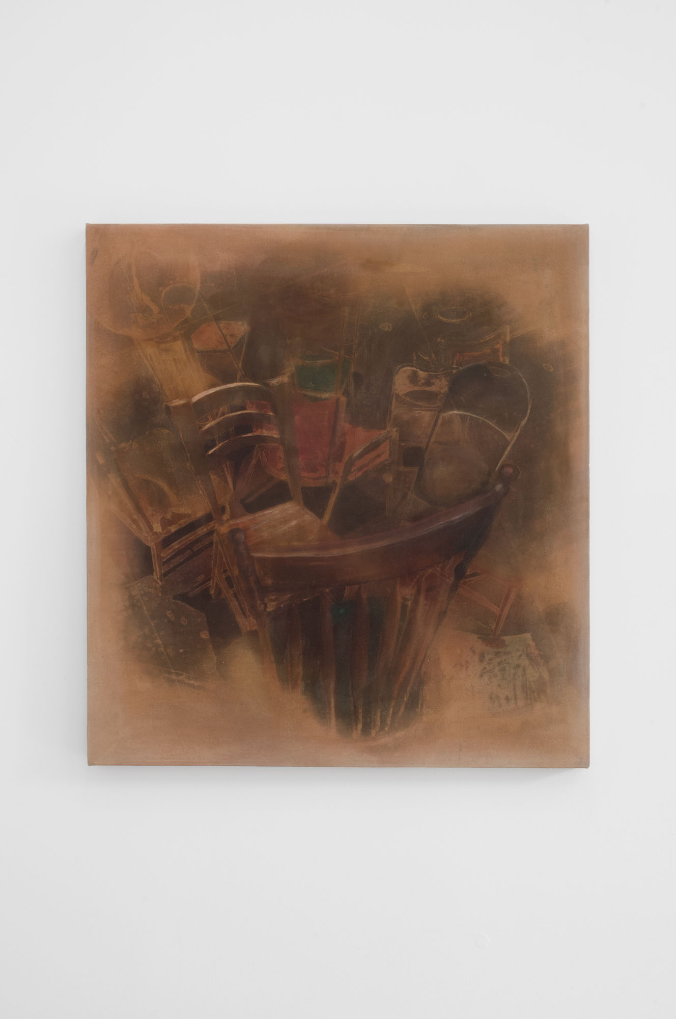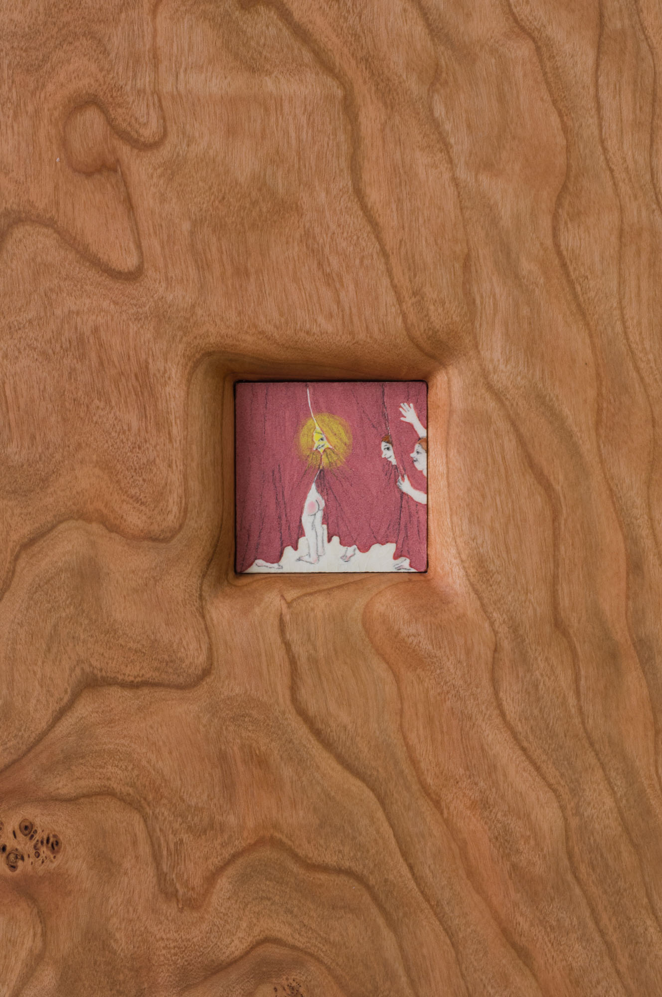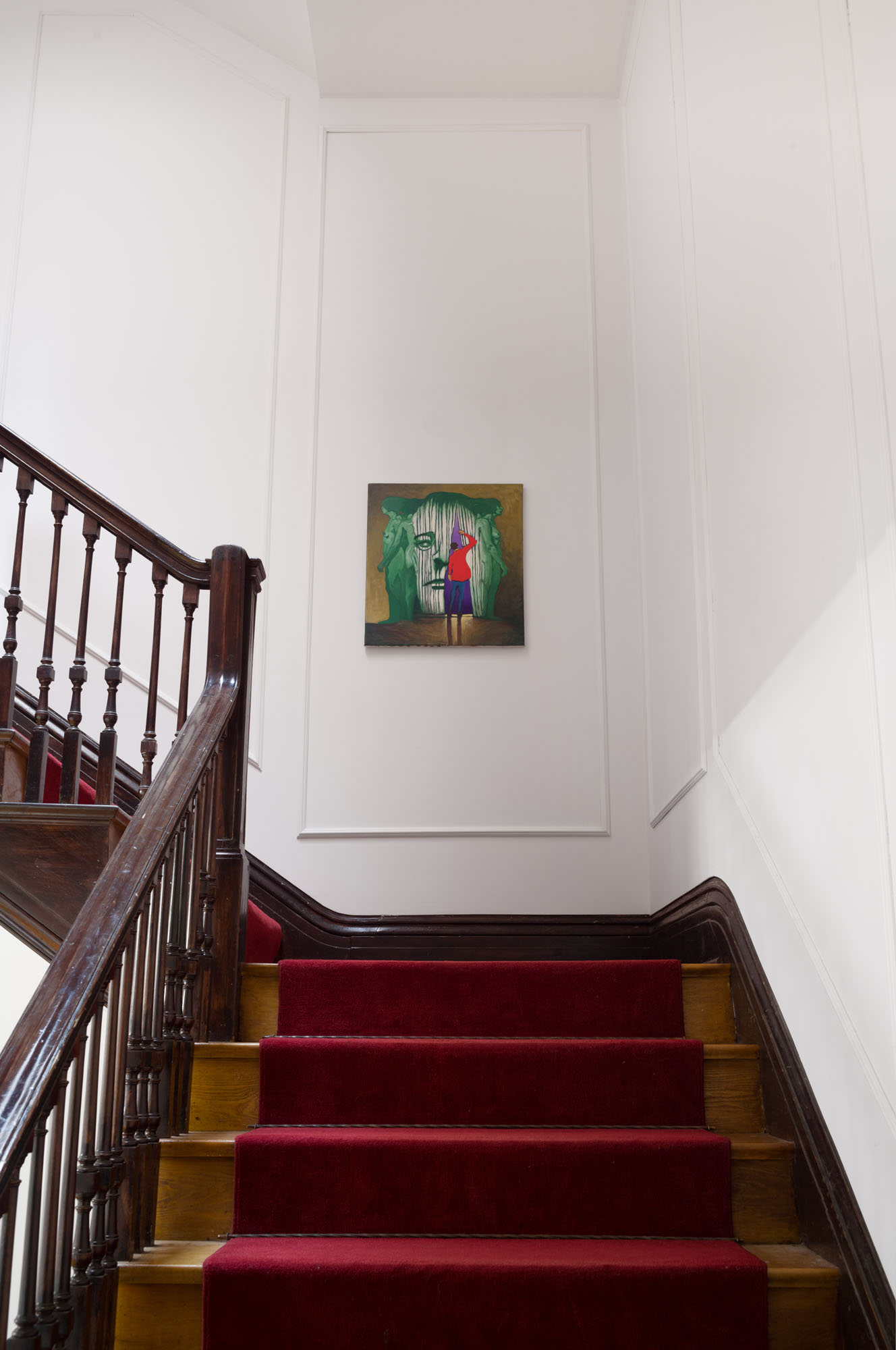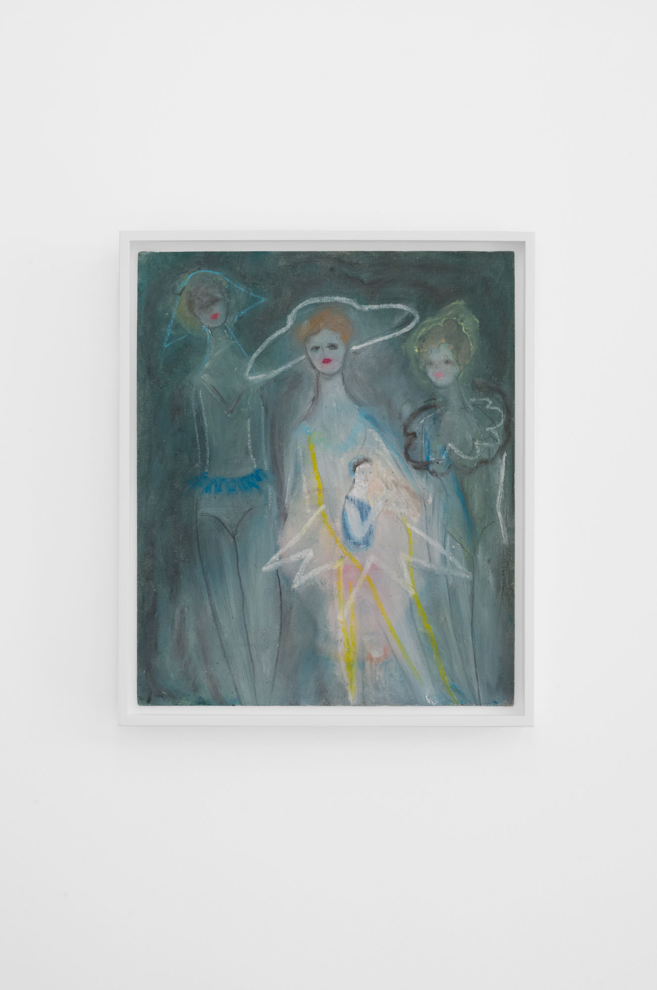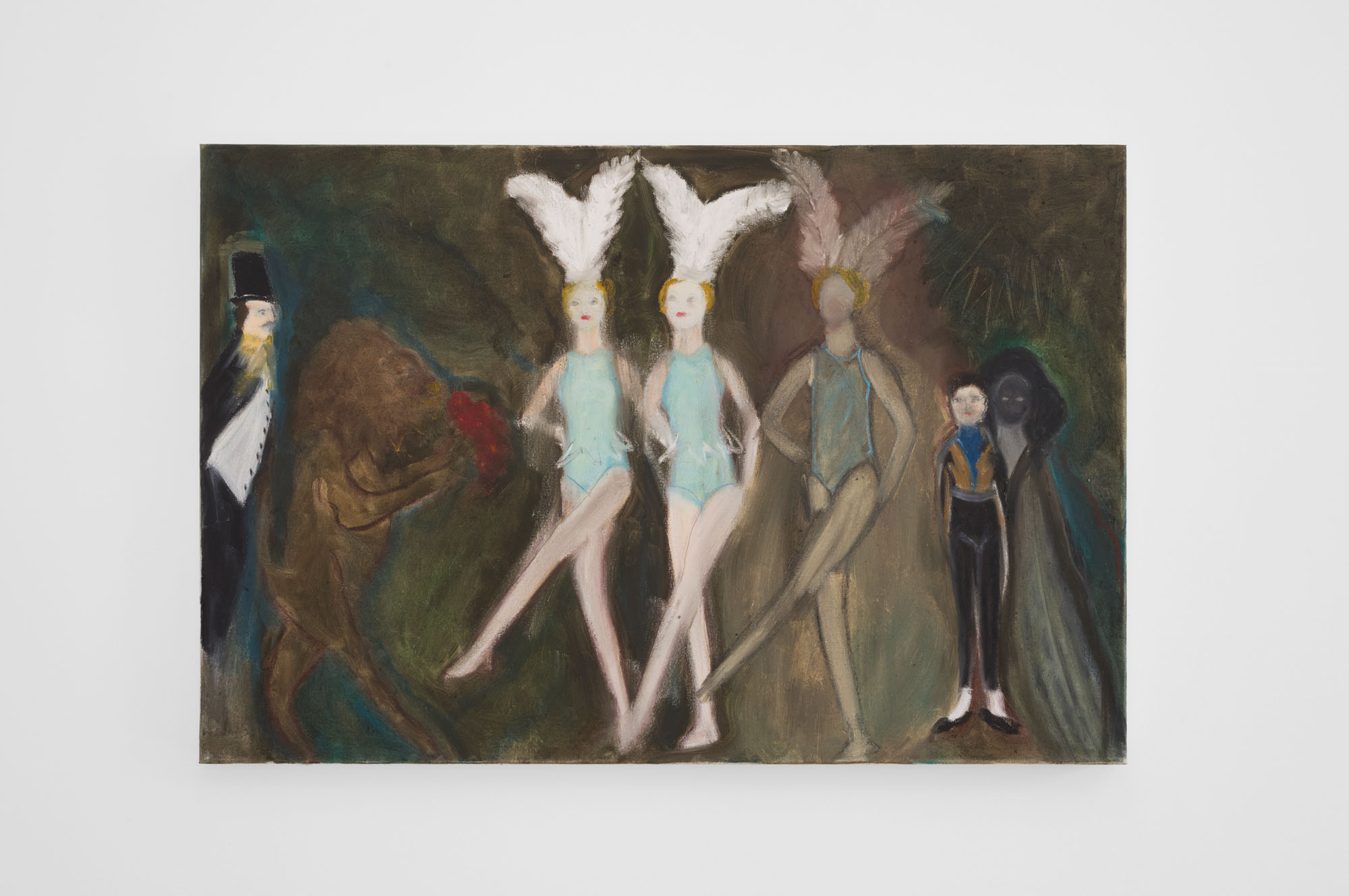 The allure of theatre hinges on its ability to transform fantasy into reality, a principle articulated through the work of Fatine-Violette Sabiri and Gérald Lajoie. Working across photography and sculpture, the artists find magic in small details: a crown made of twigs and coins, an unexpected vision, a surprise in the sole of a shoe. A similar dreamlike quality emerges in the work of Amy Bravo, Yelena Yemchuk, and Trevor Bourke, three artists whose paintings appear plucked from the depths of the unconscious. Here, the surreal takes centre stage, revealing a cast of fantastical characters: a hybrid creature with the head of a human and the body of a chicken; a scattering of cheerleaders, pointed cones strapped to their arms; a performer parting the curtain of an eye to look hesitantly upon his audience. These artists grant us front-row seats to the otherworldly, those images and anxieties only glimpsed in dreams or imagined on the stage. Through their work we see the absurd, the whimsical, the breathtaking; a reminder that life is about sitting back and enjoying the show.