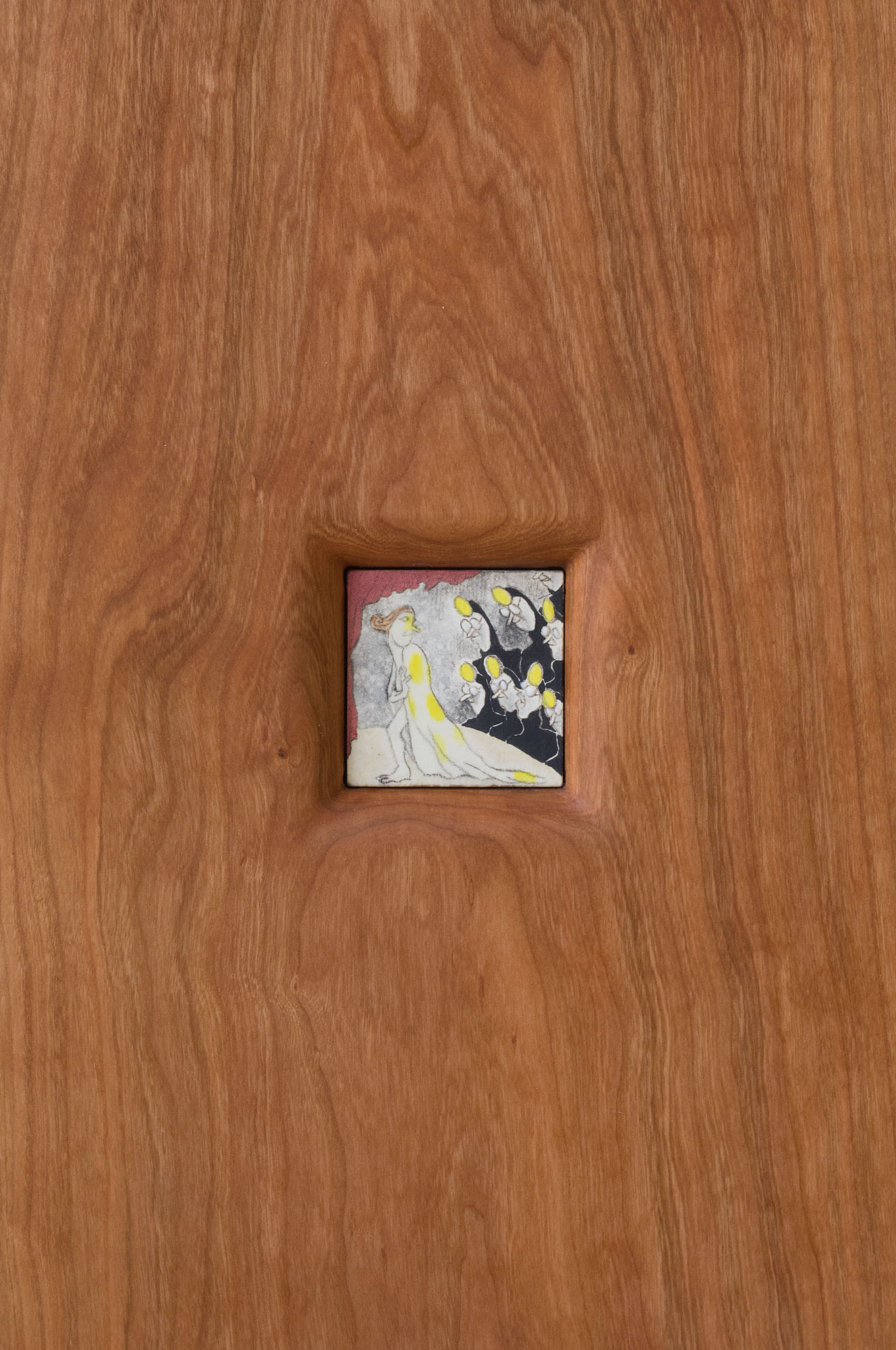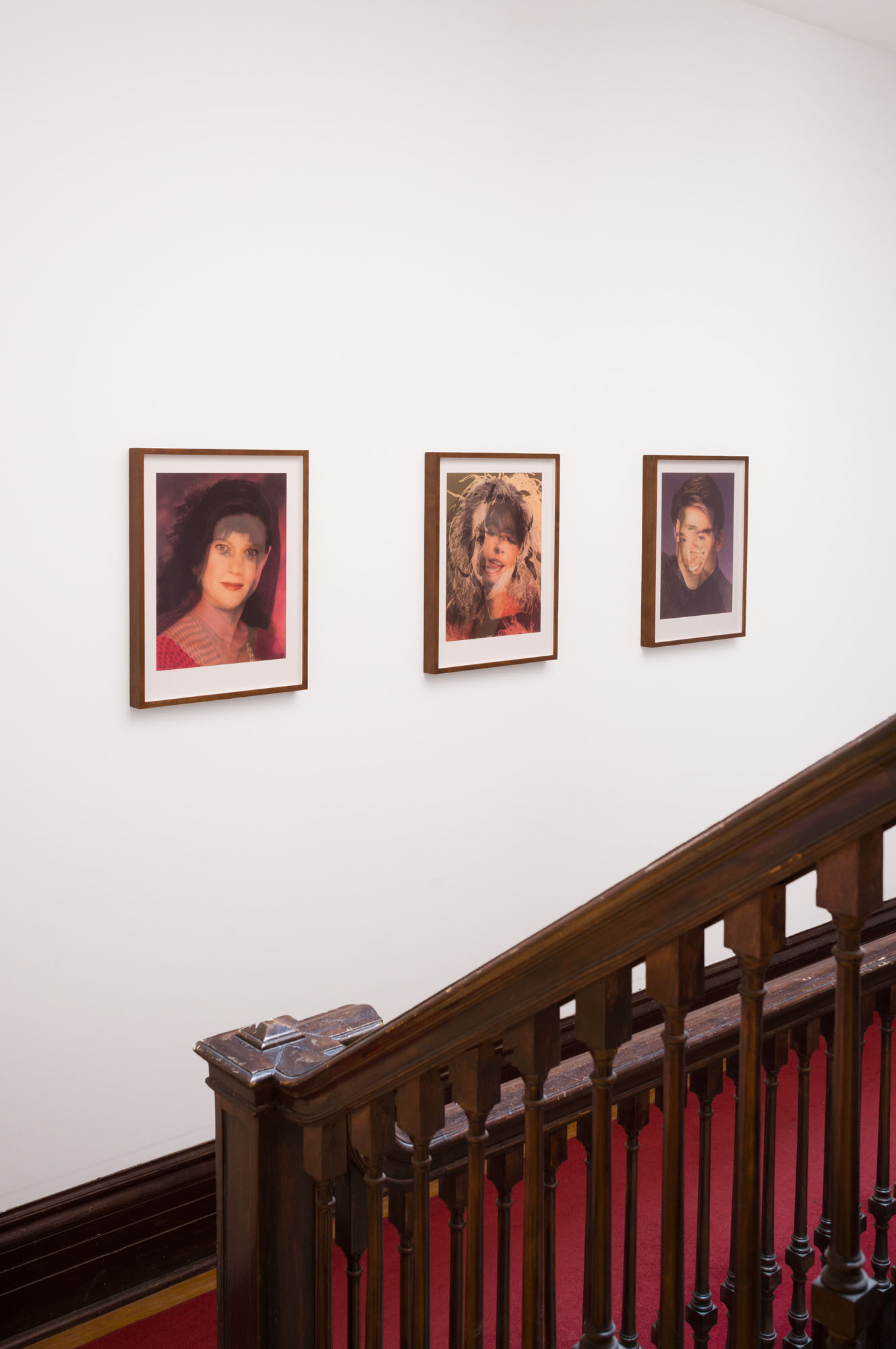 An important element of any good performance is camp, the wink and nod that lets an audience know that everything is make-believe, a play-within-a-play. Sontag defines camp as a sensibility, something so sacred it can’t be named, a dictate exhibited in the work of Em Kettner, whose glazed porcelain tiles, each encased in a wooden frame, depict figures who either demure or revel in the act of being seen. The discarded headshots of Hollywood hopefuls scramble together in the work of Nadia Belerique, who combines these found photos into a selection of Frankenstein’s monsters. With eyes and mouths overlapping, these aspiring actors collapse into an indistinguishable mass of features awaiting appraisal, an image of our own desire to see and be seen.